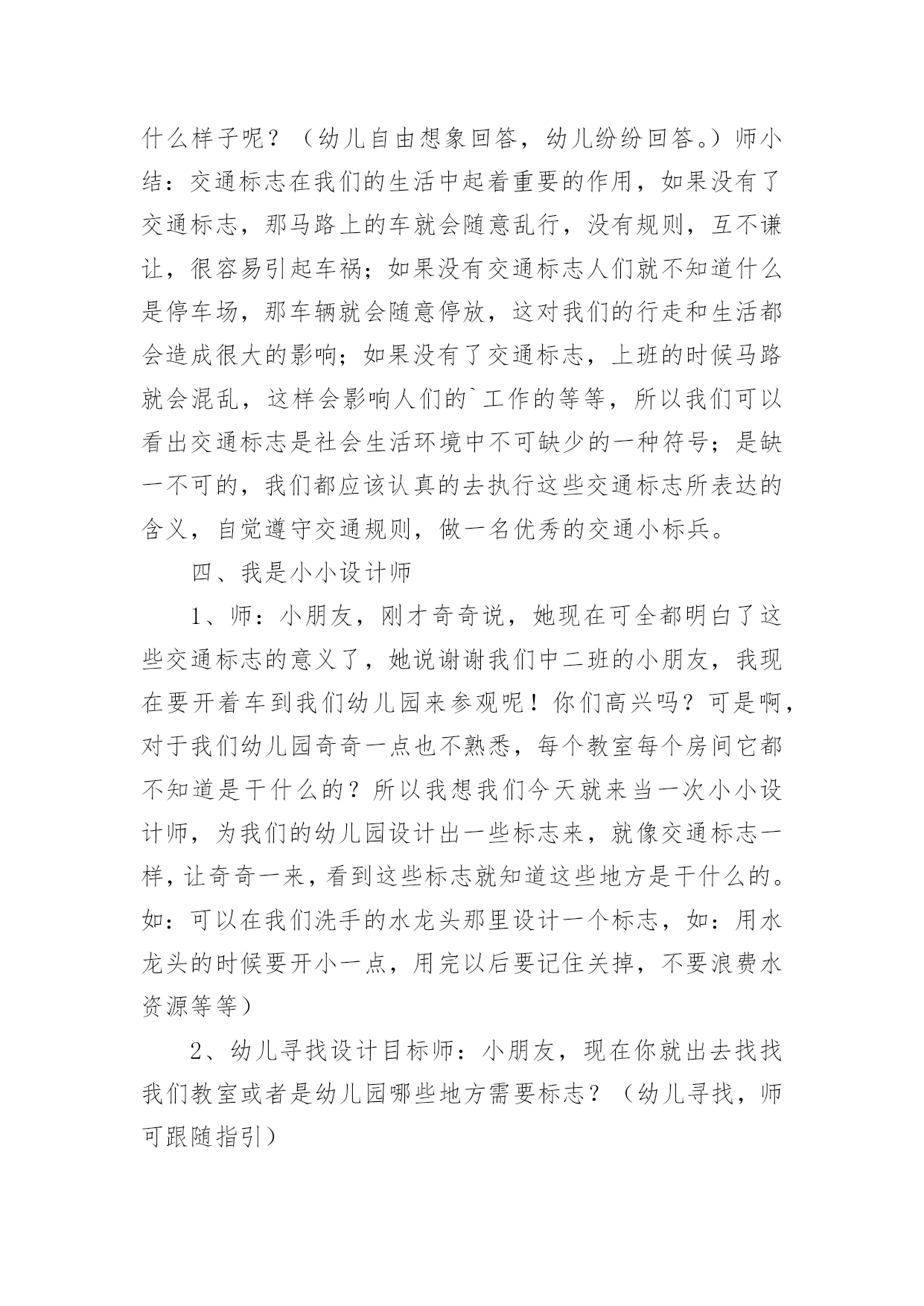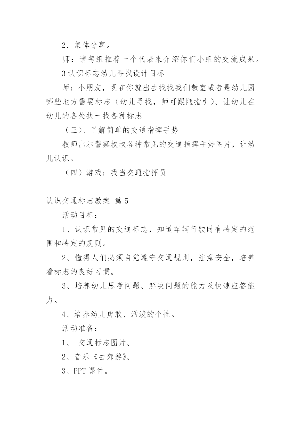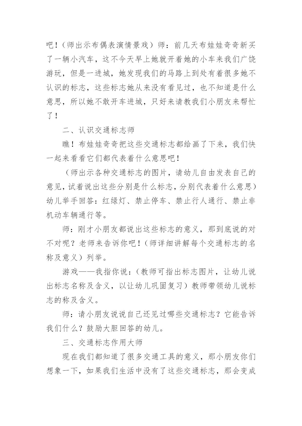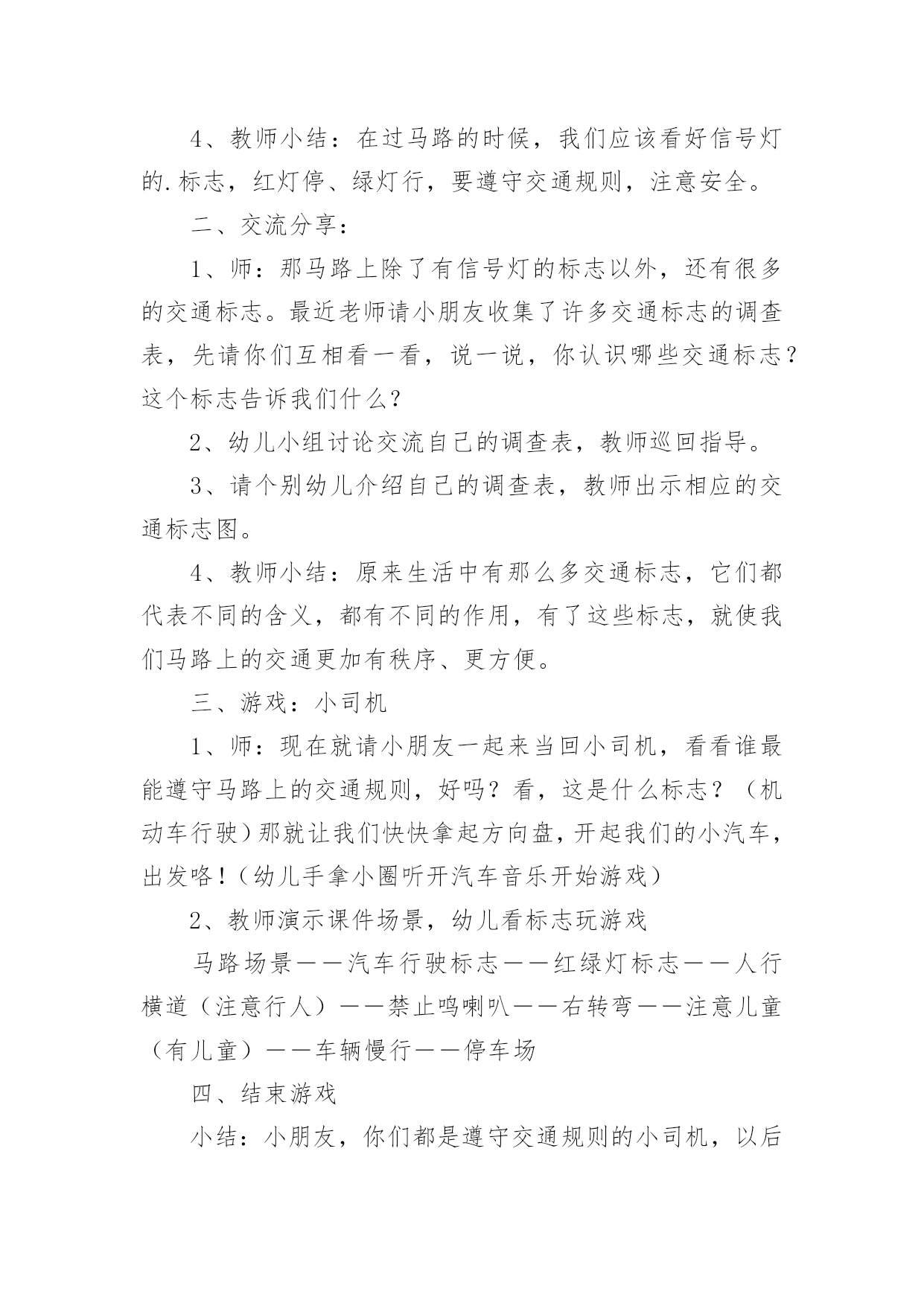 认识交通标志教案认识交通标志教案范文合集5篇作为一位杰出的教职工,很有必要精心设计一份教案,教案是教学活动的依据,有着重要的地位。快来参考教案是怎么写的吧!以下是小编为大家整理的认识交通标志教案6篇,欢迎阅读,希望大家能够喜欢。认识交通标志教案篇1【活动目标】1、认识常见的交通标志,知道标志是社会生活环境中不可缺少的一种符号;了解标志的作用和特征。2、使幼儿学会按标志行动3、激发幼儿的想象创造标志,培养幼儿的创造能力。【活动准备】1、准备各种交通标志图片、书籍若干。2、准备自制标志所需要的各种材料。卡纸、铅笔、彩笔等。3、布娃娃一个。【活动过程】一、故事导入:师:小朋友,今天早上有个小朋友委托我们帮他一个忙。到底是谁呢?她又遇到了什么困难呢?我们快一起来看看吧!(师出示布偶表演情景戏)师:前几天布娃娃奇奇新买了一辆小汽车,这不今天早上她就开着她的小车来我们广饶游玩,但是一进城,她发现我们的马路上到处有着很多她不认识的标志,这些标志她从来没有看见过,也不知道是什么意思,所以她不敢开车进城,只好来请教我们小朋友来帮忙了!二、认识交通标志师瞧!布娃娃奇奇把这些交通标志都给画了下来,我们快一起来看看它们都代表着什么意思吧!(师出示各种交通标志的图片,请幼儿自由发表自己的意见,试着说出这些分别是什么标志,分别代表着什么意思)幼儿举手回答:红绿灯、禁止停车、禁止行人通行、禁止非机动车辆通行等。师:刚才小朋友都说出这些标志的意义,那到底说的对不对呢?老师来告诉你吧!(师详细讲解每个交通标志的名称及意义)列举。游戏——我指你说:(教师可指出标志图片,让幼儿说出标志名称及含义,以让幼儿巩固复习)教师带领幼儿说标志的称及含义。师:请小朋友说说自己还见过哪些交通标志?它能告诉我们什么?鼓励大胆回答的幼儿。三、交通标志作用大师现在我们都知道了很多交通工具的意义,那小朋友你们想象一下,如果我们生活中没有了这些交通标志,那会变成什么样子呢?(幼儿自由想象回答,幼儿纷纷回答。)师小结:交通标志在我们的生活中起着重要的作用,如果没有了交通标志,那马路上的车就会随意乱行,没有规则,互不谦让,很容易引起车祸;如果没有交通标志人们就不知道什么是停车场,那车辆就会随意停放,这对我们的行走和生活都会造成很大的影响;如果没有了交通标志,上班的时候马路就会混乱,这样会影响人们的`工作的等等,所以我们可以看出交通标志是社会生活环境中不可缺少的一种符号;是缺一不可的,我们都应该认真的去执行这些交通标志所表达的含义,自觉遵守交通规则,做一名优秀的交通小标兵。四、我是小小设计师1、师:小朋友,刚才奇奇说,她现在可全都明白了这些交通标志的意义了,她说谢谢我们中二班的小朋友,我现在要开着车到我们幼儿园来参观呢!你们高兴吗?可是啊,对于我们幼儿园奇奇一点也不熟悉,每个教室每个房间它都不知道是干什么的?所以我想我们今天就来当一次小小设计师,为我们的幼儿园设计出一些标志来,就像交通标志一样,让奇奇一来,看到这些标志就知道这些地方是干什么的。如:可以在我们洗手的水龙头那里设计一个标志,如:用水龙头的时候要开小一点,用完以后要记住关掉,不要浪费水资源等等)2、幼儿寻找设计目标师:小朋友,现在你就出去找找我们教室或者是幼儿园哪些地方需要标志?(幼儿寻找,师可跟随指引)3、幼儿为幼儿园设计标志并制作出来(幼儿自己动手操作,师巡回指导,对于能力较弱的幼儿要重点指引)4、标志粘贴师幼共同将幼儿自制的标志贴在适合的地方,并让设计者向其他幼儿讲述其意义。让幼儿加深理解标志的名称及作用。【活动延伸】可请小班幼儿参观展示并为他们讲解其标志的意义,也可放学后让幼儿带领自己的父母去参观设计的标志。认识交通标志教案篇2一、教育目标通过课堂上的交通录像,以及交通标志的卡片,让孩子们真正认识和掌握这些交通标志所表示的信息,从而,提升孩子们的交通意识,增强孩子们的交通安全意识。二、教育准备交通录像、交通标志三、教育过程1.老师先让孩子们讲述下,自己每天都乘坐什么交通工具上学;2.老师根据孩子们的讲话,给孩子们播放交通录像;3.根据交通录像,老师让孩子们说一下自己对交通的.认识;4.老师给孩子们展示准备好的交通标志卡片;5.老师给孩子们讲述每个卡片表示的意义;6.老师让孩子们自己起来,根据刚才老师所讲,认识这些标志,并且,说出它们的标志;7.老师总结交通安全知识。认识交通标志教案篇3活动目标:1、认识了解一些常见的交通标志,知道这些标志的含义。2、乐于遵守交通规则,体会遵守交通规则给人们生活带来的方便。活动准备:1、交通标志调查表(幼儿完成)、小圈人手一个2、课件:小猪过马路;看标志开汽车;活动过程:一、故事情景导入,引起幼儿认识标志的兴趣。1、师:今天早上,在马路上发生了一件事情,小朋友想不想知道?(想)那我们一起来