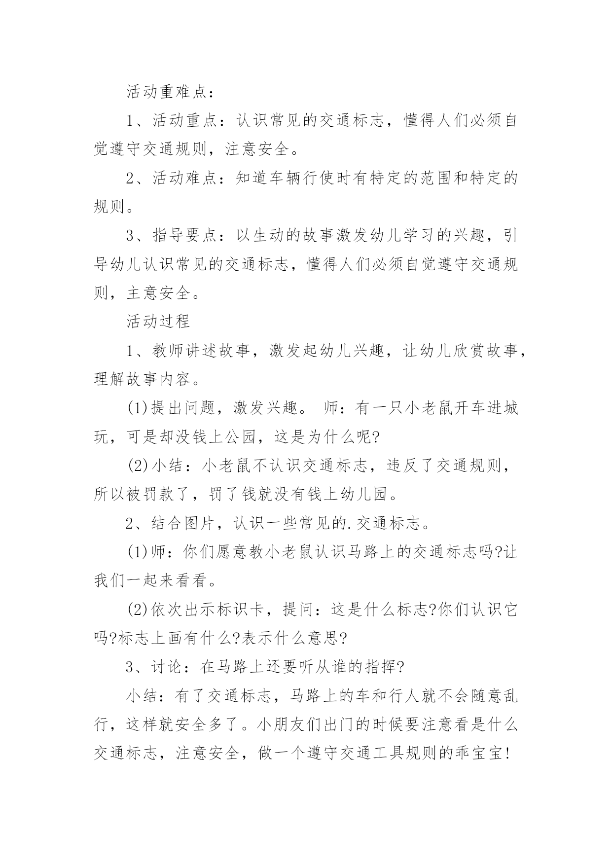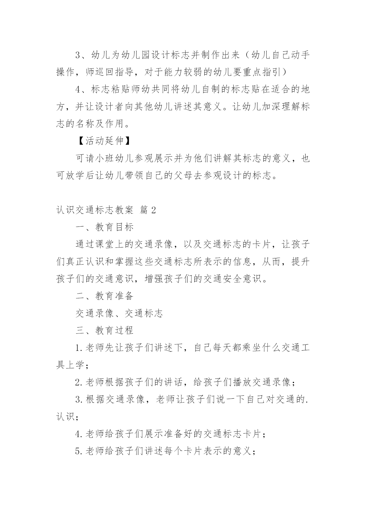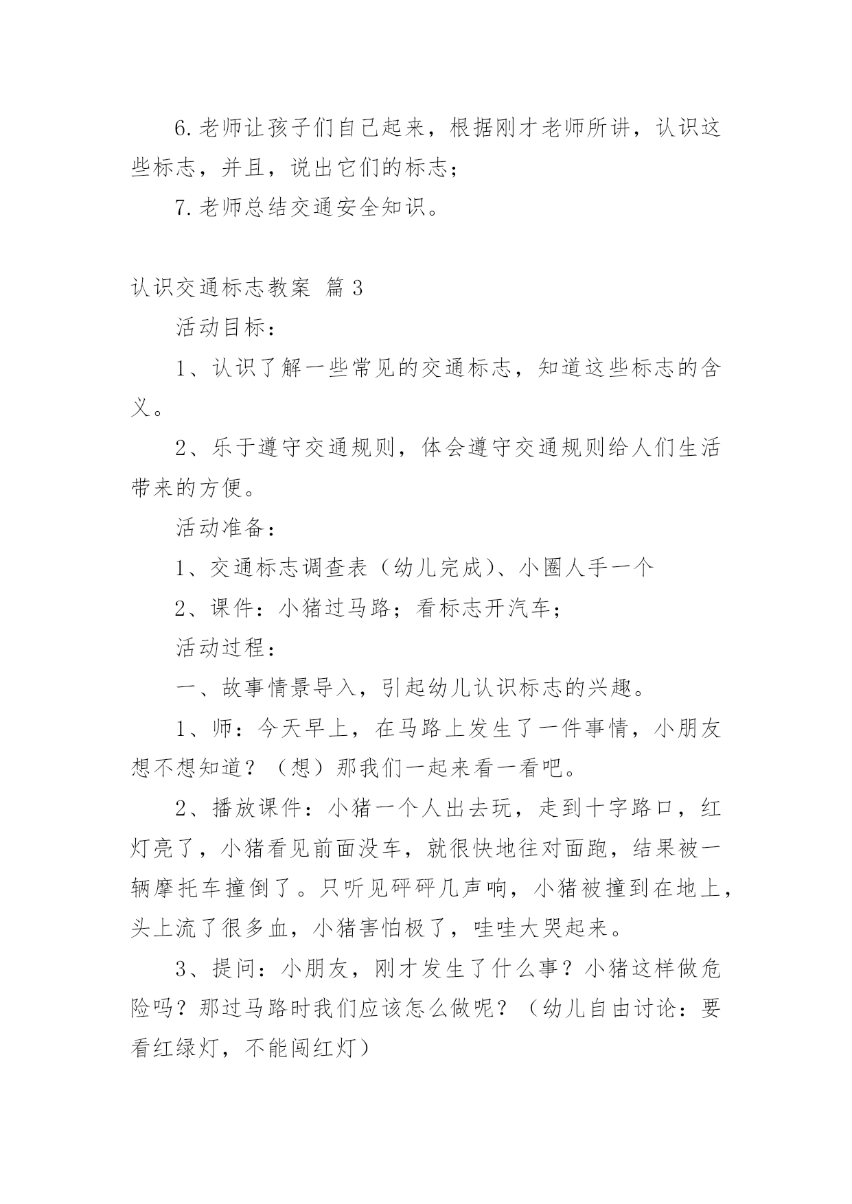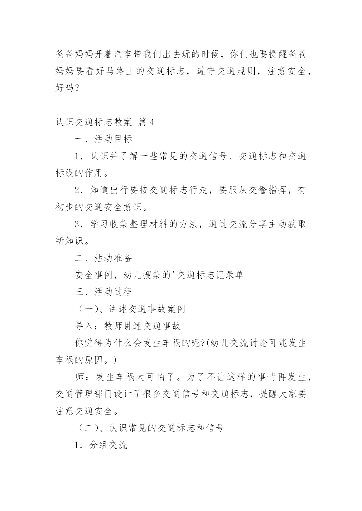 认识交通标志教案认识交通标志教案范文合集5篇作为一位杰出的教职工,很有必要精心设计一份教案,教案是教学活动的依据,有着重要的地位。快来参考教案是怎么写的吧!以下是小编为大家整理的认识交通标志教案6篇,欢迎阅读,希望大家能够喜欢。认识交通标志教案篇1【活动目标】1、认识常见的交通标志,知道标志是社会生活环境中不可缺少的一种符号;了解标志的作用和特征。2、使幼儿学会按标志行动3、激发幼儿的想象创造标志,培养幼儿的创造能力。【活动准备】1、准备各种交通标志图片、书籍若干。2、准备自制标志所需要的各种材料。卡纸、铅笔、彩笔等。3、布娃娃一个。【活动过程】一、故事导入:师:小朋友,今天早上有个小朋友委托我们帮他一个忙。到底是谁呢?她又遇到了什么困难呢?我们快一起来看看吧!(师出示布偶表演情景戏)师:前几天布娃娃奇奇新买了一辆小汽车,这不今天早上她就开着她的小车来我们广饶游玩,但是一进城,她发现我们的马路上到处有着很多她不认识的标志,这些标志她从来没有看见过,也不知道是什么意思,所以她不敢开车进城,只好来请教我们小朋友来帮忙了!二、认识交通标志师瞧!布娃娃奇奇把这些交通标志都给画了下来,我们快一起来看看它们都代表着什么意思吧!(师出示各种交通标志的图片,请幼儿自由发表自己的意见,试着说出这些分别是什么标志,分别代表着什么意思)幼儿举手回答:红绿灯、禁止停车、禁止行人通行、禁止非机动车辆通行等。师:刚才小朋友都说出这些标志的意义,那到底说的对不对呢?老师来告诉你吧!(师详细讲解每个交通标志的名称及意义)列举。游戏——我指你说:(教师可指出标志图片,让幼儿说出标志名称及含义,以让幼儿巩固复习)教师带领幼儿说标志的称及含义。师:请小朋友说说自己还见过哪些交通标志?它能告诉我们什么?鼓励大胆回答的幼儿。三、交通标志作用大师现在我们都知道了很多交通工具的意义,那小朋友你们想象一下,如果我们生活中没有了这些交通标志,那会变成什么样子呢?(幼儿自由想象回答,幼儿纷纷回答。)师小结:交通标志在我们的生活中起着重要的作用,如果没有了交通标志,那马路上的车就会随意乱行,没有规则,互不谦让,很容易引起车祸;如果没有交通标志人们就不知道什么是停车场,那车辆就会随意停放,这对我们的行走和生活都会造成很大的影响;如果没有了交通标志,上班的时候马路就会混乱,这样会影响人们的`工作的等等,所以我们可以看出交通标志是社会生活环境中不可缺少的一种符号;是缺一不可的,我们都应该认真的去执行这些交通标志所表达的含义,自觉遵守交通规则,做一名优秀的交通小标兵。四、我是小小设计师1、师:小朋友,刚才奇奇说,她现在可全都明白了这些交通标志的意义了,她说谢谢我们中二班的小朋友,我现在要开着车到我们幼儿园来参观呢!你们高兴吗?可是啊,对于我们幼儿园奇奇一点也不熟悉,每个教室每个房间它都不知道是干什么的?所以我想我们今天就来当一次小小设计师,为我们的幼儿园设计出一些标志来,就像交通标志一样,让奇奇一来,看到这些标志就知道这些地方是干什么的。如:可以在我们洗手的水龙头那里设计一个标志,如:用水龙头的时候要开小一点,用完以后要记住关掉,不要浪费水资源等等)2、幼儿寻找设计目标师:小朋友,现在你就出去找找我们教室或者是幼儿园哪些地方需要标志?(幼儿寻找,师可跟随指引)3、幼儿为幼儿园设计标志并制作出来(幼儿自己动手操作,师巡回指导,对于能力较弱的幼儿要重点指引)4、标志粘贴师幼共同将幼儿自制的标志贴在适合的地方,并让设计者向其他幼儿讲述其意义。让幼儿加深理解标志的名称及作用。【活动延伸】可请小班幼儿参观展示并为他们讲解其标志的意义,也可放学后让幼儿带领自己的父母去参观设计的标志。认识交通标志教案篇2一、教育目标通过课堂上的交通录像,以及交通标志的卡片,让孩子们真正认识和掌握这些交通标志所表示的信息,从而,提升孩子们的交通意识,增强孩子们的交通安全意识。二、教育准备交通录像、交通标志三、教育过程1.老师先让孩子们讲述下,自己每天都乘坐什么交通工具上学;2.老师根据孩子们的讲话,给孩子们播放交通录像;3.根据交通录像,老师让孩子们说一下自己对交通的.认识;4.老师给孩子们展示准备好的交通标志卡片;5.老师给孩子们讲述每个卡片表示的意义;6.老师让孩子们自己起来,根据刚才老师所讲,认识这些标志,并且,说出它们的标志;7.老师总结交通安全知识。认识交通标志教案篇3活动目标:1、认识了解一些常见的交通标志,知道这些标志的含义。2、乐于遵守交通规则,体会遵守交通规则给人们生活带来的方便。活动准备:1、交通标志调查表(幼儿完成)、小圈人手一个2、课件:小猪过马路;看标志开汽车;活动过程:一、故事情景导入,引起幼儿认识标志的兴趣。1、师:今天早上,在马路上发生了一件事情,小朋友想不想知道?(想)那我们一起来