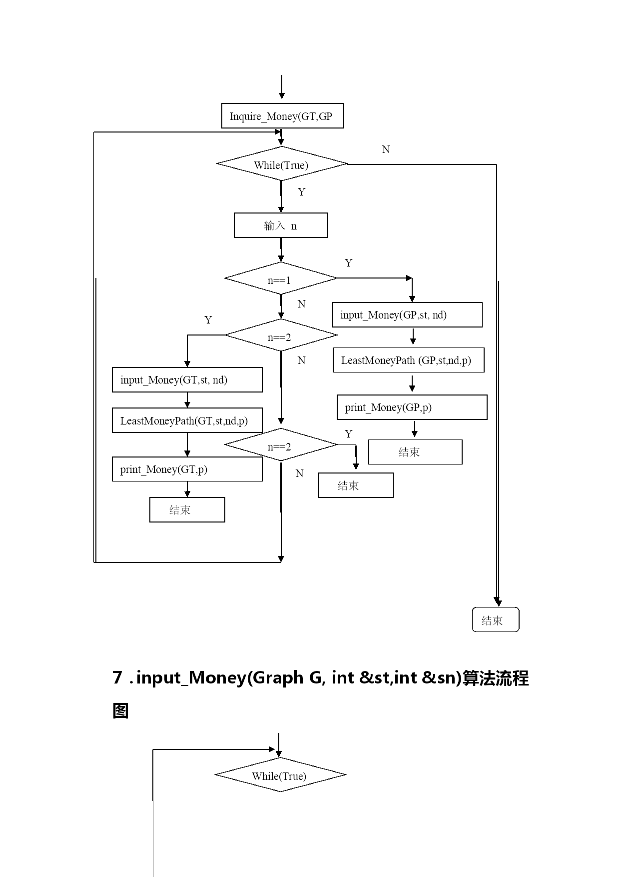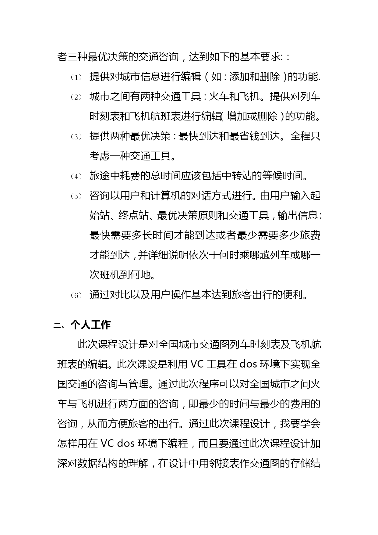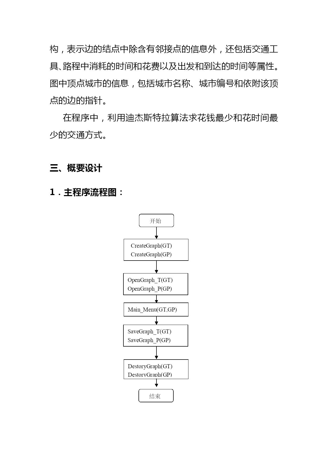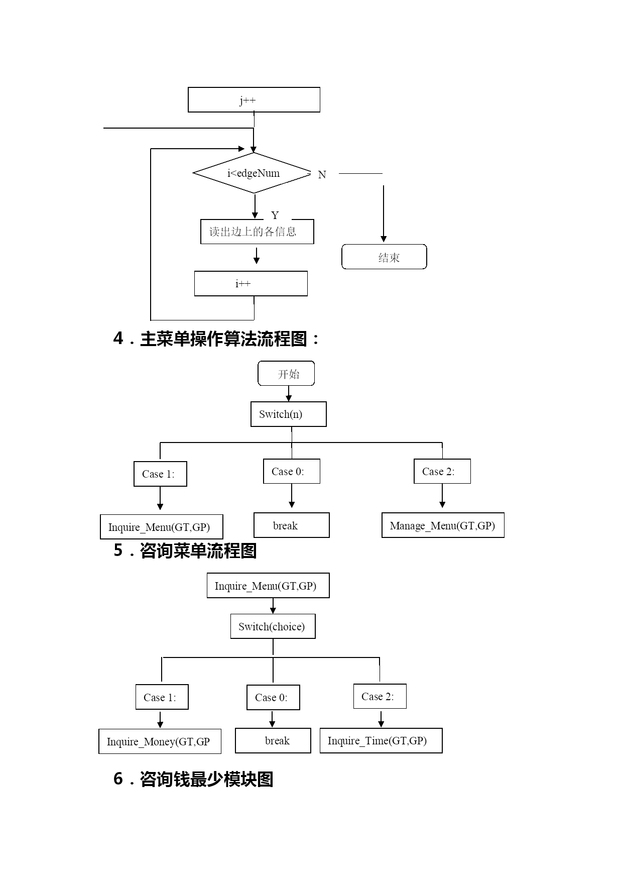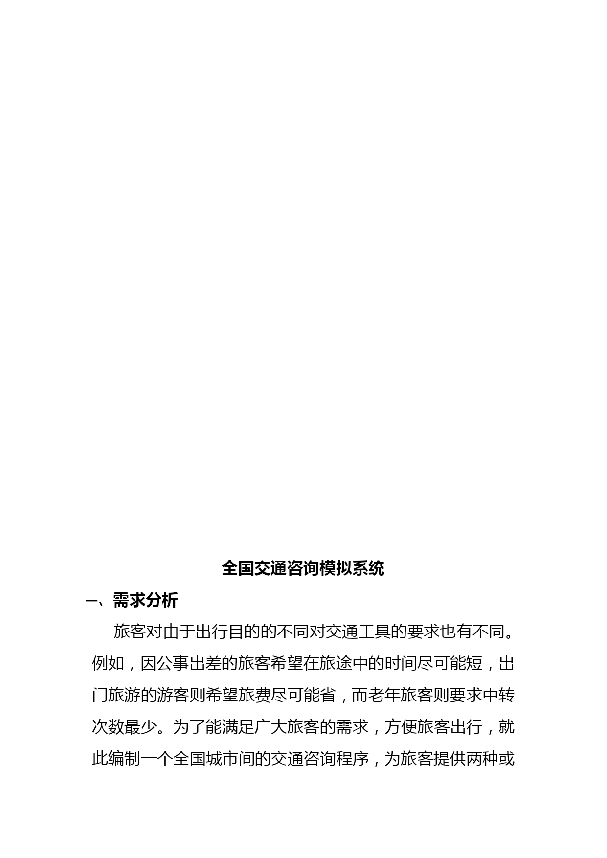 全国交通咨询模拟系统(完整版)资料(可以直接使用,可编辑优秀版资料,欢迎下载)全国交通咨询模拟系统目录TOC\o"1-3"\h\uHYPERLINK\l_Toc22586一、需求分析PAGEREF_Toc225864HYPERLINK\l_Toc7194二、个人工作PAGEREF_Toc71944HYPERLINK\l_Toc26414三、概要设计PAGEREF_Toc264145HYPERLINK\l_Toc165851.主程序流程图:PAGEREF_Toc165855HYPERLINK\l_Toc180822.创建图算法流程图:PAGEREF_Toc180826HYPERLINK\l_Toc29577四、源程序PAGEREF_Toc2957714HYPERLINK\l_Toc3637五、程序结果PAGEREF_Toc363725HYPERLINK\l_Toc10185.3设计和调试分析PAGEREF_Toc101829HYPERLINK\l_Toc4986六、程序设计体会PAGEREF_Toc498630全国交通咨询模拟系统需求分析旅客对由于出行目的的不同对交通工具的要求也有不同。例如,因公事出差的旅客希望在旅途中的时间尽可能短,出门旅游的游客则希望旅费尽可能省,而老年旅客则要求中转次数最少。为了能满足广大旅客的需求,方便旅客出行,就此编制一个全国城市间的交通咨询程序,为旅客提供两种或者三种最优决策的交通咨询,达到如下的基本要求::提供对城市信息进行编辑(如:添加和删除)的功能.城市之间有两种交通工具:火车和飞机。提供对列车时刻表和飞机航班表进行编辑(增加或删除)的功能。提供两种最优决策:最快到达和最省钱到达。全程只考虑一种交通工具。旅途中耗费的总时间应该包括中转站的等候时间。咨询以用户和计算机的对话方式进行。由用户输入起始站、终点站、最优决策原则和交通工具,输出信息:最快需要多长时间才能到达或者最少需要多少旅费才能到达,并详细说明依次于何时乘哪趟列车或哪一次班机到何地。通过对比以及用户操作基本达到旅客出行的便利。个人工作此次课程设计是对全国城市交通图列车时刻表及飞机航班表的编辑。此次课设是利用VC工具在dos环境下实现全国交通的咨询与管理。通过此次程序可以对全国城市之间火车与飞机进行两方面的咨询,即最少的时间与最少的费用的咨询,从而方便旅客的出行。通过此次课程设计,我要学会怎样用在VCdos环境下编程,而且要通过此次课程设计加深对数据结构的理解,在设计中用邻接表作交通图的存储结构,表示边的结点中除含有邻接点的信息外,还包括交通工具、路程中消耗的时间和花费以及出发和到达的时间等属性。图中顶点城市的信息,包括城市名称、城市编号和依附该顶点的边的指针。在程序中,利用迪杰斯特拉算法求花钱最少和花时间最少的交通方式。三、概要设计1.主程序流程图:开始CreateGraph(GT)CreateGraph(GP)OpenGraph_T(GT)OpenGraph_P(GP)Main_Menu(GT,GP)DestoryGraph(GT)DestoryGraph(GP)结束SaveGraph_T(GT)SaveGraph_P(GP)2.创建图算法流程图:N开始i<MAXVTXNUMG.FLAG[I]=0i++Y结束3.打开图算法流程图:开始NY读出城市的号数cityNum,标志Flag,城市名称cityNamej<vexNum读出图中顶点数vexNum,边数edgeNum打开文件j++i<edgeNumN读出边上的各信息Y结束i++4.主菜单操作算法流程图:开始Switch(n)Case2::Case0:Case1:Inquire_Menu(GT,GP)breakManage_Menu(GT,GP)5.咨询菜单流程图Inquire_Menu(GT,GP)Switch(choice)Case1:Case2:Case0:Inquire_Money(GT,GP)Inquire_Time(GT,GP)break6.咨询钱最少模块图Inquire_Money(GT,GP)NWhile(True)Y