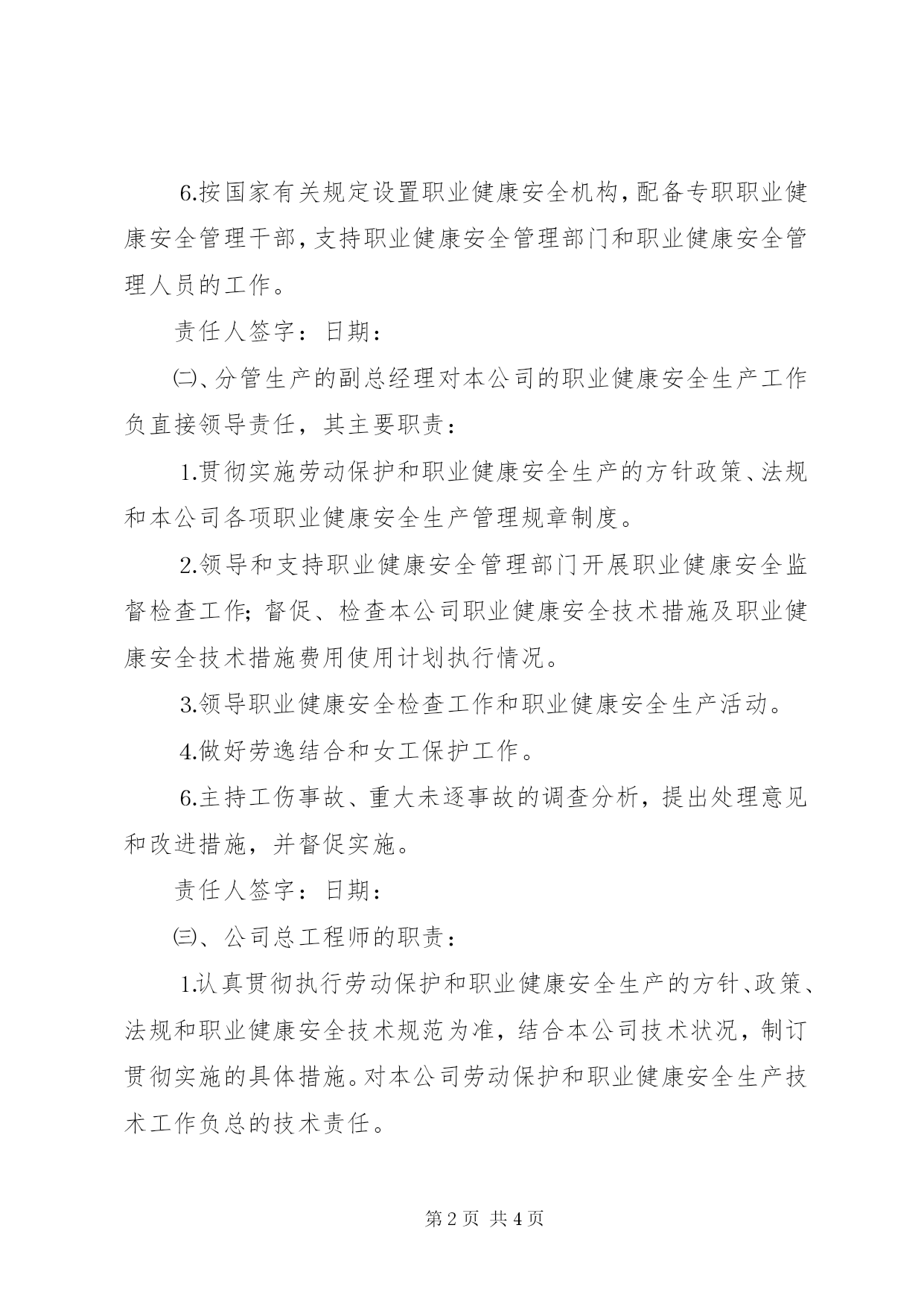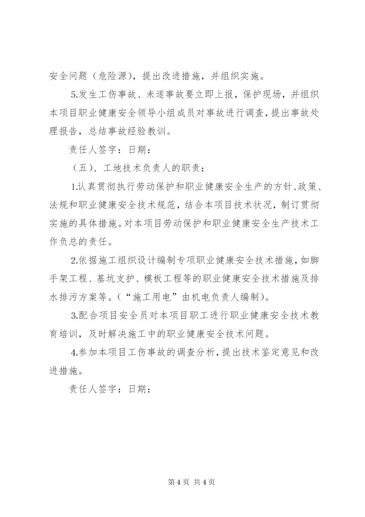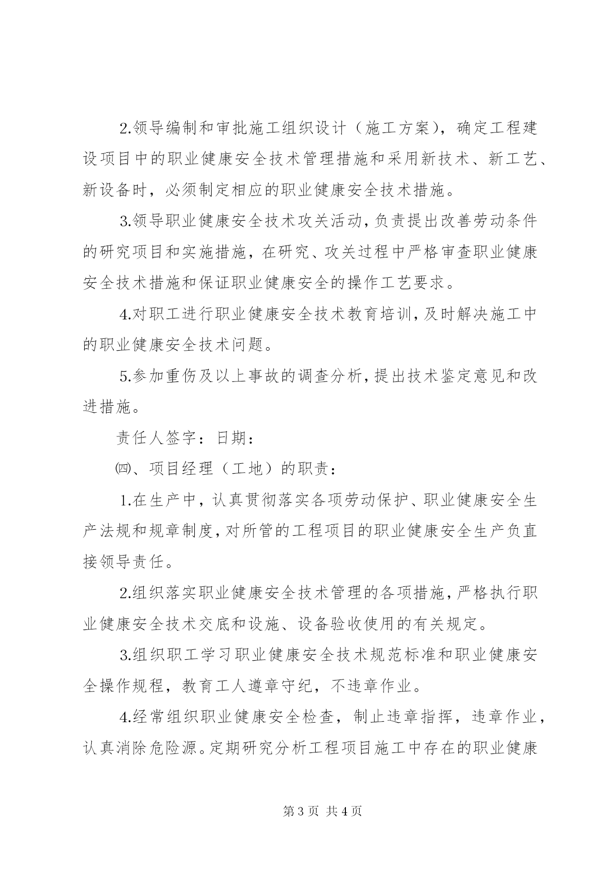 第PAGE\*Arabic\*MERGEFORMAT4页共NUMPAGES\*MERGEFORMAT4页职业健康安全环保责任制职业健康安全生产责任制为认真贯彻《安全生产法》、《建筑法》、《劳动法》、《XX省劳动安全卫生条例》,落实“企业负责、行业管理、国家监察、群众监督”职业健康安全生产管理体制,明确建筑企业各级人员和各职能部门职业健康安全生产工作的责任,保障职工在生产中的职业健康安全和健康,促进生产的发展,依据《XX省建筑企业安全生产责任制暂行规定》制定本规定。㈠、公司经理的职责:⒈认真贯彻执行劳动保护和职业健康安全生产的方针、政策、法令、法规和规章制度,组织建立、健全和完善本企业的各项职业健康安全生产管理规章制度和职业健康安全生产组织保证体系,对本企业职业健康安全负全面领导责任,是企业职业健康安全的第一责任者。⒉审批职业健康安全技术措施经费使用计划并贯彻实施。⒊定期听取职业健康安全情况汇报;研究解决职业健康安全生产问题。⒋督促各级领导干部和各部门、项目部的职工做好本职范围内的职业健康安全工作。⒌组织、主持工伤事故及重大未遂事故的调查处理工作,督促落实防范措施。⒍按国家有关规定设置职业健康安全机构,配备专职职业健康安全管理干部,支持职业健康安全管理部门和职业健康安全管理人员的工作。责任人签字:日期:㈡、分管生产的副总经理对本公司的职业健康安全生产工作负直接领导责任,其主要职责:⒈贯彻实施劳动保护和职业健康安全生产的方针政策、法规和本公司各项职业健康安全生产管理规章制度。⒉领导和支持职业健康安全管理部门开展职业健康安全监督检查工作;督促、检查本公司职业健康安全技术措施及职业健康安全技术措施费用使用计划执行情况。⒊领导职业健康安全检查工作和职业健康安全生产活动。⒋做好劳逸结合和女工保护工作。⒍主持工伤事故、重大未逐事故的调查分析,提出处理意见和改进措施,并督促实施。责任人签字:日期:㈢、公司总工程师的职责:⒈认真贯彻执行劳动保护和职业健康安全生产的方针、政策、法规和职业健康安全技术规范为准,结合本公司技术状况,制订贯彻实施的具体措施。对本公司劳动保护和职业健康安全生产技术工作负总的技术责任。⒉领导编制和审批施工组织设计(施工方案),确定工程建设项目中的职业健康安全技术管理措施和采用新技术、新工艺、新设备时,必须制定相应的职业健康安全技术措施。⒊领导职业健康安全技术攻关活动,负责提出改善劳动条件的研究项目和实施措施,在研究、攻关过程中严格审查职业健康安全技术措施和保证职业健康安全的操作工艺要求。⒋对职工进行职业健康安全技术教育培训,及时解决施工中的职业健康安全技术问题。⒌参加重伤及以上事故的调查分析,提出技术鉴定意见和改进措施。责任人签字:日期:㈣、项目经理(工地)的职责:⒈在生产中,认真贯彻落实各项劳动保护、职业健康安全生产法规和规章制度,对所管的工程项目的职业健康安全生产负直接领导责任。⒉组织落实职业健康安全技术管理的各项措施,严格执行职业健康安全技术交底和设施、设备验收使用的有关规定。⒊组织职工学习职业健康安全技术规范标准和职业健康安全操作规程,教育工人遵章守纪,不违章作业。⒋经常组织职业健康安全检查,制止违章指挥,违章作业,认真消除危险源。定期研究分析工程项目施工中存在的职业健康安全问题(危险源),提出改进措施,并组织实施。⒌发生工伤事故、未遂事故要立即上报,保护现场,并组织本项目职业健康安全领导小组成员对事故进行调查,提出事故处理报告,总结事故经验教训。责任人签字:日期:(五)、工地技术负责人的职责:⒈认真贯彻执行劳动保护和职业健康安全生产的方针、政策、法规和职业健康安全技术规范,结合本项目技术状况,制订贯彻实施的具体措施。对本项目劳动保护和职业健康安全生产技术工作负总的责任。⒉依据施工组织设计编制专项职业健康安全技术措施,如脚手架工程、基坑支护、模板工程等的职业健康安全技术措施及排水排污方案等。(“施工用电”由机电负责人编制)。⒊配合项目安全员对本项目职工进行职业健康安全技术教育培训,及时解决施工中的职业健康安全技术问题。⒋参加本项目工伤事故的调查分析,提出技术鉴定意见和改进措施。责任人签字:日期: