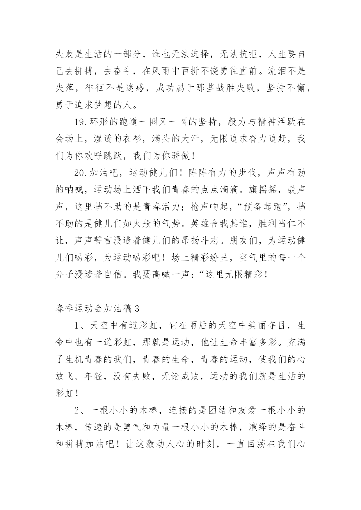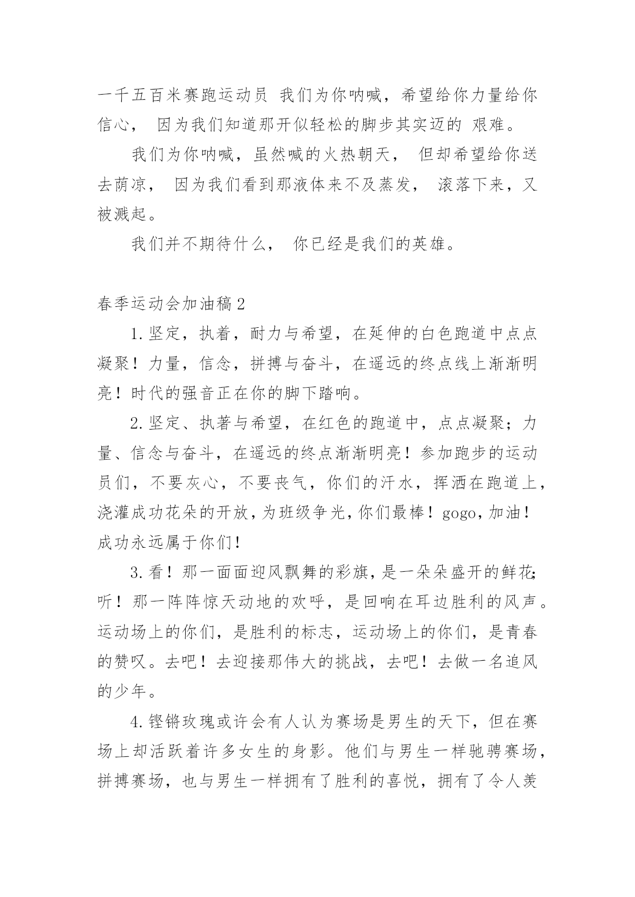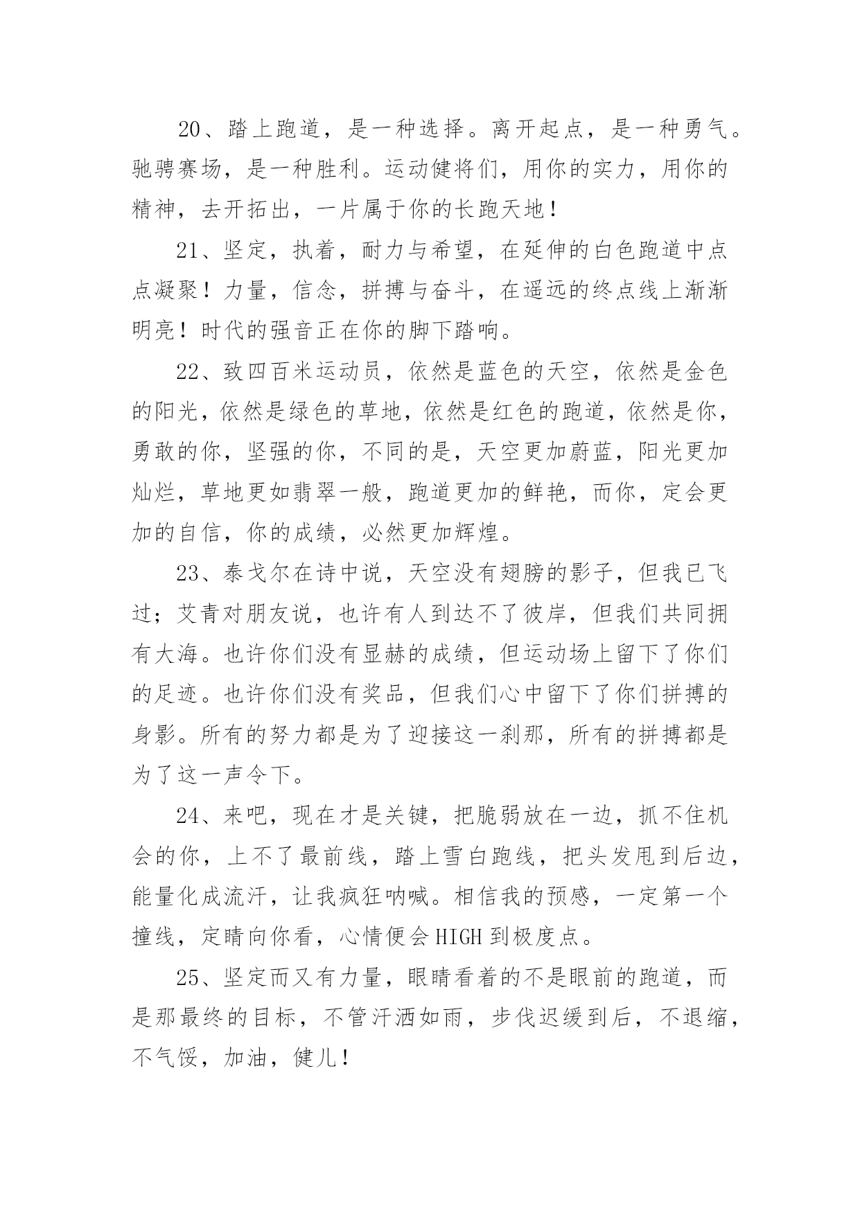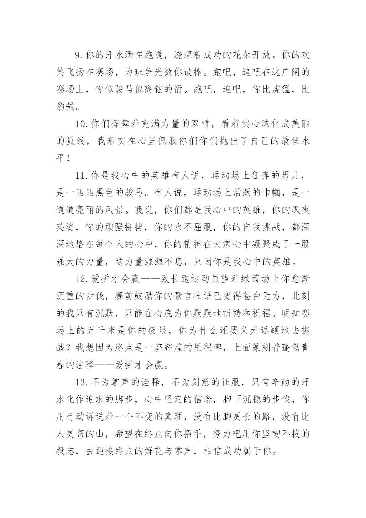 春季运动会加油稿【精】春季运动会加油稿在当今社会生活中,我们用到加油稿的地方越来越多,加油稿可以强化人们的自我认知,给予人正向的激励作用。写加油稿的注意事项有许多,你确定会写吗?以下是小编帮大家整理的春季运动会加油稿,仅供参考,希望能够帮助到大家。春季运动会加油稿1100致百米运动员快如离弦之箭;疾似撒疆野马;你们的速度让我们惊叹;你们的精神让我们钦佩;流汗千日,只为今日一搏;疾踏百步,只为终点一触;胜利再向你微笑;成功在向你招手;加油啊!健儿们!200致200米运动员200米,有一个人生的起点200米,有一个人生的弯道200米,有一段人生的冲刺200米,有一个辉煌的胜利200米,只刹那一瞬间却成就一段永恒的胜利200米,只弯过一个转折却折出多少汗水冲向你那光辉煌的胜利吧跨过那一瞬转过那道弯胜利在向你招手400赞800米运动员:在赤色的长廊上,有两圈弧长,在绿色场地上,有你的明亮,画出两圈生命的轨迹,夺得无数由衷的惊喜。迈出不一样的生活旋律,奏出不同凡响的歌曲!你的表演场,让你自由徜徉!你的`起飞场,舒展你的1500到一千五百米赛跑运动员我们为你呐喊,希望给你力量给你信心,因为我们知道那开似轻松的脚步其实迈的艰难。我们为你呐喊,虽然喊的火热朝天,但却希望给你送去荫凉,因为我们看到那液体来不及蒸发,滚落下来,又被溅起。我们并不期待什么,你已经是我们的英雄。春季运动会加油稿21.坚定,执着,耐力与希望,在延伸的白色跑道中点点凝聚!力量,信念,拼搏与奋斗,在遥远的终点线上渐渐明亮!时代的强音正在你的脚下踏响。2.坚定、执著与希望,在红色的跑道中,点点凝聚;力量、信念与奋斗,在遥远的终点渐渐明亮!参加跑步的运动员们,不要灰心,不要丧气,你们的汗水,挥洒在跑道上,浇灌成功花朵的开放,为班级争光,你们最棒!gogo,加油!成功永远属于你们!3.看!那一面面迎风飘舞的彩旗,是一朵朵盛开的鲜花;听!那一阵阵惊天动地的欢呼,是回响在耳边胜利的风声。运动场上的你们,是胜利的标志,运动场上的你们,是青春的赞叹。去吧!去迎接那伟大的挑战,去吧!去做一名追风的少年。4.铿锵玫瑰或许会有人认为赛场是男生的天下,但在赛场上却活跃着许多女生的身影。他们与男生一样驰骋赛场,拼搏赛场,也与男生一样拥有了胜利的喜悦,拥有了令人羡慕的掌声与鲜花;他们的飒爽风姿引人注目,在他们身上折射出有如女足运动员般的坚定新年与不屈精神,他们是盛开在赛场上的铿锵玫瑰,他们是一朵朵充满生命力的铿锵玫瑰,是一朵朵洋溢着青春朝气的铿锵玫瑰。祝愿每朵铿锵玫瑰都能怒放在人生的道路上。5.祝愿每朵铿锵玫瑰都能傲立在拼搏的赛场上。6.理想毕竟不同于现实,失败是生活的一部分,谁也无法选择,无法拒绝。人生要自己去拼搏,去奋斗,在风雨中百折不挠勇往前。7.每一份辛劳都有一份收获,每一次的痛苦都是快乐的开始,没一声呐喊都是力量的呼唤。我们有着大浪拍岸的豪迈,所以你不必在*乎小荷初露的恬静,我们有着春日的`阳光明媚,所以不用去羡慕冬日乱玉碎琼,我们是雨天的一把伞,是寒冷冬日里的一盆碳火,温暖的不只是你我,而是大家的心。运动场上的健儿,掌声属于你们,鲜花属于你们,成功也是属于你们!8.面对艰苦的征程,你们毫不畏惧,接力棒在你们手中传递着集体的力量,听,我们在为你呐喊,你们诠释着奥运的精神,你们是我们心中的骄傲,深深*的呼吸,等待你的是艰难的800米。相信胜利会属于你们,但在这征途上,需要你勇敢的心去面对。我们在为你加油,你是否听到了我们发自内心的呐喊,困难和胜利都在向你招手,去呀,不要犹豫,快去击败困难,快去夺取胜利,相信你会送给我们一个汗水浸湿的微笑。9.你的汗水洒在跑道,浇灌着成功的花朵开放。你的欢笑飞扬在赛场,为班争光数你最棒。跑吧,追吧在这广阔的赛场上,你似骏马似离铉的箭。跑吧,追吧,你比虎猛,比豹强。10.你们挥舞着充满力量的双臂,看着实心球化成美丽的弧线,我着实在心里佩服你们你们抛出了自己的最佳水平!11.你是我心中的英雄有人说,运动场上狂奔的男儿,是一匹匹黑色的骏马。有人说,运动场上活跃的巾帼,是一道道亮丽的风景。我说,你们都是我心中的英雄,你的飒爽英姿,你的顽强拼搏,你的永不屈服,你的自我挑战,都深深地烙在每个人的心中,你的精神在大家心中凝聚成了一股强大的力量,这力量源源不息,只因你是我心中的英雄。12.爱拼才会赢——致长跑运动员望着绿茵场上你愈渐沉重的步伐,赛前鼓励你的豪言壮语已变得苍白无力,此刻的我只有沉默,只能在心底为你默默地祈祷和祝福。明知赛场上的五千米是你的极限,你为什么还要义无返顾地去挑战?我想因为终点是一座辉煌的里程碑,上面篆刻着蓬勃青春的注释——爱拼才会赢。13.不为掌声的诠释,不为刻意的征服,只有辛勤的汗水化作追求的脚步,心中坚定的信念,脚下沉稳的步伐,你用行动诉说着一
