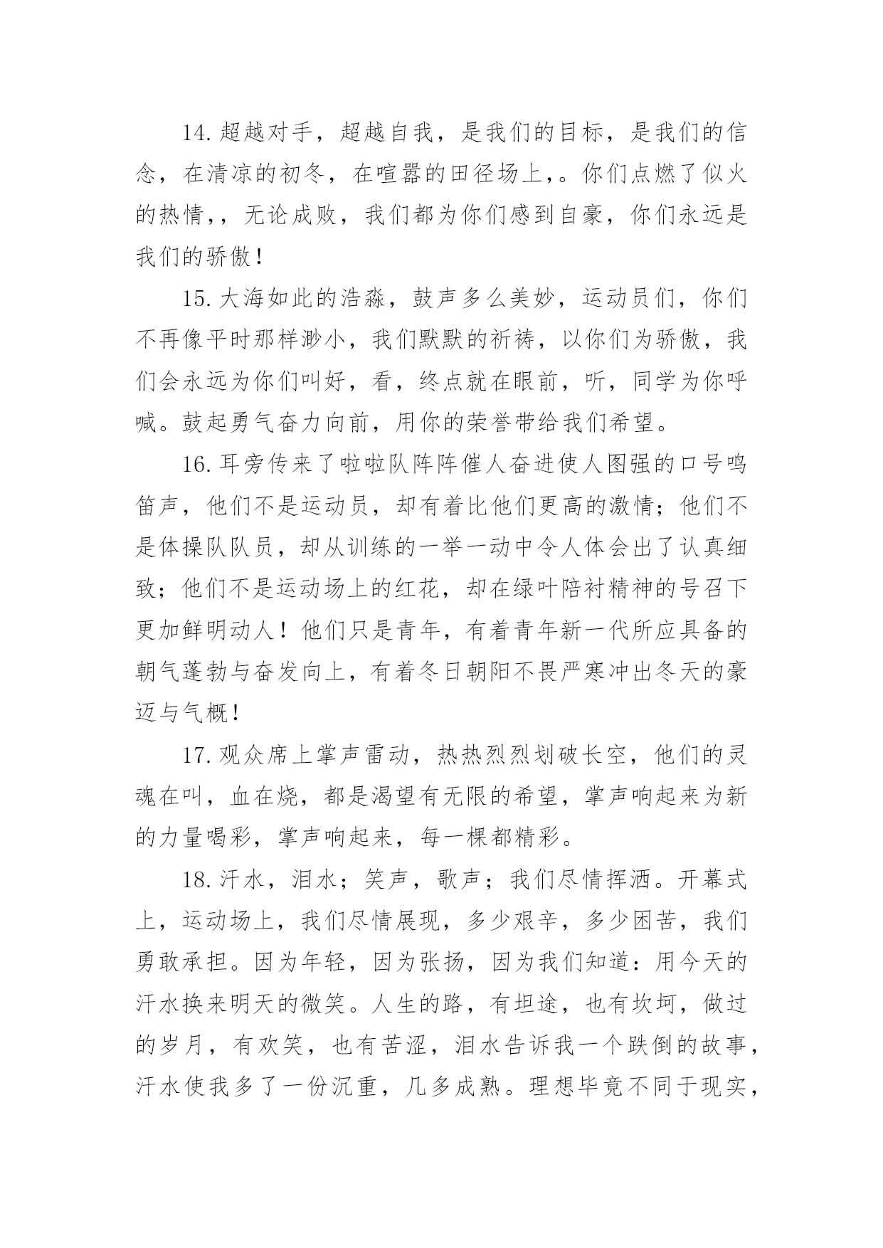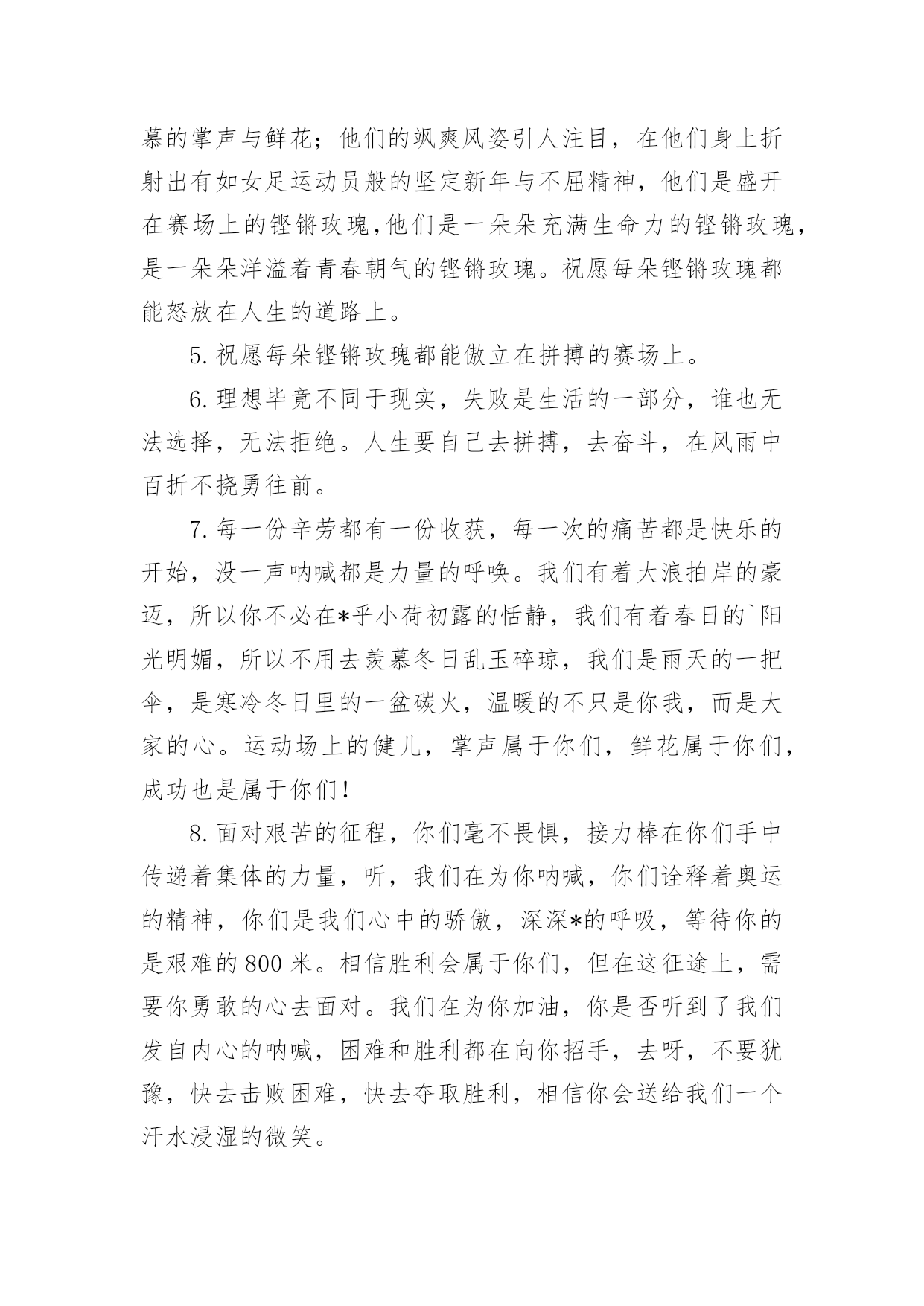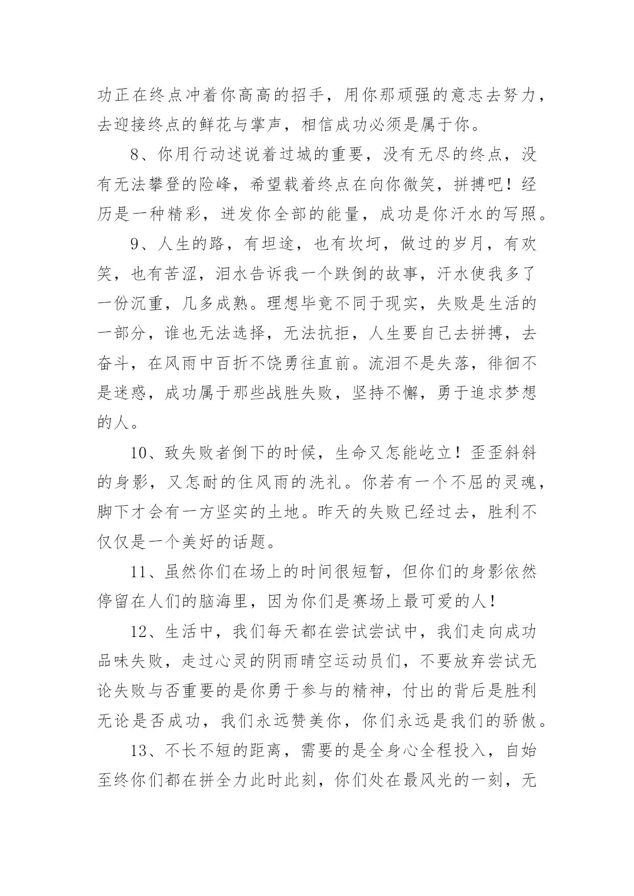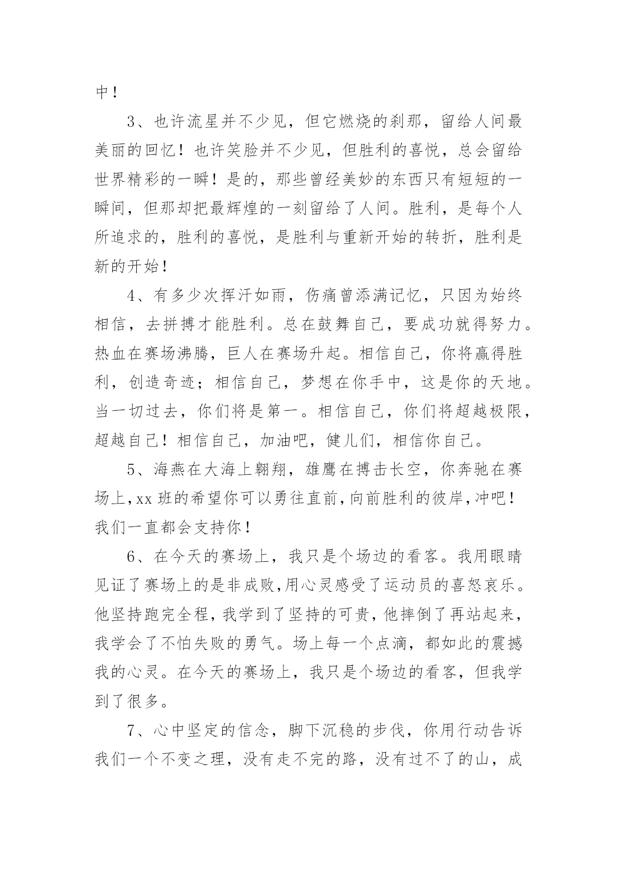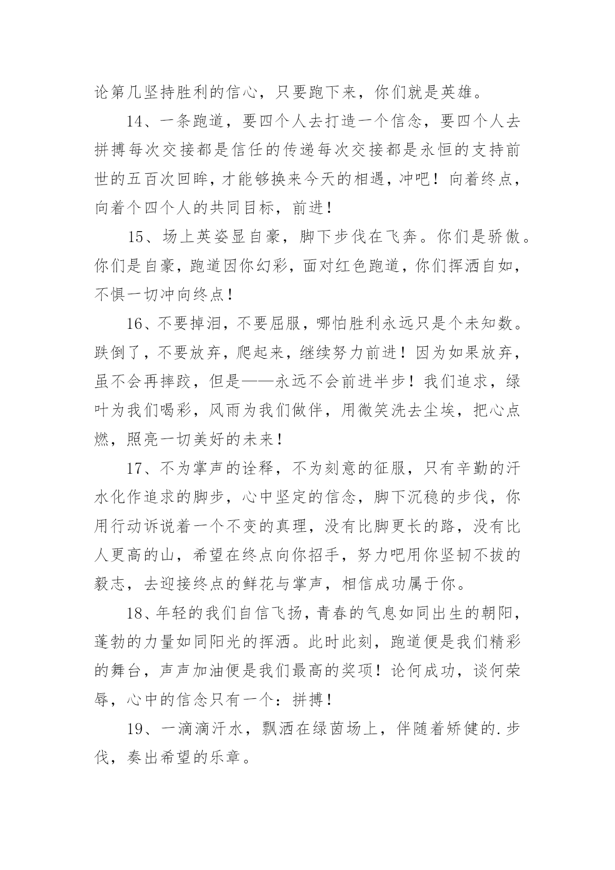 春季运动会加油稿【精】春季运动会加油稿在当今社会生活中,我们用到加油稿的地方越来越多,加油稿可以强化人们的自我认知,给予人正向的激励作用。写加油稿的注意事项有许多,你确定会写吗?以下是小编帮大家整理的春季运动会加油稿,仅供参考,希望能够帮助到大家。春季运动会加油稿1100致百米运动员快如离弦之箭;疾似撒疆野马;你们的速度让我们惊叹;你们的精神让我们钦佩;流汗千日,只为今日一搏;疾踏百步,只为终点一触;胜利再向你微笑;成功在向你招手;加油啊!健儿们!200致200米运动员200米,有一个人生的起点200米,有一个人生的弯道200米,有一段人生的冲刺200米,有一个辉煌的胜利200米,只刹那一瞬间却成就一段永恒的胜利200米,只弯过一个转折却折出多少汗水冲向你那光辉煌的胜利吧跨过那一瞬转过那道弯胜利在向你招手400赞800米运动员:在赤色的长廊上,有两圈弧长,在绿色场地上,有你的明亮,画出两圈生命的轨迹,夺得无数由衷的惊喜。迈出不一样的生活旋律,奏出不同凡响的歌曲!你的表演场,让你自由徜徉!你的`起飞场,舒展你的1500到一千五百米赛跑运动员我们为你呐喊,希望给你力量给你信心,因为我们知道那开似轻松的脚步其实迈的艰难。我们为你呐喊,虽然喊的火热朝天,但却希望给你送去荫凉,因为我们看到那液体来不及蒸发,滚落下来,又被溅起。我们并不期待什么,你已经是我们的英雄。春季运动会加油稿21.坚定,执着,耐力与希望,在延伸的白色跑道中点点凝聚!力量,信念,拼搏与奋斗,在遥远的终点线上渐渐明亮!时代的强音正在你的脚下踏响。2.坚定、执著与希望,在红色的跑道中,点点凝聚;力量、信念与奋斗,在遥远的终点渐渐明亮!参加跑步的运动员们,不要灰心,不要丧气,你们的汗水,挥洒在跑道上,浇灌成功花朵的开放,为班级争光,你们最棒!gogo,加油!成功永远属于你们!3.看!那一面面迎风飘舞的彩旗,是一朵朵盛开的鲜花;听!那一阵阵惊天动地的欢呼,是回响在耳边胜利的风声。运动场上的你们,是胜利的标志,运动场上的你们,是青春的赞叹。去吧!去迎接那伟大的挑战,去吧!去做一名追风的少年。4.铿锵玫瑰或许会有人认为赛场是男生的天下,但在赛场上却活跃着许多女生的身影。他们与男生一样驰骋赛场,拼搏赛场,也与男生一样拥有了胜利的喜悦,拥有了令人羡慕的掌声与鲜花;他们的飒爽风姿引人注目,在他们身上折射出有如女足运动员般的坚定新年与不屈精神,他们是盛开在赛场上的铿锵玫瑰,他们是一朵朵充满生命力的铿锵玫瑰,是一朵朵洋溢着青春朝气的铿锵玫瑰。祝愿每朵铿锵玫瑰都能怒放在人生的道路上。5.祝愿每朵铿锵玫瑰都能傲立在拼搏的赛场上。6.理想毕竟不同于现实,失败是生活的一部分,谁也无法选择,无法拒绝。人生要自己去拼搏,去奋斗,在风雨中百折不挠勇往前。7.每一份辛劳都有一份收获,每一次的痛苦都是快乐的开始,没一声呐喊都是力量的呼唤。我们有着大浪拍岸的豪迈,所以你不必在*乎小荷初露的恬静,我们有着春日的`阳光明媚,所以不用去羡慕冬日乱玉碎琼,我们是雨天的一把伞,是寒冷冬日里的一盆碳火,温暖的不只是你我,而是大家的心。运动场上的健儿,掌声属于你们,鲜花属于你们,成功也是属于你们!8.面对艰苦的征程,你们毫不畏惧,接力棒在你们手中传递着集体的力量,听,我们在为你呐喊,你们诠释着奥运的精神,你们是我们心中的骄傲,深深*的呼吸,等待你的是艰难的800米。相信胜利会属于你们,但在这征途上,需要你勇敢的心去面对。我们在为你加油,你是否听到了我们发自内心的呐喊,困难和胜利都在向你招手,去呀,不要犹豫,快去击败困难,快去夺取胜利,相信你会送给我们一个汗水浸湿的微笑。9.你的汗水洒在跑道,浇灌着成功的花朵开放。你的欢笑飞扬在赛场,为班争光数你最棒。跑吧,追吧在这广阔的赛场上,你似骏马似离铉的箭。跑吧,追吧,你比虎猛,比豹强。10.你们挥舞着充满力量的双臂,看着实心球化成美丽的弧线,我着实在心里佩服你们你们抛出了自己的最佳水平!11.你是我心中的英雄有人说,运动场上狂奔的男儿,是一匹匹黑色的骏马。有人说,运动场上活跃的巾帼,是一道道亮丽的风景。我说,你们都是我心中的英雄,你的飒爽英姿,你的顽强拼搏,你的永不屈服,你的自我挑战,都深深地烙在每个人的心中,你的精神在大家心中凝聚成了一股强大的力量,这力量源源不息,只因你是我心中的英雄。12.爱拼才会赢——致长跑运动员望着绿茵场上你愈渐沉重的步伐,赛前鼓励你的豪言壮语已变得苍白无力,此刻的我只有沉默,只能在心底为你默默地祈祷和祝福。明知赛场上的五千米是你的极限,你为什么还要义无返顾地去挑战?我想因为终点是一座辉煌的里程碑,上面篆刻着蓬勃青春的注释——爱拼才会赢。13.不为掌声的诠释,不为刻意的征服,只有辛勤的汗水化作追求的脚步,心中坚定的信念,脚下沉稳的步伐,你用行动诉说着一