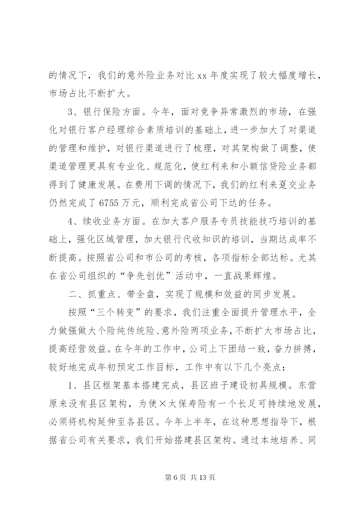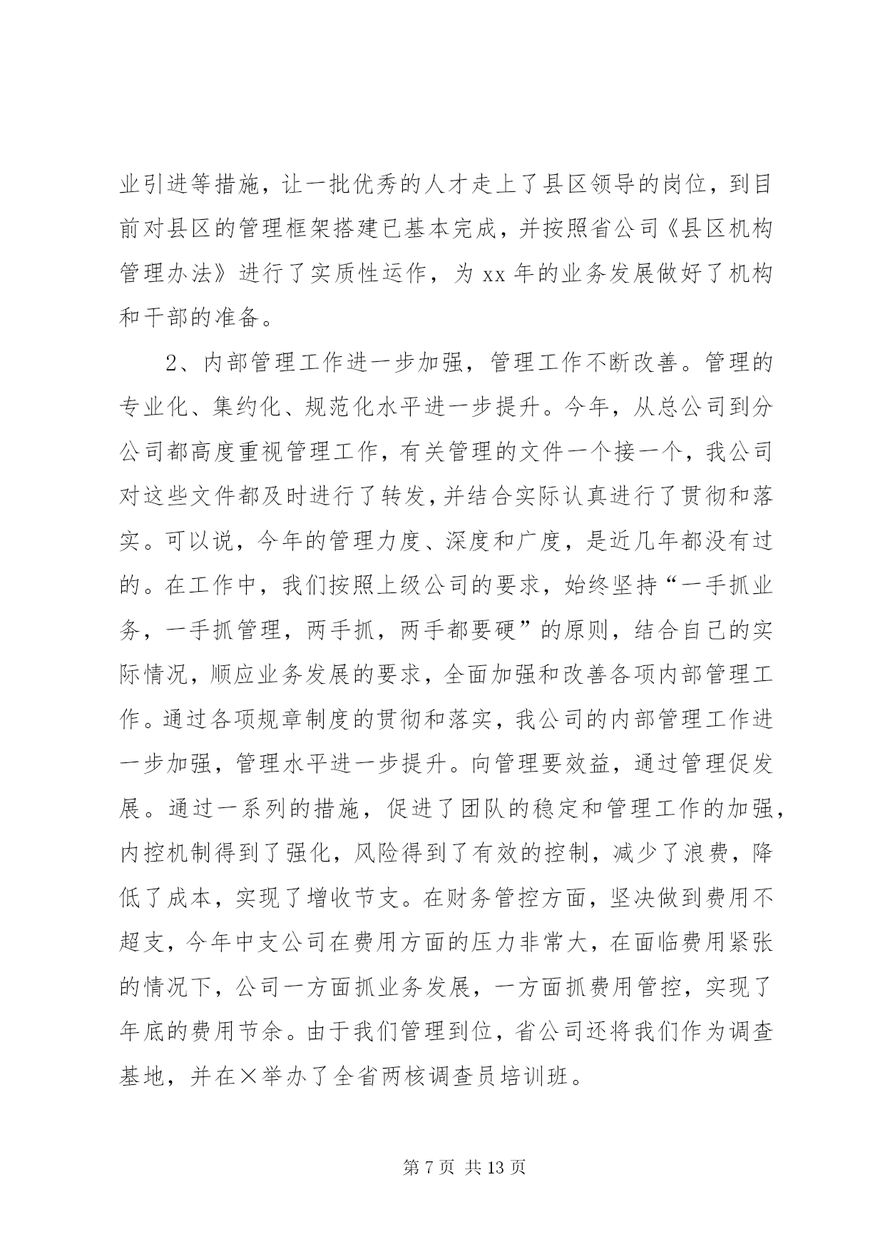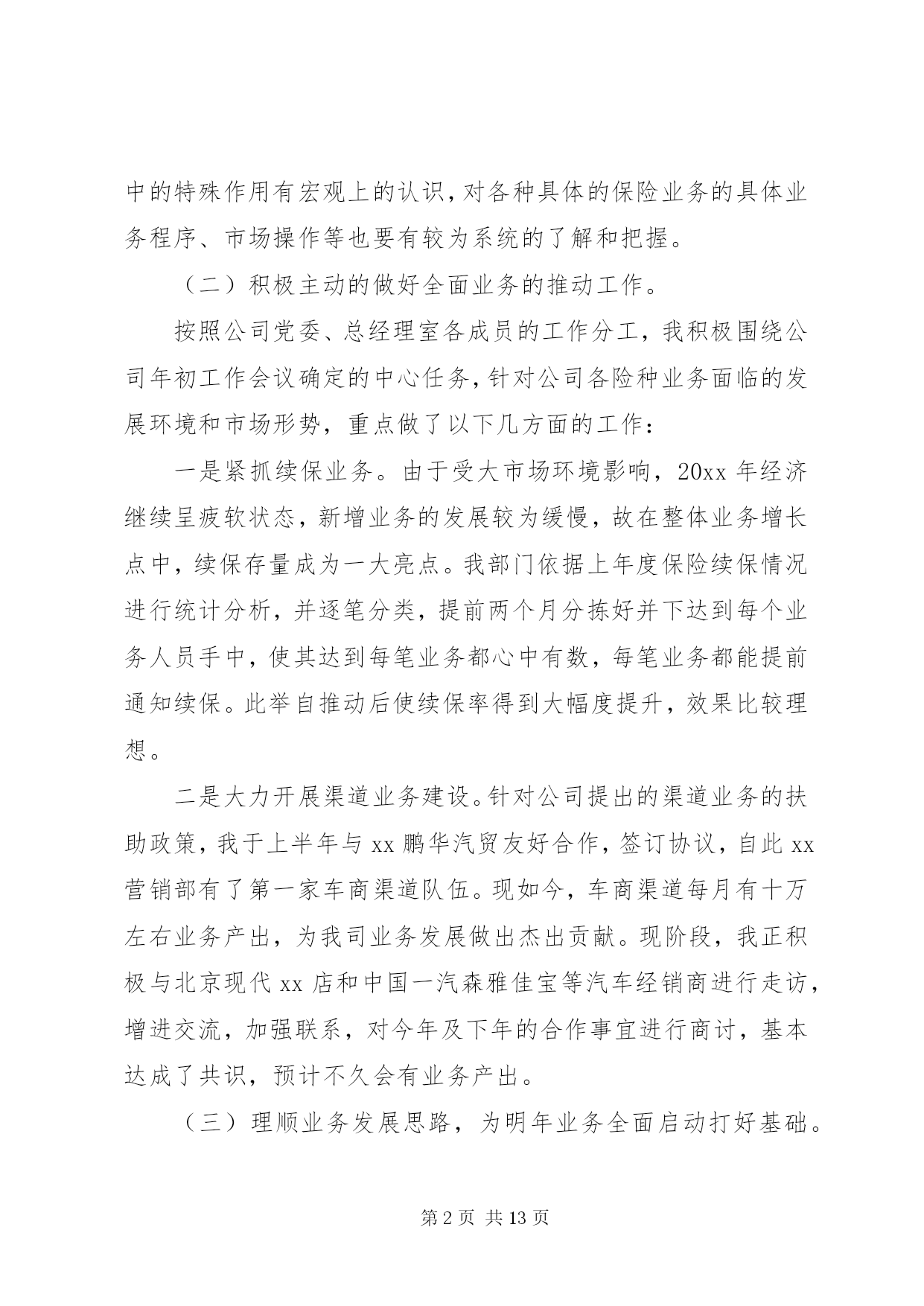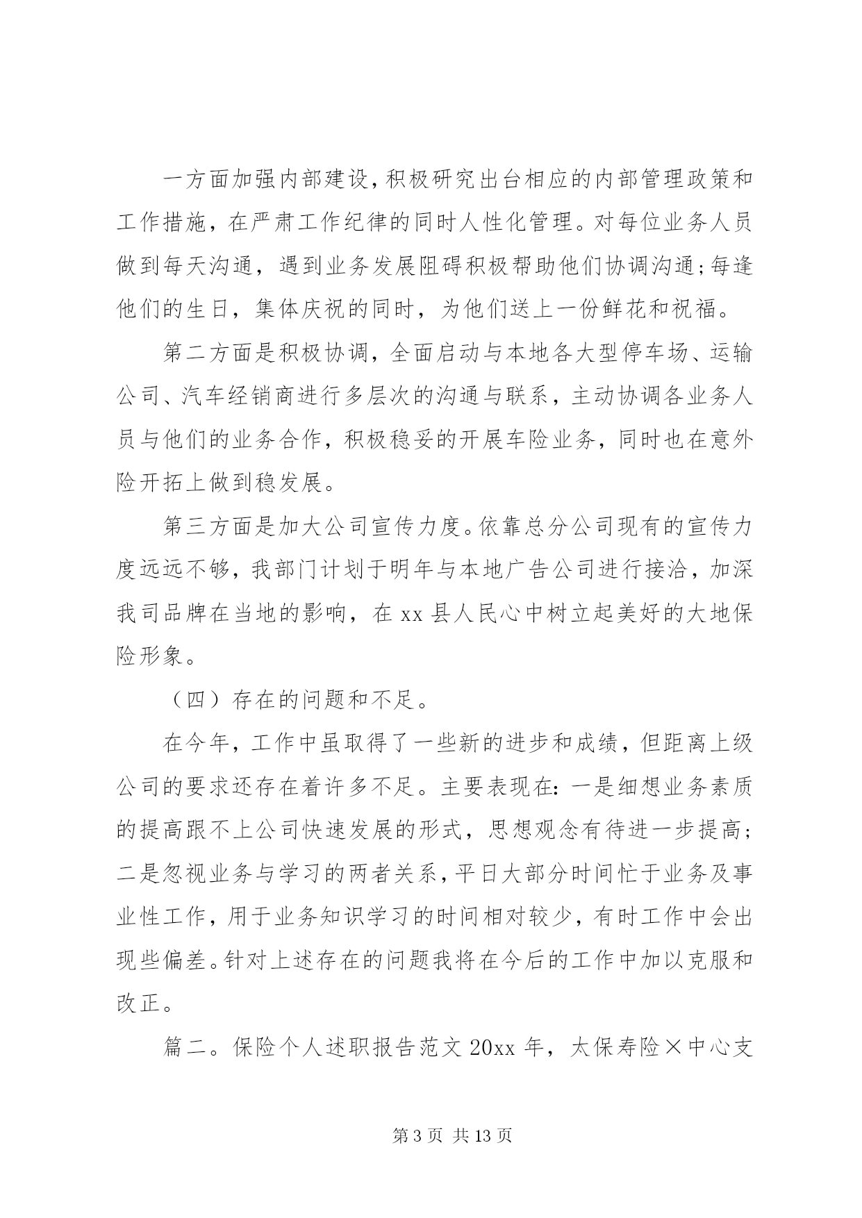 第PAGE\*Arabic\*MERGEFORMAT13页共NUMPAGES\*MERGEFORMAT13页保险个人述职报告范文篇一。保险个人述职报告范文今年以来,按照中支公司党委、总经理室的工作分工,我主要负责xx营销部的业务推动及公司内外部协调工作。这期间,在上级公司党委、总经理室的正确领导和xx中心支公司总经理室各位成员及相关部门的大力支持下,我认真履行职责,积极加强管理与引导,努力协调分管各项工作的健康发展,取得一定成绩。截止到20xx年11月18日,完成保费x万元,完成全年计划的x%,超额完成x万元,并计划截止到20xx年12月31日完成保费x万元,计划超额x万元。今天,按照xx中支年度班子考核的统一部署和要求,我就自己今年以来的履职情况向领导们做以下总结,不当之处,请批评指正。(一)积极学习,不断提升,做个合格的保险管理者。分公司上半年组织全省四级机构负责人专业知识培训,本人踊跃报名,积极参加。学习期间积极配合,善于沟通、尊重他人、关心他人,并在学习结束后获得优秀组员。十月下旬参加XX省保险行业协会组织的全省四级机构高管人员培训学习,学习过程中一如既往的刻苦努力、虚心好学,并在培训结束后获得优秀学员证书。通过这几次学习,使我对保险学科的基础理论、保险学的基础知识、保险基本业务以及保险市场基本运行方式有较全面的认识和了解;学习培训后,我对保险业在市场经济、金融经济中的特殊作用有宏观上的认识,对各种具体的保险业务的具体业务程序、市场操作等也要有较为系统的了解和把握。(二)积极主动的做好全面业务的推动工作。按照公司党委、总经理室各成员的工作分工,我积极围绕公司年初工作会议确定的中心任务,针对公司各险种业务面临的发展环境和市场形势,重点做了以下几方面的工作:一是紧抓续保业务。由于受大市场环境影响,20xx年经济继续呈疲软状态,新增业务的发展较为缓慢,故在整体业务增长点中,续保存量成为一大亮点。我部门依据上年度保险续保情况进行统计分析,并逐笔分类,提前两个月分拣好并下达到每个业务人员手中,使其达到每笔业务都心中有数,每笔业务都能提前通知续保。此举自推动后使续保率得到大幅度提升,效果比较理想。二是大力开展渠道业务建设。针对公司提出的渠道业务的扶助政策,我于上半年与xx鹏华汽贸友好合作,签订协议,自此xx营销部有了第一家车商渠道队伍。现如今,车商渠道每月有十万左右业务产出,为我司业务发展做出杰出贡献。现阶段,我正积极与北京现代xx店和中国一汽森雅佳宝等汽车经销商进行走访,增进交流,加强联系,对今年及下年的合作事宜进行商讨,基本达成了共识,预计不久会有业务产出。(三)理顺业务发展思路,为明年业务全面启动打好基础。一方面加强内部建设,积极研究出台相应的内部管理政策和工作措施,在严肃工作纪律的同时人性化管理。对每位业务人员做到每天沟通,遇到业务发展阻碍积极帮助他们协调沟通;每逢他们的生日,集体庆祝的同时,为他们送上一份鲜花和祝福。第二方面是积极协调,全面启动与本地各大型停车场、运输公司、汽车经销商进行多层次的沟通与联系,主动协调各业务人员与他们的业务合作,积极稳妥的开展车险业务,同时也在意外险开拓上做到稳发展。第三方面是加大公司宣传力度。依靠总分公司现有的宣传力度远远不够,我部门计划于明年与本地广告公司进行接洽,加深我司品牌在当地的影响,在xx县人民心中树立起美好的大地保险形象。(四)存在的问题和不足。在今年,工作中虽取得了一些新的进步和成绩,但距离上级公司的要求还存在着许多不足。主要表现在:一是细想业务素质的提高跟不上公司快速发展的形式,思想观念有待进一步提高;二是忽视业务与学习的两者关系,平日大部分时间忙于业务及事业性工作,用于业务知识学习的时间相对较少,有时工作中会出现些偏差。针对上述存在的问题我将在今后的工作中加以克服和改正。篇二。保险个人述职报告范文20xx年,太保寿险×中心支公司在济南分公司党委、总经理室的正确领导下,经过全体员工的团结拼搏,开拓进取,在业务拓展、内部管理,树立形象等方面取得了较大的成绩。今年是全面实施总公司提出的“新一轮改革与发展战略”的第一年,为此,我们在年初就明确了今年的经营指导思想——围绕总公司提出来的“三个转变”,以“诚信天下,稳健一生”的文化核心价值观为指导,继续坚持“稳健经营,以效益为中心”,全面实施预算管理;进一步调整业务结构,加大业务推动力度;切实抓好两核体系建设,不断加强基础管理;继续深化各项改革,狠抓队伍建设,努力实践“三个转变”,全面提升管理水平,全力做强做大个险纯传统险、意外险两项业务,提高经营效益,扩大市场占比。内强素质,外塑形象,通过公司上下的团结一致,奋力拼搏,真正把东营建成一家精品公司。与去年同期相比,业务结构更加合理,经济效益大幅度提高。同时,公