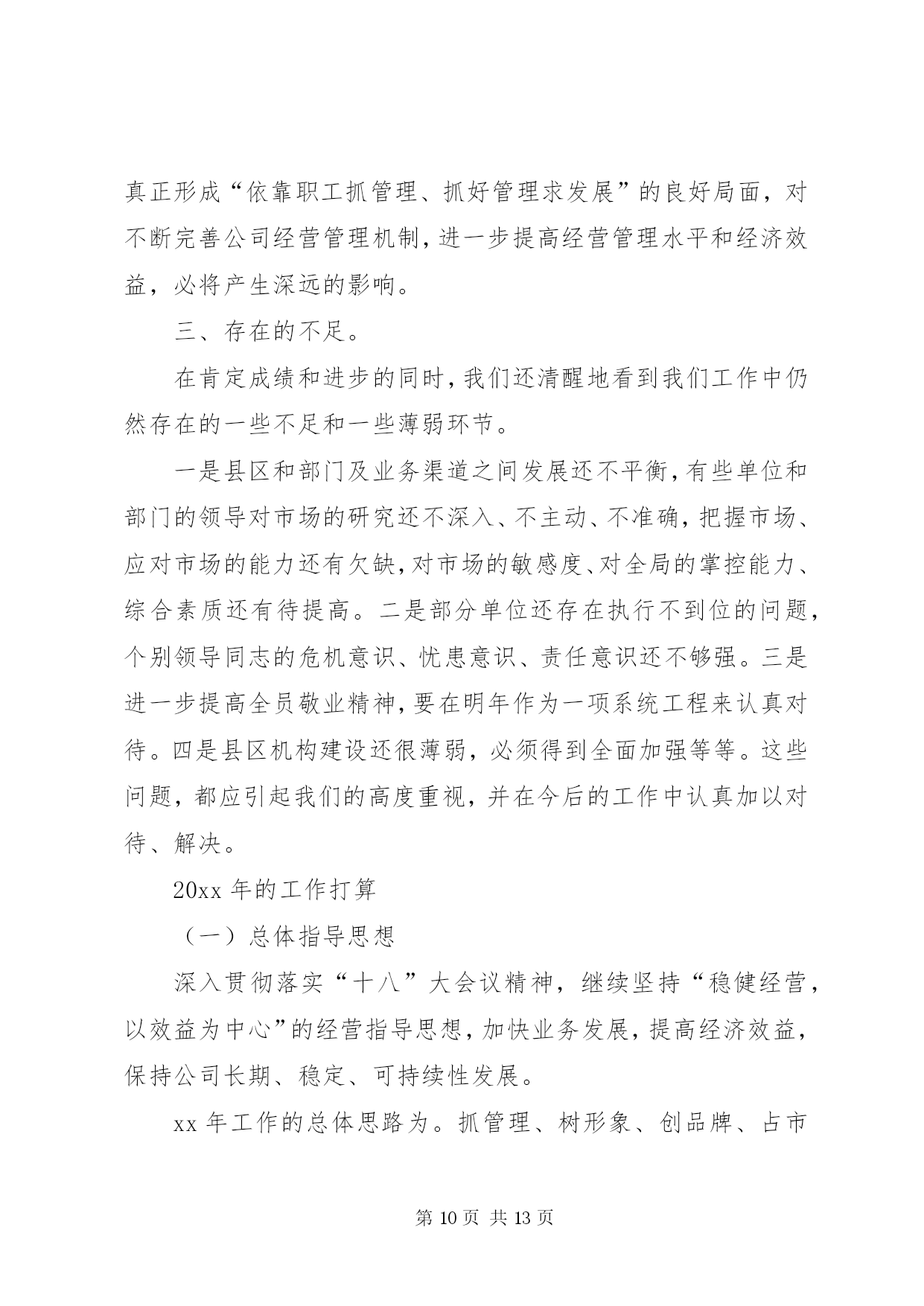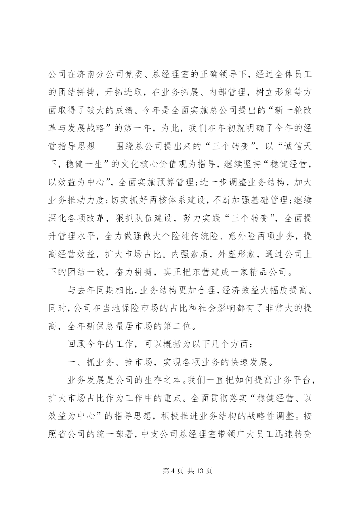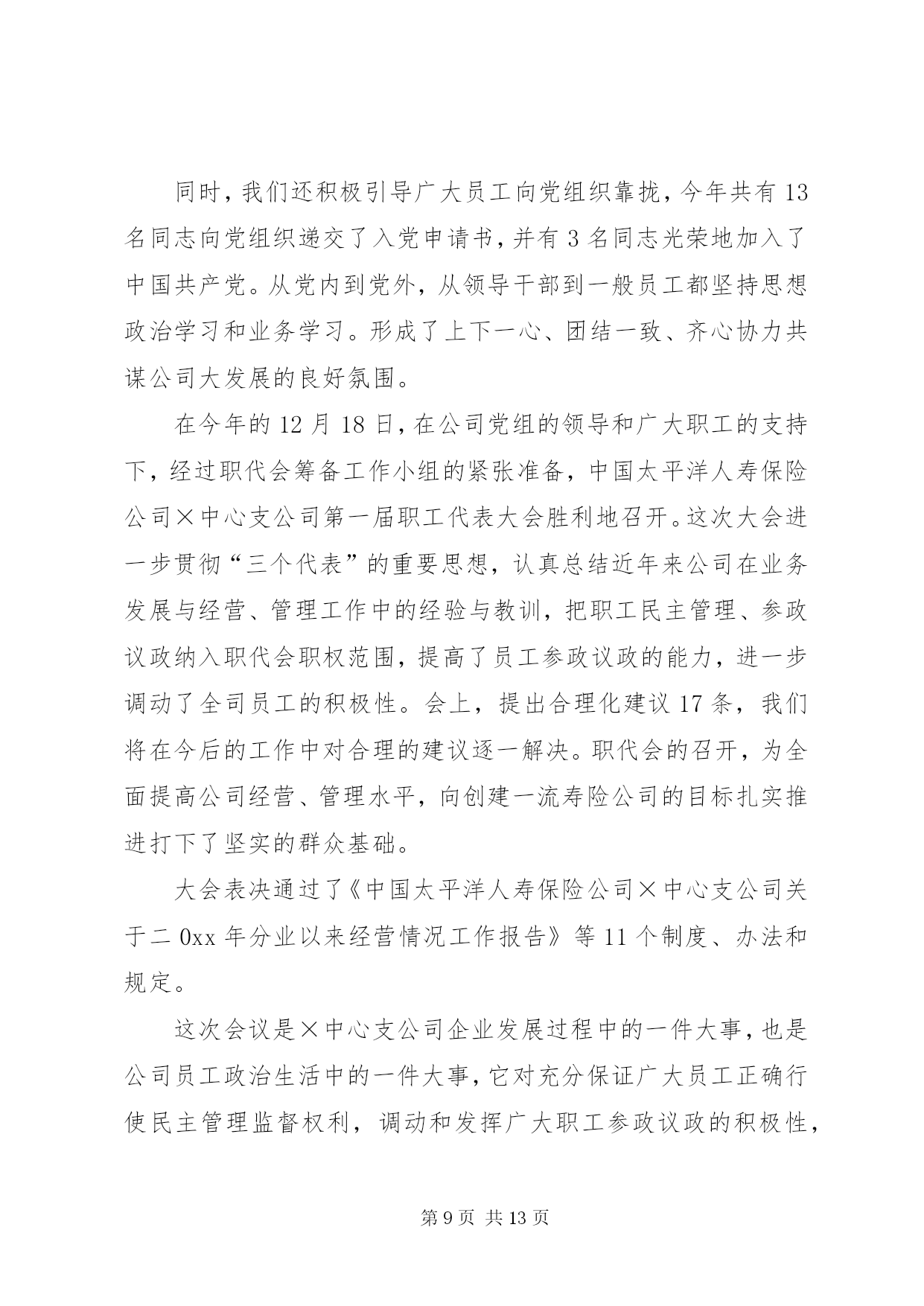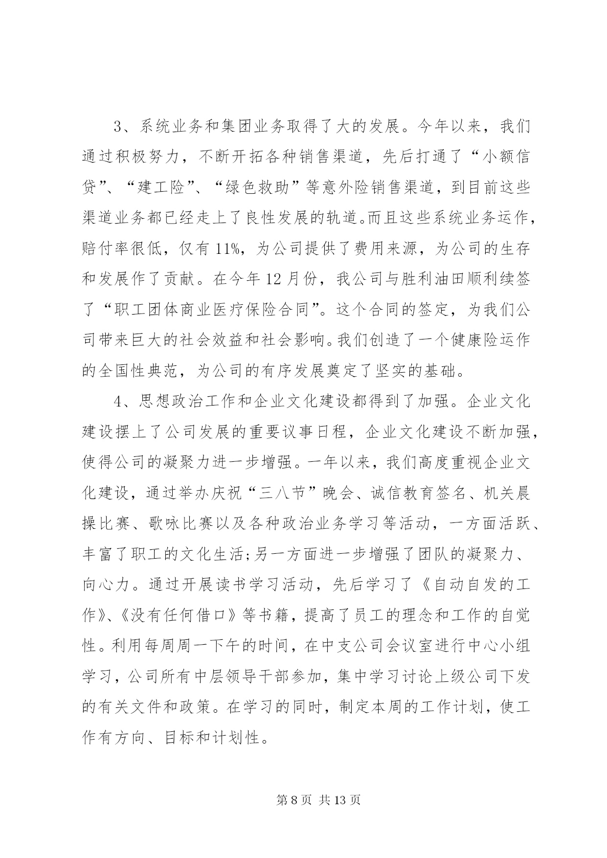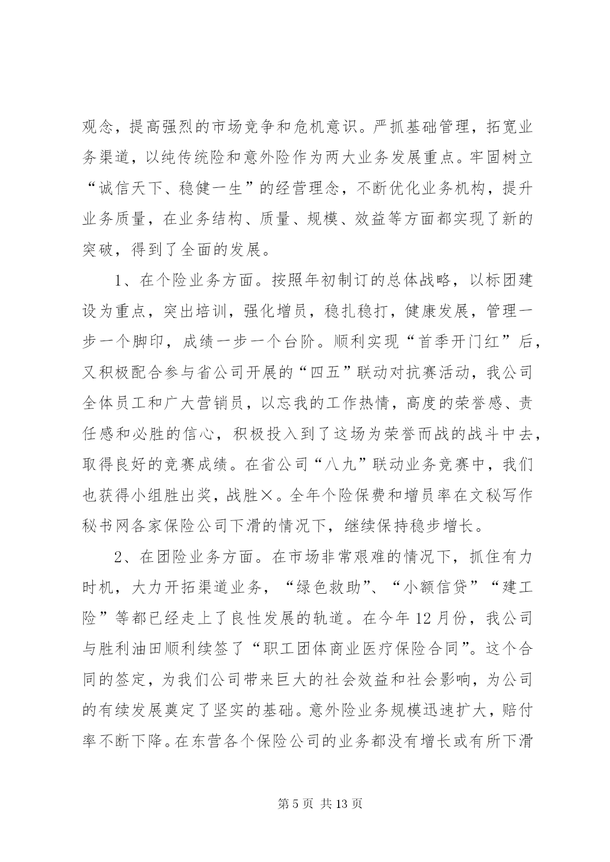 第PAGE\*Arabic\*MERGEFORMAT13页共NUMPAGES\*MERGEFORMAT13页保险个人述职报告范文篇一。保险个人述职报告范文今年以来,按照中支公司党委、总经理室的工作分工,我主要负责xx营销部的业务推动及公司内外部协调工作。这期间,在上级公司党委、总经理室的正确领导和xx中心支公司总经理室各位成员及相关部门的大力支持下,我认真履行职责,积极加强管理与引导,努力协调分管各项工作的健康发展,取得一定成绩。截止到20xx年11月18日,完成保费x万元,完成全年计划的x%,超额完成x万元,并计划截止到20xx年12月31日完成保费x万元,计划超额x万元。今天,按照xx中支年度班子考核的统一部署和要求,我就自己今年以来的履职情况向领导们做以下总结,不当之处,请批评指正。(一)积极学习,不断提升,做个合格的保险管理者。分公司上半年组织全省四级机构负责人专业知识培训,本人踊跃报名,积极参加。学习期间积极配合,善于沟通、尊重他人、关心他人,并在学习结束后获得优秀组员。十月下旬参加XX省保险行业协会组织的全省四级机构高管人员培训学习,学习过程中一如既往的刻苦努力、虚心好学,并在培训结束后获得优秀学员证书。通过这几次学习,使我对保险学科的基础理论、保险学的基础知识、保险基本业务以及保险市场基本运行方式有较全面的认识和了解;学习培训后,我对保险业在市场经济、金融经济中的特殊作用有宏观上的认识,对各种具体的保险业务的具体业务程序、市场操作等也要有较为系统的了解和把握。(二)积极主动的做好全面业务的推动工作。按照公司党委、总经理室各成员的工作分工,我积极围绕公司年初工作会议确定的中心任务,针对公司各险种业务面临的发展环境和市场形势,重点做了以下几方面的工作:一是紧抓续保业务。由于受大市场环境影响,20xx年经济继续呈疲软状态,新增业务的发展较为缓慢,故在整体业务增长点中,续保存量成为一大亮点。我部门依据上年度保险续保情况进行统计分析,并逐笔分类,提前两个月分拣好并下达到每个业务人员手中,使其达到每笔业务都心中有数,每笔业务都能提前通知续保。此举自推动后使续保率得到大幅度提升,效果比较理想。二是大力开展渠道业务建设。针对公司提出的渠道业务的扶助政策,我于上半年与xx鹏华汽贸友好合作,签订协议,自此xx营销部有了第一家车商渠道队伍。现如今,车商渠道每月有十万左右业务产出,为我司业务发展做出杰出贡献。现阶段,我正积极与北京现代xx店和中国一汽森雅佳宝等汽车经销商进行走访,增进交流,加强联系,对今年及下年的合作事宜进行商讨,基本达成了共识,预计不久会有业务产出。(三)理顺业务发展思路,为明年业务全面启动打好基础。一方面加强内部建设,积极研究出台相应的内部管理政策和工作措施,在严肃工作纪律的同时人性化管理。对每位业务人员做到每天沟通,遇到业务发展阻碍积极帮助他们协调沟通;每逢他们的生日,集体庆祝的同时,为他们送上一份鲜花和祝福。第二方面是积极协调,全面启动与本地各大型停车场、运输公司、汽车经销商进行多层次的沟通与联系,主动协调各业务人员与他们的业务合作,积极稳妥的开展车险业务,同时也在意外险开拓上做到稳发展。第三方面是加大公司宣传力度。依靠总分公司现有的宣传力度远远不够,我部门计划于明年与本地广告公司进行接洽,加深我司品牌在当地的影响,在xx县人民心中树立起美好的大地保险形象。(四)存在的问题和不足。在今年,工作中虽取得了一些新的进步和成绩,但距离上级公司的要求还存在着许多不足。主要表现在:一是细想业务素质的提高跟不上公司快速发展的形式,思想观念有待进一步提高;二是忽视业务与学习的两者关系,平日大部分时间忙于业务及事业性工作,用于业务知识学习的时间相对较少,有时工作中会出现些偏差。针对上述存在的问题我将在今后的工作中加以克服和改正。篇二。保险个人述职报告范文20xx年,太保寿险×中心支公司在济南分公司党委、总经理室的正确领导下,经过全体员工的团结拼搏,开拓进取,在业务拓展、内部管理,树立形象等方面取得了较大的成绩。今年是全面实施总公司提出的“新一轮改革与发展战略”的第一年,为此,我们在年初就明确了今年的经营指导思想——围绕总公司提出来的“三个转变”,以“诚信天下,稳健一生”的文化核心价值观为指导,继续坚持“稳健经营,以效益为中心”,全面实施预算管理;进一步调整业务结构,加大业务推动力度;切实抓好两核体系建设,不断加强基础管理;继续深化各项改革,狠抓队伍建设,努力实践“三个转变”,全面提升管理水平,全力做强做大个险纯传统险、意外险两项业务,提高经营效益,扩大市场占比。内强素质,外塑形象,通过公司上下的团结一致,奋力拼搏,真正把东营建成一家精品公司。与去年同期相比,业务结构更加合理,经济效益大幅度提高。同时,公