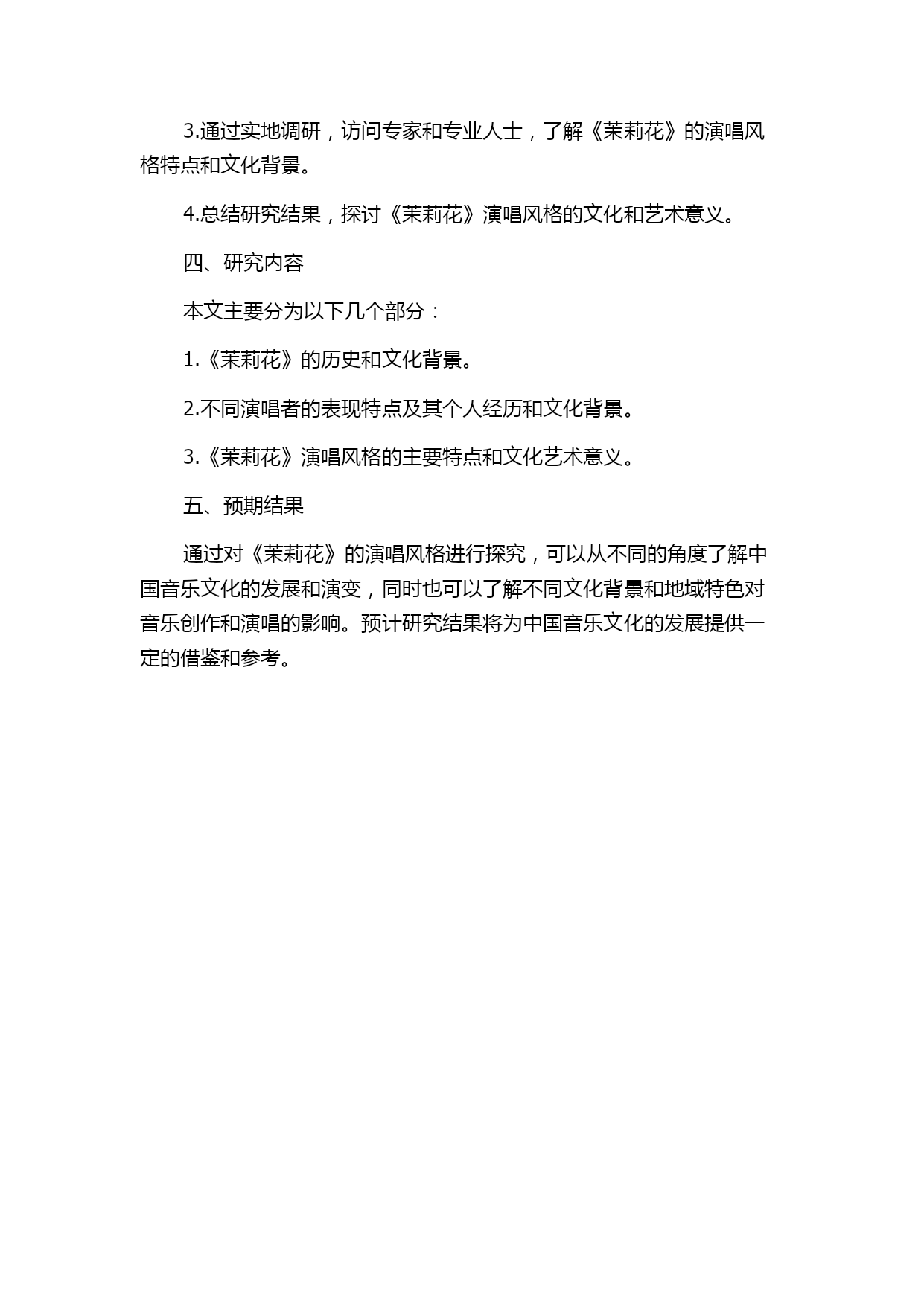 《茉莉花》演唱风格的探究的开题报告题目:《茉莉花》演唱风格的探究摘要:《茉莉花》是一首深受中国人喜爱的民歌,由于它婉转动听的旋律和清新优美的歌词,已经成为了中国音乐文化的代表作之一。本文主要针对《茉莉花》的演唱风格进行探究,分析不同演唱者的表现风格,探讨其演唱风格的特点。关键词:《茉莉花》;演唱风格;表现风格;特点一、研究背景《茉莉花》是中国流传最广的民歌之一,其歌词描述了清新的自然景观和纯真的感情。在漫长的历史中,不同地区和不同文化背景的演唱者对《茉莉花》进行了不同的诠释和表现,各具特色。因此,研究《茉莉花》的演唱风格具有重要的文化和艺术意义。二、研究目的本文旨在通过对不同演唱者的表现风格进行对比研究,分析《茉莉花》的演唱风格特点。具体研究目的如下:1.探讨不同演唱者对《茉莉花》的表现风格有何不同。2.分析不同演唱者的表现特点与其个人经历和文化背景有何关联。3.总结《茉莉花》演唱风格的主要特点,并分析其文化和艺术意义。三、研究方法本文采用文献资料法和实地调研法相结合的研究方法。具体分为以下几步:1.通过文献搜集和资料整理,了解《茉莉花》的历史和演唱者的情况。2.选取不同地区和不同文化背景的演唱者,分析其表演特点和风格。3.通过实地调研,访问专家和专业人士,了解《茉莉花》的演唱风格特点和文化背景。4.总结研究结果,探讨《茉莉花》演唱风格的文化和艺术意义。四、研究内容本文主要分为以下几个部分:1.《茉莉花》的历史和文化背景。2.不同演唱者的表现特点及其个人经历和文化背景。3.《茉莉花》演唱风格的主要特点和文化艺术意义。五、预期结果通过对《茉莉花》的演唱风格进行探究,可以从不同的角度了解中国音乐文化的发展和演变,同时也可以了解不同文化背景和地域特色对音乐创作和演唱的影响。预计研究结果将为中国音乐文化的发展提供一定的借鉴和参考。