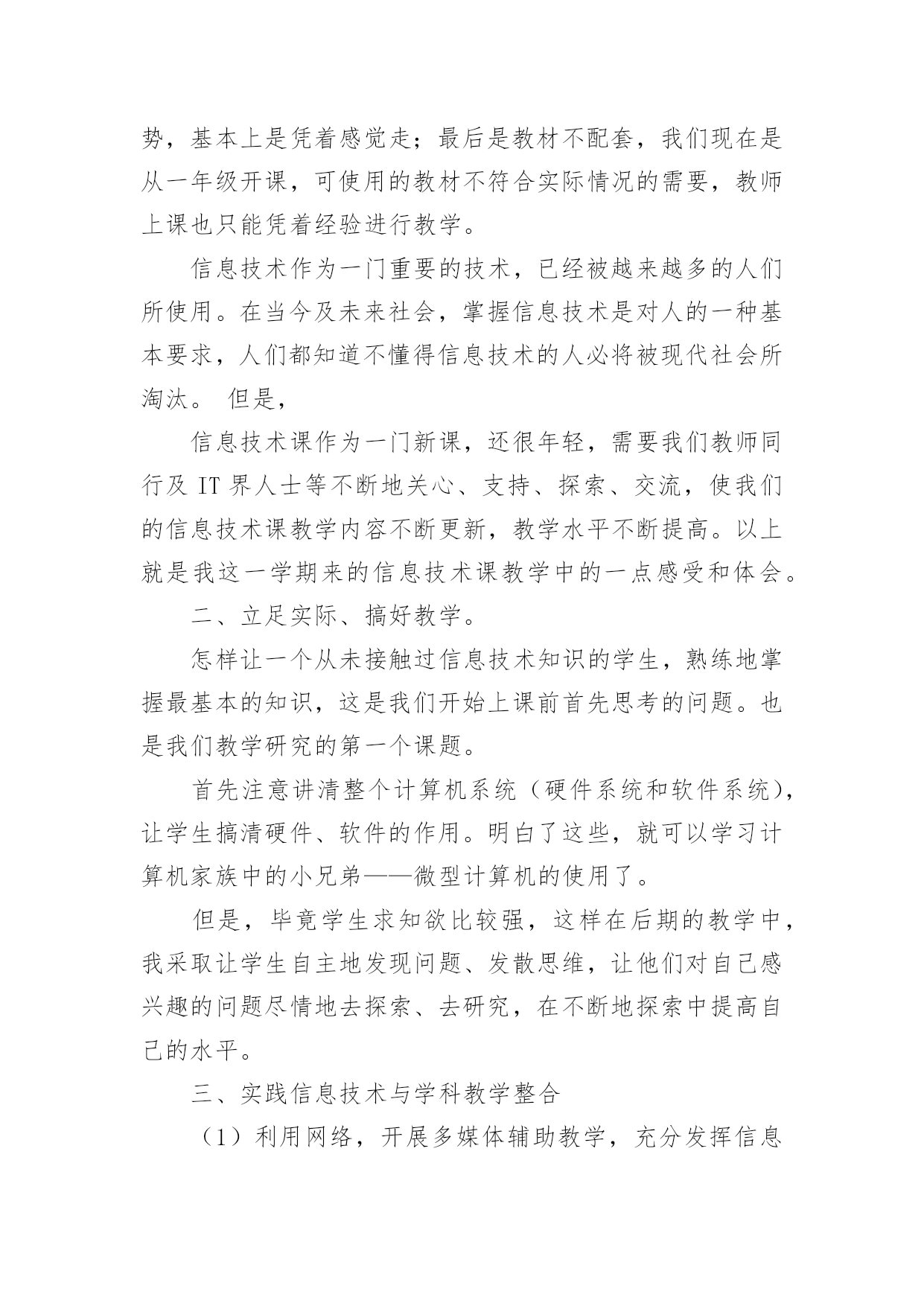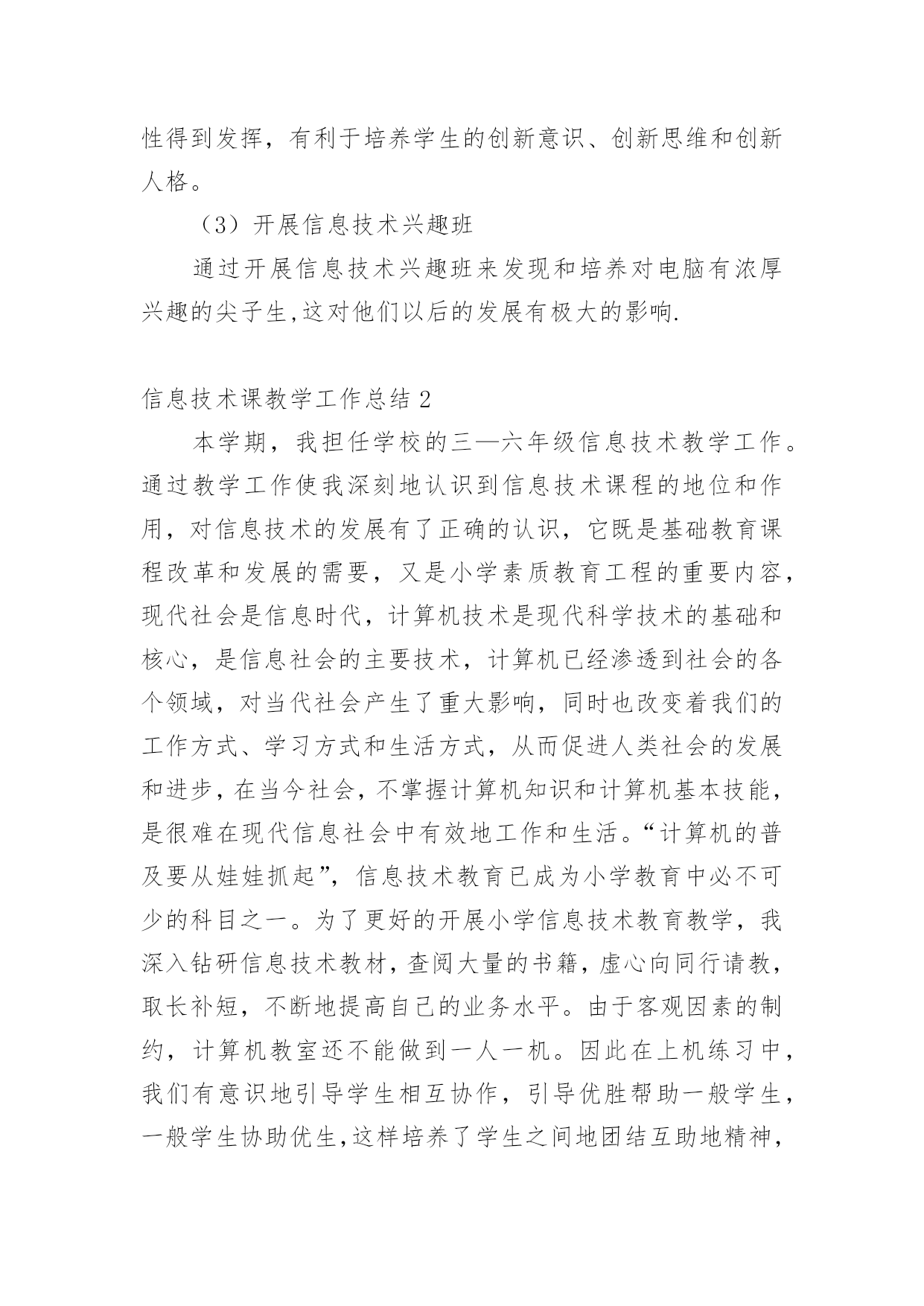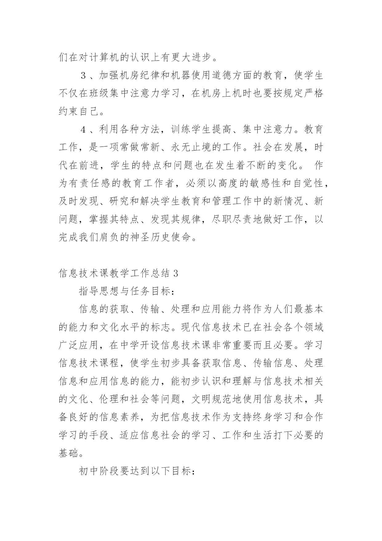 信息技术课教学工作总结总结是指对某一阶段的工作、学习或思想中的经验或情况进行分析研究,做出带有规律性结论的书面材料,它能使我们及时找出错误并改正,让我们抽出时间写写总结吧。你想知道总结怎么写吗?以下是小编帮大家整理的信息技术课教学工作总结,供大家参考借鉴,希望可以帮助到有需要的朋友。信息技术课教学工作总结1信息技术浪潮的到来给学校的发展提出了新的挑战,也提供了新的发展机遇。目前,我校已建成多媒体电脑教室一间,电子备课室一间,在基础建设、师资队伍、教育教学等诸方面都跨上了一个新台阶。我校将以一个更高的标准向社会展示我校的风采。在学校信息技术教育这一块,也得到了提高与发展,现总结如下:一、取得的成绩和存在的问题一个学期来,经过我校领导以及各教师和学生的努力,顺利完成教学任务。取得了一点成绩,在今年的中考中信息技术这一科在全市名列前茅。虽然我们取得了一定的成绩,但在一个学期的教学中也发现存在不少的问题。在第二课堂活动,很难从中发现、培养尖子学生;其次是没有参加观摩、学习机会,以至自身信息、素质难提高,无法满足学生对当今信息技术探索欲望,不了解现阶段信息技术教育教学的趋势,基本上是凭着感觉走;最后是教材不配套,我们现在是从一年级开课,可使用的教材不符合实际情况的需要,教师上课也只能凭着经验进行教学。信息技术作为一门重要的技术,已经被越来越多的人们所使用。在当今及未来社会,掌握信息技术是对人的一种基本要求,人们都知道不懂得信息技术的人必将被现代社会所淘汰。但是,信息技术课作为一门新课,还很年轻,需要我们教师同行及IT界人士等不断地关心、支持、探索、交流,使我们的信息技术课教学内容不断更新,教学水平不断提高。以上就是我这一学期来的信息技术课教学中的一点感受和体会。二、立足实际、搞好教学。怎样让一个从未接触过信息技术知识的学生,熟练地掌握最基本的知识,这是我们开始上课前首先思考的问题。也是我们教学研究的第一个课题。首先注意讲清整个计算机系统(硬件系统和软件系统),让学生搞清硬件、软件的作用。明白了这些,就可以学习计算机家族中的小兄弟——微型计算机的使用了。但是,毕竟学生求知欲比较强,这样在后期的教学中,我采取让学生自主地发现问题、发散思维,让他们对自己感兴趣的问题尽情地去探索、去研究,在不断地探索中提高自己的水平。三、实践信息技术与学科教学整合(1)利用网络,开展多媒体辅助教学,充分发挥信息技术在学科教学中的作用。通过网络,教师可以获得所教学科的各方面资料,拓宽学生视野,优化课堂教学。比如:在教室里,教师可以用操作电脑,展示教学课件;播放VCD、录像等格式的教学片。自制教学课件,创设教学情境,激发学生的学习兴趣;变抽象为形象,帮助学生理解学习中的难点;变静为动,突破教学重难点;巧设练习,让学生在乐中学、乐中练。使课堂变得更加生动有趣,大大提高了课堂教学效率。(2)开展网络环境下研究性教学的'研究,转变学生的学习方式。以往教学大纲更多地强调教师的教,如今课程标准着眼于学生的学,强调学生学习的过程与方法。以往更多关注的是学习的结果,而忽略了学生是通过什么样的学习方式和策略来学习的。关注学生在学习过程中有价值的思考,鼓励学生创新思维在教学过程中的普遍应用,促进信息技术与学科课程的整合是进入信息化时代的要求。把信息技术作为学生学习的认知工具。这种方式是利用信息技术作为课程学习内容和学习资源的获取工具;作为情境探究和发现学习的工具;作为协商学习和交流讨论的通讯工具;作为知识构建和创作实践的工具;作为自我评测和学习反馈的工具。总之,是学生自己主动选择利用信息技术工具,去完成学习的各个环节,达到学习的目标。我们说网络只是环境,教学模式改革的目的在于使学生的主体地位得以真正的确立,学习的自主性、能动性、合作性得到发挥,有利于培养学生的创新意识、创新思维和创新人格。(3)开展信息技术兴趣班通过开展信息技术兴趣班来发现和培养对电脑有浓厚兴趣的尖子生,这对他们以后的发展有极大的影响.信息技术课教学工作总结2本学期,我担任学校的三—六年级信息技术教学工作。通过教学工作使我深刻地认识到信息技术课程的地位和作用,对信息技术的发展有了正确的认识,它既是基础教育课程改革和发展的需要,又是小学素质教育工程的重要内容,现代社会是信息时代,计算机技术是现代科学技术的基础和核心,是信息社会的主要技术,计算机已经渗透到社会的各个领域,对当代社会产生了重大影响,同时也改变着我们的工作方式、学习方式和生活方式,从而促进人类社会的发展和进步,在当今社会,不掌握计算机知识和计算机基本技能,是很难在现代信息社会中有效地工作和生活。“计算机的普及要从娃娃抓起”,信息技术教育已成为小学教育中必不可少的科目之一。为了更好的开展小学信息技术教育教学,我深入钻研信息技术教材,查阅大量的书籍,虚心向