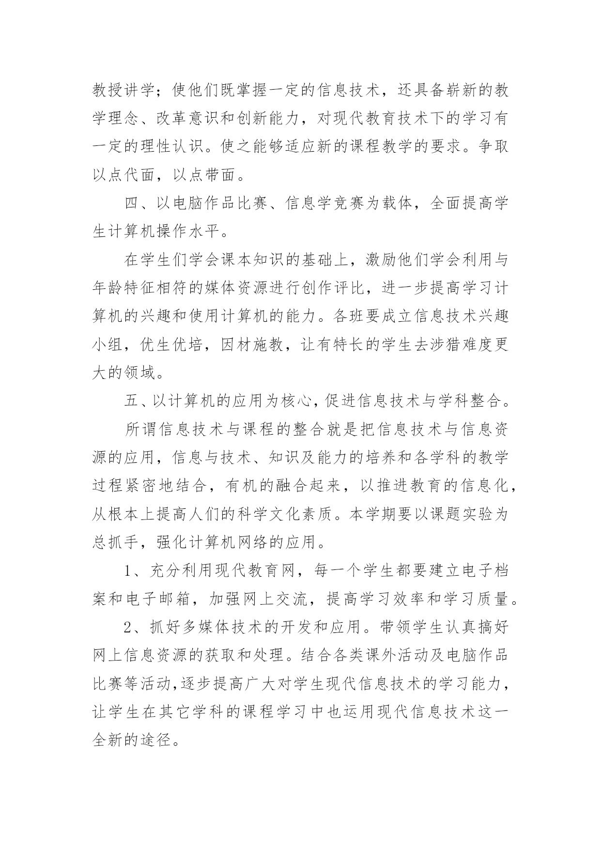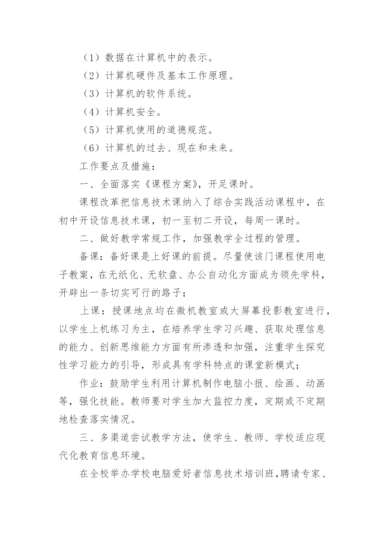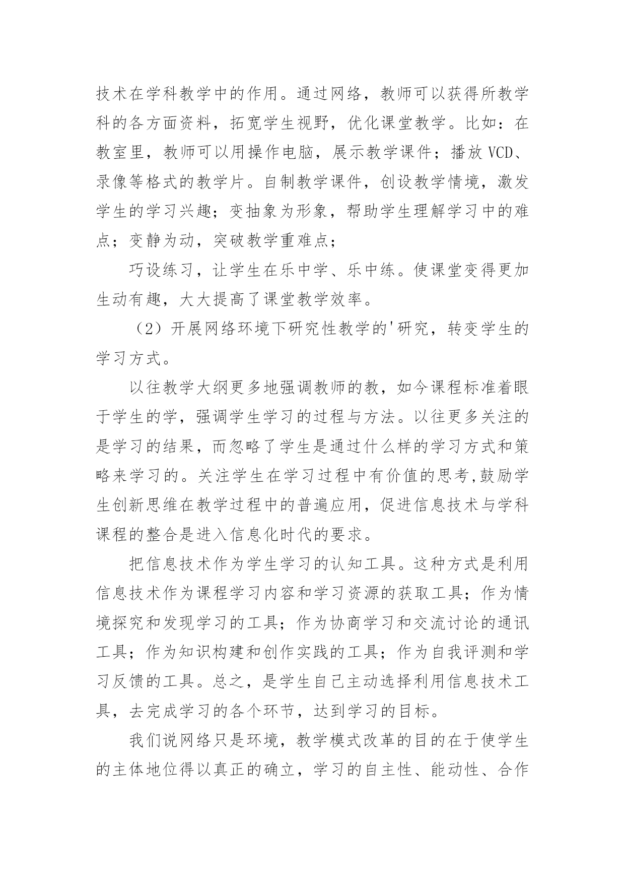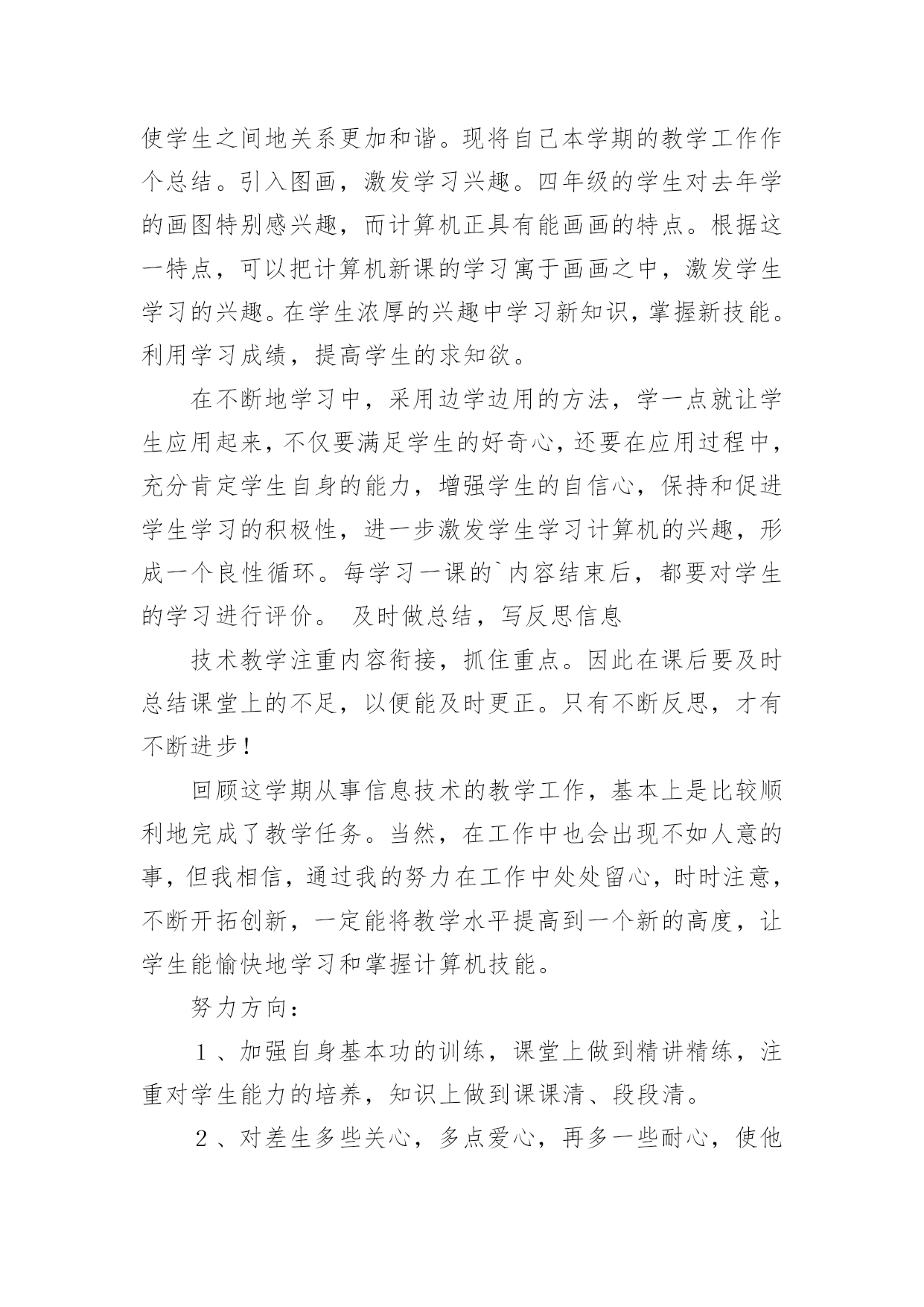 信息技术课教学工作总结总结是指对某一阶段的工作、学习或思想中的经验或情况进行分析研究,做出带有规律性结论的书面材料,它能使我们及时找出错误并改正,让我们抽出时间写写总结吧。你想知道总结怎么写吗?以下是小编帮大家整理的信息技术课教学工作总结,供大家参考借鉴,希望可以帮助到有需要的朋友。信息技术课教学工作总结1信息技术浪潮的到来给学校的发展提出了新的挑战,也提供了新的发展机遇。目前,我校已建成多媒体电脑教室一间,电子备课室一间,在基础建设、师资队伍、教育教学等诸方面都跨上了一个新台阶。我校将以一个更高的标准向社会展示我校的风采。在学校信息技术教育这一块,也得到了提高与发展,现总结如下:一、取得的成绩和存在的问题一个学期来,经过我校领导以及各教师和学生的努力,顺利完成教学任务。取得了一点成绩,在今年的中考中信息技术这一科在全市名列前茅。虽然我们取得了一定的成绩,但在一个学期的教学中也发现存在不少的问题。在第二课堂活动,很难从中发现、培养尖子学生;其次是没有参加观摩、学习机会,以至自身信息、素质难提高,无法满足学生对当今信息技术探索欲望,不了解现阶段信息技术教育教学的趋势,基本上是凭着感觉走;最后是教材不配套,我们现在是从一年级开课,可使用的教材不符合实际情况的需要,教师上课也只能凭着经验进行教学。信息技术作为一门重要的技术,已经被越来越多的人们所使用。在当今及未来社会,掌握信息技术是对人的一种基本要求,人们都知道不懂得信息技术的人必将被现代社会所淘汰。但是,信息技术课作为一门新课,还很年轻,需要我们教师同行及IT界人士等不断地关心、支持、探索、交流,使我们的信息技术课教学内容不断更新,教学水平不断提高。以上就是我这一学期来的信息技术课教学中的一点感受和体会。二、立足实际、搞好教学。怎样让一个从未接触过信息技术知识的学生,熟练地掌握最基本的知识,这是我们开始上课前首先思考的问题。也是我们教学研究的第一个课题。首先注意讲清整个计算机系统(硬件系统和软件系统),让学生搞清硬件、软件的作用。明白了这些,就可以学习计算机家族中的小兄弟——微型计算机的使用了。但是,毕竟学生求知欲比较强,这样在后期的教学中,我采取让学生自主地发现问题、发散思维,让他们对自己感兴趣的问题尽情地去探索、去研究,在不断地探索中提高自己的水平。三、实践信息技术与学科教学整合(1)利用网络,开展多媒体辅助教学,充分发挥信息技术在学科教学中的作用。通过网络,教师可以获得所教学科的各方面资料,拓宽学生视野,优化课堂教学。比如:在教室里,教师可以用操作电脑,展示教学课件;播放VCD、录像等格式的教学片。自制教学课件,创设教学情境,激发学生的学习兴趣;变抽象为形象,帮助学生理解学习中的难点;变静为动,突破教学重难点;巧设练习,让学生在乐中学、乐中练。使课堂变得更加生动有趣,大大提高了课堂教学效率。(2)开展网络环境下研究性教学的'研究,转变学生的学习方式。以往教学大纲更多地强调教师的教,如今课程标准着眼于学生的学,强调学生学习的过程与方法。以往更多关注的是学习的结果,而忽略了学生是通过什么样的学习方式和策略来学习的。关注学生在学习过程中有价值的思考,鼓励学生创新思维在教学过程中的普遍应用,促进信息技术与学科课程的整合是进入信息化时代的要求。把信息技术作为学生学习的认知工具。这种方式是利用信息技术作为课程学习内容和学习资源的获取工具;作为情境探究和发现学习的工具;作为协商学习和交流讨论的通讯工具;作为知识构建和创作实践的工具;作为自我评测和学习反馈的工具。总之,是学生自己主动选择利用信息技术工具,去完成学习的各个环节,达到学习的目标。我们说网络只是环境,教学模式改革的目的在于使学生的主体地位得以真正的确立,学习的自主性、能动性、合作性得到发挥,有利于培养学生的创新意识、创新思维和创新人格。(3)开展信息技术兴趣班通过开展信息技术兴趣班来发现和培养对电脑有浓厚兴趣的尖子生,这对他们以后的发展有极大的影响.信息技术课教学工作总结2本学期,我担任学校的三—六年级信息技术教学工作。通过教学工作使我深刻地认识到信息技术课程的地位和作用,对信息技术的发展有了正确的认识,它既是基础教育课程改革和发展的需要,又是小学素质教育工程的重要内容,现代社会是信息时代,计算机技术是现代科学技术的基础和核心,是信息社会的主要技术,计算机已经渗透到社会的各个领域,对当代社会产生了重大影响,同时也改变着我们的工作方式、学习方式和生活方式,从而促进人类社会的发展和进步,在当今社会,不掌握计算机知识和计算机基本技能,是很难在现代信息社会中有效地工作和生活。“计算机的普及要从娃娃抓起”,信息技术教育已成为小学教育中必不可少的科目之一。为了更好的开展小学信息技术教育教学,我深入钻研信息技术教材,查阅大量的书籍,虚心向