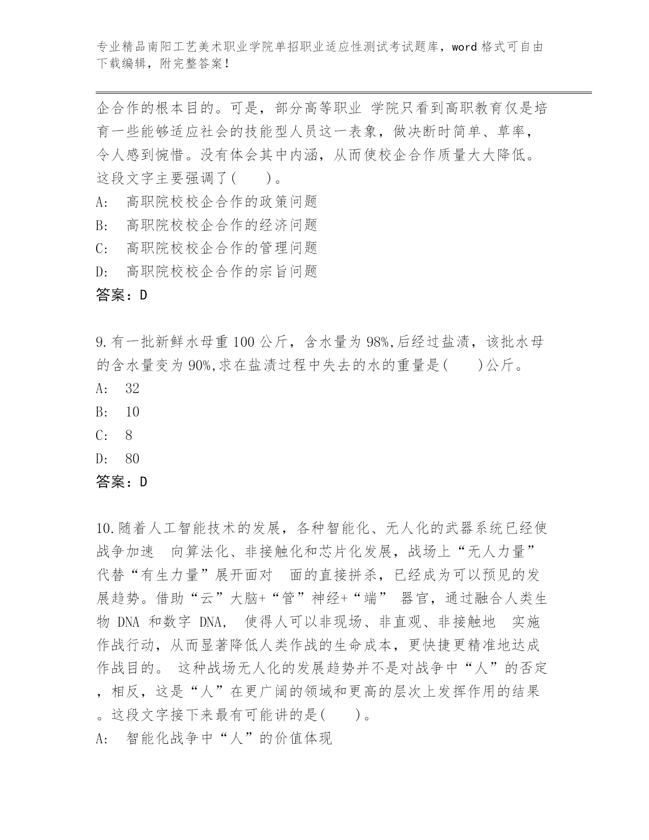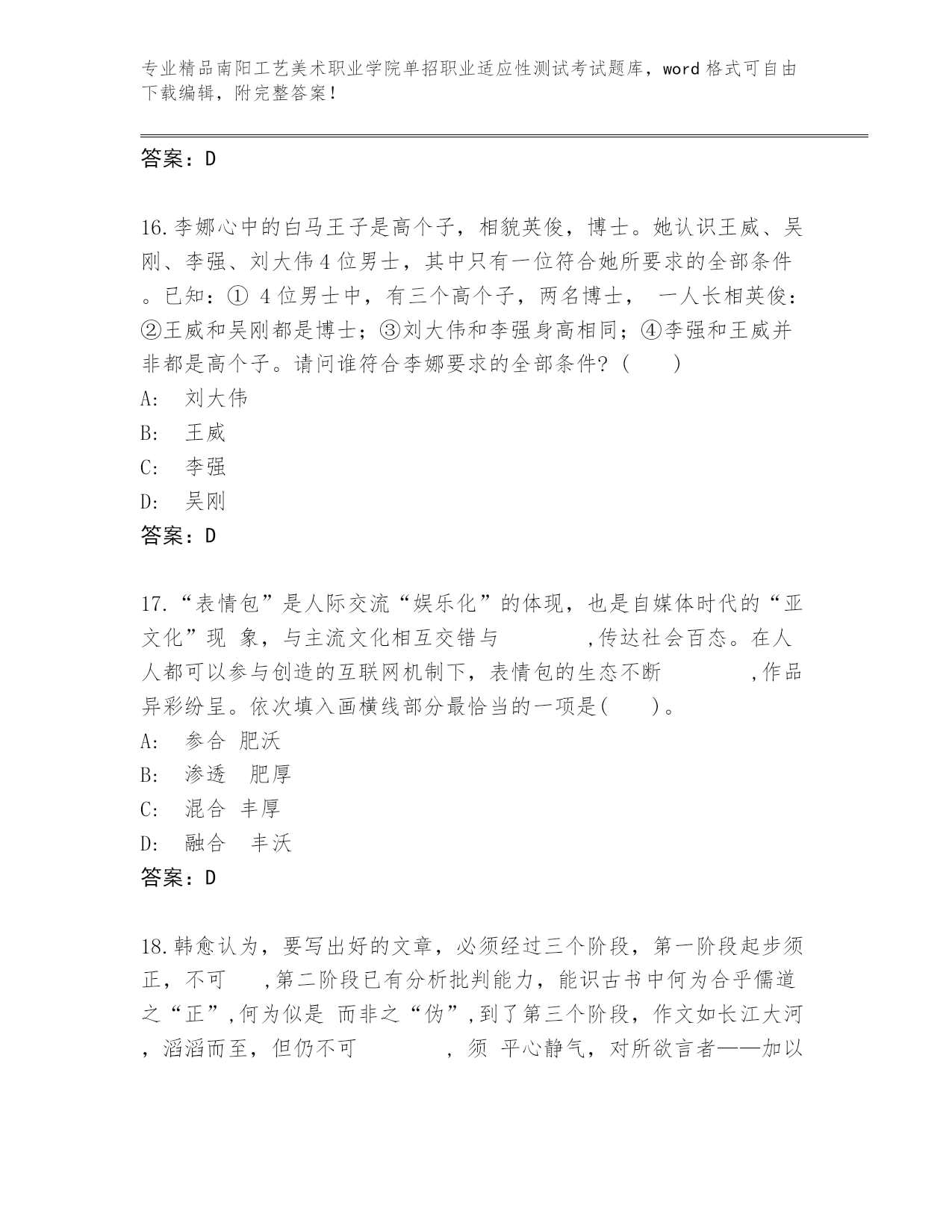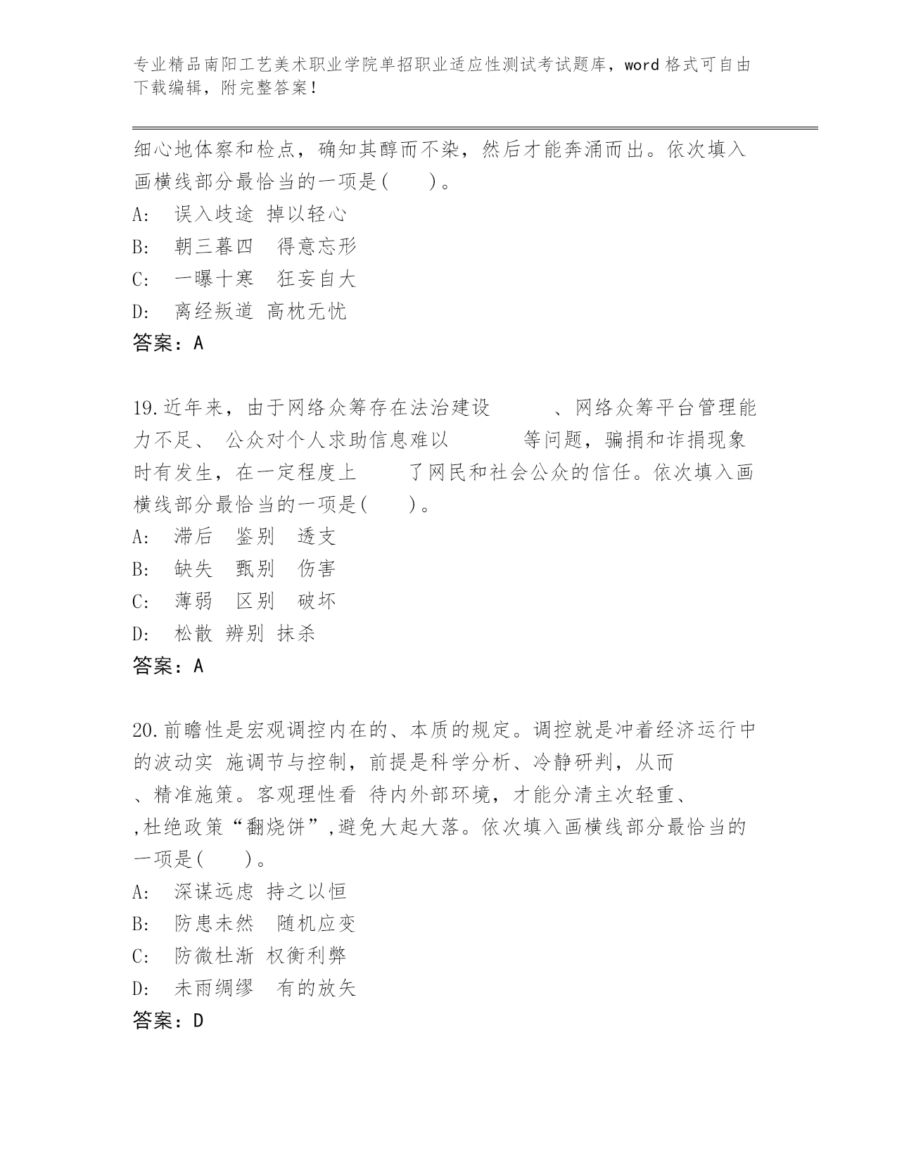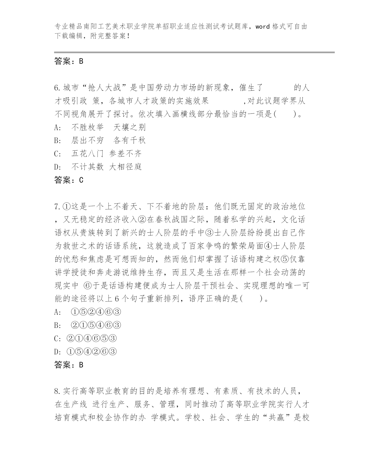 优选南阳工艺美术职业学院单招职业适应性测试考试真题精品(典优)