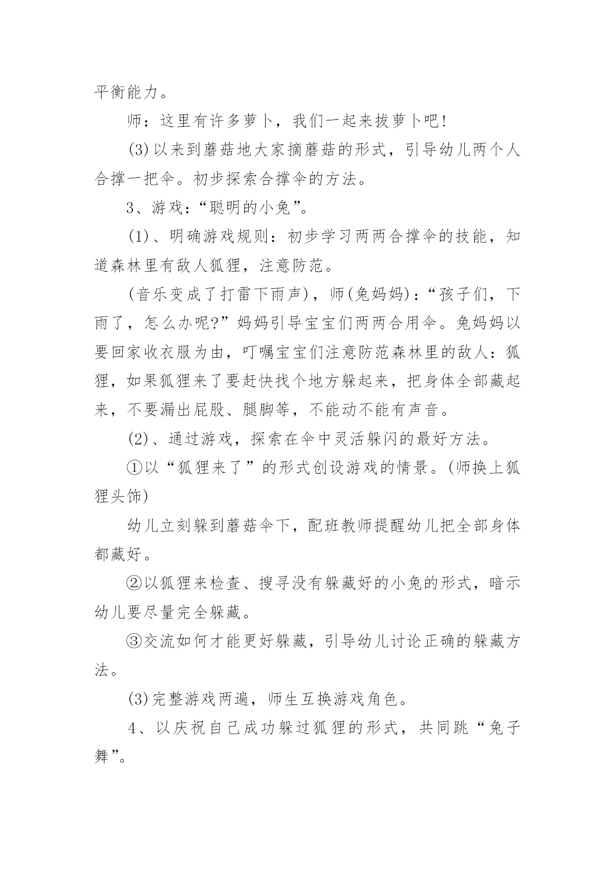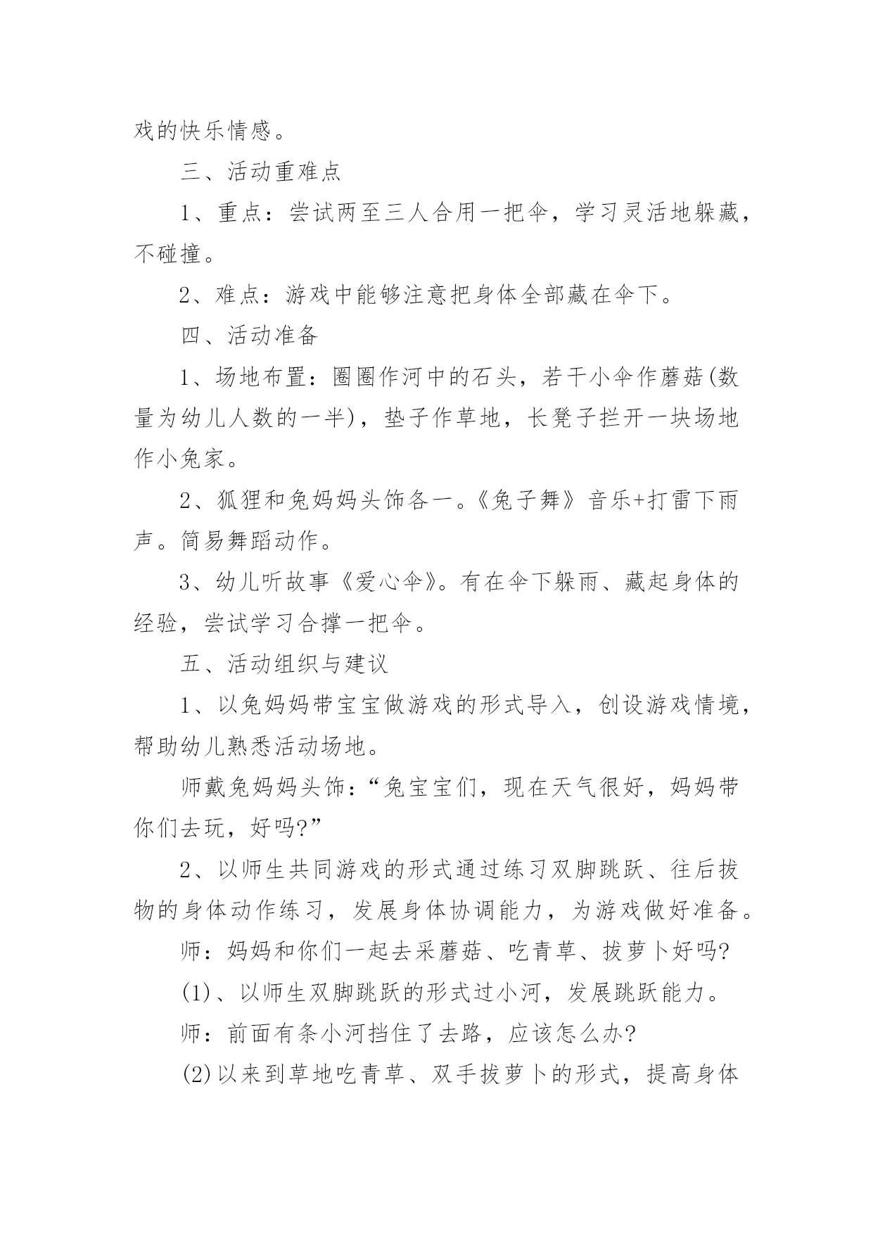 健康教育的活动教案健康教育的活动教案教案是教学设计的文本表现形式,是教师在整个教学过程中用来支撑课堂实践的理论基础。下面是小编为你精心整理的健康教育活动教案,希望对你有帮助!健康教育活动教案一、活动背景:可爱的小兔、狡猾的狐狸为小班幼儿所熟识。很多活动都借助于这两种动物角色的穿插表演,小班幼儿都非常投入,活动效果也比较好。所以本活动也以动物间的追与躲的游戏为组织形式,以满足幼儿对动物情境表演的兴趣。小班幼儿的自我形体感知能力还有待提高,他们往往不能较为正确地估测自身与周围环境的空间立体关系。譬如撑伞时可能会只罩住自己的头部,而把身体露在伞外;或者撑伞时不能注意与周围环境事物的协调,总要碰到他人或碰倒物品等。下雨天幼儿带来了许多雨伞,教师以此为道具,引导幼儿学习两人合撑一把伞,尝试把自己的身体全部躲藏起来,在游戏情景中发展幼儿对自己身体与周围环境的.空间感知能力。二、活动目标1、通过和兔妈妈做游戏的形式发展身体灵活躲闪能力,使身体动作更加协调。2、在游戏中尝试两人合用一把伞,体验与同伴共同游戏的快乐情感。三、活动重难点1、重点:尝试两至三人合用一把伞,学习灵活地躲藏,不碰撞。2、难点:游戏中能够注意把身体全部藏在伞下。四、活动准备1、场地布置:圈圈作河中的石头,若干小伞作蘑菇(数量为幼儿人数的一半),垫子作草地,长凳子拦开一块场地作小兔家。2、狐狸和兔妈妈头饰各一。《兔子舞》音乐+打雷下雨声。简易舞蹈动作。3、幼儿听故事《爱心伞》。有在伞下躲雨、藏起身体的经验,尝试学习合撑一把伞。五、活动组织与建议1、以兔妈妈带宝宝做游戏的形式导入,创设游戏情境,帮助幼儿熟悉活动场地。师戴兔妈妈头饰:“兔宝宝们,现在天气很好,妈妈带你们去玩,好吗?”2、以师生共同游戏的形式通过练习双脚跳跃、往后拔物的身体动作练习,发展身体协调能力,为游戏做好准备。师:妈妈和你们一起去采蘑菇、吃青草、拔萝卜好吗?(1)、以师生双脚跳跃的形式过小河,发展跳跃能力。师:前面有条小河挡住了去路,应该怎么办?(2)以来到草地吃青草、双手拔萝卜的形式,提高身体平衡能力。师:这里有许多萝卜,我们一起来拔萝卜吧!(3)以来到蘑菇地大家摘蘑菇的形式,引导幼儿两个人合撑一把伞。初步探索合撑伞的方法。3、游戏:“聪明的小兔”。(1)、明确游戏规则:初步学习两两合撑伞的技能,知道森林里有敌人狐狸,注意防范。(音乐变成了打雷下雨声),师(兔妈妈):“孩子们,下雨了,怎么办呢?”妈妈引导宝宝们两两合用伞。兔妈妈以要回家收衣服为由,叮嘱宝宝们注意防范森林里的敌人:狐狸,如果狐狸来了要赶快找个地方躲起来,把身体全部藏起来,不要漏出屁股、腿脚等,不能动不能有声音。(2)、通过游戏,探索在伞中灵活躲闪的最好方法。①以“狐狸来了”的形式创设游戏的情景。(师换上狐狸头饰)幼儿立刻躲到蘑菇伞下,配班教师提醒幼儿把全部身体都藏好。②以狐狸来检查、搜寻没有躲藏好的小兔的形式,暗示幼儿要尽量完全躲藏。③交流如何才能更好躲藏,引导幼儿讨论正确的躲藏方法。(3)完整游戏两遍,师生互换游戏角色。4、以庆祝自己成功躲过狐狸的形式,共同跳“兔子舞”。5、以“天晚了,我们要回家了”的形式,师生共同做放松运动,结束活动。