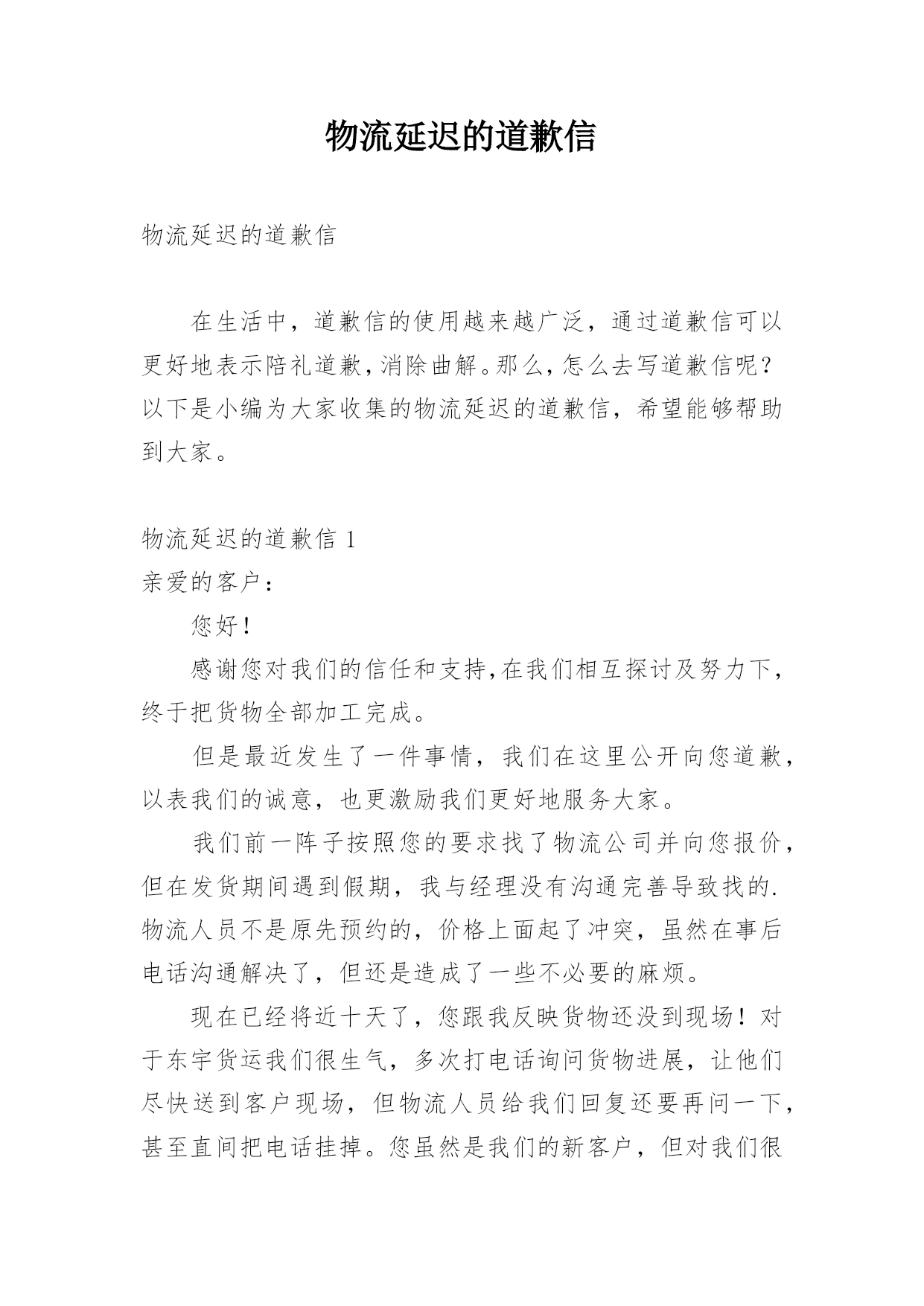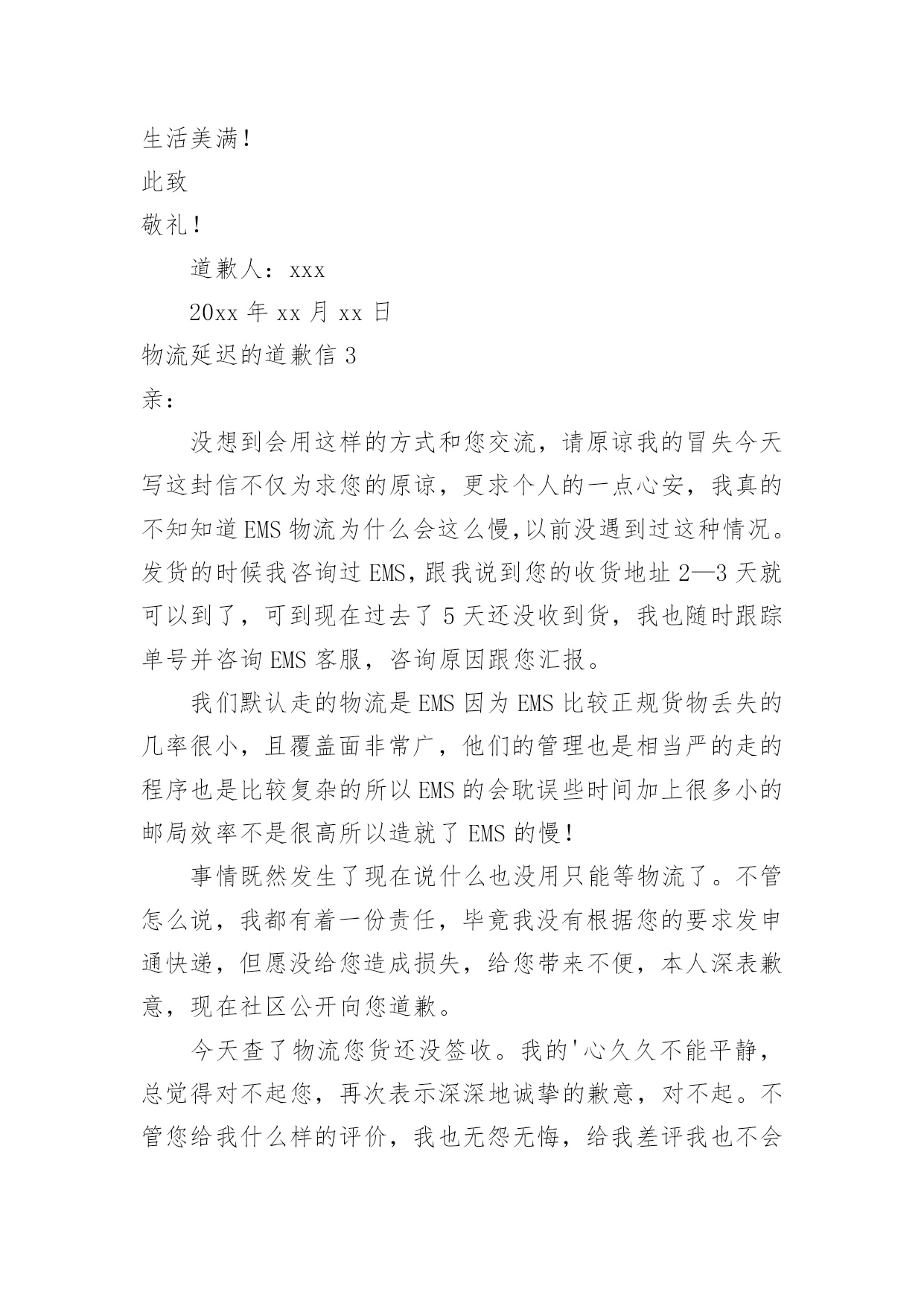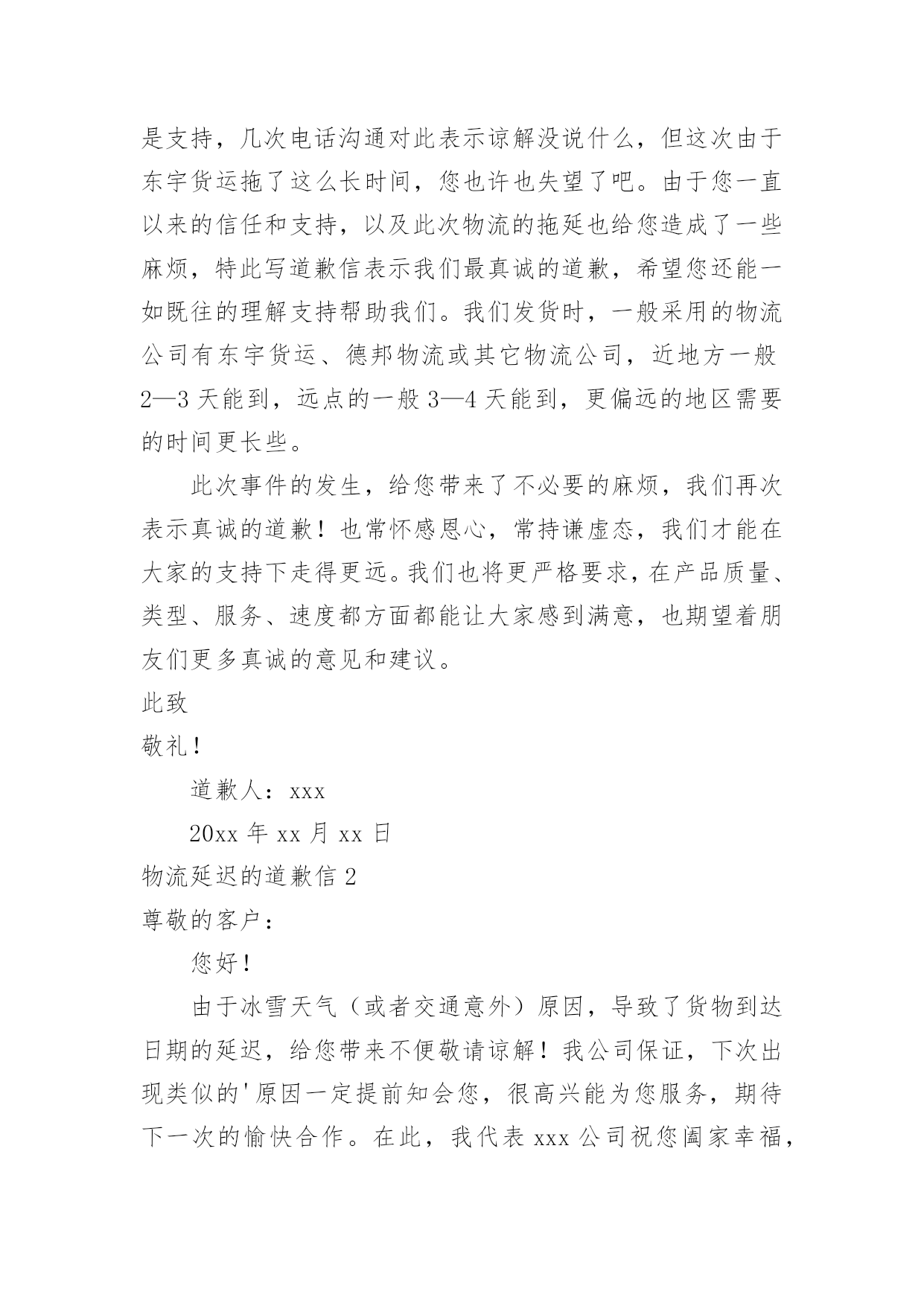 物流延迟的道歉信物流延迟的道歉信在生活中,道歉信的使用越来越广泛,通过道歉信可以更好地表示陪礼道歉,消除曲解。那么,怎么去写道歉信呢?以下是小编为大家收集的物流延迟的道歉信,希望能够帮助到大家。物流延迟的道歉信1亲爱的客户:您好!感谢您对我们的信任和支持,在我们相互探讨及努力下,终于把货物全部加工完成。但是最近发生了一件事情,我们在这里公开向您道歉,以表我们的诚意,也更激励我们更好地服务大家。我们前一阵子按照您的要求找了物流公司并向您报价,但在发货期间遇到假期,我与经理没有沟通完善导致找的.物流人员不是原先预约的,价格上面起了冲突,虽然在事后电话沟通解决了,但还是造成了一些不必要的麻烦。现在已经将近十天了,您跟我反映货物还没到现场!对于东宇货运我们很生气,多次打电话询问货物进展,让他们尽快送到客户现场,但物流人员给我们回复还要再问一下,甚至直间把电话挂掉。您虽然是我们的新客户,但对我们很是支持,几次电话沟通对此表示谅解没说什么,但这次由于东宇货运拖了这么长时间,您也许也失望了吧。由于您一直以来的信任和支持,以及此次物流的拖延也给您造成了一些麻烦,特此写道歉信表示我们最真诚的道歉,希望您还能一如既往的理解支持帮助我们。我们发货时,一般采用的物流公司有东宇货运、德邦物流或其它物流公司,近地方一般2—3天能到,远点的一般3—4天能到,更偏远的地区需要的时间更长些。此次事件的发生,给您带来了不必要的麻烦,我们再次表示真诚的道歉!也常怀感恩心,常持谦虚态,我们才能在大家的支持下走得更远。我们也将更严格要求,在产品质量、类型、服务、速度都方面都能让大家感到满意,也期望着朋友们更多真诚的意见和建议。此致敬礼!道歉人:xxx20xx年xx月xx日物流延迟的道歉信2尊敬的客户:您好!由于冰雪天气(或者交通意外)原因,导致了货物到达日期的延迟,给您带来不便敬请谅解!我公司保证,下次出现类似的'原因一定提前知会您,很高兴能为您服务,期待下一次的愉快合作。在此,我代表xxx公司祝您阖家幸福,生活美满!此致敬礼!道歉人:xxx20xx年xx月xx日物流延迟的道歉信3亲:没想到会用这样的方式和您交流,请原谅我的冒失今天写这封信不仅为求您的原谅,更求个人的一点心安,我真的不知知道EMS物流为什么会这么慢,以前没遇到过这种情况。发货的时候我咨询过EMS,跟我说到您的收货地址2—3天就可以到了,可到现在过去了5天还没收到货,我也随时跟踪单号并咨询EMS客服,咨询原因跟您汇报。我们默认走的物流是EMS因为EMS比较正规货物丢失的几率很小,且覆盖面非常广,他们的管理也是相当严的走的程序也是比较复杂的所以EMS的会耽误些时间加上很多小的邮局效率不是很高所以造就了EMS的慢!事情既然发生了现在说什么也没用只能等物流了。不管怎么说,我都有着一份责任,毕竟我没有根据您的要求发申通快递,但愿没给您造成损失,给您带来不便,本人深表歉意,现在社区公开向您道歉。今天查了物流您货还没签收。我的'心久久不能平静,总觉得对不起您,再次表示深深地诚挚的歉意,对不起。不管您给我什么样的评价,我也无怨无悔,给我差评我也不会有一点嫉恨之意,只期待下次做的更好,不会做出出过激的行为,因为我都把这儿当做了自己的淘宝,这是养活自己的方式,把这儿当做了自己的家。您来我家里做客,让您收到不满意的招待我道歉是应该的。当然这也是给我一次的教训,在淘宝的旅程中我将终身铭记谢谢您给了我一次敞开心扉的机会,最后再次致以诚挚的歉意。此致敬礼!道歉人:xxx20xx年xx月xx日