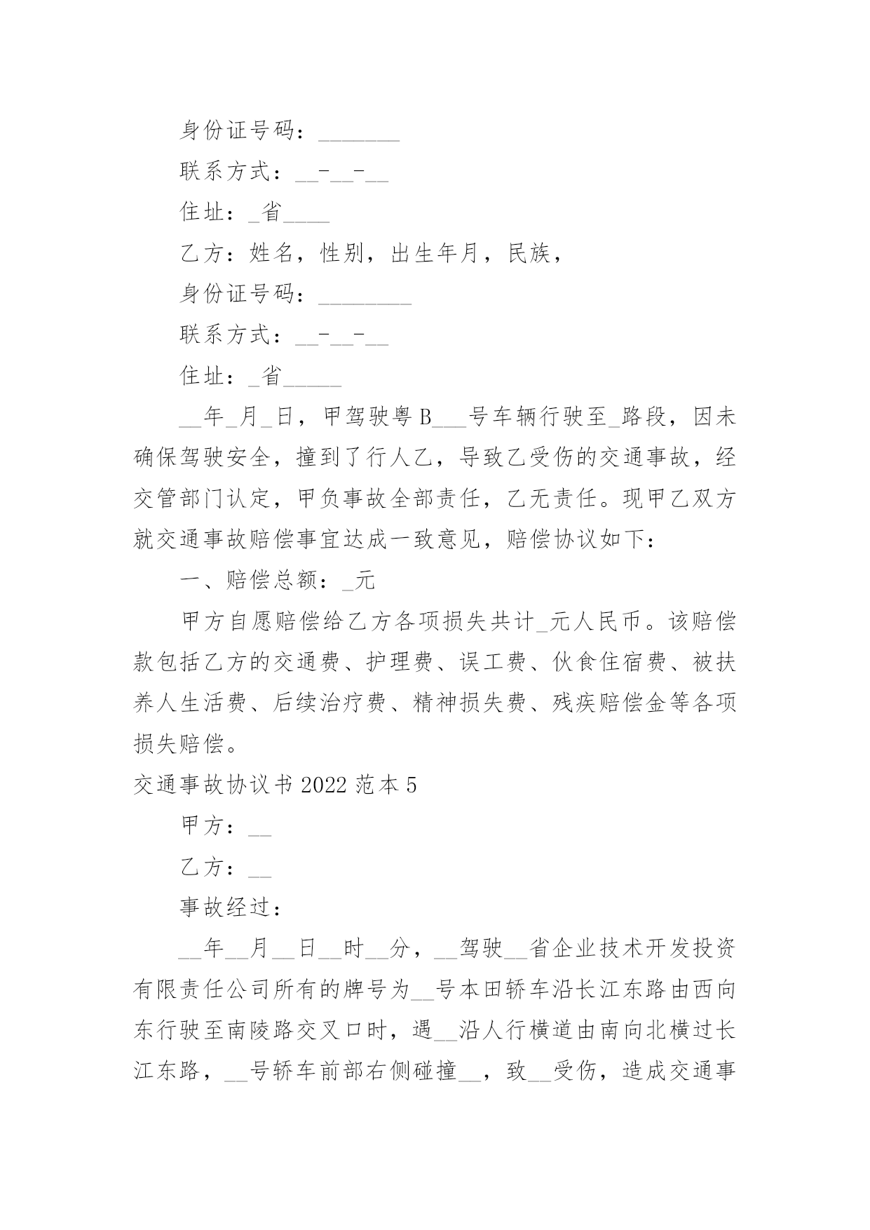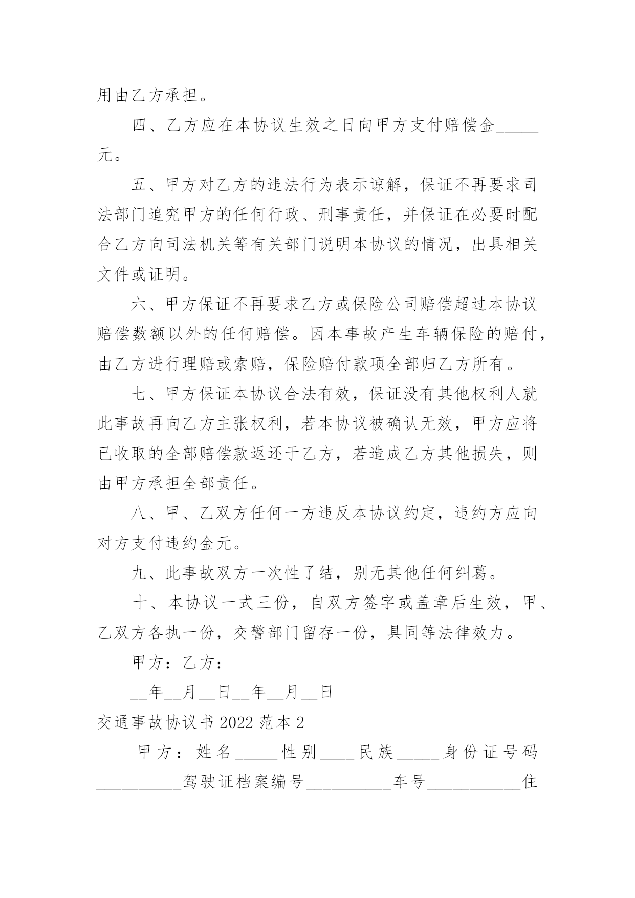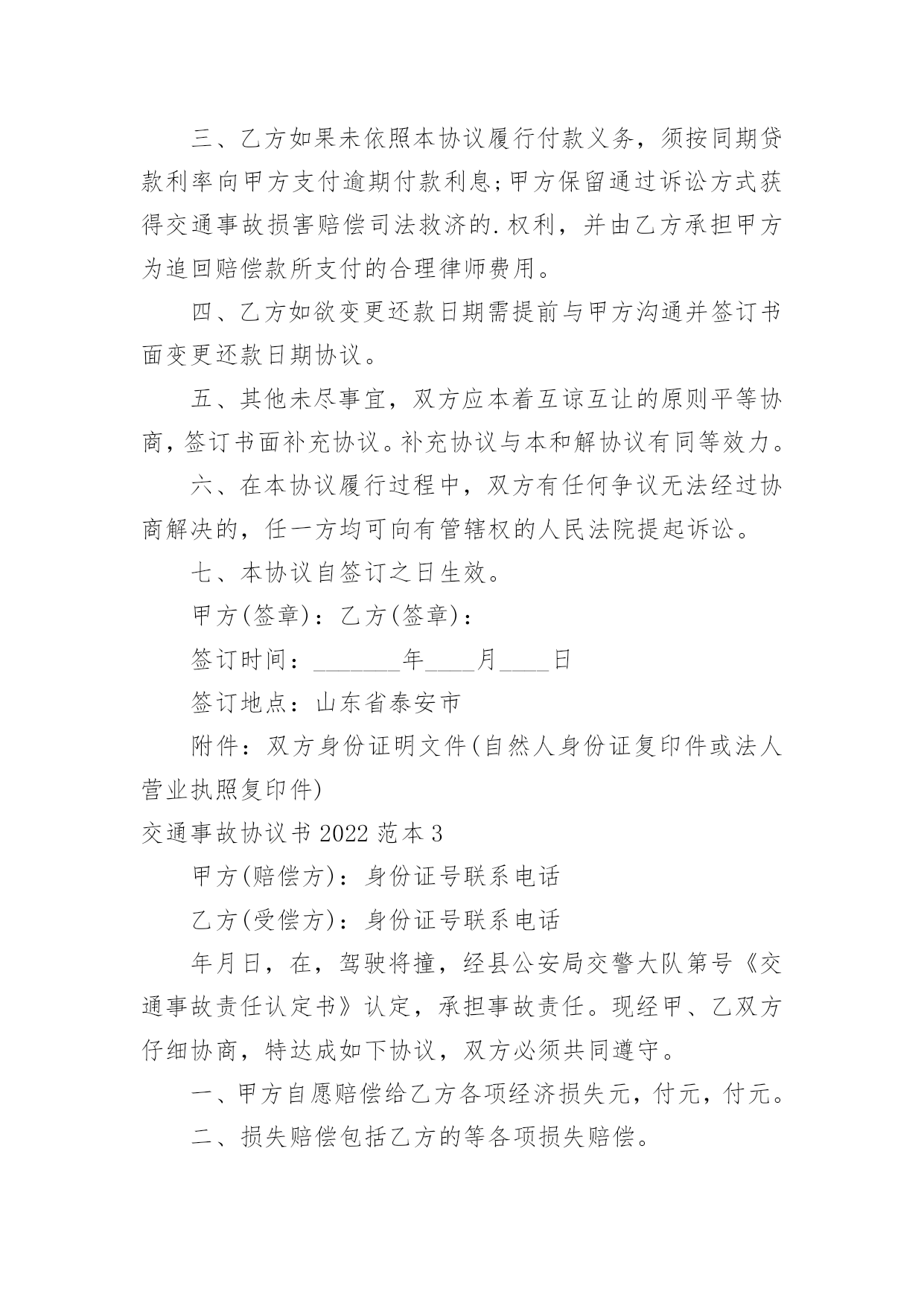 交通事故协议书交通事故协议书2022范本在生活中,很多场合都离不了协议,协议能够成为双方当事人的合法依据。我们该怎么拟定协议呢?以下是小编为大家整理的交通事故协议书2022范本,欢迎阅读与收藏。交通事故协议书2022范本1甲方(受害人或者其亲属):乙方(驾驶人或者其亲属):__年__月__日时分许,乙方驾驶车牌号为______的车行驶至____附近时,不慎与甲方发生交通事故,致___死亡。甲、乙双方就赔偿事宜,经协商自愿达成如下协议:一、乙方自愿一次性赔偿甲方各种法定人身损害赔偿项目共计万元(小写:_____元)整。二、甲方同意接收上述赔偿款项,并放弃对乙方的其他一切权利,不再要求乙方进行任何形式的赔偿或承担其他任何责任。若甲方及甲方的其他利害关系人再向乙方提出任何要求,由甲方负责处理解决。三、本协议签订后,为方便乙方进行保险理赔,甲、乙双方均同意互相配合就本事故的赔偿事宜通过非诉或者诉讼的.方式解决。通过诉讼方式解决的,若法院出具判决书或者调解书确定的赔偿数额与本协议不一致,双方仍保证按本协议约定的赔偿数额履行。相关诉讼费、律师费及办案费用由乙方承担。四、乙方应在本协议生效之日向甲方支付赔偿金_____元。五、甲方对乙方的违法行为表示谅解,保证不再要求司法部门追究甲方的任何行政、刑事责任,并保证在必要时配合乙方向司法机关等有关部门说明本协议的情况,出具相关文件或证明。六、甲方保证不再要求乙方或保险公司赔偿超过本协议赔偿数额以外的任何赔偿。因本事故产生车辆保险的赔付,由乙方进行理赔或索赔,保险赔付款项全部归乙方所有。七、甲方保证本协议合法有效,保证没有其他权利人就此事故再向乙方主张权利,若本协议被确认无效,甲方应将已收取的全部赔偿款返还于乙方,若造成乙方其他损失,则由甲方承担全部责任。八、甲、乙双方任何一方违反本协议约定,违约方应向对方支付违约金元。九、此事故双方一次性了结,别无其他任何纠葛。十、本协议一式三份,自双方签字或盖章后生效,甲、乙双方各执一份,交警部门留存一份,具同等法律效力。甲方:乙方:__年__月__日__年__月__日交通事故协议书2022范本2甲方:姓名_____性别____民族_____身份证号码__________驾驶证档案编号__________车号___________住址_____________电话______________交通方式____________公司名称和保险凭证号________________________________________乙方:姓名_____性别____民族_____身份证号码__________驾驶证档案编号__________车号___________住址_____________电话______________交通方式____________保险公司名称和保险凭证号________________________________________事实甲方由____向_____行驶,乙方由_____向____行驶。因_______造成_________________。经过交警队认定甲方_______责任,乙方___________责任。依照现行法律及司法解释的相关规定,双方本着互谅互让、平等协商的原则,达成如下和解方案:一、乙方选择按照下列第_____种方式向甲方支付事故赔偿款:1.乙方于本协议签订之日起_____日内一次性向甲方支付事故赔偿款合计__________元;2.乙方分_____次向甲方支付事故赔偿款合计人民币______元,具体还款周期和数额为:______________________________________________________________________________。二、乙方按照上述方案支付赔偿款后,甲方出具书面,保证不再就该部分提起诉讼。三、乙方如果未依照本协议履行付款义务,须按同期贷款利率向甲方支付逾期付款利息;甲方保留通过诉讼方式获得交通事故损害赔偿司法救济的.权利,并由乙方承担甲方为追回赔偿款所支付的合理律师费用。四、乙方如欲变更还款日期需提前与甲方沟通并签订书面变更还款日期协议。五、其他未尽事宜,双方应本着互谅互让的原则平等协商,签订书面补充协议。补充协议与本和解协议有同等效力。六、在本协议履行过程中,双方有任何争议无法经过协商解决的,任一方均可向有管辖权的人民法院提起诉讼。七、本协议自签订之日生效。甲方(签章):乙方(签章):签订时间:_______年____月____日签订地点:山东省泰安市附件:双方身份证明文件(自然人身份证复印件或法人营业执照复印件)交通事故协议书2022范本3甲方(赔偿方):身份证号联系电话乙方(受偿方):身份证号联系电话年月日,在,驾驶将撞,经县公安局交警大队第号《交通
