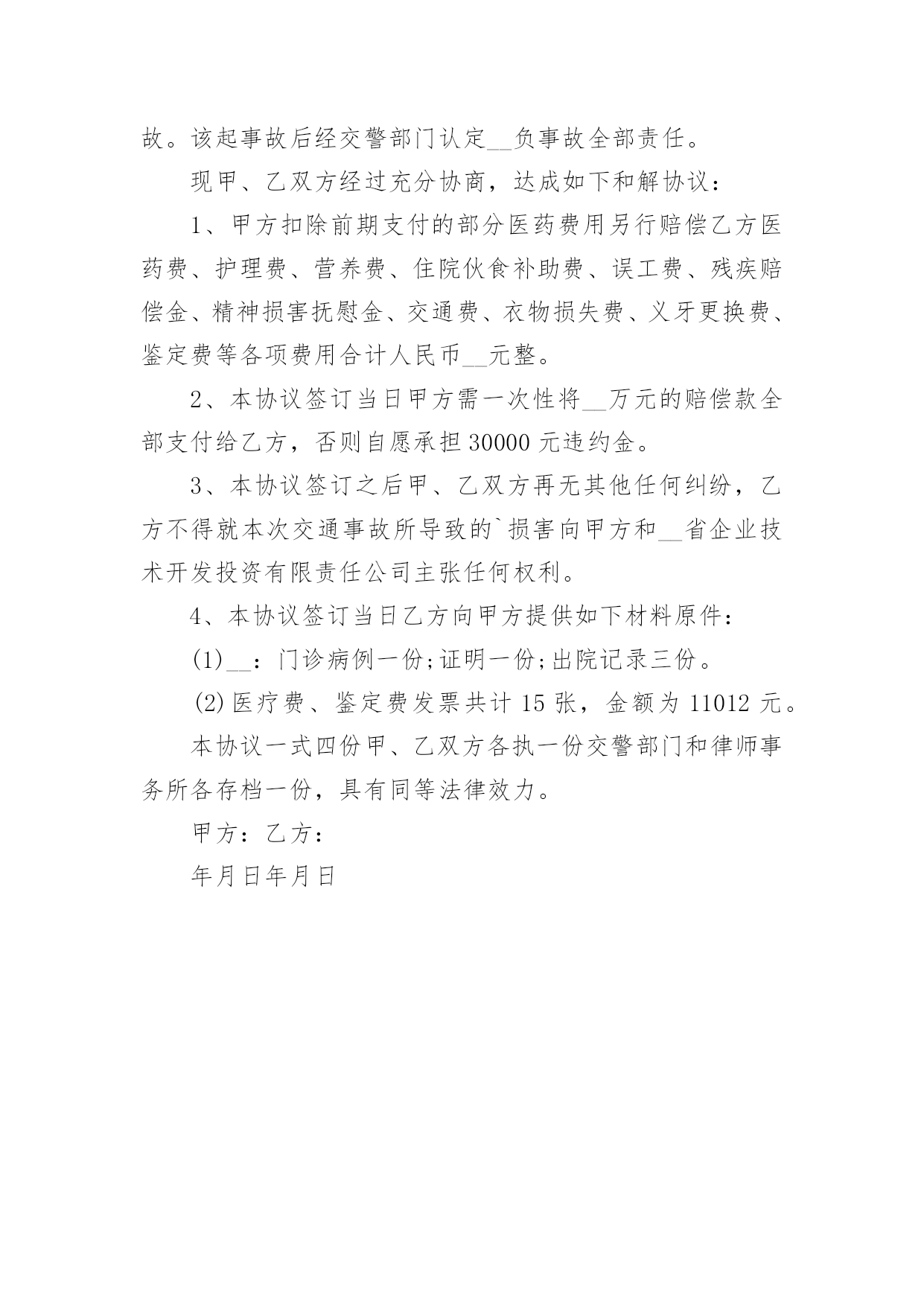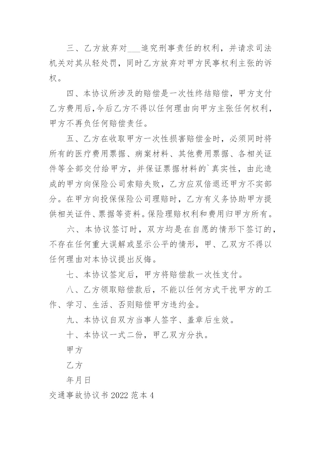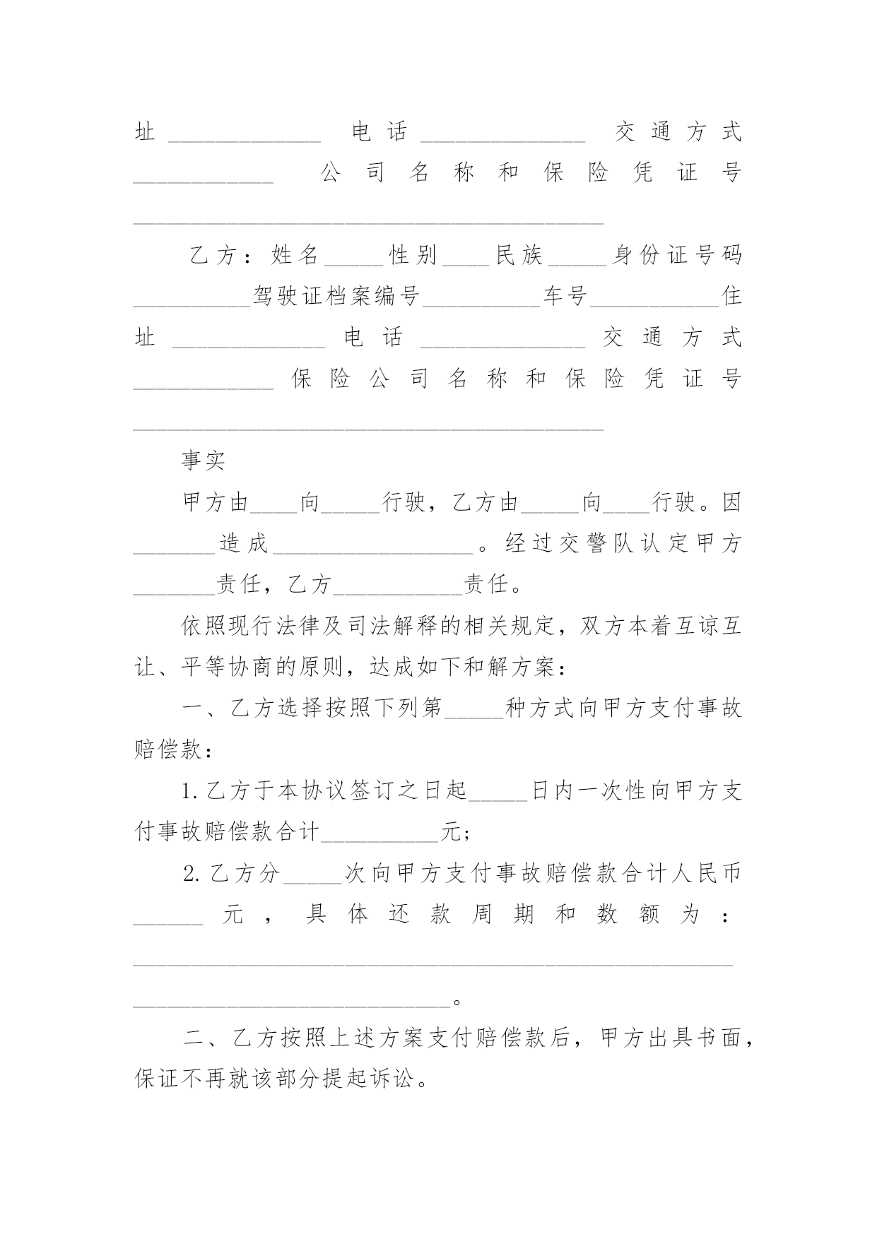 交通事故协议书交通事故协议书2022范本在生活中,很多场合都离不了协议,协议能够成为双方当事人的合法依据。我们该怎么拟定协议呢?以下是小编为大家整理的交通事故协议书2022范本,欢迎阅读与收藏。交通事故协议书2022范本1甲方(受害人或者其亲属):乙方(驾驶人或者其亲属):__年__月__日时分许,乙方驾驶车牌号为______的车行驶至____附近时,不慎与甲方发生交通事故,致___死亡。甲、乙双方就赔偿事宜,经协商自愿达成如下协议:一、乙方自愿一次性赔偿甲方各种法定人身损害赔偿项目共计万元(小写:_____元)整。二、甲方同意接收上述赔偿款项,并放弃对乙方的其他一切权利,不再要求乙方进行任何形式的赔偿或承担其他任何责任。若甲方及甲方的其他利害关系人再向乙方提出任何要求,由甲方负责处理解决。三、本协议签订后,为方便乙方进行保险理赔,甲、乙双方均同意互相配合就本事故的赔偿事宜通过非诉或者诉讼的.方式解决。通过诉讼方式解决的,若法院出具判决书或者调解书确定的赔偿数额与本协议不一致,双方仍保证按本协议约定的赔偿数额履行。相关诉讼费、律师费及办案费用由乙方承担。四、乙方应在本协议生效之日向甲方支付赔偿金_____元。五、甲方对乙方的违法行为表示谅解,保证不再要求司法部门追究甲方的任何行政、刑事责任,并保证在必要时配合乙方向司法机关等有关部门说明本协议的情况,出具相关文件或证明。六、甲方保证不再要求乙方或保险公司赔偿超过本协议赔偿数额以外的任何赔偿。因本事故产生车辆保险的赔付,由乙方进行理赔或索赔,保险赔付款项全部归乙方所有。七、甲方保证本协议合法有效,保证没有其他权利人就此事故再向乙方主张权利,若本协议被确认无效,甲方应将已收取的全部赔偿款返还于乙方,若造成乙方其他损失,则由甲方承担全部责任。八、甲、乙双方任何一方违反本协议约定,违约方应向对方支付违约金元。九、此事故双方一次性了结,别无其他任何纠葛。十、本协议一式三份,自双方签字或盖章后生效,甲、乙双方各执一份,交警部门留存一份,具同等法律效力。甲方:乙方:__年__月__日__年__月__日交通事故协议书2022范本2甲方:姓名_____性别____民族_____身份证号码__________驾驶证档案编号__________车号___________住址_____________电话______________交通方式____________公司名称和保险凭证号________________________________________乙方:姓名_____性别____民族_____身份证号码__________驾驶证档案编号__________车号___________住址_____________电话______________交通方式____________保险公司名称和保险凭证号________________________________________事实甲方由____向_____行驶,乙方由_____向____行驶。因_______造成_________________。经过交警队认定甲方_______责任,乙方___________责任。依照现行法律及司法解释的相关规定,双方本着互谅互让、平等协商的原则,达成如下和解方案:一、乙方选择按照下列第_____种方式向甲方支付事故赔偿款:1.乙方于本协议签订之日起_____日内一次性向甲方支付事故赔偿款合计__________元;2.乙方分_____次向甲方支付事故赔偿款合计人民币______元,具体还款周期和数额为:______________________________________________________________________________。二、乙方按照上述方案支付赔偿款后,甲方出具书面,保证不再就该部分提起诉讼。三、乙方如果未依照本协议履行付款义务,须按同期贷款利率向甲方支付逾期付款利息;甲方保留通过诉讼方式获得交通事故损害赔偿司法救济的.权利,并由乙方承担甲方为追回赔偿款所支付的合理律师费用。四、乙方如欲变更还款日期需提前与甲方沟通并签订书面变更还款日期协议。五、其他未尽事宜,双方应本着互谅互让的原则平等协商,签订书面补充协议。补充协议与本和解协议有同等效力。六、在本协议履行过程中,双方有任何争议无法经过协商解决的,任一方均可向有管辖权的人民法院提起诉讼。七、本协议自签订之日生效。甲方(签章):乙方(签章):签订时间:_______年____月____日签订地点:山东省泰安市附件:双方身份证明文件(自然人身份证复印件或法人营业执照复印件)交通事故协议书2022范本3甲方(赔偿方):身份证号联系电话乙方(受偿方):身份证号联系电话年月日,在,驾驶将撞,经县公安局交警大队第号《交通