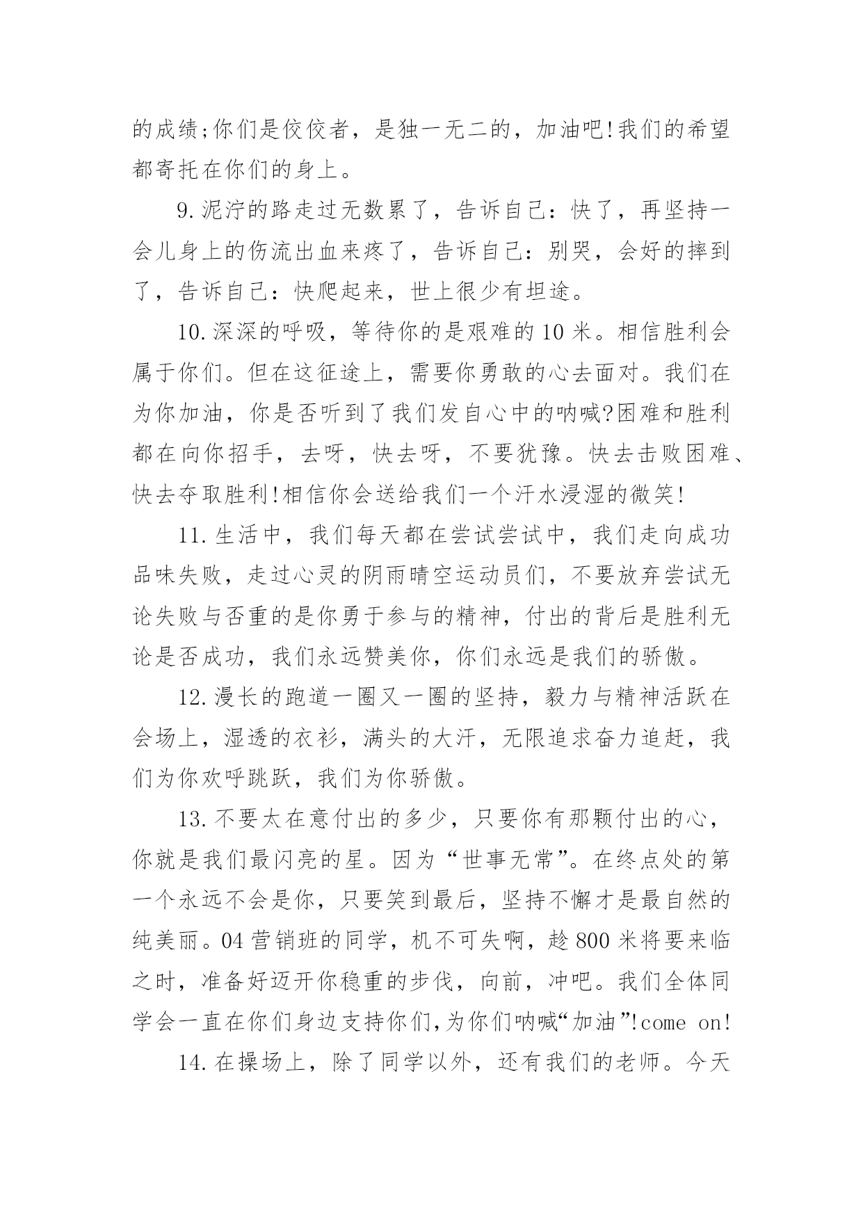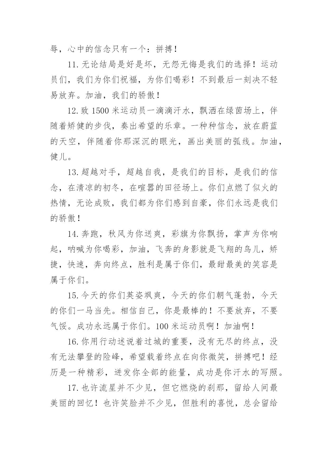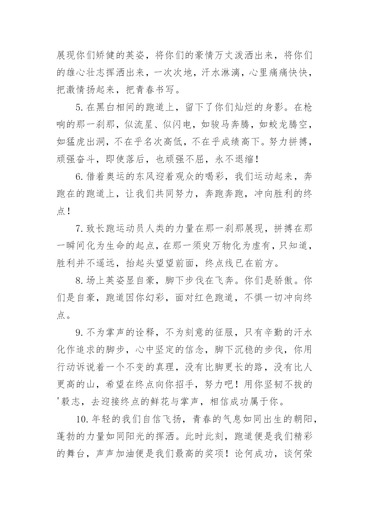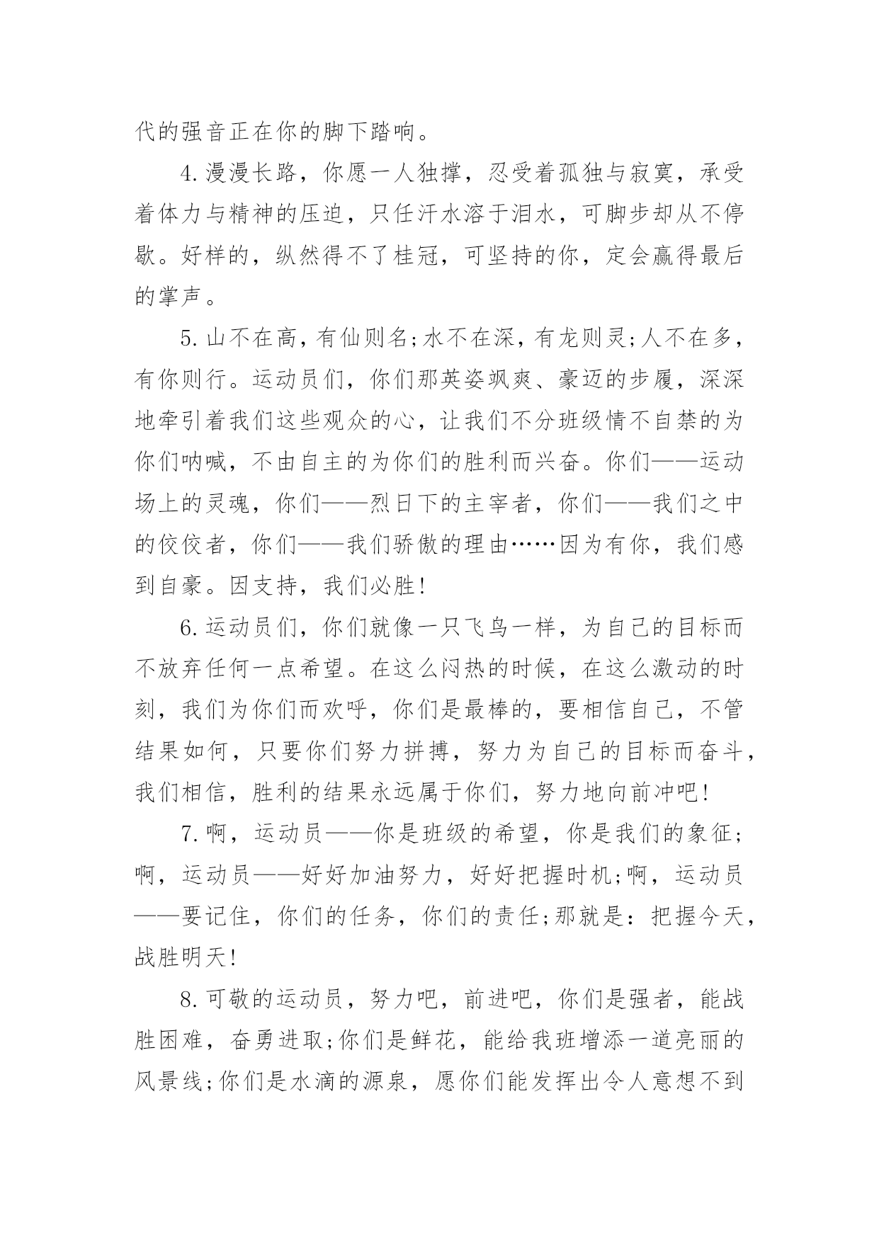运动会加油稿运动会加油稿在现实社会中,我们可以使用加油稿的机会越来越多,借助加油稿可以激励他人的士气。相信许多人会觉得加油稿很难写吧,下面是小编帮大家整理的运动会加油稿,供大家参考借鉴,希望可以帮助到有需要的朋友。运动会加油稿11、加油吧,运动健儿们!阵阵有力的步伐,声声有劲的呐喊,运动场上洒下我们青春的点点滴滴。旗摇摇,鼓声声,这里挡不助的是青春活力;枪声响起,预备起跑,挡不助的是健儿们如火般的气势。英雄舍我其谁,胜利当仁不让,声声誓言浸透着健儿们的昂扬斗志。朋友们,为运动健儿们喝彩,为运动喝彩吧!场上精彩纷呈,空气里的每一个分子浸透着自信。高二(9)班的我要高喊一声:这里无限精彩!2、热情地释放光芒的红日,被阵阵此起彼伏的加油声震撼,慌张地投入到乌云的怀抱。那群北飞的候鸟却因为热火朝天的场面而盘旋在运动场上,留恋着这里与寂静的天空截然不同的热闹。围绕在运动场边的树木,在秋风的频繁光顾下奏鸣出悦耳的树叶的.交响曲,仿佛是为了配合场上的拉拉队,为奋斗的运动员们加油鼓劲。这是个非同寻常的日子。场上的学子们正在这个不同寻常的舞台上尽情的展示自己的风采。而周围的一切?一切的一切都在为之锦上添花,染她的存在显得更辉煌,让她的生命之花绽放得更加灿烂,这是完美的一切,值得庆祝,就让我们为之喝彩吧。3、温暖的阳光洒在赛场上,男子乙组标枪的比赛即将开始。赛场上,一道道优美的弧线将轻盈地划过天空。健儿们用手中的标枪向距离的权限发起一轮又一轮的挑战。标枪在空中轻盈的姿态,是健儿们强健的力量和熟练的技巧的结合。谁能在这场激烈的竞争中获胜?让我们拭目以待,让我们为他们呐喊、助威吧!只有将力量与技巧合二为一的人,才能获得胜利的桂冠!4、阳光总在风雨后,致运动场上暂时的失败者。真的,人生要是能有一个草稿,能再誊写一次,那该多好!我们会绝对认真地叙写自己的人生,也许不一定比别人写得更好,但肯定要比自己第一次写得漂亮。或许,人生不可能像自己想象的那样美好,一生的路也不可能都是平坦的,人的心情也不会永远静如止水。在生活中,有成功,也会有失败。因此,我们要放飞生命,也许远方很渺茫,也许我们要被倾覆于人生的荆棘刺伤,但我们仍无怨无悔。放飞,即使是黄昏,也必然布满歌唱的流霞,因为我们坚信,不经过战斗的舍弃是虚伪的,不经过劫难磨炼的超脱是轻佻的,逃避显示的明哲是卑怯的。阳光不会永远灿烂,没有一成不变的幸福,磨难或许是上苍赐予我们的礼物,用来考验我们的意志,如果是这样,就让我们微笑着面对生活。运动会加油稿2温暖的阳光洒在球场上,男子B组标枪比赛即将开始。在赛场上,美丽的弧线将轻轻地划过天空。运动员们用手中的标枪挑战距离的.权限。空中轻盈的标枪姿势,是健儿强壮力量和熟练技能的结合。谁能在这场激烈的竞争中获胜?让我们拭目以待,让我们为他们欢呼吧!只有将力量和技能结合起来,才能把力量和技能结合起来`人,才能赢得桂冠!运动会加油稿31.加油吧,运动健儿们!阵阵有力的步伐,声声有劲的呐喊,运动场上洒下我们青春的点点滴滴。旗摇摇,鼓声声,这里挡不助的是青春活力;枪声响起,“预备起跑”,挡不助的是健儿们如火般的气势。英雄舍我其谁,胜利当仁不让,声声誓言浸透着健儿们的昂扬斗志。朋友们,为运动健儿们喝彩,为运动喝彩吧!场上精彩纷呈,空气里的每一个分子浸透着自信。高二(9)班的我要高喊一声:“这里无限精彩!2.步子迈开,让我们飞驰在红色跑道上,用我们的泪水和热血,更改历史的记录,起立吧,歌唱吧!为我们的勇士加油!3.你是运动场的心脏,跳动梦想;你是漫长路的精神,激励辉煌;你们是将上下求索的人!风为你加油,云为你助兴,坚定,执着,耐力与希望,在延伸的白色跑道中点点凝聚!力量,信念,拼搏与奋斗,在遥远的终点线上渐渐明亮!时代的强音正在你的脚下踏响。4.漫漫长路,你愿一人独撑,忍受着孤独与寂寞,承受着体力与精神的压迫,只任汗水溶于泪水,可脚步却从不停歇。好样的,纵然得不了桂冠,可坚持的你,定会赢得最后的掌声。5.山不在高,有仙则名;水不在深,有龙则灵;人不在多,有你则行。运动员们,你们那英姿飒爽、豪迈的步履,深深地牵引着我们这些观众的心,让我们不分班级情不自禁的为你们呐喊,不由自主的为你们的胜利而兴奋。你们——运动场上的灵魂,你们——烈日下的主宰者,你们——我们之中的佼佼者,你们——我们骄傲的理由……因为有你,我们感到自豪。因支持,我们必胜!6.运动员们,你们就像一只飞鸟一样,为自己的目标而不放弃任何一点希望。在这么闷热的时候,在这么激动的时刻,我们为你们而欢呼,你们是最棒的,要相信自己,不管结果如何,只要你们努力拼搏,努力为自己的目标而奋斗,我们相信,胜利的结果永远属于你们,努力地向前冲吧!7.啊,运动员——你是班级的希望,你是我们的象征;啊,运动员——好好加油努力,好好把握时机;啊,运动