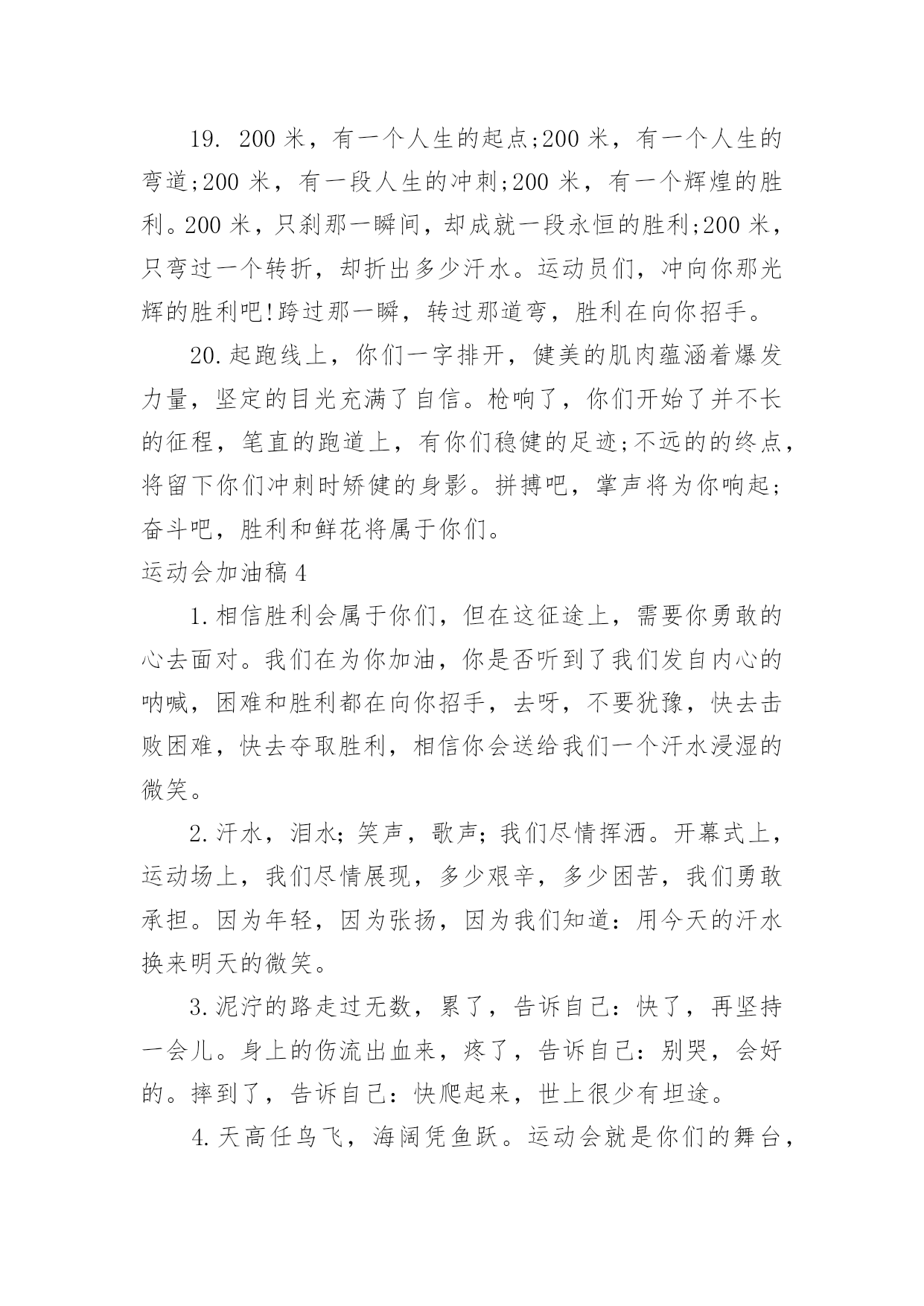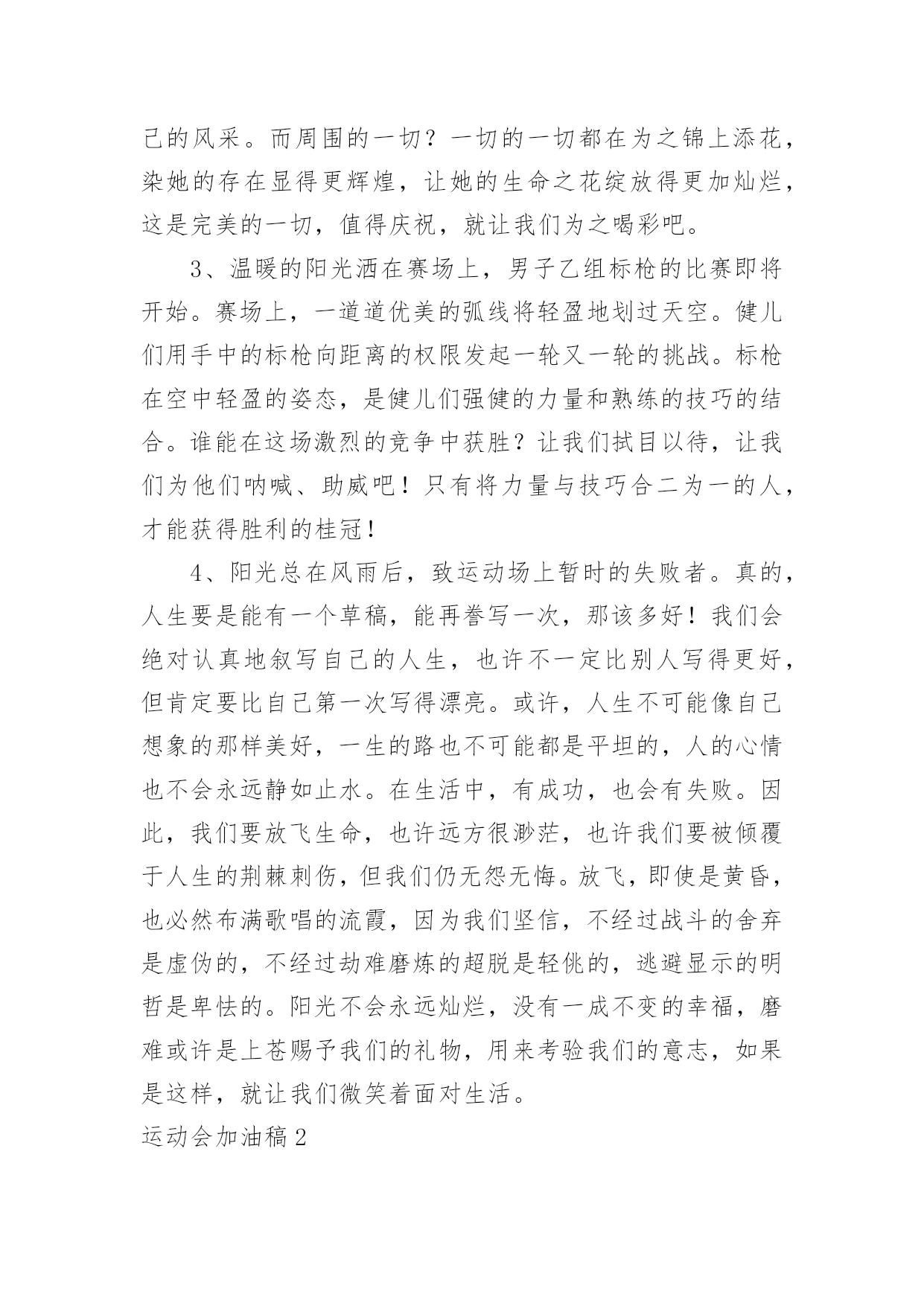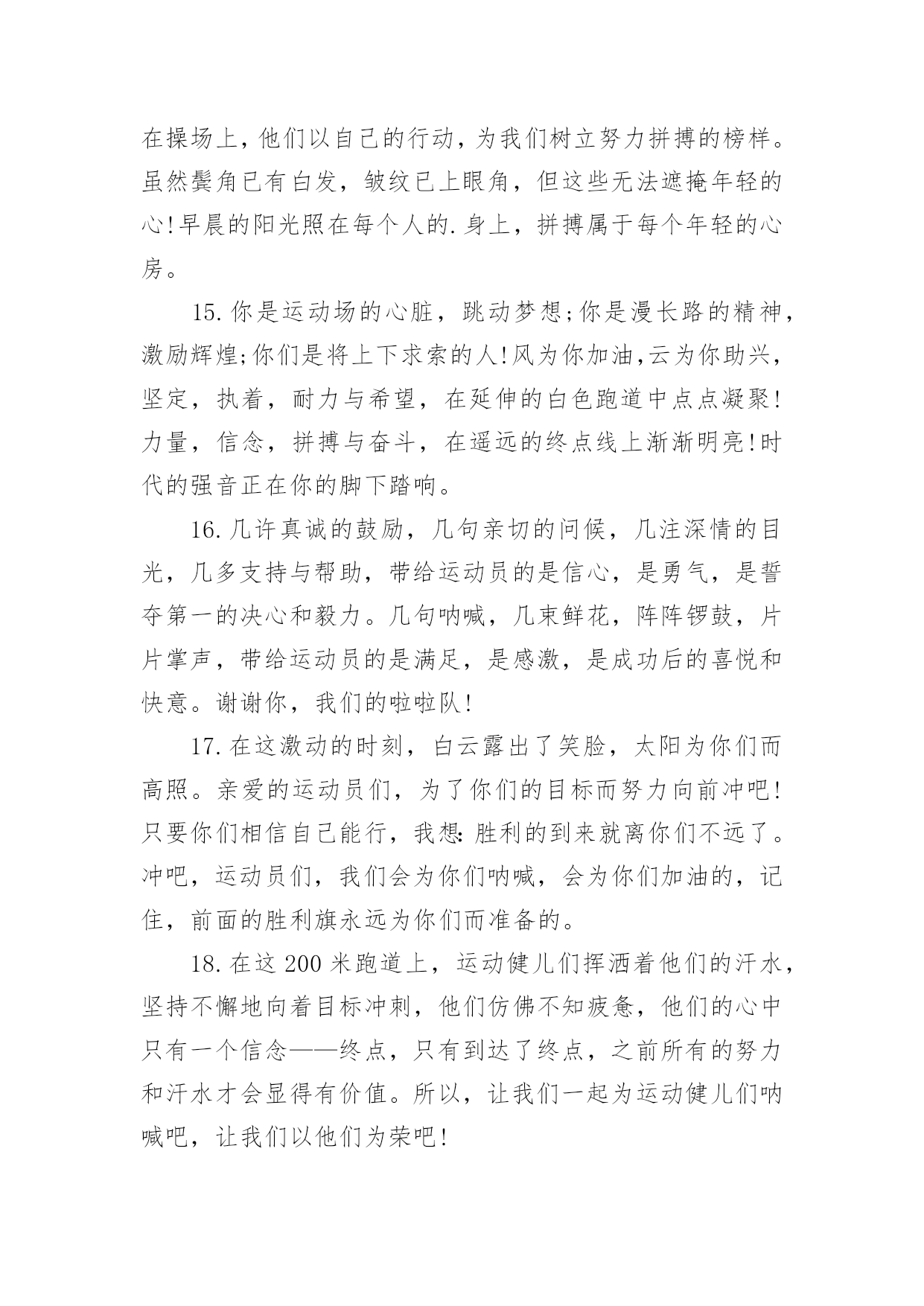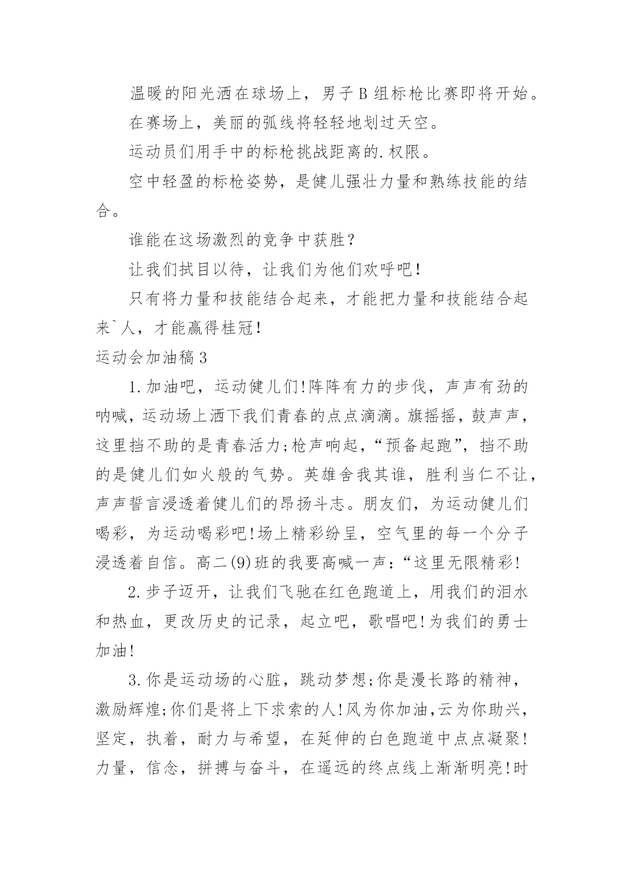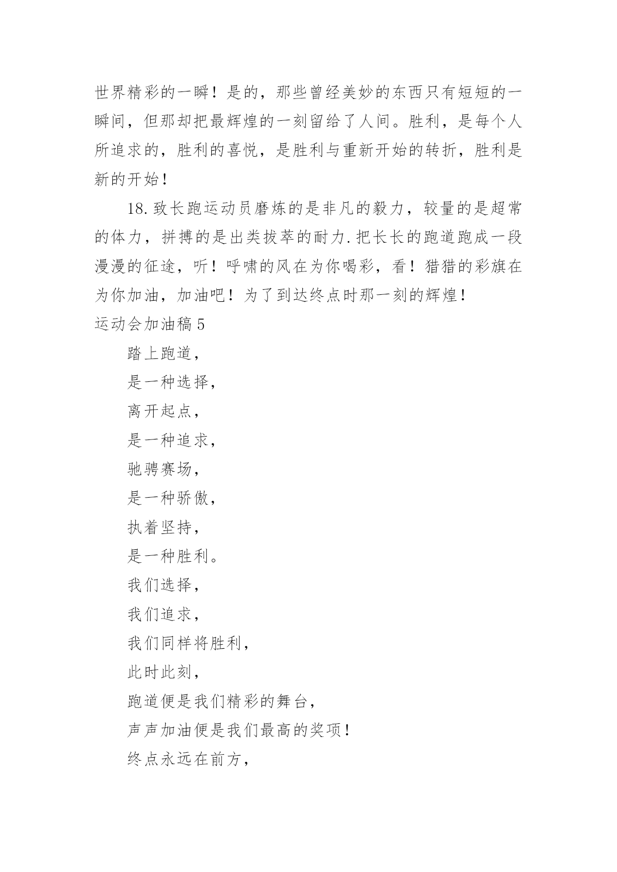 运动会加油稿运动会加油稿在现实社会中,我们可以使用加油稿的机会越来越多,借助加油稿可以激励他人的士气。相信许多人会觉得加油稿很难写吧,下面是小编帮大家整理的运动会加油稿,供大家参考借鉴,希望可以帮助到有需要的朋友。运动会加油稿11、加油吧,运动健儿们!阵阵有力的步伐,声声有劲的呐喊,运动场上洒下我们青春的点点滴滴。旗摇摇,鼓声声,这里挡不助的是青春活力;枪声响起,预备起跑,挡不助的是健儿们如火般的气势。英雄舍我其谁,胜利当仁不让,声声誓言浸透着健儿们的昂扬斗志。朋友们,为运动健儿们喝彩,为运动喝彩吧!场上精彩纷呈,空气里的每一个分子浸透着自信。高二(9)班的我要高喊一声:这里无限精彩!2、热情地释放光芒的红日,被阵阵此起彼伏的加油声震撼,慌张地投入到乌云的怀抱。那群北飞的候鸟却因为热火朝天的场面而盘旋在运动场上,留恋着这里与寂静的天空截然不同的热闹。围绕在运动场边的树木,在秋风的频繁光顾下奏鸣出悦耳的树叶的.交响曲,仿佛是为了配合场上的拉拉队,为奋斗的运动员们加油鼓劲。这是个非同寻常的日子。场上的学子们正在这个不同寻常的舞台上尽情的展示自己的风采。而周围的一切?一切的一切都在为之锦上添花,染她的存在显得更辉煌,让她的生命之花绽放得更加灿烂,这是完美的一切,值得庆祝,就让我们为之喝彩吧。3、温暖的阳光洒在赛场上,男子乙组标枪的比赛即将开始。赛场上,一道道优美的弧线将轻盈地划过天空。健儿们用手中的标枪向距离的权限发起一轮又一轮的挑战。标枪在空中轻盈的姿态,是健儿们强健的力量和熟练的技巧的结合。谁能在这场激烈的竞争中获胜?让我们拭目以待,让我们为他们呐喊、助威吧!只有将力量与技巧合二为一的人,才能获得胜利的桂冠!4、阳光总在风雨后,致运动场上暂时的失败者。真的,人生要是能有一个草稿,能再誊写一次,那该多好!我们会绝对认真地叙写自己的人生,也许不一定比别人写得更好,但肯定要比自己第一次写得漂亮。或许,人生不可能像自己想象的那样美好,一生的路也不可能都是平坦的,人的心情也不会永远静如止水。在生活中,有成功,也会有失败。因此,我们要放飞生命,也许远方很渺茫,也许我们要被倾覆于人生的荆棘刺伤,但我们仍无怨无悔。放飞,即使是黄昏,也必然布满歌唱的流霞,因为我们坚信,不经过战斗的舍弃是虚伪的,不经过劫难磨炼的超脱是轻佻的,逃避显示的明哲是卑怯的。阳光不会永远灿烂,没有一成不变的幸福,磨难或许是上苍赐予我们的礼物,用来考验我们的意志,如果是这样,就让我们微笑着面对生活。运动会加油稿2温暖的阳光洒在球场上,男子B组标枪比赛即将开始。在赛场上,美丽的弧线将轻轻地划过天空。运动员们用手中的标枪挑战距离的.权限。空中轻盈的标枪姿势,是健儿强壮力量和熟练技能的结合。谁能在这场激烈的竞争中获胜?让我们拭目以待,让我们为他们欢呼吧!只有将力量和技能结合起来,才能把力量和技能结合起来`人,才能赢得桂冠!运动会加油稿31.加油吧,运动健儿们!阵阵有力的步伐,声声有劲的呐喊,运动场上洒下我们青春的点点滴滴。旗摇摇,鼓声声,这里挡不助的是青春活力;枪声响起,“预备起跑”,挡不助的是健儿们如火般的气势。英雄舍我其谁,胜利当仁不让,声声誓言浸透着健儿们的昂扬斗志。朋友们,为运动健儿们喝彩,为运动喝彩吧!场上精彩纷呈,空气里的每一个分子浸透着自信。高二(9)班的我要高喊一声:“这里无限精彩!2.步子迈开,让我们飞驰在红色跑道上,用我们的泪水和热血,更改历史的记录,起立吧,歌唱吧!为我们的勇士加油!3.你是运动场的心脏,跳动梦想;你是漫长路的精神,激励辉煌;你们是将上下求索的人!风为你加油,云为你助兴,坚定,执着,耐力与希望,在延伸的白色跑道中点点凝聚!力量,信念,拼搏与奋斗,在遥远的终点线上渐渐明亮!时代的强音正在你的脚下踏响。4.漫漫长路,你愿一人独撑,忍受着孤独与寂寞,承受着体力与精神的压迫,只任汗水溶于泪水,可脚步却从不停歇。好样的,纵然得不了桂冠,可坚持的你,定会赢得最后的掌声。5.山不在高,有仙则名;水不在深,有龙则灵;人不在多,有你则行。运动员们,你们那英姿飒爽、豪迈的步履,深深地牵引着我们这些观众的心,让我们不分班级情不自禁的为你们呐喊,不由自主的为你们的胜利而兴奋。你们——运动场上的灵魂,你们——烈日下的主宰者,你们——我们之中的佼佼者,你们——我们骄傲的理由……因为有你,我们感到自豪。因支持,我们必胜!6.运动员们,你们就像一只飞鸟一样,为自己的目标而不放弃任何一点希望。在这么闷热的时候,在这么激动的时刻,我们为你们而欢呼,你们是最棒的,要相信自己,不管结果如何,只要你们努力拼搏,努力为自己的目标而奋斗,我们相信,胜利的结果永远属于你们,努力地向前冲吧!7.啊,运动员——你是班级的希望,你是我们的象征;啊,运动员——好好加油努力,好好把握时机;啊,运动