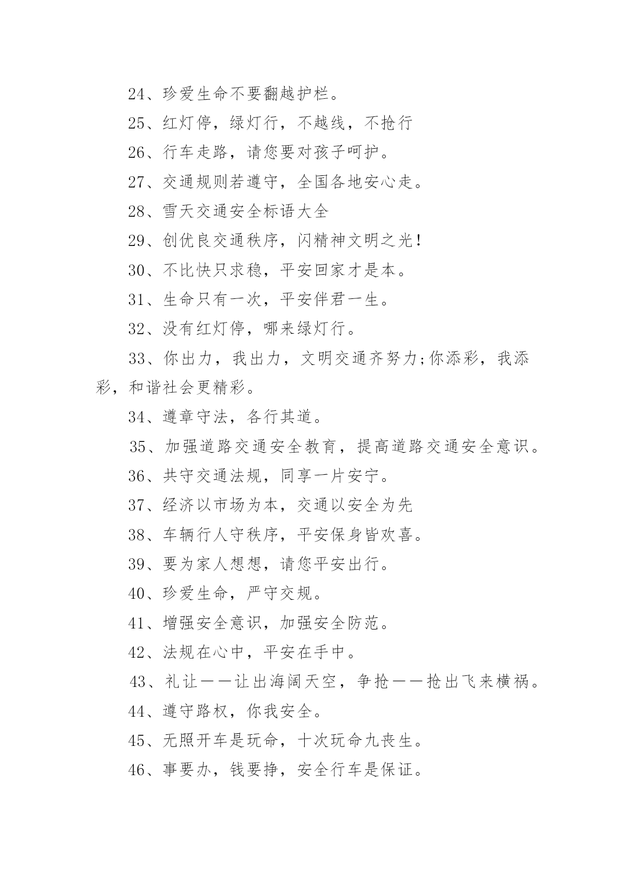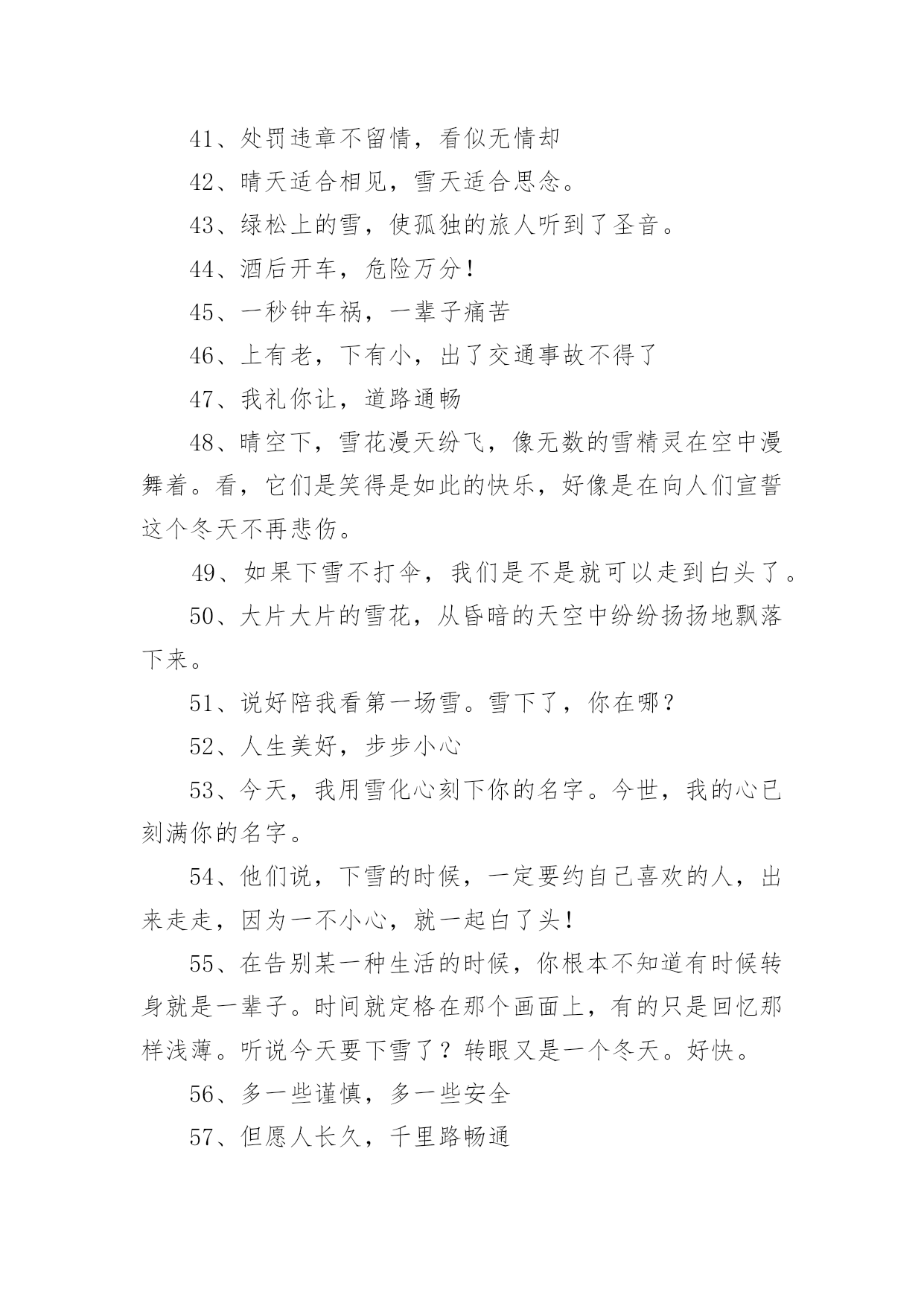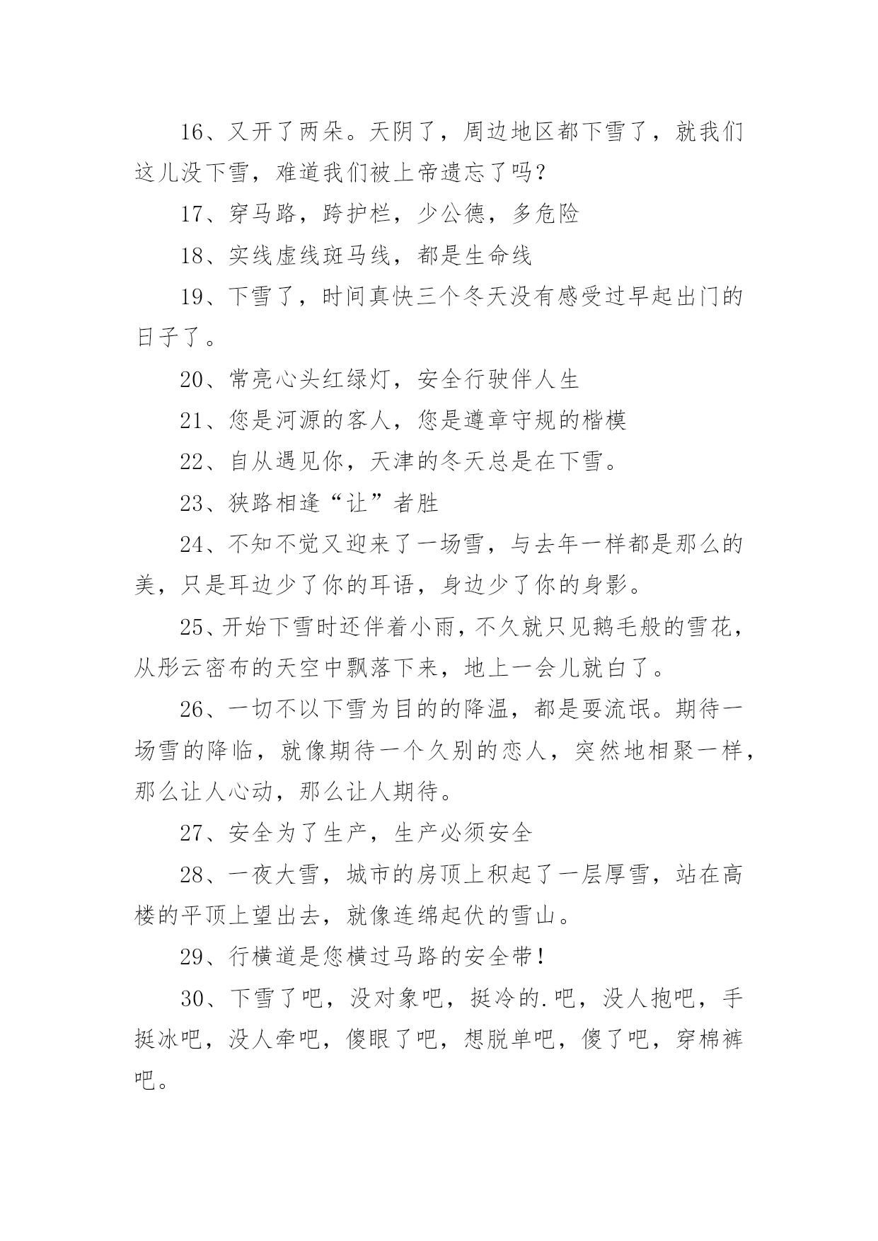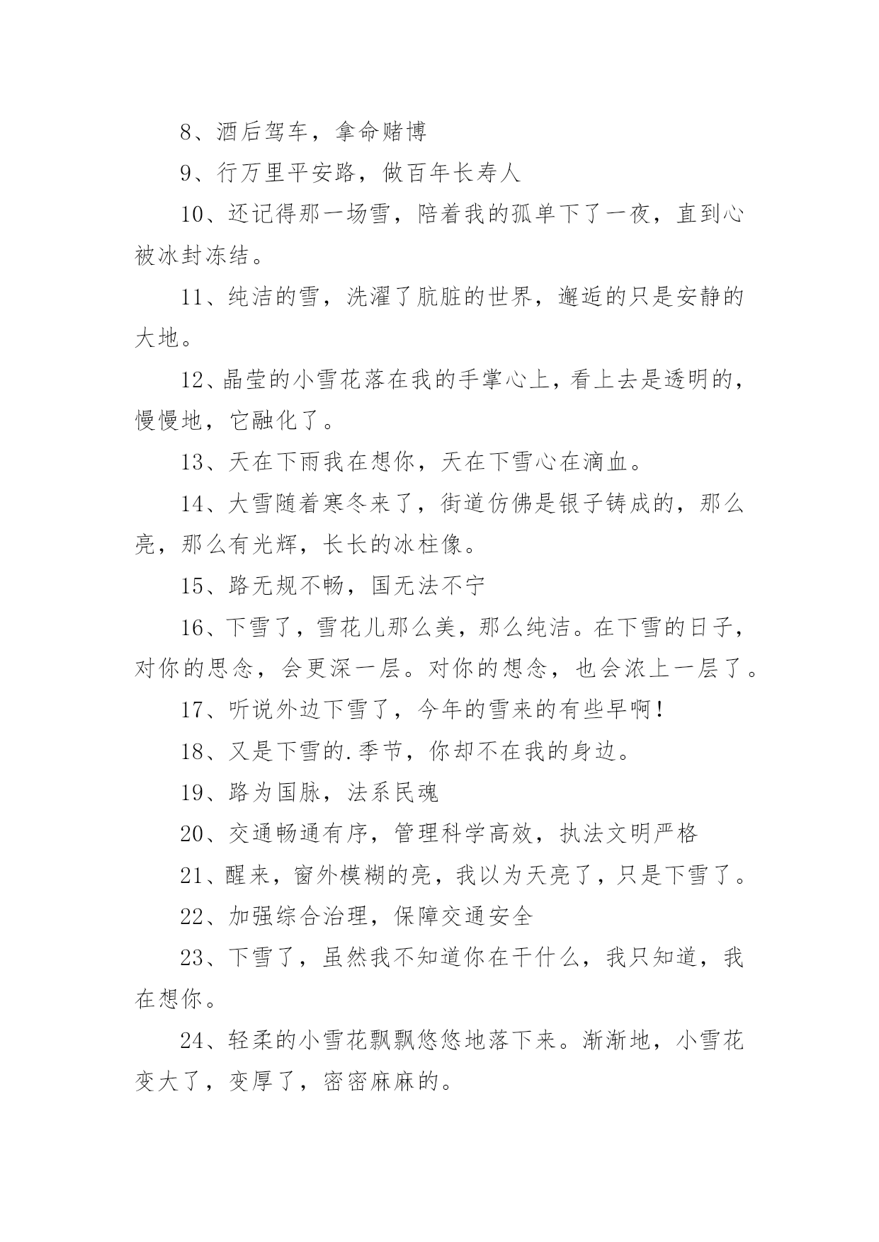 雪天道路交通安全标语雪天道路交通安全标语在学习、工作、生活中,大家一定都接触过一些使用较为普遍的标语吧,标语不但折射着时代精神,也体现了执政的方向和智慧,其意义和作用是不容忽视的。你知道什么样的标语才能算得上是好的标语吗?下面是小编为大家收集的雪天道路交通安全标语,欢迎阅读与收藏。雪天道路交通安全标语11、忽然下的那场雪,飘的那么纯洁,将我埋葬在了你的世界。2、我可以在天冷时自己给自己暖手,我可以在下雪时自己看雪,我可以在冷时自己多添衣服,我也可以给自己倒一杯热茶,真好,我有我自己。3、如此凄美的雪景,如此妩媚的月色,实在是使人难以忘怀。但也许是我太过于多情了。唉,残雪化蝶入梦飞,夜尽天明几时回?4、我在家等了一天看天空下雪没,冻得发抖,你说我傻,我笑了,真想说,我就是傻我才喜欢你。5、宣传交通法规,提高交通文明意识6、迎世博,为河源争光7、又下雪了,你在远方又和谁白着头。8、酒后驾车,拿命赌博9、行万里平安路,做百年长寿人10、还记得那一场雪,陪着我的孤单下了一夜,直到心被冰封冻结。11、纯洁的雪,洗濯了肮脏的世界,邂逅的只是安静的大地。12、晶莹的小雪花落在我的手掌心上,看上去是透明的,慢慢地,它融化了。13、天在下雨我在想你,天在下雪心在滴血。14、大雪随着寒冬来了,街道仿佛是银子铸成的,那么亮,那么有光辉,长长的冰柱像。15、路无规不畅,国无法不宁16、下雪了,雪花儿那么美,那么纯洁。在下雪的日子,对你的思念,会更深一层。对你的想念,也会浓上一层了。17、听说外边下雪了,今年的雪来的有些早啊!18、又是下雪的.季节,你却不在我的身边。19、路为国脉,法系民魂20、交通畅通有序,管理科学高效,执法文明严格21、醒来,窗外模糊的亮,我以为天亮了,只是下雪了。22、加强综合治理,保障交通安全23、下雪了,虽然我不知道你在干什么,我只知道,我在想你。24、轻柔的小雪花飘飘悠悠地落下来。渐渐地,小雪花变大了,变厚了,密密麻麻的。25、下雪了,好想变成雪花,这样就可以落在你的肩头。26、家里下雪了,听说,初雪是可以许愿的,在外面已经漂泊了那么久,我希望我的努力可以多一点幸运的眷顾。27、只有雪才是那么的美,那么的纯洁。28、你那边天气还好吗?我这边下雪了,很想和你一起在雪中散步,发现根本不可能。29、遵守交通法规,关爱生命旅程30、行经路口要观望,拐弯示意要礼让31、我怀疑我心底什么地方,失去记忆与热情,正绵绵地下着雪。32、超载超速,危机四伏33、每个人心底都有那么一个人,已不是恋人,也成不了朋友。时间过去,无关乎喜不喜欢,总会很习惯的想起你。然后希望你一切都好。34、你是千堆雪我是长街,怕日出一到彼此瓦解。35、心无交规,路有坎坷36、一眼望去,尽是纷纷繁繁落下的枯叶。远方的夕阳穿上了嫁衣,将整片树林染成妖艳的红。残雪覆在落叶上,装点着斑驳的土地。37、风一更,雪一更,聒碎乡心梦不成,故园无此声。38、下雪天,你想一起走到白头,我却怕你着凉。39、长街吻过千堆雪,你却未看我一眼。40、我畏惧寒风却偏爱下雪,我害怕喝酒却喜欢喝醉的感觉。41、处罚违章不留情,看似无情却42、晴天适合相见,雪天适合思念。43、绿松上的雪,使孤独的旅人听到了圣音。44、酒后开车,危险万分!45、一秒钟车祸,一辈子痛苦46、上有老,下有小,出了交通事故不得了47、我礼你让,道路通畅48、晴空下,雪花漫天纷飞,像无数的雪精灵在空中漫舞着。看,它们是笑得是如此的快乐,好像是在向人们宣誓这个冬天不再悲伤。49、如果下雪不打伞,我们是不是就可以走到白头了。50、大片大片的雪花,从昏暗的天空中纷纷扬扬地飘落下来。51、说好陪我看第一场雪。雪下了,你在哪?52、人生美好,步步小心53、今天,我用雪化心刻下你的名字。今世,我的心已刻满你的名字。54、他们说,下雪的时候,一定要约自己喜欢的人,出来走走,因为一不小心,就一起白了头!55、在告别某一种生活的时候,你根本不知道有时候转身就是一辈子。时间就定格在那个画面上,有的只是回忆那样浅薄。听说今天要下雪了?转眼又是一个冬天。好快。56、多一些谨慎,多一些安全57、但愿人长久,千里路畅通雪天道路交通安全标语21、好想当雪啊,这样下雪的时候就可以落在先生肩上了。2、下雪了,如果我们不打伞一直走,是不是就可以一路到白头?3、乱穿马路,失道无助4、下雪了,可我没有爱人也没有啤酒和炸鸡。5、我住的城巿从不下雪,记忆却堆满冷的感觉。6、下雪了,我不再是一只单身狗,而是,荣升成一只雪橇犬了。7、至少还有雪,陪我落一夜。8、下雪了,多想和你一起雪中漫步,一个不小心就白了头。9、“保险”赔钱不赔命10、下雪了,这点雪白不了头,只会冻成狗。11、雪下得那么深,下得那么认真。12、幸福是什么,幸福就是深冬下雪时,温一壶酒摆一盘棋,一手揽