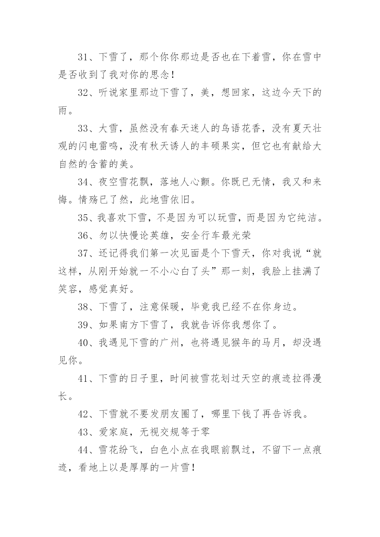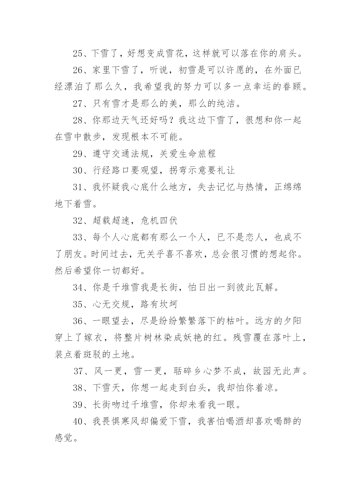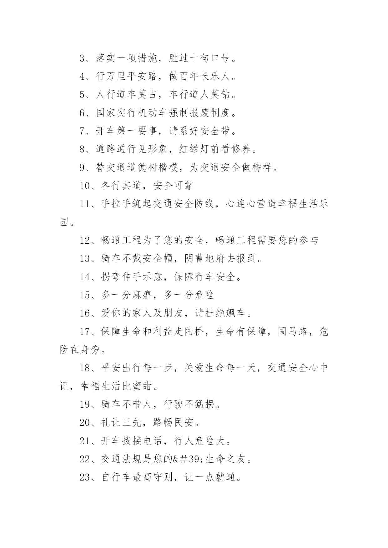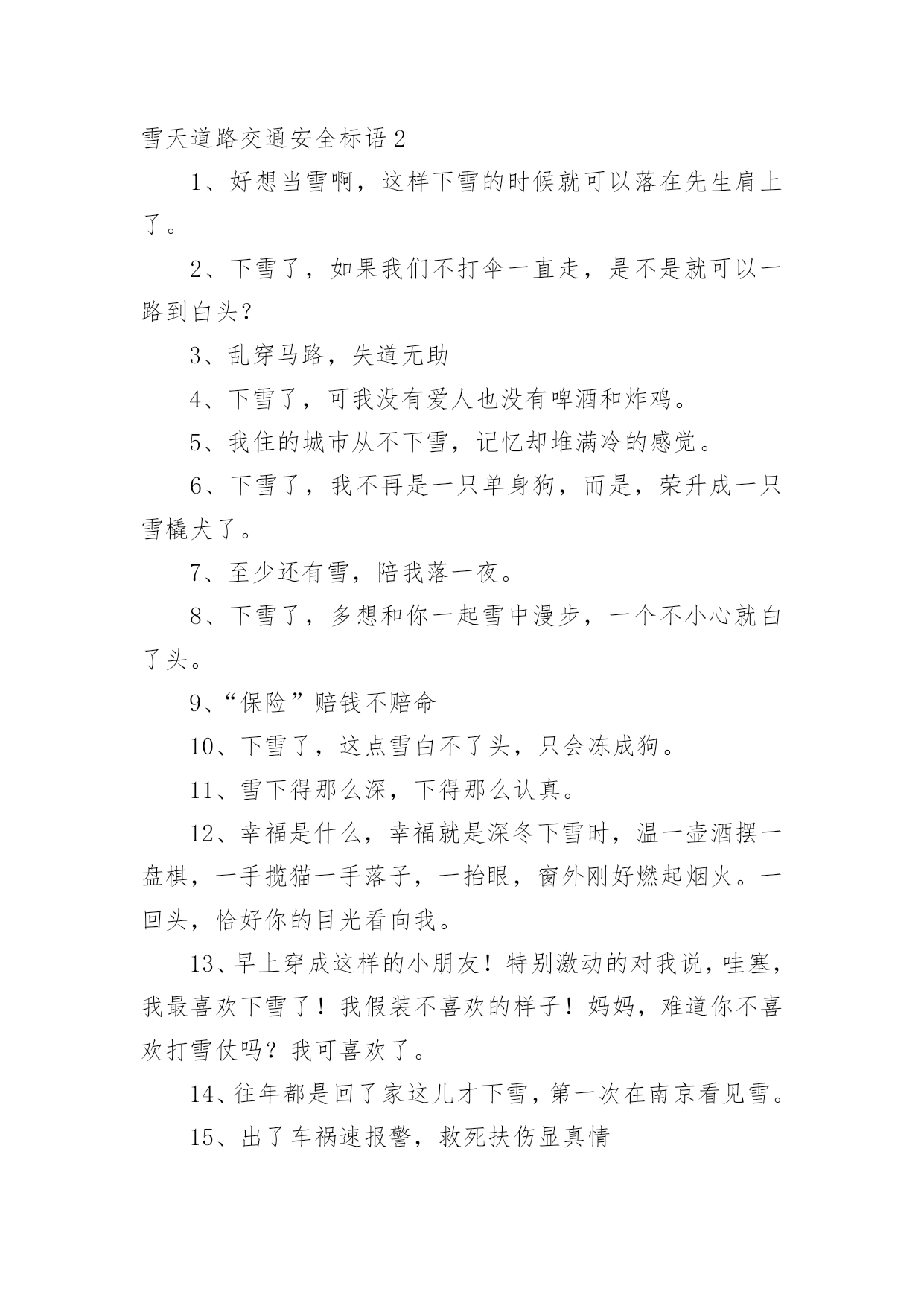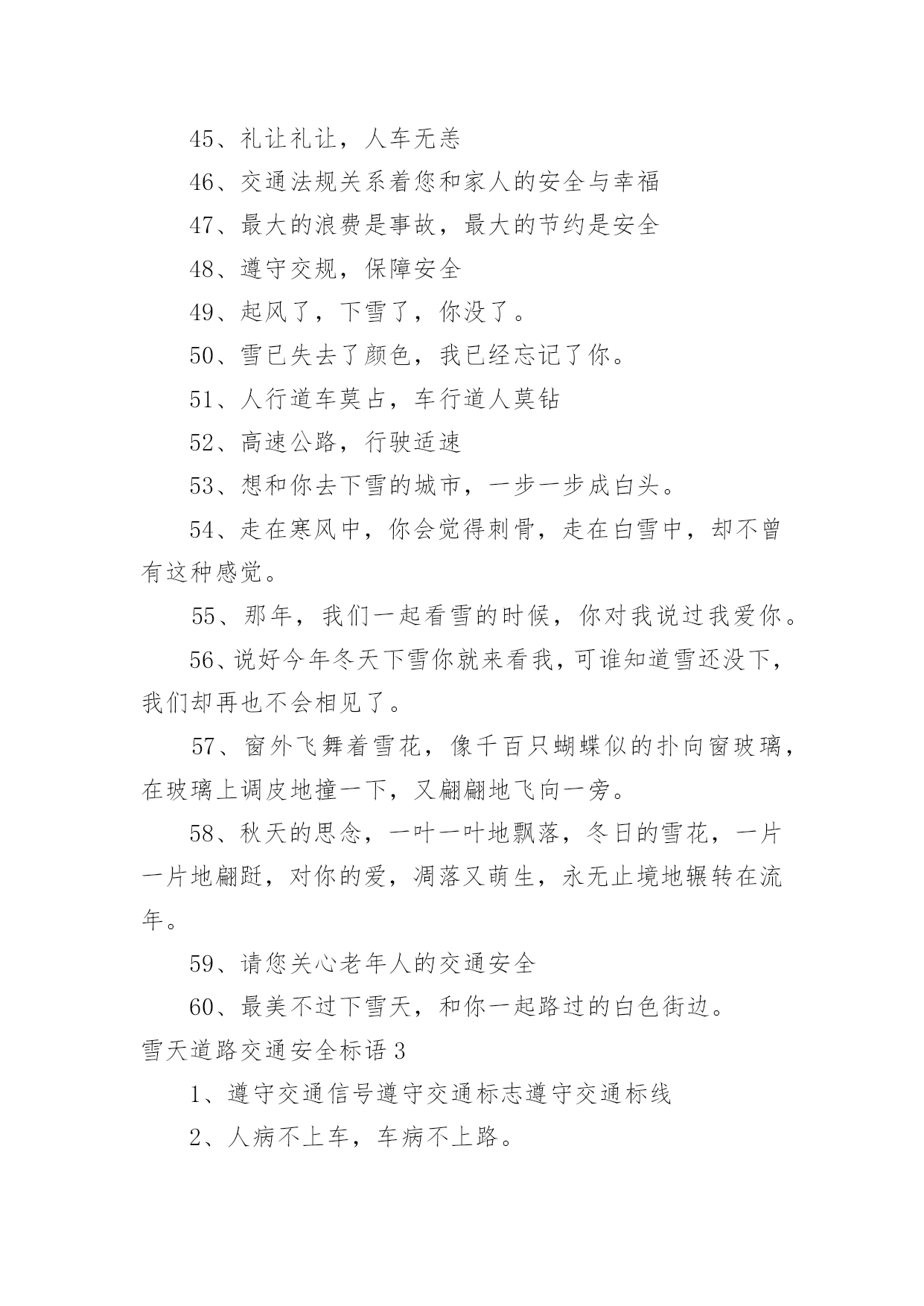 雪天道路交通安全标语雪天道路交通安全标语在学习、工作、生活中,大家一定都接触过一些使用较为普遍的标语吧,标语不但折射着时代精神,也体现了执政的方向和智慧,其意义和作用是不容忽视的。你知道什么样的标语才能算得上是好的标语吗?下面是小编为大家收集的雪天道路交通安全标语,欢迎阅读与收藏。雪天道路交通安全标语11、忽然下的那场雪,飘的那么纯洁,将我埋葬在了你的世界。2、我可以在天冷时自己给自己暖手,我可以在下雪时自己看雪,我可以在冷时自己多添衣服,我也可以给自己倒一杯热茶,真好,我有我自己。3、如此凄美的雪景,如此妩媚的月色,实在是使人难以忘怀。但也许是我太过于多情了。唉,残雪化蝶入梦飞,夜尽天明几时回?4、我在家等了一天看天空下雪没,冻得发抖,你说我傻,我笑了,真想说,我就是傻我才喜欢你。5、宣传交通法规,提高交通文明意识6、迎世博,为河源争光7、又下雪了,你在远方又和谁白着头。8、酒后驾车,拿命赌博9、行万里平安路,做百年长寿人10、还记得那一场雪,陪着我的孤单下了一夜,直到心被冰封冻结。11、纯洁的雪,洗濯了肮脏的世界,邂逅的只是安静的大地。12、晶莹的小雪花落在我的手掌心上,看上去是透明的,慢慢地,它融化了。13、天在下雨我在想你,天在下雪心在滴血。14、大雪随着寒冬来了,街道仿佛是银子铸成的,那么亮,那么有光辉,长长的冰柱像。15、路无规不畅,国无法不宁16、下雪了,雪花儿那么美,那么纯洁。在下雪的日子,对你的思念,会更深一层。对你的想念,也会浓上一层了。17、听说外边下雪了,今年的雪来的有些早啊!18、又是下雪的.季节,你却不在我的身边。19、路为国脉,法系民魂20、交通畅通有序,管理科学高效,执法文明严格21、醒来,窗外模糊的亮,我以为天亮了,只是下雪了。22、加强综合治理,保障交通安全23、下雪了,虽然我不知道你在干什么,我只知道,我在想你。24、轻柔的小雪花飘飘悠悠地落下来。渐渐地,小雪花变大了,变厚了,密密麻麻的。25、下雪了,好想变成雪花,这样就可以落在你的肩头。26、家里下雪了,听说,初雪是可以许愿的,在外面已经漂泊了那么久,我希望我的努力可以多一点幸运的眷顾。27、只有雪才是那么的美,那么的纯洁。28、你那边天气还好吗?我这边下雪了,很想和你一起在雪中散步,发现根本不可能。29、遵守交通法规,关爱生命旅程30、行经路口要观望,拐弯示意要礼让31、我怀疑我心底什么地方,失去记忆与热情,正绵绵地下着雪。32、超载超速,危机四伏33、每个人心底都有那么一个人,已不是恋人,也成不了朋友。时间过去,无关乎喜不喜欢,总会很习惯的想起你。然后希望你一切都好。34、你是千堆雪我是长街,怕日出一到彼此瓦解。35、心无交规,路有坎坷36、一眼望去,尽是纷纷繁繁落下的枯叶。远方的夕阳穿上了嫁衣,将整片树林染成妖艳的红。残雪覆在落叶上,装点着斑驳的土地。37、风一更,雪一更,聒碎乡心梦不成,故园无此声。38、下雪天,你想一起走到白头,我却怕你着凉。39、长街吻过千堆雪,你却未看我一眼。40、我畏惧寒风却偏爱下雪,我害怕喝酒却喜欢喝醉的感觉。41、处罚违章不留情,看似无情却42、晴天适合相见,雪天适合思念。43、绿松上的雪,使孤独的旅人听到了圣音。44、酒后开车,危险万分!45、一秒钟车祸,一辈子痛苦46、上有老,下有小,出了交通事故不得了47、我礼你让,道路通畅48、晴空下,雪花漫天纷飞,像无数的雪精灵在空中漫舞着。看,它们是笑得是如此的快乐,好像是在向人们宣誓这个冬天不再悲伤。49、如果下雪不打伞,我们是不是就可以走到白头了。50、大片大片的雪花,从昏暗的天空中纷纷扬扬地飘落下来。51、说好陪我看第一场雪。雪下了,你在哪?52、人生美好,步步小心53、今天,我用雪化心刻下你的名字。今世,我的心已刻满你的名字。54、他们说,下雪的时候,一定要约自己喜欢的人,出来走走,因为一不小心,就一起白了头!55、在告别某一种生活的时候,你根本不知道有时候转身就是一辈子。时间就定格在那个画面上,有的只是回忆那样浅薄。听说今天要下雪了?转眼又是一个冬天。好快。56、多一些谨慎,多一些安全57、但愿人长久,千里路畅通雪天道路交通安全标语21、好想当雪啊,这样下雪的时候就可以落在先生肩上了。2、下雪了,如果我们不打伞一直走,是不是就可以一路到白头?3、乱穿马路,失道无助4、下雪了,可我没有爱人也没有啤酒和炸鸡。5、我住的城巿从不下雪,记忆却堆满冷的感觉。6、下雪了,我不再是一只单身狗,而是,荣升成一只雪橇犬了。7、至少还有雪,陪我落一夜。8、下雪了,多想和你一起雪中漫步,一个不小心就白了头。9、“保险”赔钱不赔命10、下雪了,这点雪白不了头,只会冻成狗。11、雪下得那么深,下得那么认真。12、幸福是什么,幸福就是深冬下雪时,温一壶酒摆一盘棋,一手揽