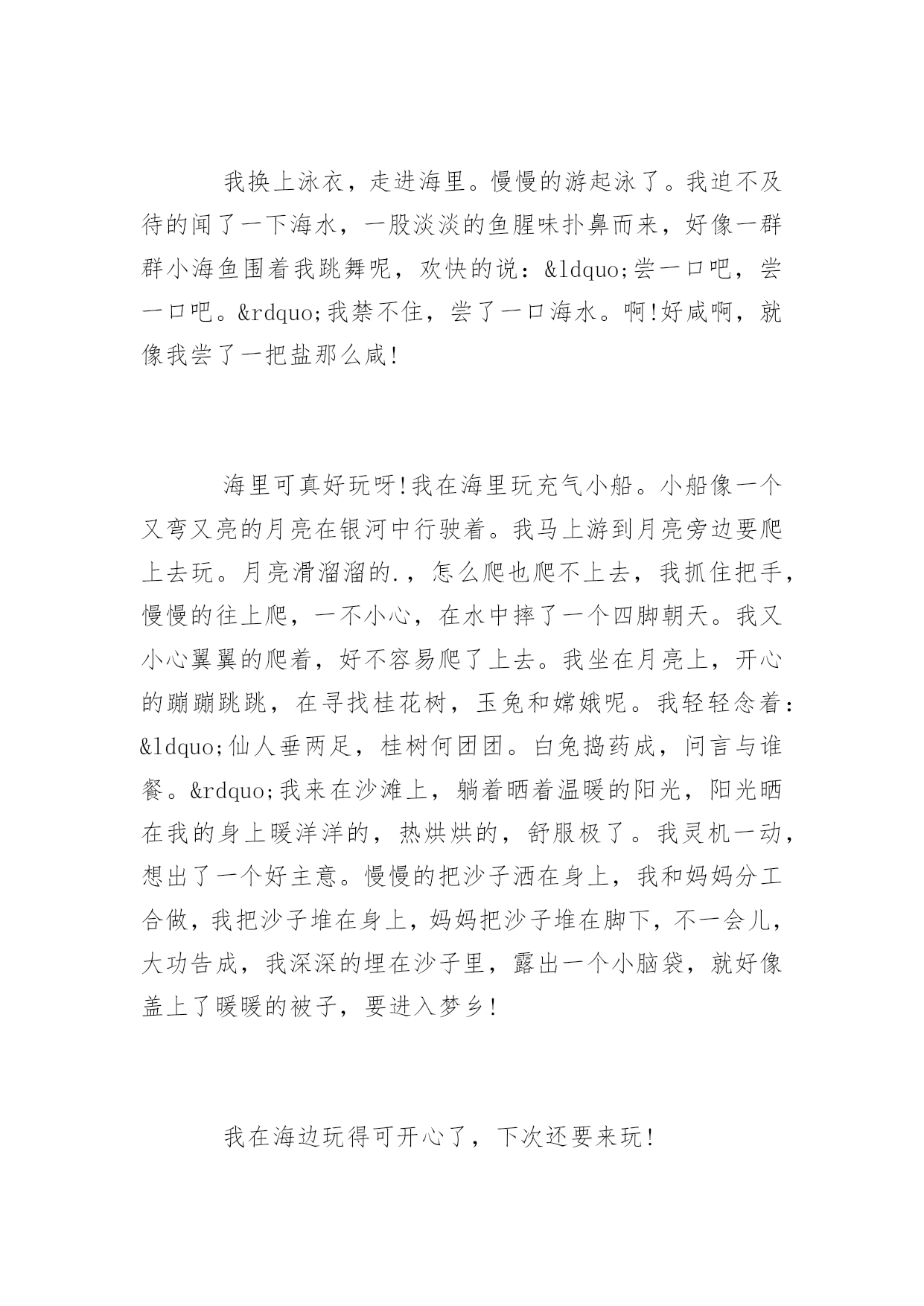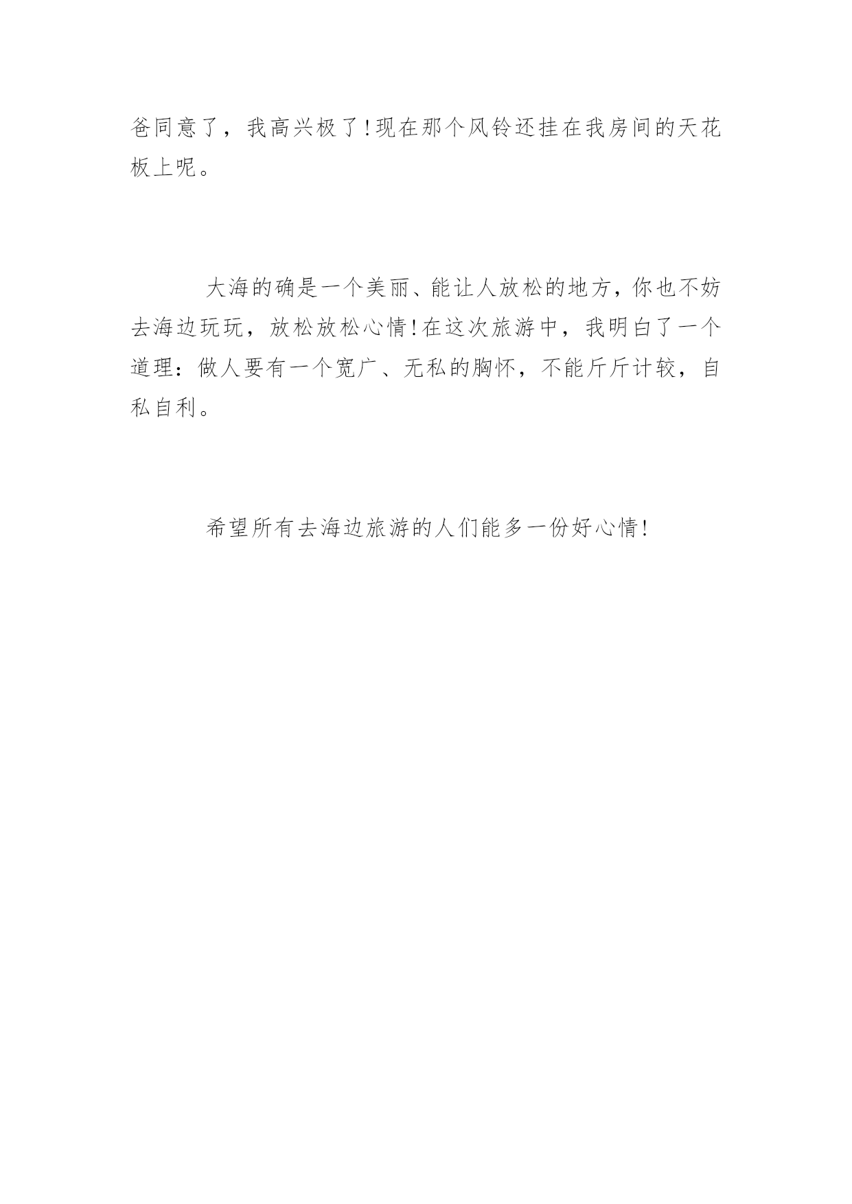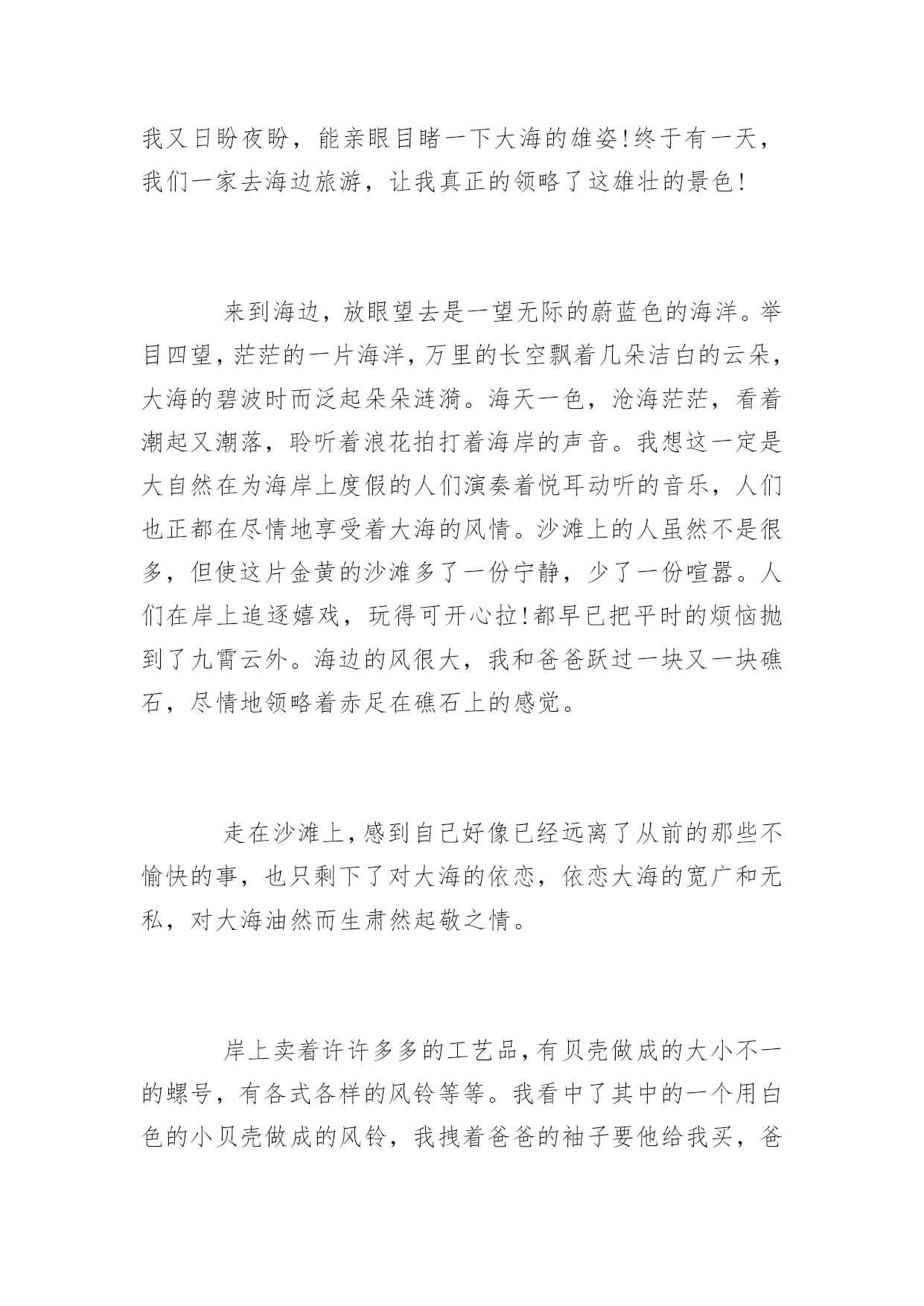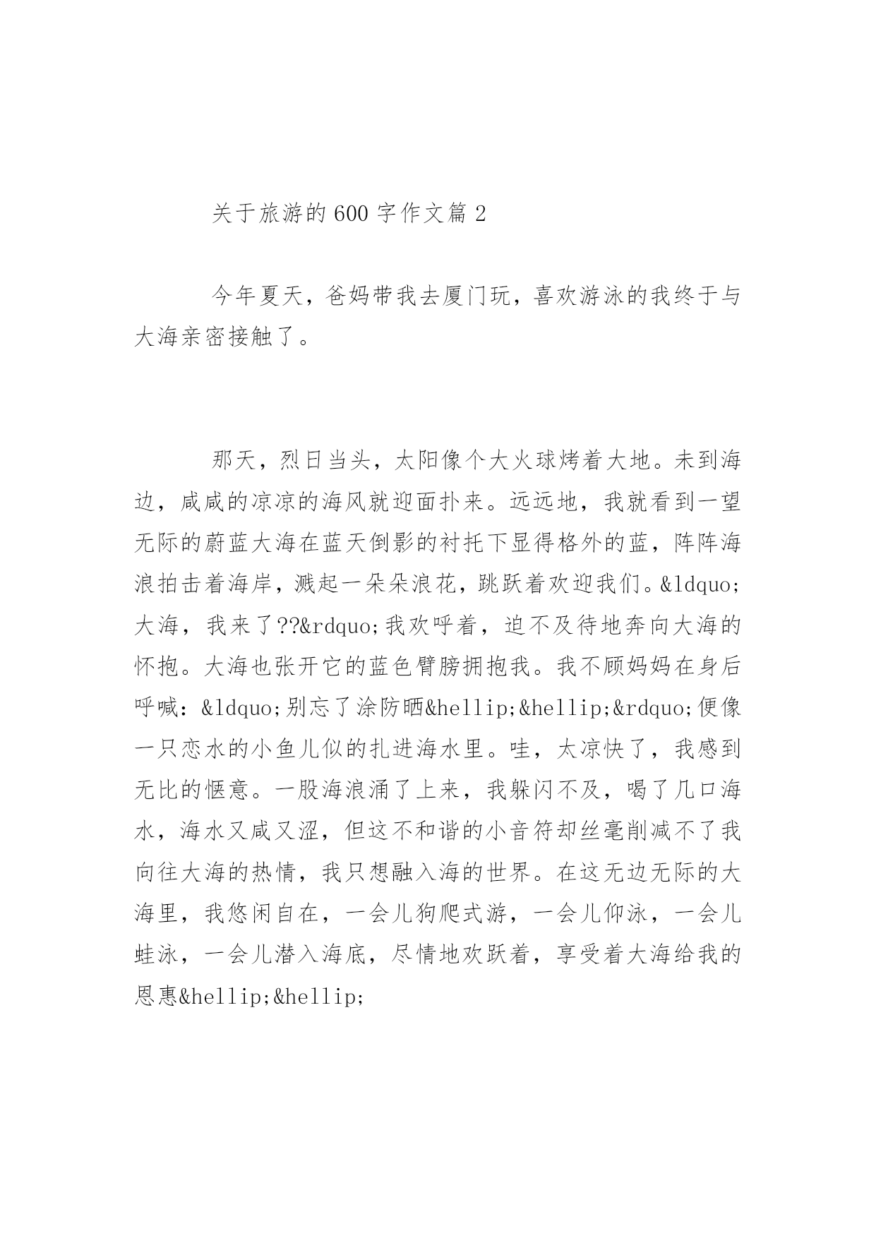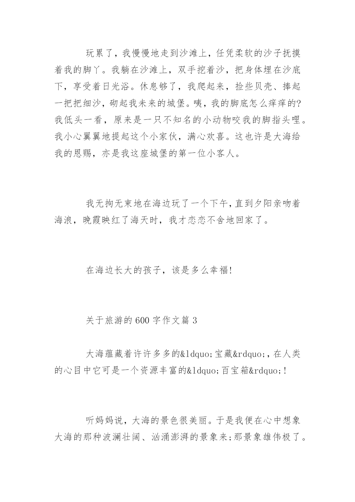 旅游的600字作文关于旅游的600字作文大海的确是一个美丽、能让人放松的地方,你也不妨去海边玩玩,放松放松心情,而我在这次旅游中,明白了一个道理:做人要有一个宽广、无私的胸怀,不能斤斤计较,自私自利。以下是百分网小编为大家整理的关于旅游的600字作文,欢迎大家参考阅读。关于旅游的600字作文篇1今天,我们一起去海边玩。远远看去,天与海连成一线,好像美丽的仙子用强力胶水把他们紧紧的连在一起永远撕不掉,又像把淡蓝色的布与深蓝色的布紧紧缝在一起永远剪不烂。海在天的衬托下显得更深更蓝,天在海的衬托下显得更淡更亮了。我慢慢的走到海边上,海浪冲过来时像一只只小手轻轻的抚摸着我的小脚,退回去挥舞着小手,好像在说:“再见,再见!”我换上泳衣,走进海里。慢慢的游起泳了。我迫不及待的闻了一下海水,一股淡淡的鱼腥味扑鼻而来,好像一群群小海鱼围着我跳舞呢,欢快的说:“尝一口吧,尝一口吧。”我禁不住,尝了一口海水。啊!好咸啊,就像我尝了一把盐那么咸!海里可真好玩呀!我在海里玩充气小船。小船像一个又弯又亮的月亮在银河中行驶着。我马上游到月亮旁边要爬上去玩。月亮滑溜溜的.,怎么爬也爬不上去,我抓住把手,慢慢的往上爬,一不小心,在水中摔了一个四脚朝天。我又小心翼翼的爬着,好不容易爬了上去。我坐在月亮上,开心的蹦蹦跳跳,在寻找桂花树,玉兔和嫦娥呢。我轻轻念着:“仙人垂两足,桂树何团团。白兔捣药成,问言与谁餐。”我来在沙滩上,躺着晒着温暖的阳光,阳光晒在我的身上暖洋洋的,热烘烘的,舒服极了。我灵机一动,想出了一个好主意。慢慢的把沙子洒在身上,我和妈妈分工合做,我把沙子堆在身上,妈妈把沙子堆在脚下,不一会儿,大功告成,我深深的埋在沙子里,露出一个小脑袋,就好像盖上了暖暖的被子,要进入梦乡!我在海边玩得可开心了,下次还要来玩!关于旅游的600字作文篇2今年夏天,爸妈带我去厦门玩,喜欢游泳的我终于与大海亲密接触了。那天,烈日当头,太阳像个大火球烤着大地。未到海边,咸咸的凉凉的海风就迎面扑来。远远地,我就看到一望无际的蔚蓝大海在蓝天倒影的衬托下显得格外的蓝,阵阵海浪拍击着海岸,溅起一朵朵浪花,跳跃着欢迎我们。“大海,我来了??”我欢呼着,迫不及待地奔向大海的怀抱。大海也张开它的蓝色臂膀拥抱我。我不顾妈妈在身后呼喊:“别忘了涂防晒……”便像一只恋水的小鱼儿似的扎进海水里。哇,太凉快了,我感到无比的惬意。一股海浪涌了上来,我躲闪不及,喝了几口海水,海水又咸又涩,但这不和谐的小音符却丝毫削减不了我向往大海的热情,我只想融入海的世界。在这无边无际的大海里,我悠闲自在,一会儿狗爬式游,一会儿仰泳,一会儿蛙泳,一会儿潜入海底,尽情地欢跃着,享受着大海给我的恩惠……玩累了,我慢慢地走到沙滩上,任凭柔软的沙子抚摸着我的脚丫。我躺在沙滩上,双手挖着沙,把身体埋在沙底下,享受着日光浴。休息够了,我爬起来,捡些贝壳、捧起一把把细沙,砌起我未来的城堡。咦,我的脚底怎么痒痒的?我低头一看,原来是一只不知名的小动物咬我的脚指头哩。我小心翼翼地提起这个小家伙,满心欢喜。这也许是大海给我的恩赐,亦是我这座城堡的第一位小客人。我无拘无束地在海边玩了一个下午,直到夕阳亲吻着海浪,晚霞映红了海天时,我才恋恋不舍地回家了。在海边长大的孩子,该是多么幸福!关于旅游的600字作文篇3大海蕴藏着许许多多的“宝藏”,在人类的心目中它可是一个资源丰富的“百宝箱”!听妈妈说,大海的景色很美丽。于是我便在心中想象大海的那种波澜壮阔、汹涌澎湃的景象来;那景象雄伟极了。我又日盼夜盼,能亲眼目睹一下大海的雄姿!终于有一天,我们一家去海边旅游,让我真正的领略了这雄壮的景色!来到海边,放眼望去是一望无际的蔚蓝色的海洋。举目四望,茫茫的一片海洋,万里的长空飘着几朵洁白的云朵,大海的碧波时而泛起朵朵涟漪。海天一色,沧海茫茫,看着潮起又潮落,聆听着浪花拍打着海岸的声音。我想这一定是大自然在为海岸上度假的人们演奏着悦耳动听的音乐,人们也正都在尽情地享受着大海的风情。沙滩上的人虽然不是很多,但使这片金黄的沙滩多了一份宁静,少了一份喧嚣。人们在岸上追逐嬉戏,玩得可开心拉!都早已把平时的烦恼抛到了九霄云外。海边的风很大,我和爸爸跃过一块又一块礁石,尽情地领略着赤足在礁石上的感觉。走在沙滩上,感到自己好像已经远离了从前的那些不愉快的事,也只剩下了对大海的依恋,依恋大海的宽广和无私,对大海油然而生肃然起敬之情。岸上卖着许许多多的工艺品,有贝壳做成的大小不一的螺号,有各式各样的风铃等等。我看