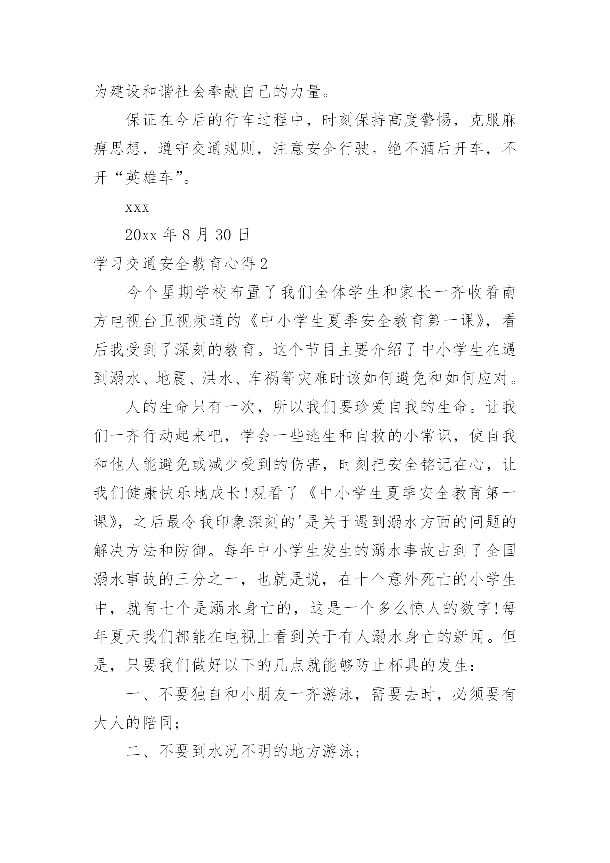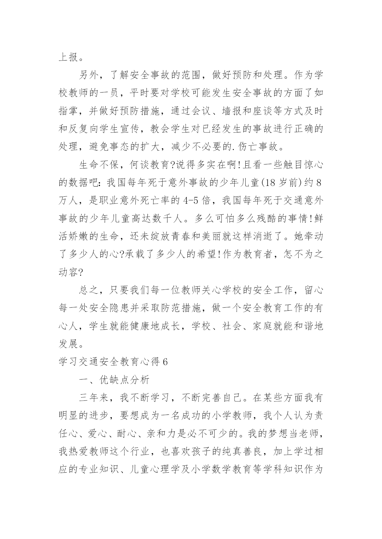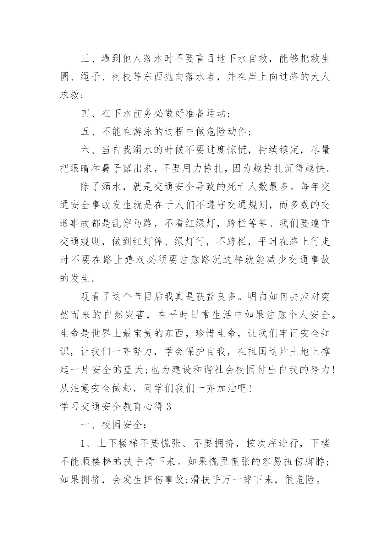 学习交通安全教育心得学习交通安全教育心得学习交通安全教育心得1一直以来,我都觉得自己不会那么倒霉,交通安全事故不会找上我,稍微注意一点就行了,就因为自己的麻痹大意,造成了交通事故,参加了为期七天的道路交通安全教育学习。通过学习了交通安全事故案例之后,一幕幕触目惊心的事件和惨不忍睹的画面在我的脑海徘徊久久挥之不去。这些事故无一例外都是因为忽视思想作风建设、忽略道路交通安全而引发的,事故的后果给国家和人民的生命财产造成无法弥补的重大损失。在学习道路交通安全警示的现场,我深刻体会到道路交通安全就存在于我们道路驾驶过程中的每一个细节里,稍有懈怠都有可能酿出恶果。参加道路交通安全警示教育学习后,我认识到交通安全在日常生活中的重要性。“以人为本,安全第一”,严格自觉地遵守道路交通安全是一个机动车驾驶员最基本的`义务,也是保障国家、人民以及个人财产和生命安全的必要行为。“防范胜于未然”,为此,我今后一定要时刻紧记并严格遵守道路交通安全法律法规,在思想上牢牢树立安全驾驶的意识,一刻也不能松懈;在作风上坚定贯彻谨慎行车的要求,杜绝一切不利于道路交通安全的行为。同时我也要以身作则,引导和带动周围的人共同维护好道路交通安全,切实为建设和谐社会奉献自己的力量。保证在今后的行车过程中,时刻保持高度警惕,克服麻痹思想,遵守交通规则,注意安全行驶。绝不酒后开车,不开“英雄车”。xxx20xx年8月30日学习交通安全教育心得2今个星期学校布置了我们全体学生和家长一齐收看南方电视台卫视频道的《中小学生夏季安全教育第一课》,看后我受到了深刻的教育。这个节目主要介绍了中小学生在遇到溺水、地震、洪水、车祸等灾难时该如何避免和如何应对。人的生命只有一次,所以我们要珍爱自我的生命。让我们一齐行动起来吧,学会一些逃生和自救的小常识,使自我和他人能避免或减少受到的伤害,时刻把安全铭记在心,让我们健康快乐地成长!观看了《中小学生夏季安全教育第一课》,之后最令我印象深刻的'是关于遇到溺水方面的问题的解决方法和防御。每年中小学生发生的溺水事故占到了全国溺水事故的三分之一,也就是说,在十个意外死亡的小学生中,就有七个是溺水身亡的,这是一个多么惊人的数字!每年夏天我们都能在电视上看到关于有人溺水身亡的新闻。但是,只要我们做好以下的几点就能够防止杯具的发生:一、不要独自和小朋友一齐游泳,需要去时,必须要有大人的陪同;二、不要到水况不明的地方游泳;三、遇到他人落水时不要盲目地下水自救,能够把救生圈、绳子、树枝等东西抛向落水者,并在岸上向过路的大人求救;四、在下水前务必做好准备运动;五、不能在游泳的过程中做危险动作;六、当自我溺水的时候不要过度惊慌,持续镇定,尽量把眼睛和鼻子露出来,不要用力挣扎,因为越挣扎沉得越快。除了溺水,就是交通安全导致的死亡人数最多。每年交通安全事故发生就是在于人们不遵守交通规则,而多数的交通事故都是乱穿马路,不看红绿灯,跨栏等等。我们要遵守交通规则,做到红灯停、绿灯行,不跨栏,平时在路上行走时不要在路上嬉戏必须要注意路况这样就能减少交通事故的发生。观看了这个节目后我真是获益良多。明白如何去应对突然而来的自然灾害,在平时日常生活中如果注意个人安全。生命是世界上最宝贵的东西,珍惜生命,让我们牢记安全知识,让我们一齐努力,学会保护自我,在祖国这片土地上撑起一片安全的蓝天;也为建设和谐社会校园付出自我的努力!从注意安全做起,同学们我们一齐加油吧!学习交通安全教育心得3一、校园安全:1、上下楼梯不要慌张、不要拥挤,按次序进行,下楼不能顺楼梯的扶手滑下来。如果慌里慌张的容易扭伤脚脖;如果拥挤,会发生摔伤事故;滑扶手万一摔下来,很危险。2、课间活动要文明,追逐撵打易碰伤,谨记教导是上策。3、打扫卫生时,一定注意不能拿扫把乱打、乱闹。4、为了督促学生们自律,我特意安排了课间安全监督员,发现课间或课外活动有学生有不安全的行为,安全监督员首先制止,然后报告老师,发现不安全的表现及时报告老师,老师及时教育并弥补管理上的漏洞。二、校外安全:1、告诫学生遵守交通规则,看信号灯过马路,不要横穿马路,特别是你忽然从花坛里蹿出来,很危险的。2、按时上学和回家,不要早到,在外边逗留有不安全音素;放学按时回家,让家长放心,最好不要私自去同学家或相约到某个地方玩,如果去给家长说一声。3、网吧、游戏厅不能去,里面人员杂乱、环境不好对身心健康不利,万一碰上坏人,很麻烦。4、放学有学生坐车,学生容易拥挤,我安排有值日队长,维持秩序,一定做到排队上车,到站不能拥挤。5、路上遇到陌生人,最好少与他们交谈,一定不能要陌生人的东西。6、大雨天,不要再大树下避雨,大雨天出门要小心,最好不要出门。三、饮食安全:1、提醒学生早餐尽量在家吃,一定要吃好。2、不乱吃小零食和地摊上的食物。3、多饮用白开水,少喝饮料特别是碳