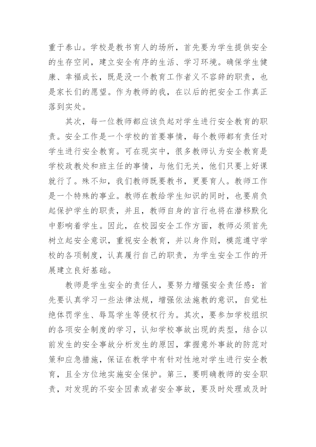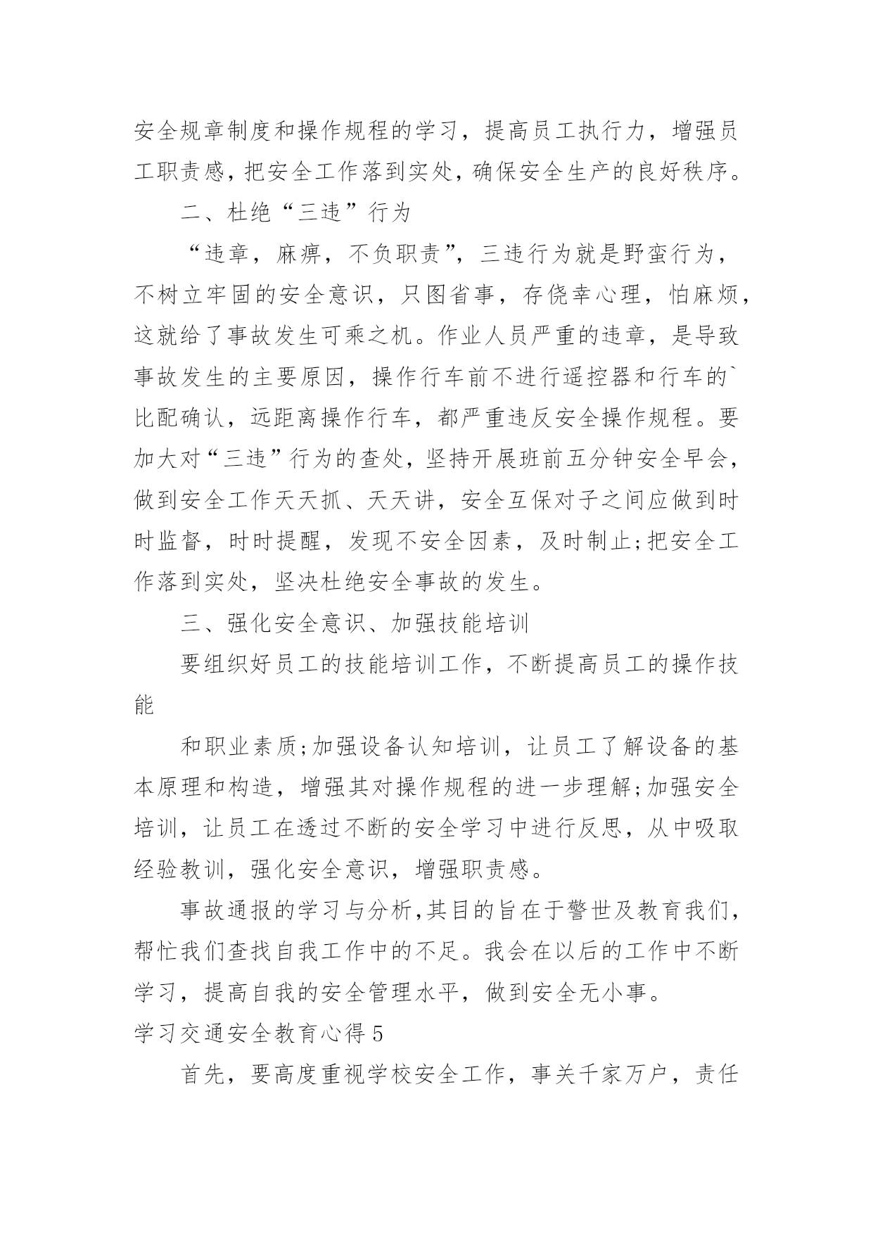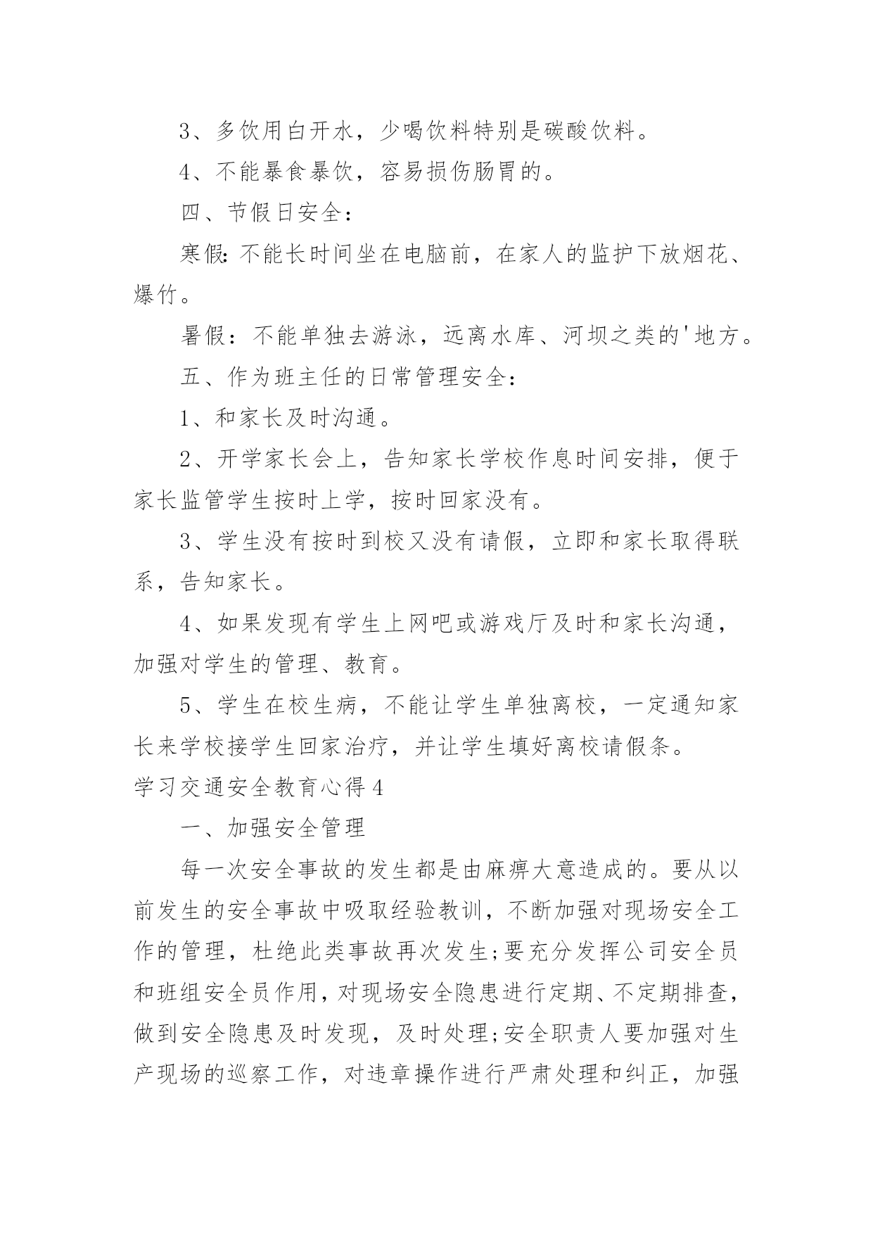 学习交通安全教育心得学习交通安全教育心得学习交通安全教育心得1一直以来,我都觉得自己不会那么倒霉,交通安全事故不会找上我,稍微注意一点就行了,就因为自己的麻痹大意,造成了交通事故,参加了为期七天的道路交通安全教育学习。通过学习了交通安全事故案例之后,一幕幕触目惊心的事件和惨不忍睹的画面在我的脑海徘徊久久挥之不去。这些事故无一例外都是因为忽视思想作风建设、忽略道路交通安全而引发的,事故的后果给国家和人民的生命财产造成无法弥补的重大损失。在学习道路交通安全警示的现场,我深刻体会到道路交通安全就存在于我们道路驾驶过程中的每一个细节里,稍有懈怠都有可能酿出恶果。参加道路交通安全警示教育学习后,我认识到交通安全在日常生活中的重要性。“以人为本,安全第一”,严格自觉地遵守道路交通安全是一个机动车驾驶员最基本的`义务,也是保障国家、人民以及个人财产和生命安全的必要行为。“防范胜于未然”,为此,我今后一定要时刻紧记并严格遵守道路交通安全法律法规,在思想上牢牢树立安全驾驶的意识,一刻也不能松懈;在作风上坚定贯彻谨慎行车的要求,杜绝一切不利于道路交通安全的行为。同时我也要以身作则,引导和带动周围的人共同维护好道路交通安全,切实为建设和谐社会奉献自己的力量。保证在今后的行车过程中,时刻保持高度警惕,克服麻痹思想,遵守交通规则,注意安全行驶。绝不酒后开车,不开“英雄车”。xxx20xx年8月30日学习交通安全教育心得2今个星期学校布置了我们全体学生和家长一齐收看南方电视台卫视频道的《中小学生夏季安全教育第一课》,看后我受到了深刻的教育。这个节目主要介绍了中小学生在遇到溺水、地震、洪水、车祸等灾难时该如何避免和如何应对。人的生命只有一次,所以我们要珍爱自我的生命。让我们一齐行动起来吧,学会一些逃生和自救的小常识,使自我和他人能避免或减少受到的伤害,时刻把安全铭记在心,让我们健康快乐地成长!观看了《中小学生夏季安全教育第一课》,之后最令我印象深刻的'是关于遇到溺水方面的问题的解决方法和防御。每年中小学生发生的溺水事故占到了全国溺水事故的三分之一,也就是说,在十个意外死亡的小学生中,就有七个是溺水身亡的,这是一个多么惊人的数字!每年夏天我们都能在电视上看到关于有人溺水身亡的新闻。但是,只要我们做好以下的几点就能够防止杯具的发生:一、不要独自和小朋友一齐游泳,需要去时,必须要有大人的陪同;二、不要到水况不明的地方游泳;三、遇到他人落水时不要盲目地下水自救,能够把救生圈、绳子、树枝等东西抛向落水者,并在岸上向过路的大人求救;四、在下水前务必做好准备运动;五、不能在游泳的过程中做危险动作;六、当自我溺水的时候不要过度惊慌,持续镇定,尽量把眼睛和鼻子露出来,不要用力挣扎,因为越挣扎沉得越快。除了溺水,就是交通安全导致的死亡人数最多。每年交通安全事故发生就是在于人们不遵守交通规则,而多数的交通事故都是乱穿马路,不看红绿灯,跨栏等等。我们要遵守交通规则,做到红灯停、绿灯行,不跨栏,平时在路上行走时不要在路上嬉戏必须要注意路况这样就能减少交通事故的发生。观看了这个节目后我真是获益良多。明白如何去应对突然而来的自然灾害,在平时日常生活中如果注意个人安全。生命是世界上最宝贵的东西,珍惜生命,让我们牢记安全知识,让我们一齐努力,学会保护自我,在祖国这片土地上撑起一片安全的蓝天;也为建设和谐社会校园付出自我的努力!从注意安全做起,同学们我们一齐加油吧!学习交通安全教育心得3一、校园安全:1、上下楼梯不要慌张、不要拥挤,按次序进行,下楼不能顺楼梯的扶手滑下来。如果慌里慌张的容易扭伤脚脖;如果拥挤,会发生摔伤事故;滑扶手万一摔下来,很危险。2、课间活动要文明,追逐撵打易碰伤,谨记教导是上策。3、打扫卫生时,一定注意不能拿扫把乱打、乱闹。4、为了督促学生们自律,我特意安排了课间安全监督员,发现课间或课外活动有学生有不安全的行为,安全监督员首先制止,然后报告老师,发现不安全的表现及时报告老师,老师及时教育并弥补管理上的漏洞。二、校外安全:1、告诫学生遵守交通规则,看信号灯过马路,不要横穿马路,特别是你忽然从花坛里蹿出来,很危险的。2、按时上学和回家,不要早到,在外边逗留有不安全音素;放学按时回家,让家长放心,最好不要私自去同学家或相约到某个地方玩,如果去给家长说一声。3、网吧、游戏厅不能去,里面人员杂乱、环境不好对身心健康不利,万一碰上坏人,很麻烦。4、放学有学生坐车,学生容易拥挤,我安排有值日队长,维持秩序,一定做到排队上车,到站不能拥挤。5、路上遇到陌生人,最好少与他们交谈,一定不能要陌生人的东西。6、大雨天,不要再大树下避雨,大雨天出门要小心,最好不要出门。三、饮食安全:1、提醒学生早餐尽量在家吃,一定要吃好。2、不乱吃小零食和地摊上的食物。3、多饮用白开水,少喝饮料特别是碳