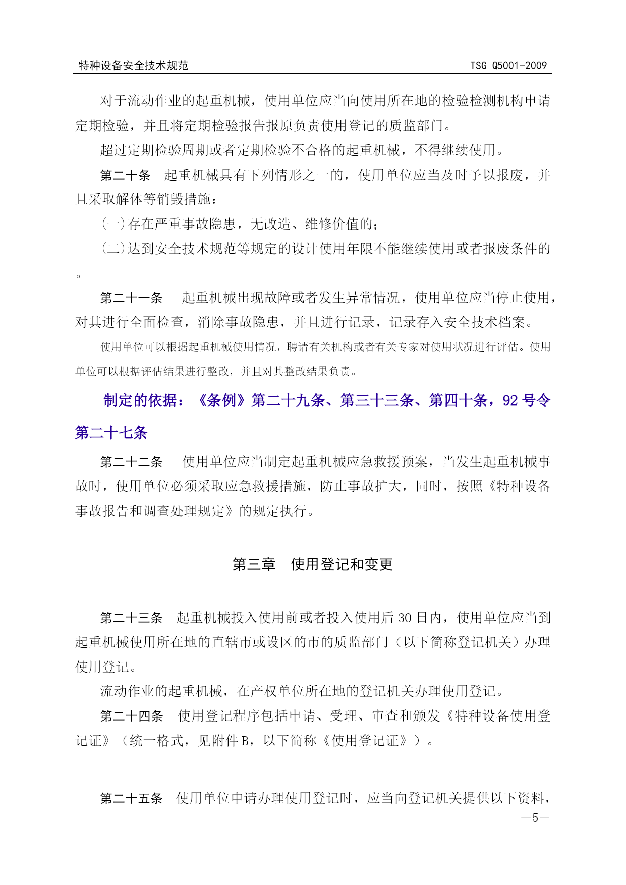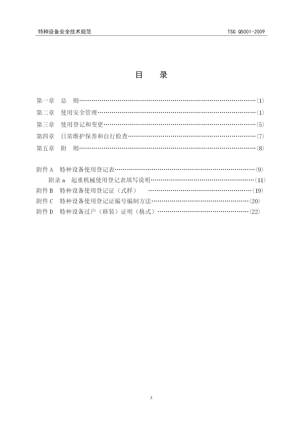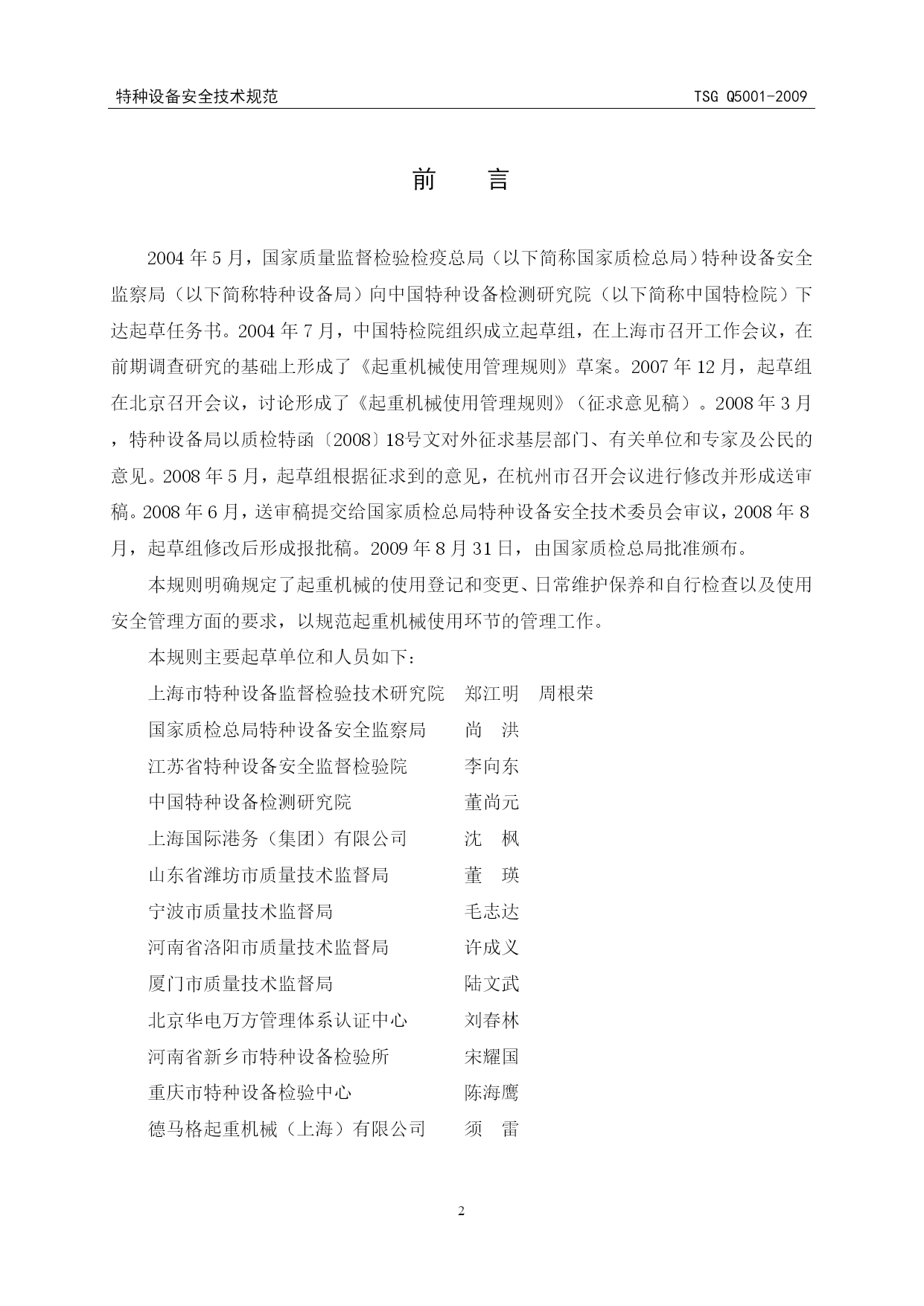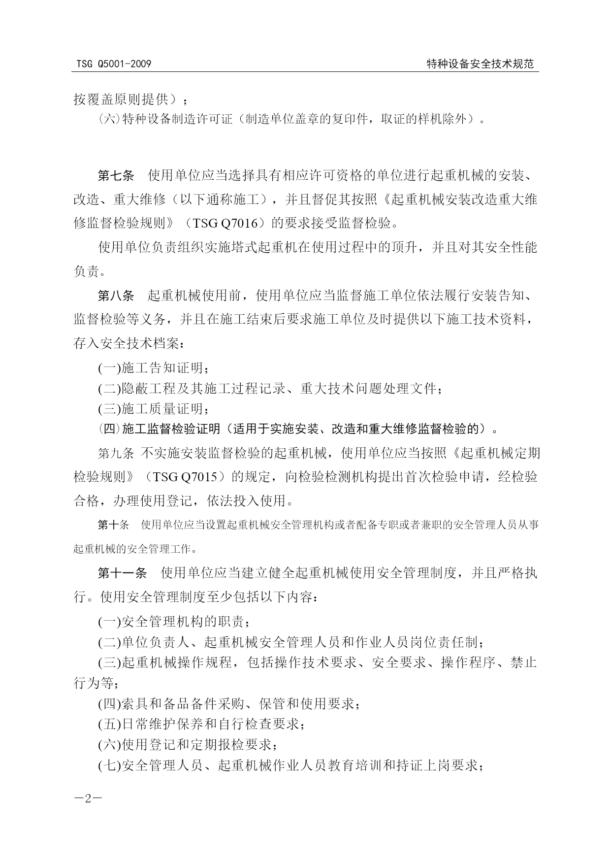 特种设备安全技术规范TSGQ5001-2009特种设备安全技术规范TSGQ5001-2009PAGE2PAGE3TSG特种设备安全技术规范TSGQ5001-2009起重机械使用管理规则CranesServiceAdministrationRegulation中华人民共和国国家质量监督检验检疫总局颁布2009年8月31日前言2004年5月,国家质量监督检验检疫总局(以下简称国家质检总局)特种设备安全监察局(以下简称特种设备局)向中国特种设备检测研究院(以下简称中国特检院)下达起草任务书。2004年7月,中国特检院组织成立起草组,在上海市召开工作会议,在前期调查研究的基础上形成了《起重机械使用管理规则》草案。2007年12月,起草组在北京召开会议,讨论形成了《起重机械使用管理规则》(征求意见稿)。2008年3月,特种设备局以质检特函〔2008〕18号文对外征求基层部门、有关单位和专家及公民的意见。2008年5月,起草组根据征求到的意见,在杭州市召开会议进行修改并形成送审稿。2008年6月,送审稿提交给国家质检总局特种设备安全技术委员会审议,2008年8月,起草组修改后形成报批稿。2009年8月31日,由国家质检总局批准颁布。本规则明确规定了起重机械的使用登记和变更、日常维护保养和自行检查以及使用安全管理方面的要求,以规范起重机械使用环节的管理工作。本规则主要起草单位和人员如下:上海市特种设备监督检验技术研究院郑江明周根荣国家质检总局特种设备安全监察局尚洪江苏省特种设备安全监督检验院李向东中国特种设备检测研究院董尚元上海国际港务(集团)有限公司沈枫山东省潍坊市质量技术监督局董瑛宁波市质量技术监督局毛志达河南省洛阳市质量技术监督局许成义厦门市质量技术监督局陆文武北京华电万方管理体系认证中心刘春林河南省新乡市特种设备检验所宋耀国重庆市特种设备检验中心陈海鹰德马格起重机械(上海)有限公司须雷目录第一章总则……………………………………………………………………………(1)第二章使用安全管理……………………………………………………………………(1)第三章使用登记和变更…………………………………………………………………(5)第四章日常维护保养和自行检查………………………………………………………(7)第五章附则……………………………………………………………………………(8)附件A特种设备使用登记表……………………………………………………………(9)附录a起重机械使用登记表填写说明……………………………………………(11)附件B特种设备使用登记证(式样)……………………………………………(19)附件C特种设备使用登记证编号编制方法…………………………………………(20)附件D特种设备过户(移装)证明(格式)………………………………………(22)TSGQ5001-2009特种设备安全技术规范特种设备安全技术规范TSGQ5001-2009-PAGE22--PAGE21-起重机械使用管理规则第一章总则共四条第一条为了规范起重机械的使用管理,防止和减少事故,根据《特种设备安全监察条例》、《起重机械安全监察规定》,制定本规则。第二条本规则适用于《特种设备安全监察条例》规定范围内的起重机械的使用管理。第三条起重机械的使用单位应当按照本规则的要求,保证起重机械安全使用。第四条国家质量监督检验检疫总局负责全国起重机械使用的安全监察工作,县以上地方质量技术监督部门负责本行政区域内起重机械使用的安全监察工作。第二章使用安全管理共十八条第五条使用单位应当根据起重机械的用途、使用频率、载荷状态和工作环境,选择适应使用条件要求的相应品种(型式)的起重机。如果选型错误,由使用单位负责。第六条使用单位购置的起重机械应当由具备相应制造许可资格的单位制造,产品应当符合有关安全技术规范及其相关标准的要求,随机的产品技术资料应当齐全。产品技术资料至少包括以下内容;(一)设计文件,包括总图、主要受力结构件图、机械传动图、电气和液压(气动)系统原理图;(二)产品质量合格证明;(三)安装使用维修说明;(四)制造监督检验证书(适用于实施制造监督检验的);(五)整机和安全保护装置的型式试验合格证明(制造单位盖章的复印件,按覆盖原则提供);(六)特种设备制造许可证(制造单位盖章的复印件,取证的样机除外)。第七条使用单位应当选择具有相应许可资格的单位进行起重机械的安装、改造、重大维修(以下通称施工),并且督促其按照《起重机械安装改造重大维修监督检验规则》(TSGQ7016)的要求接受监督检验。使用单位负责组织实施