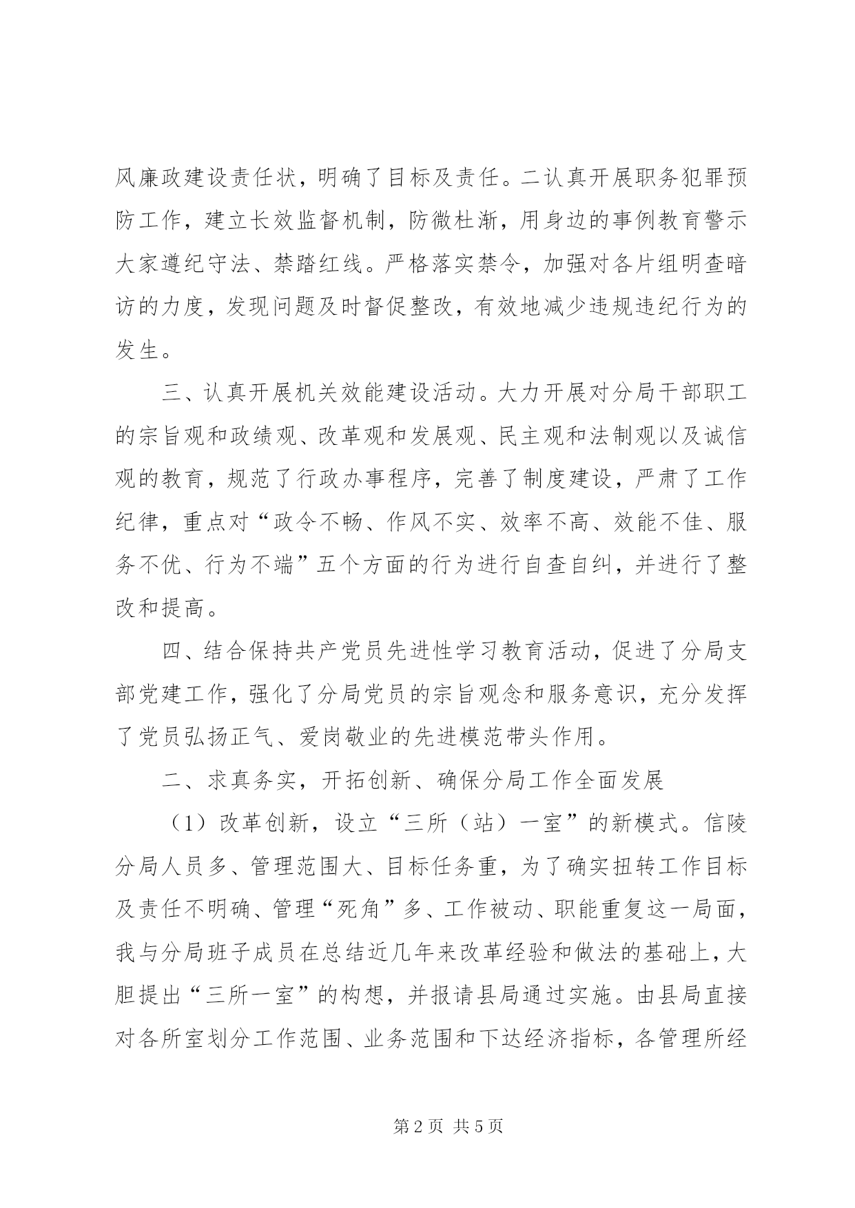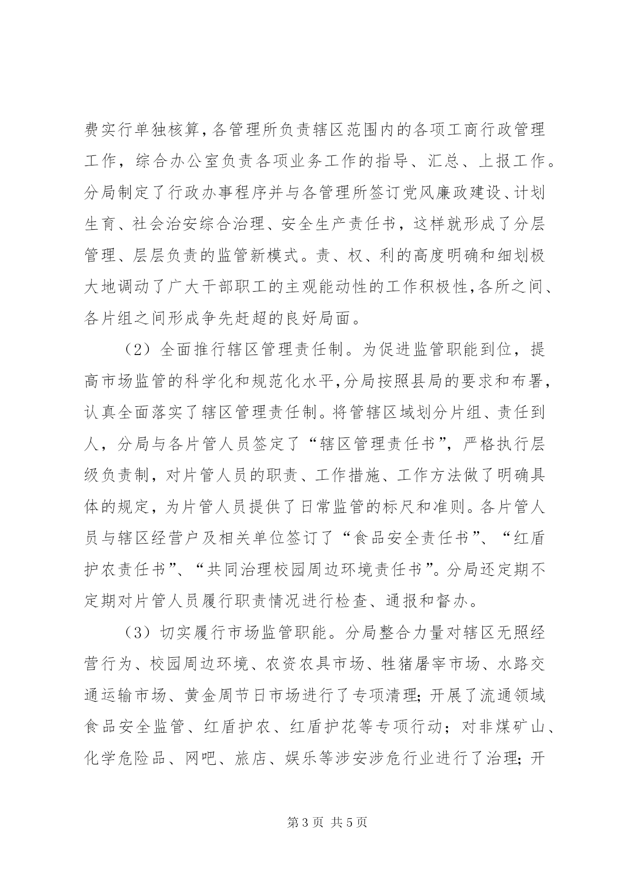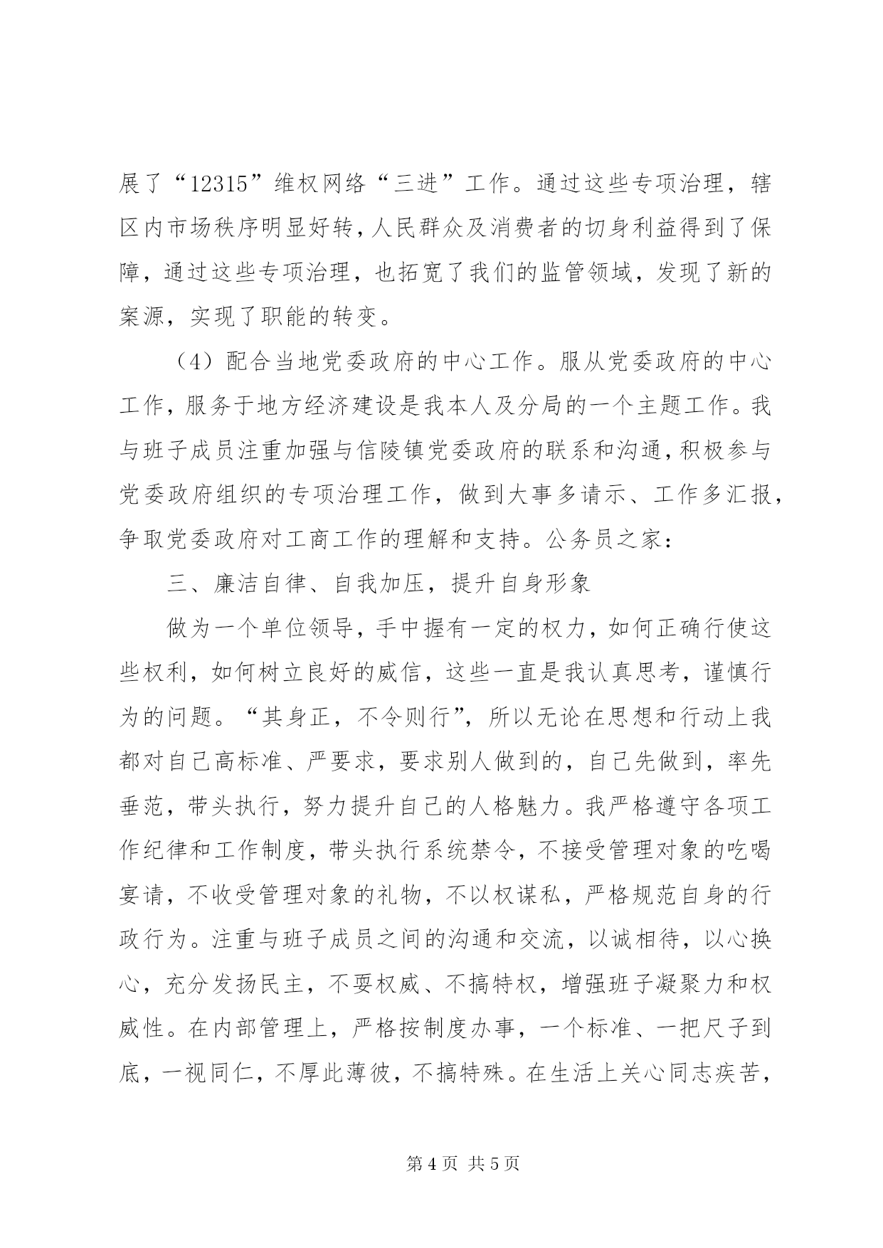 第PAGE\*Arabic\*MERGEFORMAT5页共NUMPAGES\*MERGEFORMAT5页工商局长年度述廉报告**年以来,我始终坚持“以人为本、立足本职、求真务实、改革创新”的理念和作风,凝聚和团结分局一班人,以群众满意和社会满意为衡量我们工作的一把尺子,以队伍建设和党风廉政建设为基础,依法行政,切实履行监管职能,服从于县局及当地党委政府的领导,服务于地方经济的建设和发展,较好得完成了各项工作任务,实现了全面发展,稳中求进的目标。现将我一年来的工作、思想情况做如下述职。一、抓党风廉政建设,提高队伍依法廉洁从政的意识今年以来,我抓住“机关效能建设”和“保持共产党员先进性学习教育活动”的契机,扎实认真地学习,深刻领会精神实质,并从自身上找原因,弥不足,虚心听取群众的意见和建议,与党组织保持一致,从而树立正确的权力观、地位观、利益观和执政为民、廉洁奉公、求真务实的理念。针对分局人员多,思想复杂,加之现行体制不完善,经费和待遇保障难于到位的情况,如何统一思想,步调一致,稳中求进最为关键,我与班子成员齐心协力,共谋发展,主要从以下几个方面手。一、加强机构建设和制度建设,把党廉工作和队伍建设工作做分局第一要务来抓,成立了党风廉政建设领导小组,制定了党风廉政建设责任制,分局与各管理片、分局与干部职工签定了党风廉政建设责任状,明确了目标及责任。二认真开展职务犯罪预防工作,建立长效监督机制,防微杜渐,用身边的事例教育警示大家遵纪守法、禁踏红线。严格落实禁令,加强对各片组明查暗访的力度,发现问题及时督促整改,有效地减少违规违纪行为的发生。三、认真开展机关效能建设活动。大力开展对分局干部职工的宗旨观和政绩观、改革观和发展观、民主观和法制观以及诚信观的教育,规范了行政办事程序,完善了制度建设,严肃了工作纪律,重点对“政令不畅、作风不实、效率不高、效能不佳、服务不优、行为不端”五个方面的行为进行自查自纠,并进行了整改和提高。四、结合保持共产党员先进性学习教育活动,促进了分局支部党建工作,强化了分局党员的宗旨观念和服务意识,充分发挥了党员弘扬正气、爱岗敬业的先进模范带头作用。二、求真务实,开拓创新、确保分局工作全面发展(1)改革创新,设立“三所(站)一室”的新模式。信陵分局人员多、管理范围大、目标任务重,为了确实扭转工作目标及责任不明确、管理“死角”多、工作被动、职能重复这一局面,我与分局班子成员在总结近几年来改革经验和做法的基础上,大胆提出“三所一室”的构想,并报请县局通过实施。由县局直接对各所室划分工作范围、业务范围和下达经济指标,各管理所经费实行单独核算,各管理所负责辖区范围内的各项工商行政管理工作,综合办公室负责各项业务工作的指导、汇总、上报工作。分局制定了行政办事程序并与各管理所签订党风廉政建设、计划生育、社会治安综合治理、安全生产责任书,这样就形成了分层管理、层层负责的监管新模式。责、权、利的高度明确和细划极大地调动了广大干部职工的主观能动性的工作积极性,各所之间、各片组之间形成争先赶超的良好局面。(2)全面推行辖区管理责任制。为促进监管职能到位,提高市场监管的科学化和规范化水平,分局按照县局的要求和布署,认真全面落实了辖区管理责任制。将管辖区域划分片组、责任到人,分局与各片管人员签定了“辖区管理责任书”,严格执行层级负责制,对片管人员的职责、工作措施、工作方法做了明确具体的规定,为片管人员提供了日常监管的标尺和准则。各片管人员与辖区经营户及相关单位签订了“食品安全责任书”、“红盾护农责任书”、“共同治理校园周边环境责任书”。分局还定期不定期对片管人员履行职责情况进行检查、通报和督办。(3)切实履行市场监管职能。分局整合力量对辖区无照经营行为、校园周边环境、农资农具市场、牲猪屠宰市场、水路交通运输市场、黄金周节日市场进行了专项清理;开展了流通领域食品安全监管、红盾护农、红盾护花等专项行动;对非煤矿山、化学危险品、网吧、旅店、娱乐等涉安涉危行业进行了治理;开展了“12315”维权网络“三进”工作。通过这些专项治理,辖区内市场秩序明显好转,人民群众及消费者的切身利益得到了保障,通过这些专项治理,也拓宽了我们的监管领域,发现了新的案源,实现了职能的转变。(4)配合当地党委政府的中心工作。服从党委政府的中心工作,服务于地方经济建设是我本人及分局的一个主题工作。我与班子成员注重加强与信陵镇党委政府的联系和沟通,积极参与党委政府组织的专项治理工作,做到大事多请示、工作多汇报,争取党委政府对工商工作的理解和支持。公务员之家:三、廉洁自律、自我加压,提升自身形象做为一个单位领导,手中握有一定的权力,如何正确行使这些权利,如何树立良好的威信,这些一直是我认真思考,谨慎行为的问题。“其身正,不令则行”,所以无论在思想和行动