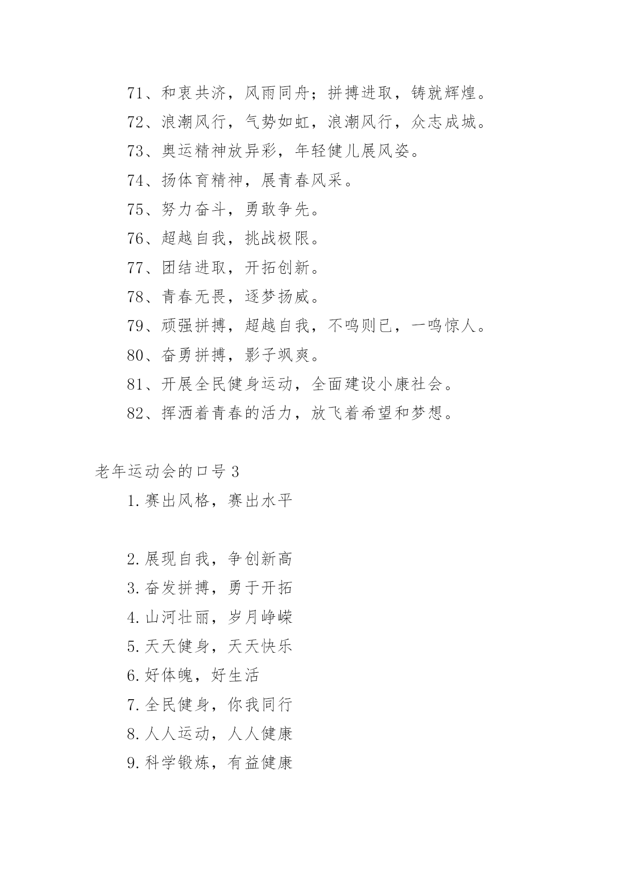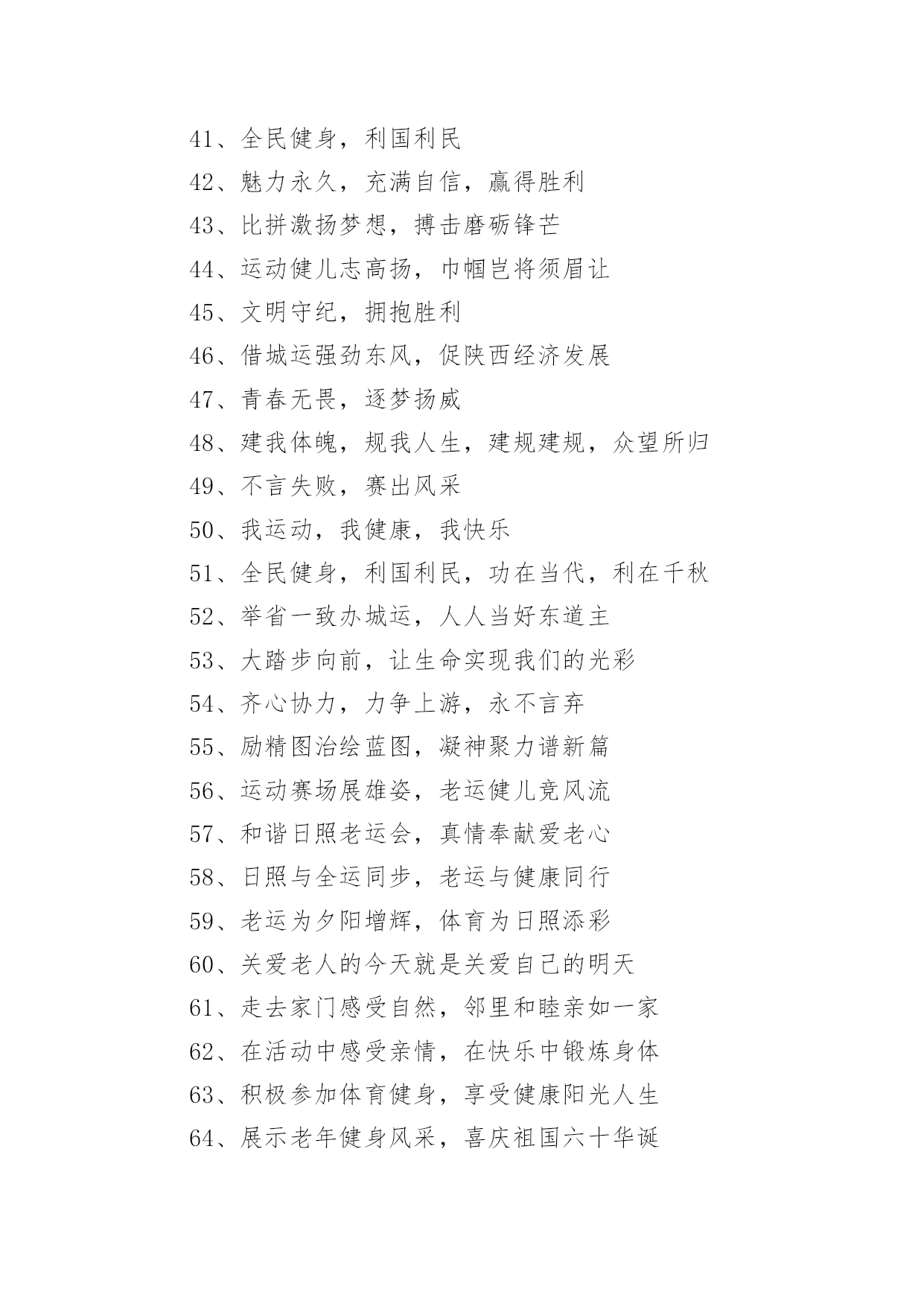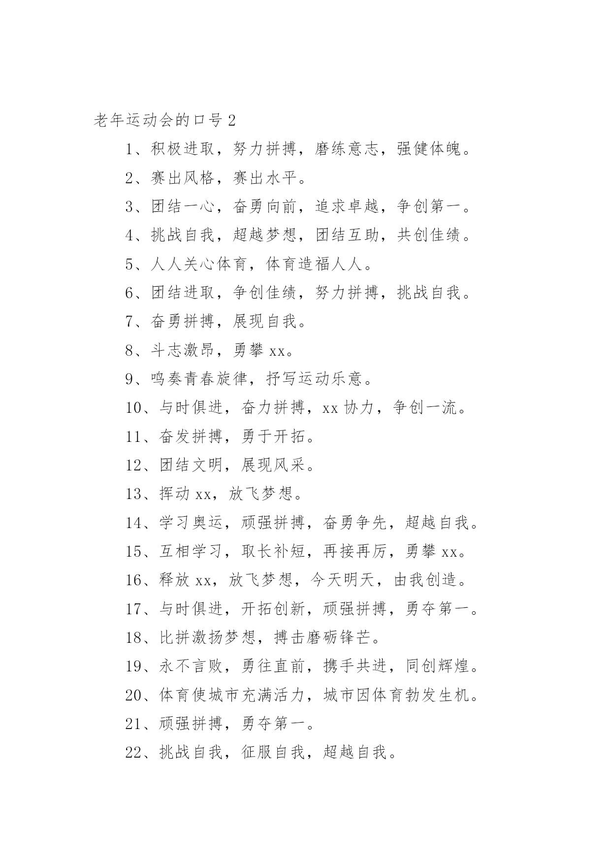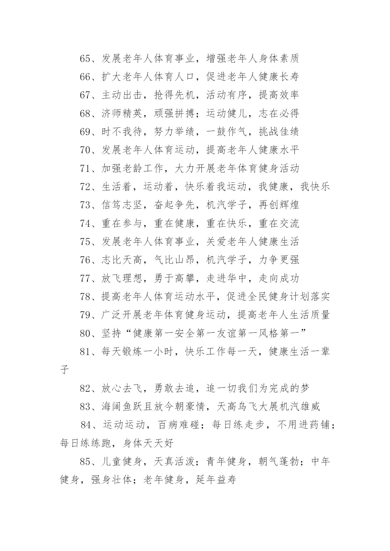 老年运动会的口号在日复一日的学习、工作或生活中,大家都接触过比较经典的口号吧,口号是供口头呼喊的有纲领性和鼓动作用的简短句子。究竟什么样的口号才是好的口号呢?以下是小编为大家收集的老年运动会的口号,希望能够帮助到大家。老年运动会的口号11、赛出风格,赛出水平2、展现自我,争创新高3、奋发拼搏,勇于开拓4、山河壮丽,岁月峥嵘5、天天健身,天天快乐6、好体魄,好生活7、全民健身,你我同行8、人人运动,人人健康9、科学锻炼,有益健康10、保持健康是对自己负责,也是对社会负责11、健康是人生第一财富12、我运动,我青春;快乐健身,精彩人生13、运动牵手健康14、发展体育运动,增强人民体质15、开展全民健身运动,促进两个文明建设16、运动休闲,健康生活;开心运动,健康人生17、崇尚健康运动,珍爱宝贵生命18、弘扬奥运精神,展现人生风采19、健身健心强素质,文明诚信奔小康20、开展体育健身运动,营建健康快乐人生21、快乐健身,想动就动22、健康生活,快乐运动23、传播体育文化,建设精神文明24、体育的盛会,我们的节日25、竞赛勇夺金牌,文明展示风采26、生命在于运动,拼搏在于行动27、活力健康和谐;健身健康健美28、运动是健康之源29、我参与我运动我快乐30、拥抱健康超越自我体验快乐31、我运动我健康我快乐32、体育促进和谐,运动改变生活33、健康第一友谊第一比赛第二34、安全欢乐友谊俭朴35、扬我奥运精神展我老年风采36、遵规守纪,团结互敬37、赛出成绩,安全第一38、天道酬勤,健康起来39、努力奋斗,勇敢争先,40、斗志激昂,勇攀高峰41、全民健身,利国利民42、魅力永久,充满自信,赢得胜利43、比拼激扬梦想,搏击磨砺锋芒44、运动健儿志高扬,巾帼岂将须眉让45、文明守纪,拥抱胜利46、借城运强劲东风,促陕西经济发展47、青春无畏,逐梦扬威48、建我体魄,规我人生,建规建规,众望所归49、不言失败,赛出风采50、我运动,我健康,我快乐51、全民健身,利国利民,功在当代,利在千秋52、举省一致办城运,人人当好东道主53、大踏步向前,让生命实现我们的光彩54、齐心协力,力争上游,永不言弃55、励精图治绘蓝图,凝神聚力谱新篇56、运动赛场展雄姿,老运健儿竞风流57、和谐日照老运会,真情奉献爱老心58、日照与全运同步,老运与健康同行59、老运为夕阳增辉,体育为日照添彩60、关爱老人的今天就是关爱自己的明天61、走去家门感受自然,邻里和睦亲如一家62、在活动中感受亲情,在快乐中锻炼身体63、积极参加体育健身,享受健康阳光人生64、展示老年健身风采,喜庆祖国六十华诞65、发展老年人体育事业,增强老年人身体素质66、扩大老年人体育人口,促进老年人健康长寿67、主动出击,抢得先机,活动有序,提高效率68、济师精英,顽强拼搏;运动健儿,志在必得69、时不我待,努力举绩,一鼓作气,挑战佳绩70、发展老年人体育运动,提高老年人健康水平71、加强老龄工作,大力开展老年体育健身活动72、生活着,运动着,快乐着我运动,我健康,我快乐73、信笃志坚,奋起争先,机汽学子,再创辉煌74、重在参与,重在健康,重在快乐,重在交流75、发展老年人体育事业,关爱老年人健康生活76、志比天高,气比山昂,机汽学子,力争更强77、放飞理想,勇于高攀,走进华中,走向成功78、提高老年人体育运动水平,促进全民健身计划落实79、广泛开展老年体育健身运动,提高老年人生活质量80、坚持“健康第一安全第一友谊第一风格第一”81、每天锻炼一小时,快乐工作每一天,健康生活一辈子82、放心去飞,勇敢去追,追一切我们为完成的梦83、海阔鱼跃且放今朝豪情,天高鸟飞大展机汽雄威84、运动运动,百病难碰;每日练走步,不用进药铺;每日练练跑,身体天天好85、儿童健身,天真活泼;青年健身,朝气蓬勃;中年健身,强身壮体;老年健身,延年益寿老年运动会的口号21、积极进取,努力拼搏,磨练意志,强健体魄。2、赛出风格,赛出水平。3、团结一心,奋勇向前,追求卓越,争创第一。4、挑战自我,超越梦想,团结互助,共创佳绩。5、人人关心体育,体育造福人人。6、团结进取,争创佳绩,努力拼搏,挑战自我。7、奋勇拼搏,展现自我。8、斗志激昂,勇攀xx。9、鸣奏青春旋律,抒写运动乐意。10、与时俱进,奋力拼搏,xx协力,争创一流。11、奋发拼搏,勇于开拓。12、团结文明,展现风采。13、挥动xx,放飞梦想。14、学习奥运,顽强拼搏,奋勇争先,超越自我。15、互相学习,取长补短,再接再厉,勇攀xx。16、释放xx,放飞梦想,今天明天,由我创造。17、与时俱进,开拓创新,顽强拼搏,勇夺第一。18、比拼激扬梦想,搏击磨砺锋芒。19、永不言败,勇往直前,携手共进,同创辉煌。20、体育使城市充满活力,城市因体育勃发生机。21、顽强拼搏,勇夺第