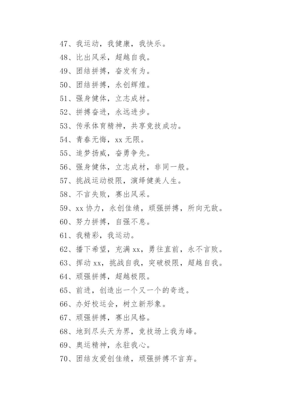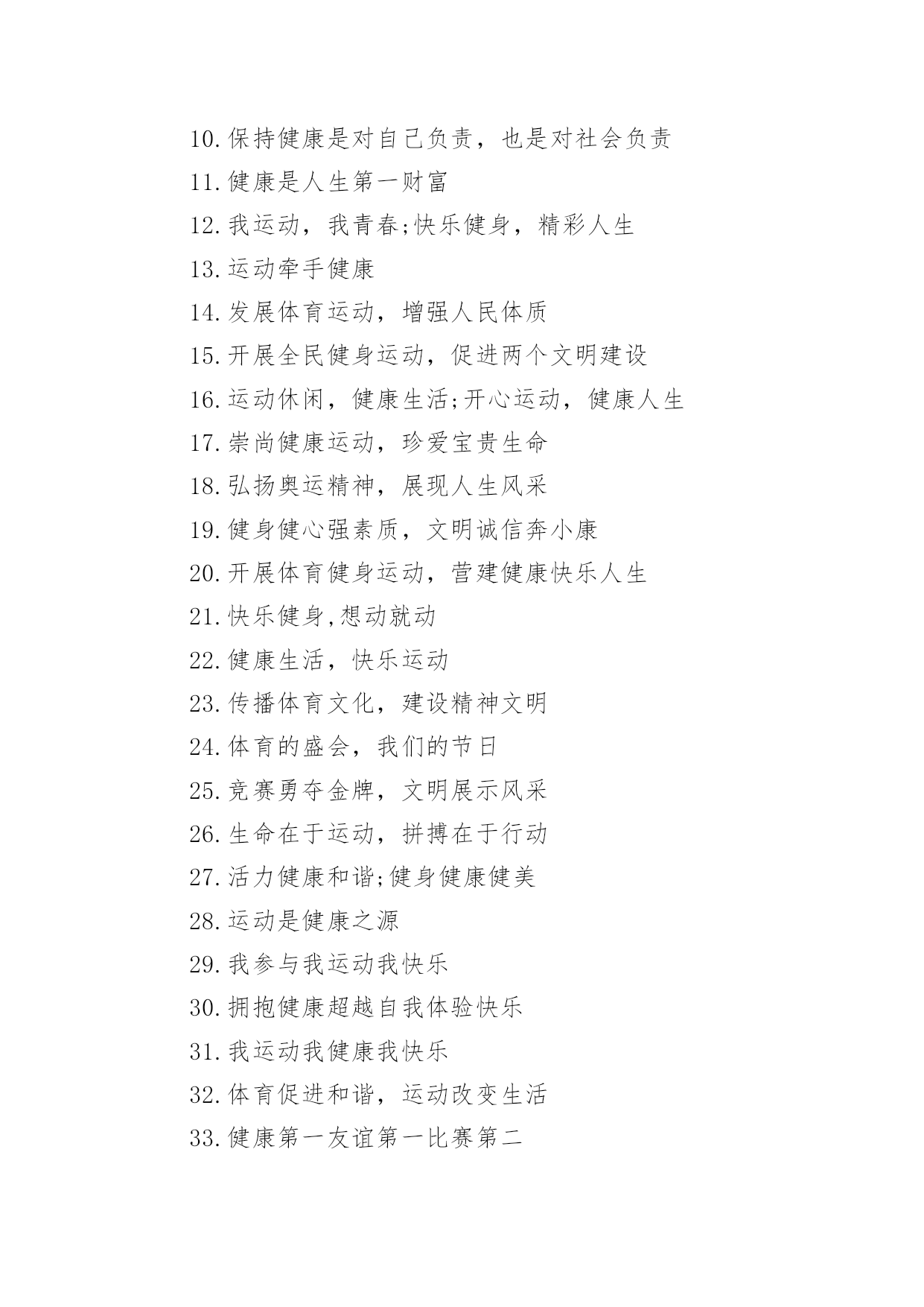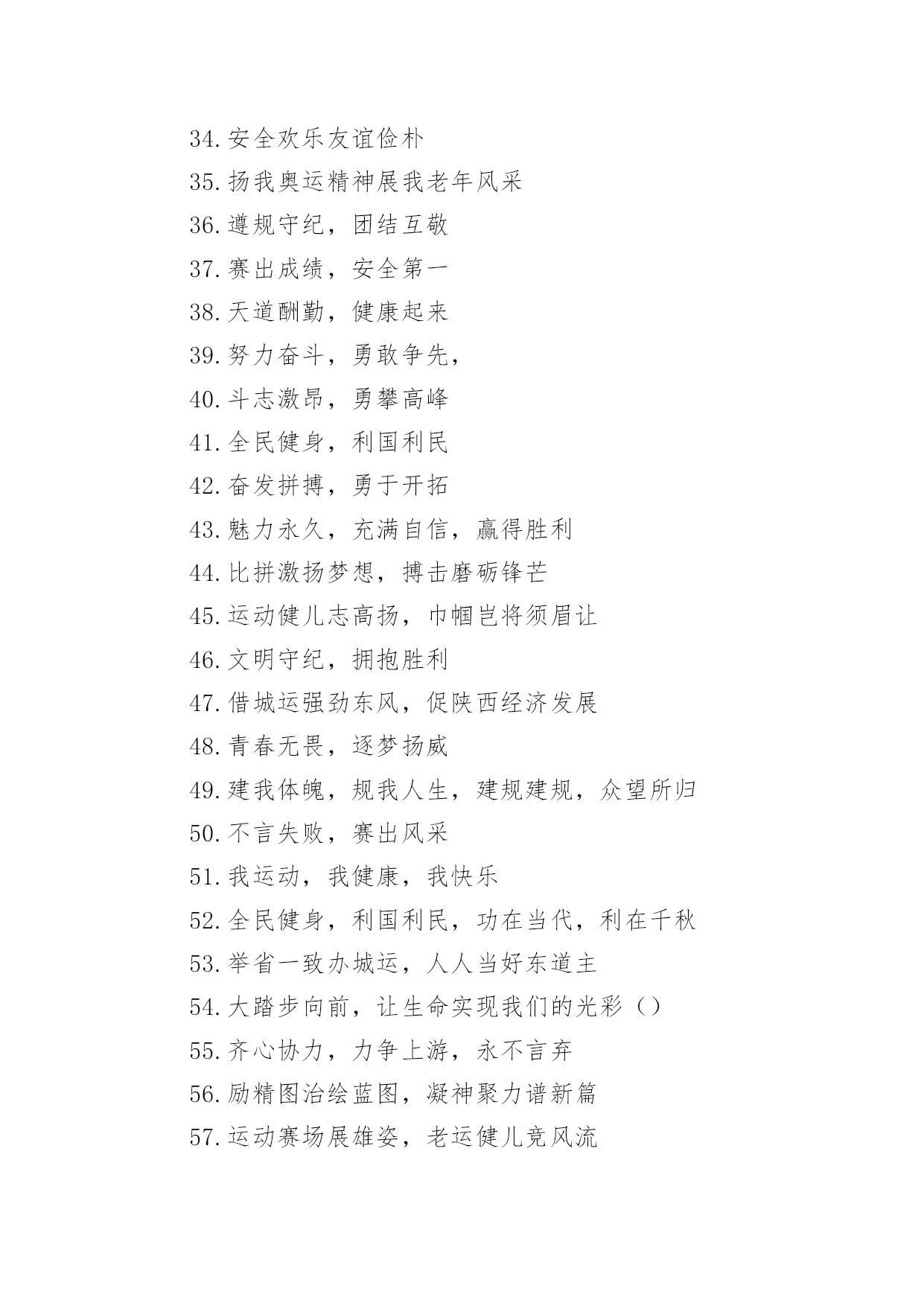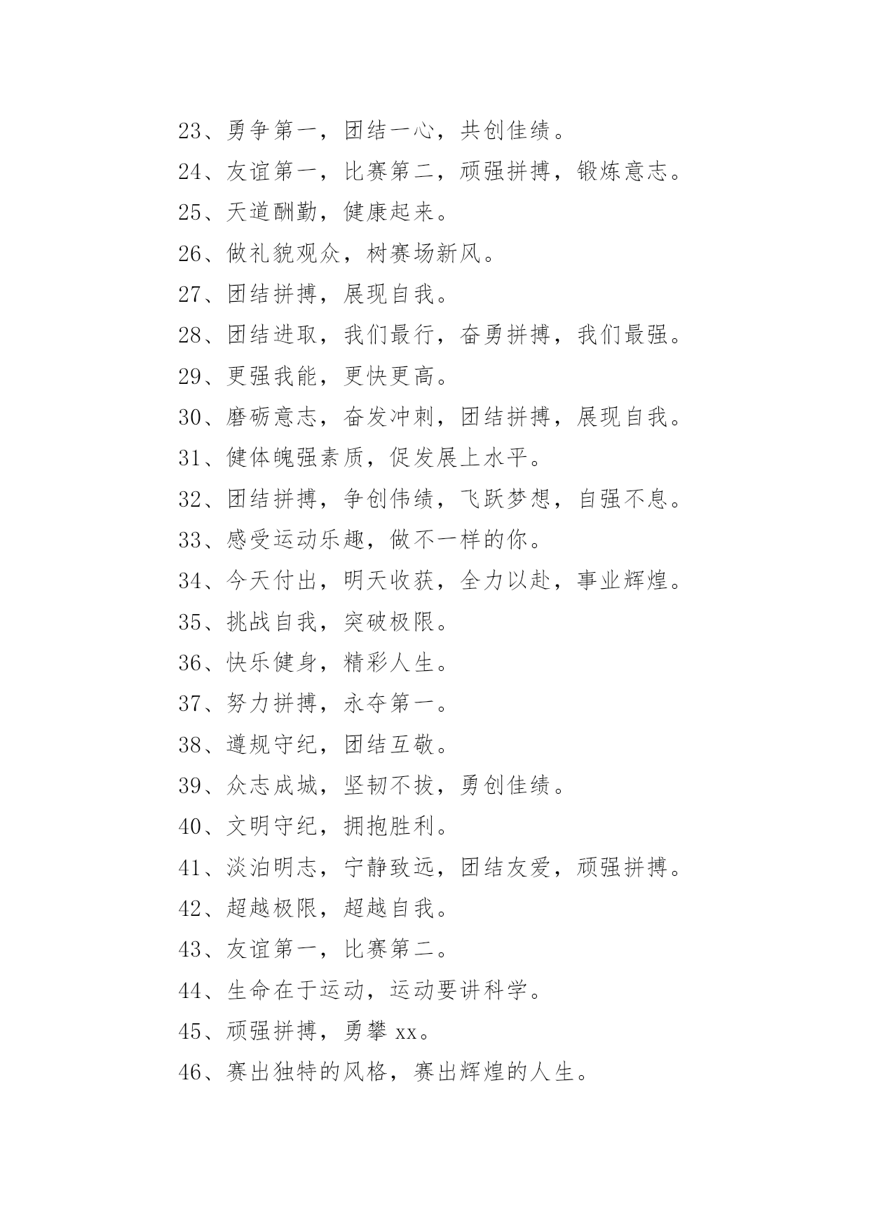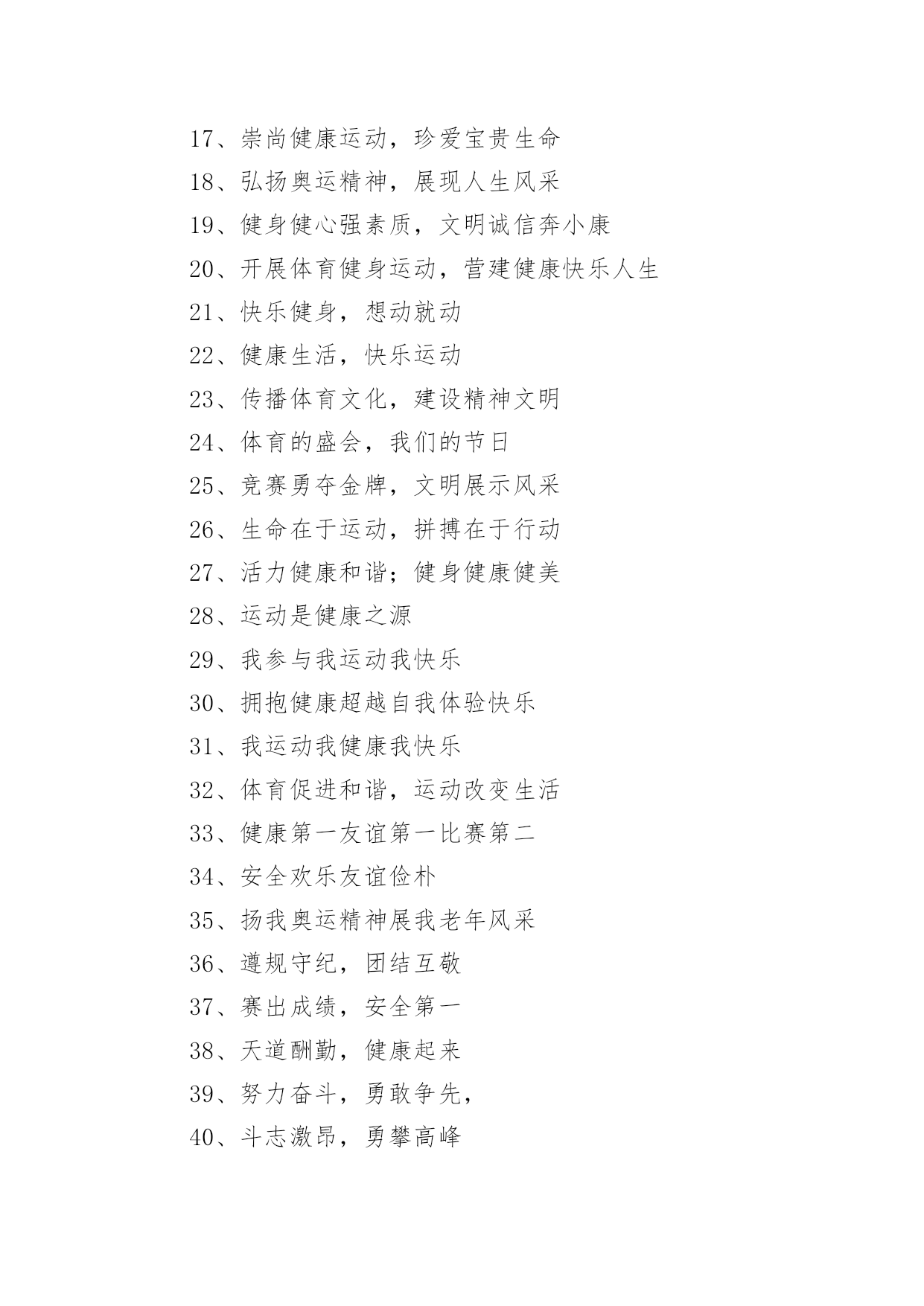 老年运动会的口号在日复一日的学习、工作或生活中,大家都接触过比较经典的口号吧,口号是供口头呼喊的有纲领性和鼓动作用的简短句子。究竟什么样的口号才是好的口号呢?以下是小编为大家收集的老年运动会的口号,希望能够帮助到大家。老年运动会的口号11、赛出风格,赛出水平2、展现自我,争创新高3、奋发拼搏,勇于开拓4、山河壮丽,岁月峥嵘5、天天健身,天天快乐6、好体魄,好生活7、全民健身,你我同行8、人人运动,人人健康9、科学锻炼,有益健康10、保持健康是对自己负责,也是对社会负责11、健康是人生第一财富12、我运动,我青春;快乐健身,精彩人生13、运动牵手健康14、发展体育运动,增强人民体质15、开展全民健身运动,促进两个文明建设16、运动休闲,健康生活;开心运动,健康人生17、崇尚健康运动,珍爱宝贵生命18、弘扬奥运精神,展现人生风采19、健身健心强素质,文明诚信奔小康20、开展体育健身运动,营建健康快乐人生21、快乐健身,想动就动22、健康生活,快乐运动23、传播体育文化,建设精神文明24、体育的盛会,我们的节日25、竞赛勇夺金牌,文明展示风采26、生命在于运动,拼搏在于行动27、活力健康和谐;健身健康健美28、运动是健康之源29、我参与我运动我快乐30、拥抱健康超越自我体验快乐31、我运动我健康我快乐32、体育促进和谐,运动改变生活33、健康第一友谊第一比赛第二34、安全欢乐友谊俭朴35、扬我奥运精神展我老年风采36、遵规守纪,团结互敬37、赛出成绩,安全第一38、天道酬勤,健康起来39、努力奋斗,勇敢争先,40、斗志激昂,勇攀高峰41、全民健身,利国利民42、魅力永久,充满自信,赢得胜利43、比拼激扬梦想,搏击磨砺锋芒44、运动健儿志高扬,巾帼岂将须眉让45、文明守纪,拥抱胜利46、借城运强劲东风,促陕西经济发展47、青春无畏,逐梦扬威48、建我体魄,规我人生,建规建规,众望所归49、不言失败,赛出风采50、我运动,我健康,我快乐51、全民健身,利国利民,功在当代,利在千秋52、举省一致办城运,人人当好东道主53、大踏步向前,让生命实现我们的光彩54、齐心协力,力争上游,永不言弃55、励精图治绘蓝图,凝神聚力谱新篇56、运动赛场展雄姿,老运健儿竞风流57、和谐日照老运会,真情奉献爱老心58、日照与全运同步,老运与健康同行59、老运为夕阳增辉,体育为日照添彩60、关爱老人的今天就是关爱自己的明天61、走去家门感受自然,邻里和睦亲如一家62、在活动中感受亲情,在快乐中锻炼身体63、积极参加体育健身,享受健康阳光人生64、展示老年健身风采,喜庆祖国六十华诞65、发展老年人体育事业,增强老年人身体素质66、扩大老年人体育人口,促进老年人健康长寿67、主动出击,抢得先机,活动有序,提高效率68、济师精英,顽强拼搏;运动健儿,志在必得69、时不我待,努力举绩,一鼓作气,挑战佳绩70、发展老年人体育运动,提高老年人健康水平71、加强老龄工作,大力开展老年体育健身活动72、生活着,运动着,快乐着我运动,我健康,我快乐73、信笃志坚,奋起争先,机汽学子,再创辉煌74、重在参与,重在健康,重在快乐,重在交流75、发展老年人体育事业,关爱老年人健康生活76、志比天高,气比山昂,机汽学子,力争更强77、放飞理想,勇于高攀,走进华中,走向成功78、提高老年人体育运动水平,促进全民健身计划落实79、广泛开展老年体育健身运动,提高老年人生活质量80、坚持“健康第一安全第一友谊第一风格第一”81、每天锻炼一小时,快乐工作每一天,健康生活一辈子82、放心去飞,勇敢去追,追一切我们为完成的梦83、海阔鱼跃且放今朝豪情,天高鸟飞大展机汽雄威84、运动运动,百病难碰;每日练走步,不用进药铺;每日练练跑,身体天天好85、儿童健身,天真活泼;青年健身,朝气蓬勃;中年健身,强身壮体;老年健身,延年益寿老年运动会的口号21、积极进取,努力拼搏,磨练意志,强健体魄。2、赛出风格,赛出水平。3、团结一心,奋勇向前,追求卓越,争创第一。4、挑战自我,超越梦想,团结互助,共创佳绩。5、人人关心体育,体育造福人人。6、团结进取,争创佳绩,努力拼搏,挑战自我。7、奋勇拼搏,展现自我。8、斗志激昂,勇攀xx。9、鸣奏青春旋律,抒写运动乐意。10、与时俱进,奋力拼搏,xx协力,争创一流。11、奋发拼搏,勇于开拓。12、团结文明,展现风采。13、挥动xx,放飞梦想。14、学习奥运,顽强拼搏,奋勇争先,超越自我。15、互相学习,取长补短,再接再厉,勇攀xx。16、释放xx,放飞梦想,今天明天,由我创造。17、与时俱进,开拓创新,顽强拼搏,勇夺第一。18、比拼激扬梦想,搏击磨砺锋芒。19、永不言败,勇往直前,携手共进,同创辉煌。20、体育使城市充满活力,城市因体育勃发生机。21、顽强拼搏,勇夺第