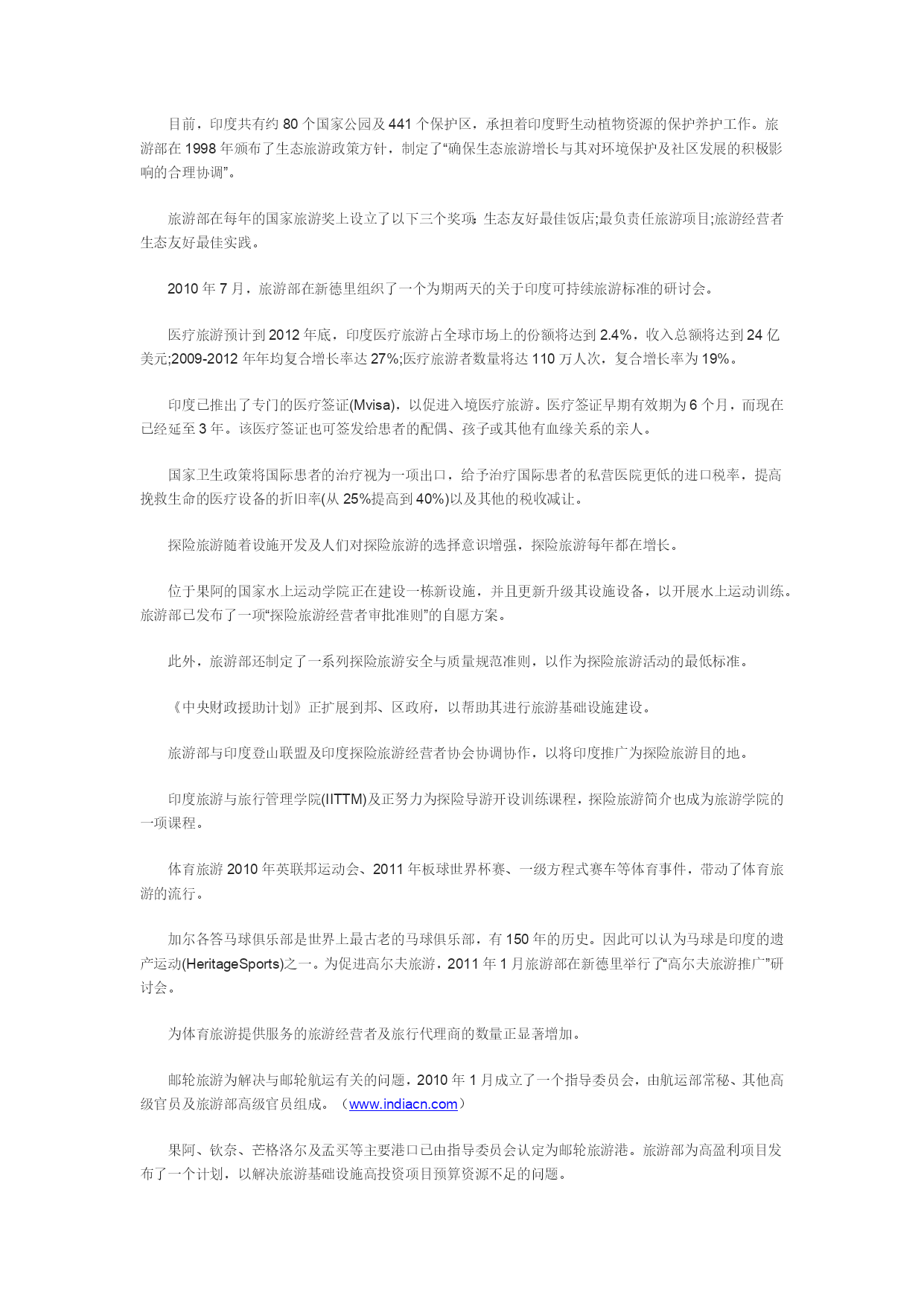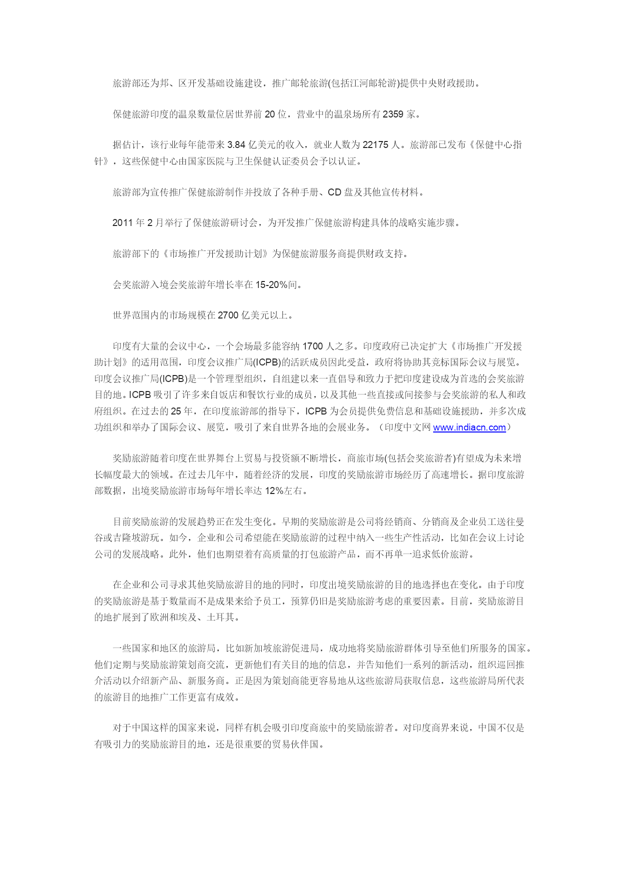 旅游业是印度经济中最为重要的产业部门之一。2011年,印度旅游业总收入达到830亿美元,预计2021年将增至1910亿美元。作为印度最大的服务产业,旅游业对国家GDP的贡献率达6%左右,并提供了3000多万个就业岗位。早在1945年,印度即着手发展旅游业。如今旅游业已被视作促进社会融合与经济发展的重要产业。印度于1982年颁布了《国家旅游政策》;1988年全国旅游委员会制定了一项旨在实现旅游业可持续发展的全面计划;1992年出台了《国家行动计划》;1996年起草了《旅游推广国家战略》。1997年提出的《新旅游政策》明确了中央和地方政府、公共事业部门及私营企业在旅游业发展中的不同角色。2002年《国家旅游政策》认为,旅游业作为经济增长的主要引擎,能以环境意义上可持续发展的方式在增加就业与消除贫困上发挥直接或乘数效应。印度政府对发展旅游业的协力支持和积极政策使得印度在世界旅游版图上备受关注。据世界旅行与旅游理事会(WTTC)预测,印度将成为一个旅游热点,并将享有持续10年的增长潜力。印度旅游业在长期增长(10年)排行榜中名列世界第五,而2020年其从业人员规模预计将名列世界第二。可以断定,今后印度旅游业在创造就业机会、增加外汇收入、促进经济发展方面将继续发挥举足轻重的作用。未来较长一个时期内,旅游业的重要地位将愈益稳固。乡村旅游及其开发与推广2002年《国家旅游政策》认为,乡村旅游是国家可持续旅游业的基础;全球旅游业增长依赖于国内旅游,而国内旅游的焦点是乡村目的地;进一步说,各国旅游者对印度乡村非物质文化及美食的兴趣与日俱增,在鼓励国际旅游者赴乡村地区旅游方面大有文章可做。开发计划为发展乡村旅游,该政策特别关注乡村地区的交通网建设。公路、铁路、水路将文化资源丰富的乡村旅游目的地连为一体,该政策充分认识到发展这些交通媒介的重要性,并强调开发整体化旅游线路。为此,该政策要求各邦(区)开发整体性旅游线路,最终在相关区域打造出世界一流的旅游基础设施。铁路在发展乡村旅游、国内旅游方面拥有巨大的潜力。“车轮上的宫殿”的空前成功就是一个很好的佐证。不论是对于国内旅游者还是国际旅游者,铁路都以其低廉的价格让人们体验到印度的独特民族风情。鉴此,铁路系统采取了促进旅游业发展的一系列措施:在现有运营路线引入旅游专列,并允许私营部门参与。这些列车车厢归私营实体企业所有,由其负责产品的设计、开发、管理与营销。为增强其资金实力,吸引私人投资,私营部门可对这些车厢采取加速折旧措施。为节省旅行成本,同时推广乡村旅游目的地,印度铁路系统着手建设面向特定游客中心的100家铁路饭店,同时鼓励私营部门长期经营这些饭店。比如那些遗产铁路饭店——印度铁路系统拥有很多遗产建筑,它们也会以遗产饭店的名义加以推广,比如勒克瑙火车站与孟买的教堂之门车站。同时,政府正尽力开发山地铁路的旅游潜力,比如大吉岭、尼尔吉里、马特兰、坎格拉、西姆拉的山地铁路,它们已列入联合国教科文组织(UNESCO)世界遗产名录。此外,为促进国内旅游发展,在“拉达尼”与“沙达比”等快速列车上策划更多的具有特色的旅游产品。除公路与铁路外,印度长达7000公里的海岸线也正逐渐开发为国内旅游线。印度的邮轮运营商已开发了一条由孟买、果阿、拉克沙、科钦、科伦坡与马尔代夫组成的旅游线。推广方法乡村旅游与国内旅游推广表现出较强的竞争力。目前,国家政策确定并投入实践的推广手段有:开发竞争对手所不可能拥有的全国或邦(区)推广品牌,如“不可思议的印度(IncredibleIndia)”(印度旅游部)、“不可思议的印度之心(HeartofIncredibleIndia)”(中央邦旅游部)等品牌。旅游推广措施还包括针对目标客源市场采取广泛的质量性、数量性市场调研手段。在各邦(区)与私营部门的参与下,落实成本-效益型市场推广项目。实施以城市、国际客源场为目标的乡村旅游项目具有特殊意义。推广工作还通过在客源市场的旅游贸易中建立有效且持续的市场代理的方式进行。开发建设使用当地语言的门户网站,并提供一系列供应商链接,也已成为旅游宣传推广的策略之一。为了展现乡村生活,旅游部在2002-2003年间开始了乡村旅游推广计划。计划的目标在于展现乡村地区的生活、艺术、文化与遗产,并通过工艺品、手摇纺织机及纺织品来表现出核心竞争力——这些都是自然环境中的物资基础。推广乡村旅游的目的还在于通过游客来访,增加当地社区村民的收入,从而控制农村人口向城市地区迁移。该计划由两部分组成:硬件与软件。硬件指基础设施建设,软件指能力建设。乡村旅游工程(RTPS)的硬件部分由“目的地与线路产品/基础设施建设开发”(PIDDC)项目计划提供资金;软件部分已从印度联邦政府和联合国开发计划署的内源性项目计划中得到资助。2011年2月28