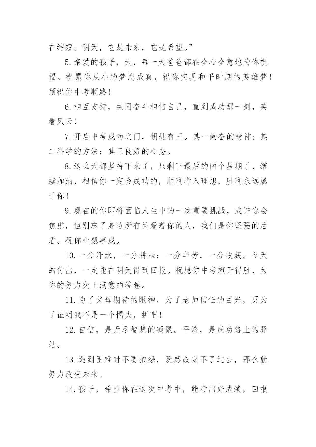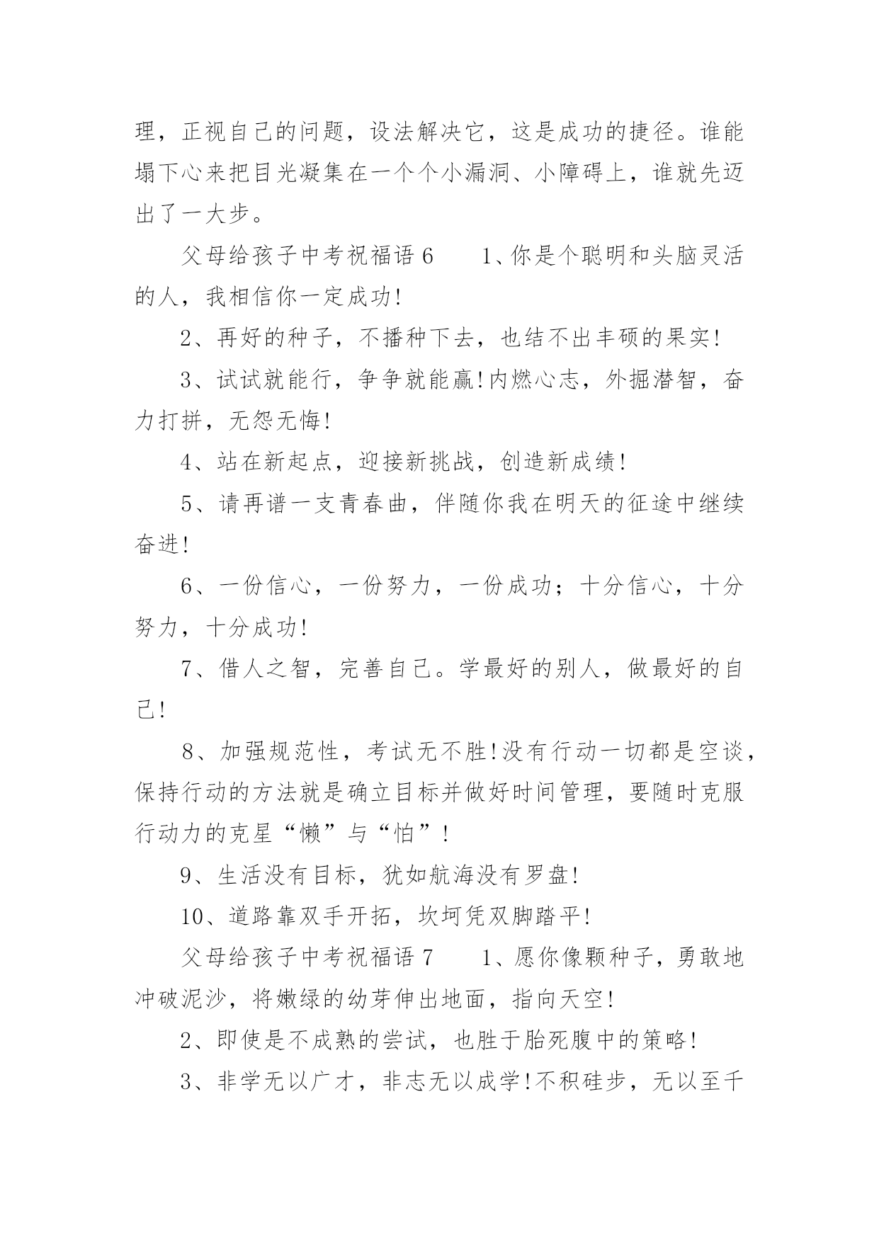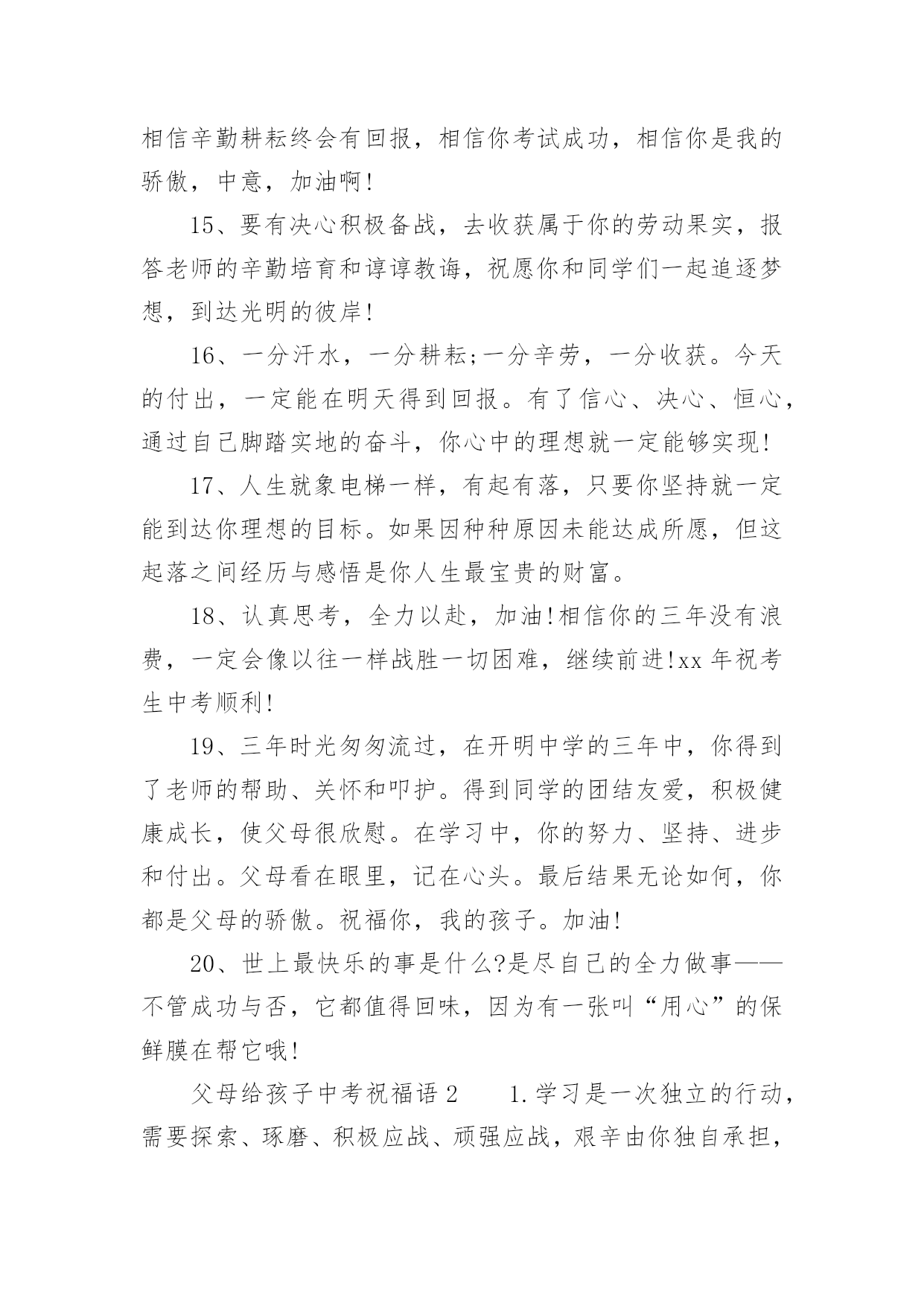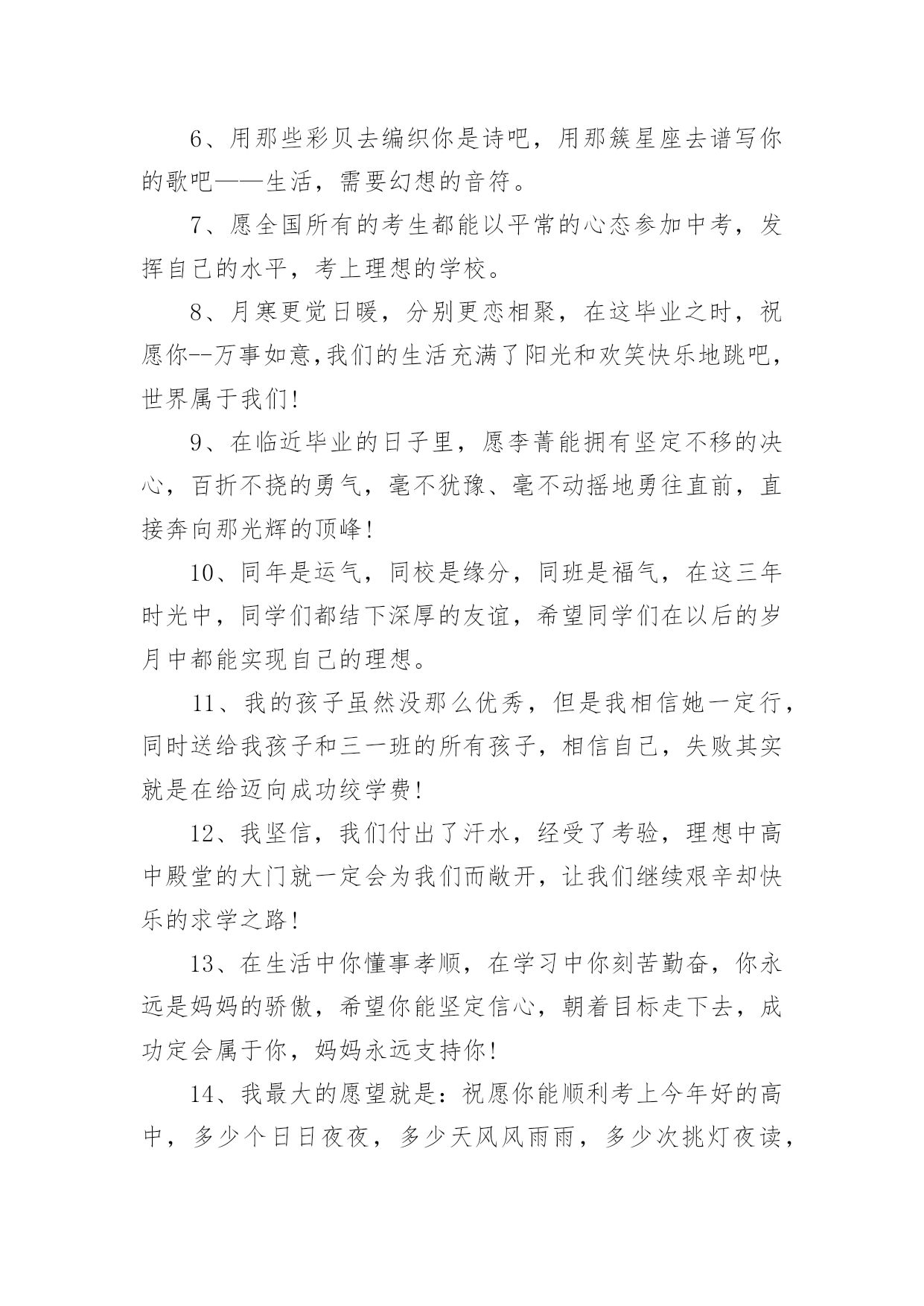父母给孩子中考祝福语父母给孩子中考祝福语在学习、工作或生活中,大家都用到过祝福语吧,祝福语是人们用语言文字表情达意的言语活动。你所知道的祝福语是都是什么样子的?以下是小编收集整理的父母给孩子中考祝福语,仅供参考,希望能够帮助到大家。父母给孩子中考祝福语11、就要考试了,用一颗平常心去轻松面对,相信自己,就是胜利。女儿加油!爸爸永远支持你!相信你!祝福你!谢谢朱老师这三年对孩子的教育和帮助!祝您心想事成!万事如意!全家幸福!2、开明岁月,青春飞扬!愿陈心妍牢记老师的辛勤教诲,常思同学的深厚情谊,在人生的道路上越飞越高!3、这么天都坚持下来了,只剩下最后的两个星期了,继续加油,相信你一定会成功的,顺利考入理想,胜利永远属于你!4、在这次考试中,就像对待平时月考一样,保持平常心,有一个好的心态。相信自己,一定会成功!最后对盈盈说一句,相信自己,你是最棒的!5、一年一次的人生大迈步又要到来了,只有迈出这一步人生才算是一个新的开始,相信你一定会比别人走的更远;跑的更快;考得更好。累了要注意休息,身体才是革命的本钱。最后祝你:门门功课好成绩。6、用那些彩贝去编织你是诗吧,用那簇星座去谱写你的歌吧——生活,需要幻想的音符。7、愿全国所有的考生都能以平常的心态参加中考,发挥自己的水平,考上理想的学校。8、月寒更觉日暖,分别更恋相聚,在这毕业之时,祝愿你--万事如意,我们的生活充满了阳光和欢笑快乐地跳吧,世界属于我们!9、在临近毕业的日子里,愿李菁能拥有坚定不移的决心,百折不挠的勇气,毫不犹豫、毫不动摇地勇往直前,直接奔向那光辉的顶峰!10、同年是运气,同校是缘分,同班是福气,在这三年时光中,同学们都结下深厚的友谊,希望同学们在以后的岁月中都能实现自己的理想。11、我的孩子虽然没那么优秀,但是我相信她一定行,同时送给我孩子和三一班的所有孩子,相信自己,失败其实就是在给迈向成功绞学费!12、我坚信,我们付出了汗水,经受了考验,理想中高中殿堂的大门就一定会为我们而敞开,让我们继续艰辛却快乐的求学之路!13、在生活中你懂事孝顺,在学习中你刻苦勤奋,你永远是妈妈的骄傲,希望你能坚定信心,朝着目标走下去,成功定会属于你,妈妈永远支持你!14、我最大的愿望就是:祝愿你能顺利考上今年好的高中,多少个日日夜夜,多少天风风雨雨,多少次挑灯夜读,相信辛勤耕耘终会有回报,相信你考试成功,相信你是我的骄傲,中意,加油啊!15、要有决心积极备战,去收获属于你的劳动果实,报答老师的辛勤培育和谆谆教诲,祝愿你和同学们一起追逐梦想,到达光明的彼岸!16、一分汗水,一分耕耘;一分辛劳,一分收获。今天的付出,一定能在明天得到回报。有了信心、决心、恒心,通过自己脚踏实地的奋斗,你心中的理想就一定能够实现!17、人生就象电梯一样,有起有落,只要你坚持就一定能到达你理想的目标。如果因种种原因未能达成所愿,但这起落之间经历与感悟是你人生最宝贵的财富。18、认真思考,全力以赴,加油!相信你的三年没有浪费,一定会像以往一样战胜一切困难,继续前进!xx年祝考生中考顺利!19、三年时光匆匆流过,在开明中学的三年中,你得到了老师的帮助、关怀和叩护。得到同学的团结友爱,积极健康成长,使父母很欣慰。在学习中,你的努力、坚持、进步和付出。父母看在眼里,记在心头。最后结果无论如何,你都是父母的骄傲。祝福你,我的孩子。加油!20、世上最快乐的事是什么?是尽自己的全力做事——不管成功与否,它都值得回味,因为有一张叫“用心”的保鲜膜在帮它哦!父母给孩子中考祝福语21.学习是一次独立的行动,需要探索、琢磨、积极应战、顽强应战,艰辛由你独自承担,胜利由你独立争取。2.十二年苦读,十二年付出,十二年挥洒自如,十二年寒窗无数。睡个好觉,做个好梦,让信心更加充足,你一定会取得锦绣前途。3.“雄关漫道真如铁,而今迈步从头越。从头越,苍山如海,残阳如血。”无论落榜生还是状元,都让我们继续努力吧。4.不必每分钟都学习,但求学习中每分钟都有收获。5.一直相信,你是最棒的!展开你隐形的翅膀高飞吧!6.成功不是将来才有的,而是从决定去做的那一刻起,持续累积而成。7.相互支持,共同奋斗:相信自己,直到成功那一刻,笑看风云!8.中考是一个实现人生梦想的省力杠杆,此时是你撬动它的最佳时机,加油吧,以后你的人生将会呈弧线上升。9.路始终要走不必回头都是天空下的孩子都是四季绽放的花儿风雨中都是一张张美丽的脸愿你的双眸在我深处停留你是我朋友的明珠是我的姐妹的骄傲……10.有人说:“人人都可以成为自己的幸运的建筑师。”愿我们在走向生活的道路上,用自己的双手建造幸运的大厦。11.从五湖四海来,到天南地北去。不管走到哪里,不管在什么岗位,让我们继续填写好人生的履历表,交出事业的优秀答卷,为母校的旗帜增辉添彩。12.当人生面对许多选择的时候,我们需