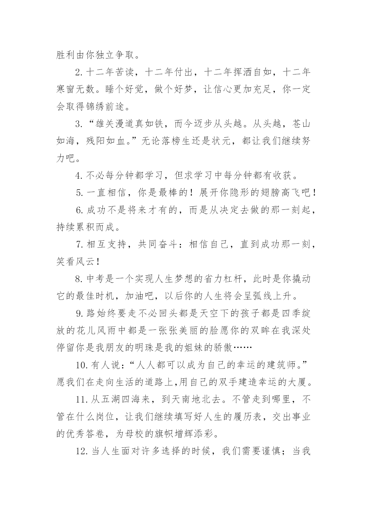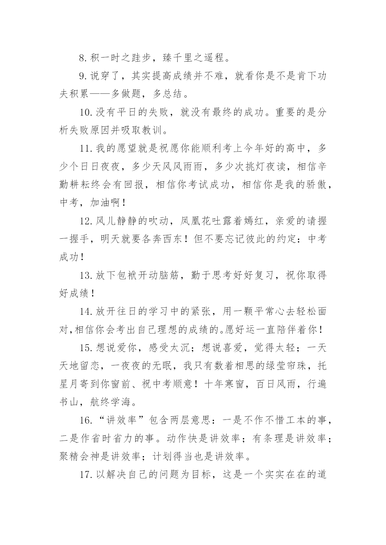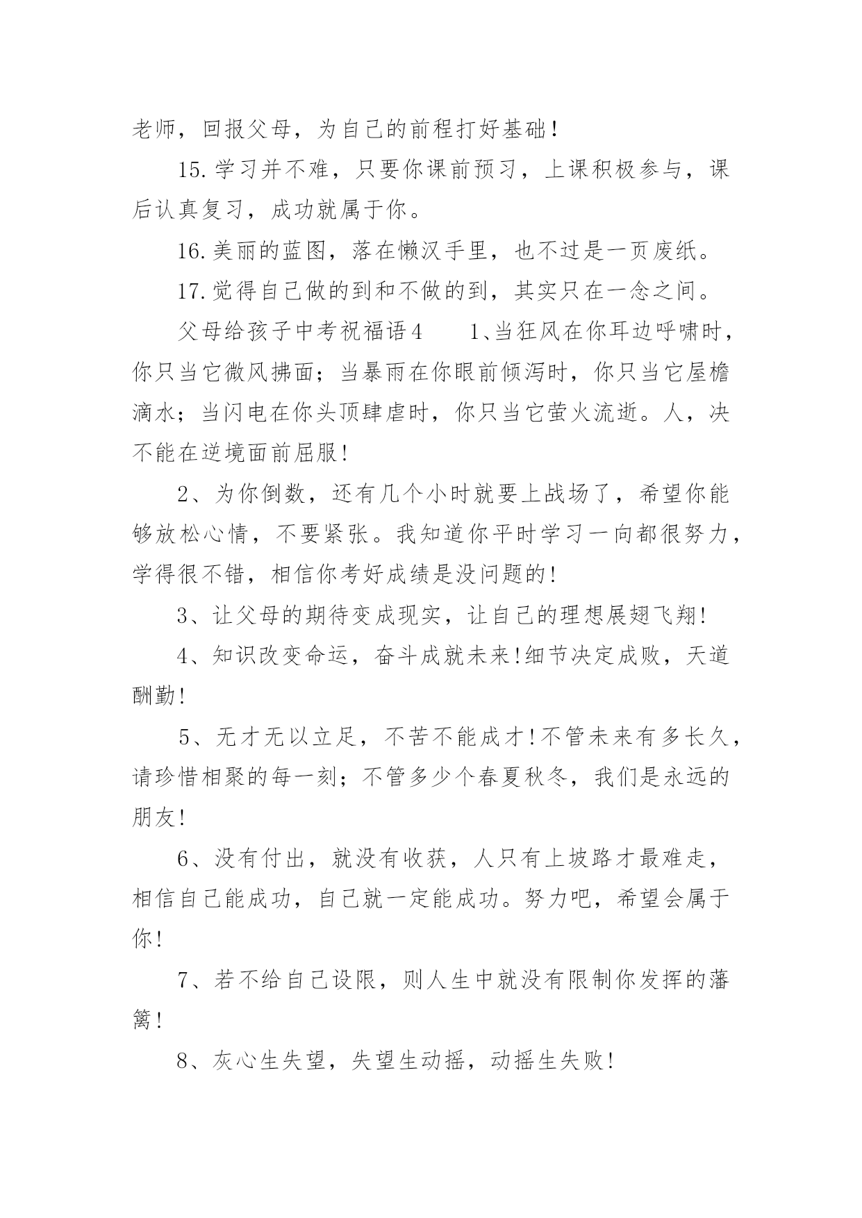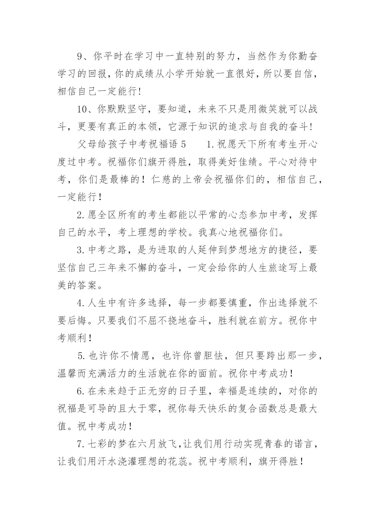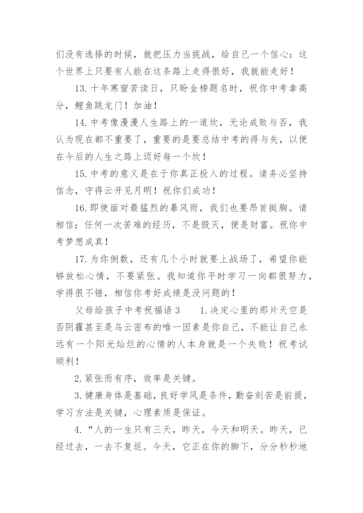 父母给孩子中考祝福语父母给孩子中考祝福语在学习、工作或生活中,大家都用到过祝福语吧,祝福语是人们用语言文字表情达意的言语活动。你所知道的祝福语是都是什么样子的?以下是小编收集整理的父母给孩子中考祝福语,仅供参考,希望能够帮助到大家。父母给孩子中考祝福语11、就要考试了,用一颗平常心去轻松面对,相信自己,就是胜利。女儿加油!爸爸永远支持你!相信你!祝福你!谢谢朱老师这三年对孩子的教育和帮助!祝您心想事成!万事如意!全家幸福!2、开明岁月,青春飞扬!愿陈心妍牢记老师的辛勤教诲,常思同学的深厚情谊,在人生的道路上越飞越高!3、这么天都坚持下来了,只剩下最后的两个星期了,继续加油,相信你一定会成功的,顺利考入理想,胜利永远属于你!4、在这次考试中,就像对待平时月考一样,保持平常心,有一个好的心态。相信自己,一定会成功!最后对盈盈说一句,相信自己,你是最棒的!5、一年一次的人生大迈步又要到来了,只有迈出这一步人生才算是一个新的开始,相信你一定会比别人走的更远;跑的更快;考得更好。累了要注意休息,身体才是革命的本钱。最后祝你:门门功课好成绩。6、用那些彩贝去编织你是诗吧,用那簇星座去谱写你的歌吧——生活,需要幻想的音符。7、愿全国所有的考生都能以平常的心态参加中考,发挥自己的水平,考上理想的学校。8、月寒更觉日暖,分别更恋相聚,在这毕业之时,祝愿你--万事如意,我们的生活充满了阳光和欢笑快乐地跳吧,世界属于我们!9、在临近毕业的日子里,愿李菁能拥有坚定不移的决心,百折不挠的勇气,毫不犹豫、毫不动摇地勇往直前,直接奔向那光辉的顶峰!10、同年是运气,同校是缘分,同班是福气,在这三年时光中,同学们都结下深厚的友谊,希望同学们在以后的岁月中都能实现自己的理想。11、我的孩子虽然没那么优秀,但是我相信她一定行,同时送给我孩子和三一班的所有孩子,相信自己,失败其实就是在给迈向成功绞学费!12、我坚信,我们付出了汗水,经受了考验,理想中高中殿堂的大门就一定会为我们而敞开,让我们继续艰辛却快乐的求学之路!13、在生活中你懂事孝顺,在学习中你刻苦勤奋,你永远是妈妈的骄傲,希望你能坚定信心,朝着目标走下去,成功定会属于你,妈妈永远支持你!14、我最大的愿望就是:祝愿你能顺利考上今年好的高中,多少个日日夜夜,多少天风风雨雨,多少次挑灯夜读,相信辛勤耕耘终会有回报,相信你考试成功,相信你是我的骄傲,中意,加油啊!15、要有决心积极备战,去收获属于你的劳动果实,报答老师的辛勤培育和谆谆教诲,祝愿你和同学们一起追逐梦想,到达光明的彼岸!16、一分汗水,一分耕耘;一分辛劳,一分收获。今天的付出,一定能在明天得到回报。有了信心、决心、恒心,通过自己脚踏实地的奋斗,你心中的理想就一定能够实现!17、人生就象电梯一样,有起有落,只要你坚持就一定能到达你理想的目标。如果因种种原因未能达成所愿,但这起落之间经历与感悟是你人生最宝贵的财富。18、认真思考,全力以赴,加油!相信你的三年没有浪费,一定会像以往一样战胜一切困难,继续前进!xx年祝考生中考顺利!19、三年时光匆匆流过,在开明中学的三年中,你得到了老师的帮助、关怀和叩护。得到同学的团结友爱,积极健康成长,使父母很欣慰。在学习中,你的努力、坚持、进步和付出。父母看在眼里,记在心头。最后结果无论如何,你都是父母的骄傲。祝福你,我的孩子。加油!20、世上最快乐的事是什么?是尽自己的全力做事——不管成功与否,它都值得回味,因为有一张叫“用心”的保鲜膜在帮它哦!父母给孩子中考祝福语21.学习是一次独立的行动,需要探索、琢磨、积极应战、顽强应战,艰辛由你独自承担,胜利由你独立争取。2.十二年苦读,十二年付出,十二年挥洒自如,十二年寒窗无数。睡个好觉,做个好梦,让信心更加充足,你一定会取得锦绣前途。3.“雄关漫道真如铁,而今迈步从头越。从头越,苍山如海,残阳如血。”无论落榜生还是状元,都让我们继续努力吧。4.不必每分钟都学习,但求学习中每分钟都有收获。5.一直相信,你是最棒的!展开你隐形的翅膀高飞吧!6.成功不是将来才有的,而是从决定去做的那一刻起,持续累积而成。7.相互支持,共同奋斗:相信自己,直到成功那一刻,笑看风云!8.中考是一个实现人生梦想的省力杠杆,此时是你撬动它的最佳时机,加油吧,以后你的人生将会呈弧线上升。9.路始终要走不必回头都是天空下的孩子都是四季绽放的花儿风雨中都是一张张美丽的脸愿你的双眸在我深处停留你是我朋友的明珠是我的姐妹的骄傲……10.有人说:“人人都可以成为自己的幸运的建筑师。”愿我们在走向生活的道路上,用自己的双手建造幸运的大厦。11.从五湖四海来,到天南地北去。不管走到哪里,不管在什么岗位,让我们继续填写好人生的履历表,交出事业的优秀答卷,为母校的旗帜增辉添彩。12.当人生面对许多选择的时候,我们需