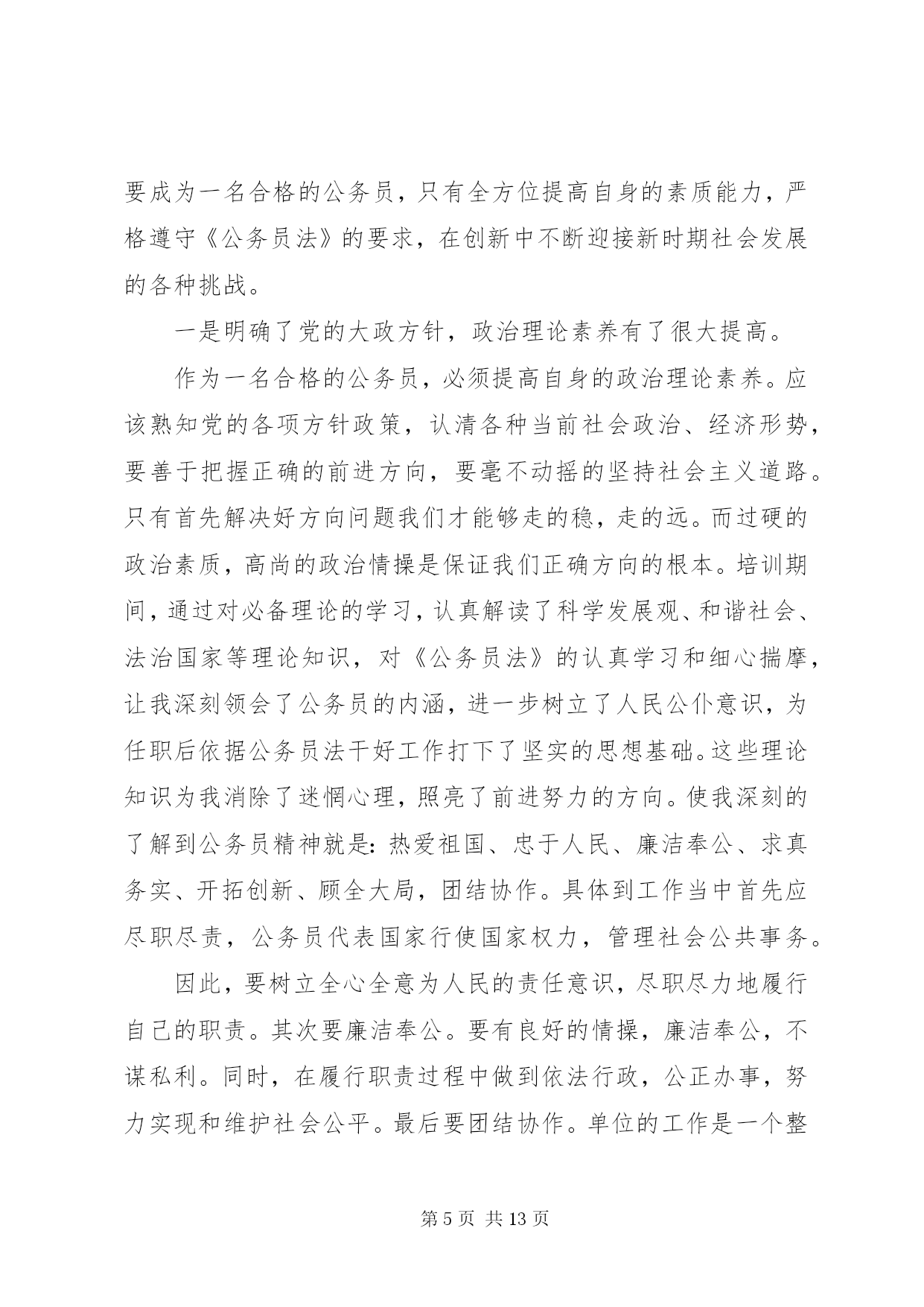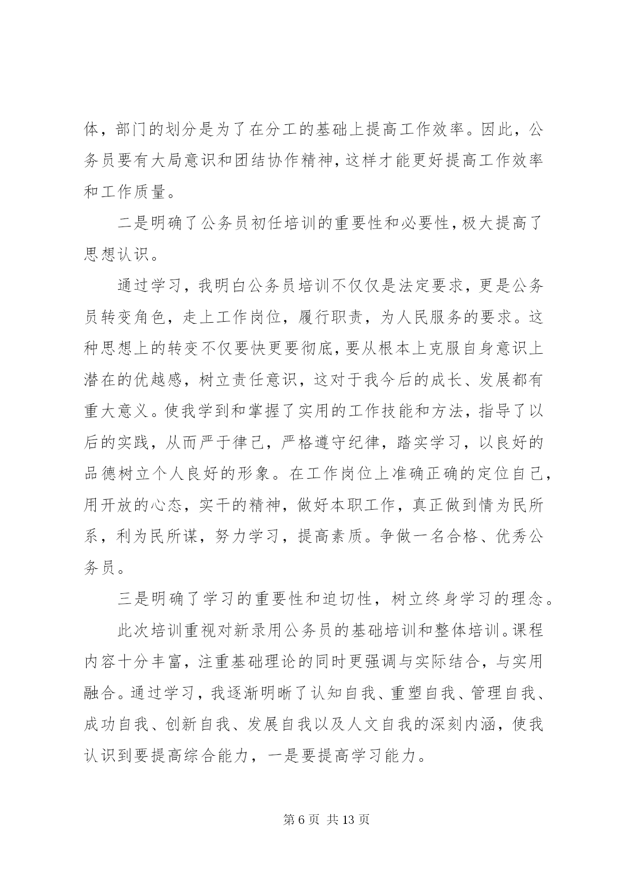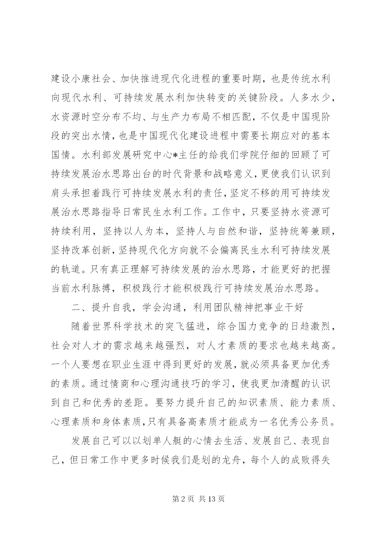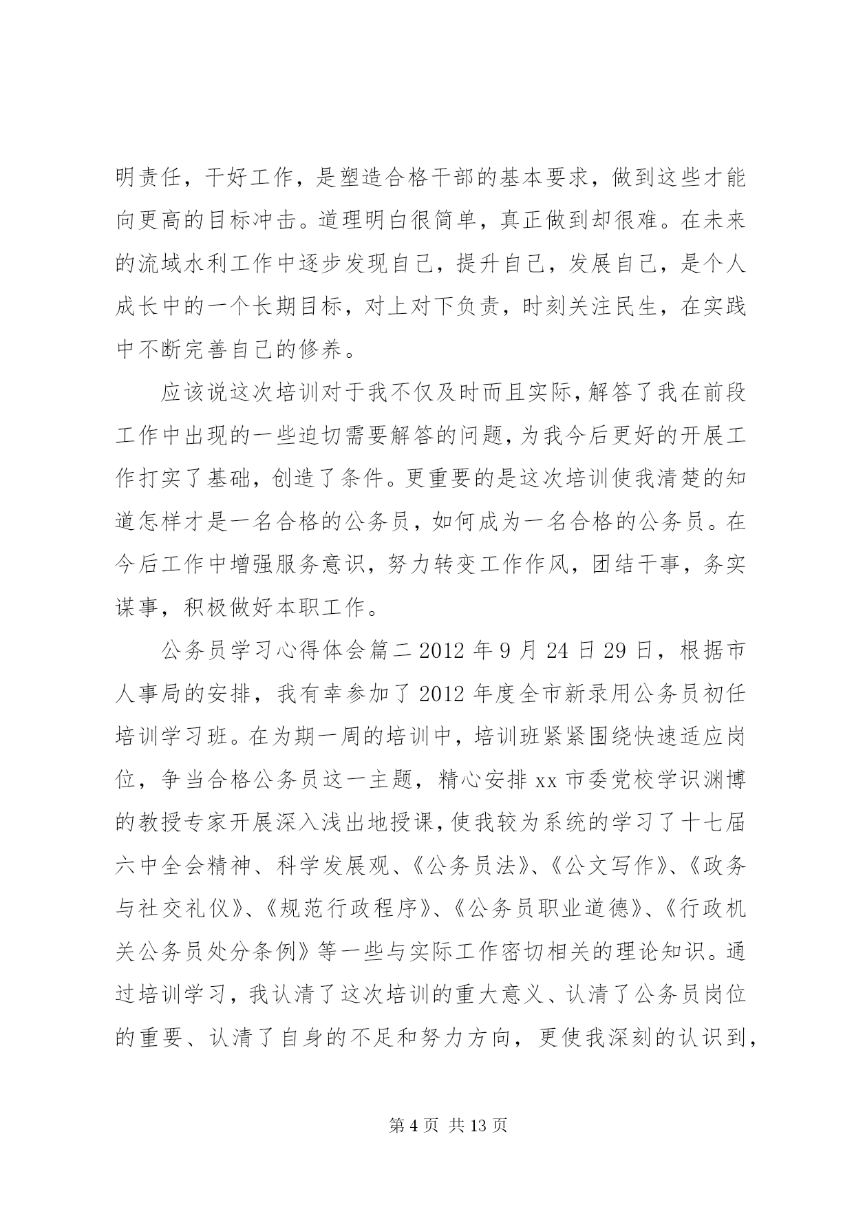 第PAGE\*Arabic\*MERGEFORMAT13页共NUMPAGES\*MERGEFORMAT13页最新公务员学习心得体会公务员学习心得体会篇一2015年7月15日,我参加了水利部青年公务员知识更新培训班。七天的时间,我们和来自水利部办公厅秘书处、水资源管理司、防办等各司局以及长江委、黄河委、淮委、海委、松辽委等各流域机构的学员一起系统的学习了《社会调查及调查研究报告撰写》、《中国水资源管理》、《保密工作基础知识》、《水利公文写作》、《水利法制建设》、《干部成长规律研究》、《对当前水利形势的认识》、《如何提高执行力》、《心理调试和沟通技巧》共9门课程。学习过程中,我认真听课,认真笔记,认真思考,圆满完成了各项学习任务。通过学习,系统的梳理了一名水利公务员必备的知识,进一步提高了政治修养,强化了理论素质,更重要的是发觉了自己的缺点和不足,对未来如何做一名合格的公务员,打下了坚实的基础。下面谈几点个人体会:一、把握当前水利脉搏,积极践行可持续发展治水思路作为一名水利系统公务员,最重要的是依法治水,依法管水,依法兴水,所以,对国家的治水政策及可持续发展治水思路的把握应该是很重要的一项基本要求。陈雷部长讲话指出水是基础性的自然资源和战略性的经济资源,是生态与环境的控制性要素。以水资源的可持续利用保障经济社会的可持续发展,是世界各国面临的共同挑战和紧迫任务。当前和今后一个时期,是中国全面建设小康社会、加快推进现代化进程的重要时期,也是传统水利向现代水利、可持续发展水利加快转变的关键阶段。人多水少,水资源时空分布不均、与生产力布局不相匹配,不仅是中国现阶段的突出水情,也是中国现代化建设进程中需要长期应对的基本国情。水利部发展研究中心*主任的给我们学院仔细的回顾了可持续发展治水思路出台的时代背景和战略意义,更使我们认识到肩头承担着践行可持续发展水利的责任,坚定不移的用可持续发展治水思路指导日常民生水利工作。工作中,只要坚持水资源可持续利用,坚持以人为本,坚持人与自然和谐,坚持统筹兼顾,坚持改革创新,坚持现代化方向就不会偏离民生水利可持续发展的轨道。只有真正理解可持续发展的治水思路,才能更好的把握当前水利脉搏,积极践行才能积极践行可持续发展治水思路。二、提升自我,学会沟通,利用团队精神把事业干好随着世界科学技术的突飞猛进,综合国力竞争的日趋激烈,社会对人才的需求越来越强烈,对人才素质的要求也越来越高。一个人要想在职业生涯中得到更好的发展,就必须具备更加优秀的素质。通过情商和心理沟通技巧的学习,使我更加清醒的认识到自己和优秀的差距。要努力提升自己的知识素质、能力素质、心理素质和身体素质,只有具备高素质才能成为一名优秀公务员。发展自己可以以划单人艇的心情去生活、发展自己、表现自己,但日常工作中更多时候我们是划的龙舟,每个人的成败得失是休戚相关的,只有和谐沟通,同舟共济,以团队的力量来用心完成各项工作,才能把我们的事业干好。如老师讲的90%规律使我一下明白了我们规划科主管的规划为什么迟迟交不了卷。一个规划项目,从设计院的规划处设计人员>规划处总工>院总工把关>技术中心评审>委内校核>委领导基本上6个环节,每个环节的工作人员一般是90%的思维,即做到100%太累,60%太危险,90%优秀刚好,如此,前面5个环节的90%连续的结果就是59%(假定优秀为1),59%的成果就是合格还达不到,谁都不会满意,因此,返工就是必然的选择,有的规划返工的不止2、3次。很简单的道理在实际应用中很容易忽视,在今后的工作中,我争取把学到的知识贯彻到规划组织的各个环节中去,将每个规划组织好,拿出优秀的答卷。三、把握规律,科学规划自己成长作为一名国家机关的公务人员,要把握干部成长规律,认真定位,科学规划自己的成长。通过对干部成长的目标、动力、途径、素质、环境、标准、关口、周期八大基本要求及干部成长萌芽期、成长期、成熟期、成就期、淡出期五个阶段规律的学习,对干部如何成长有了感性认识,对自己发展有了规划方向。俗话说,不想当将军的士兵不是好士兵,既然走上公务员岗位,也要树立一个长远发展目标,才能有动力持续的发展自己。心存高远,学会融入,善于积累是干部成长的第一步,做到定好位、讲规矩、明责任,干好工作,是塑造合格干部的基本要求,做到这些才能向更高的目标冲击。道理明白很简单,真正做到却很难。在未来的流域水利工作中逐步发现自己,提升自己,发展自己,是个人成长中的一个长期目标,对上对下负责,时刻关注民生,在实践中不断完善自己的修养。应该说这次培训对于我不仅及时而且实际,解答了我在前段工作中出现的一些迫切需要解答的问题,为我今后更好的开展工作打实了基础,创造了条件。更重要的是这次培训使我清楚的知道怎样才是一名合格的公务员,如何成为一名合格的公务员。在今后工作