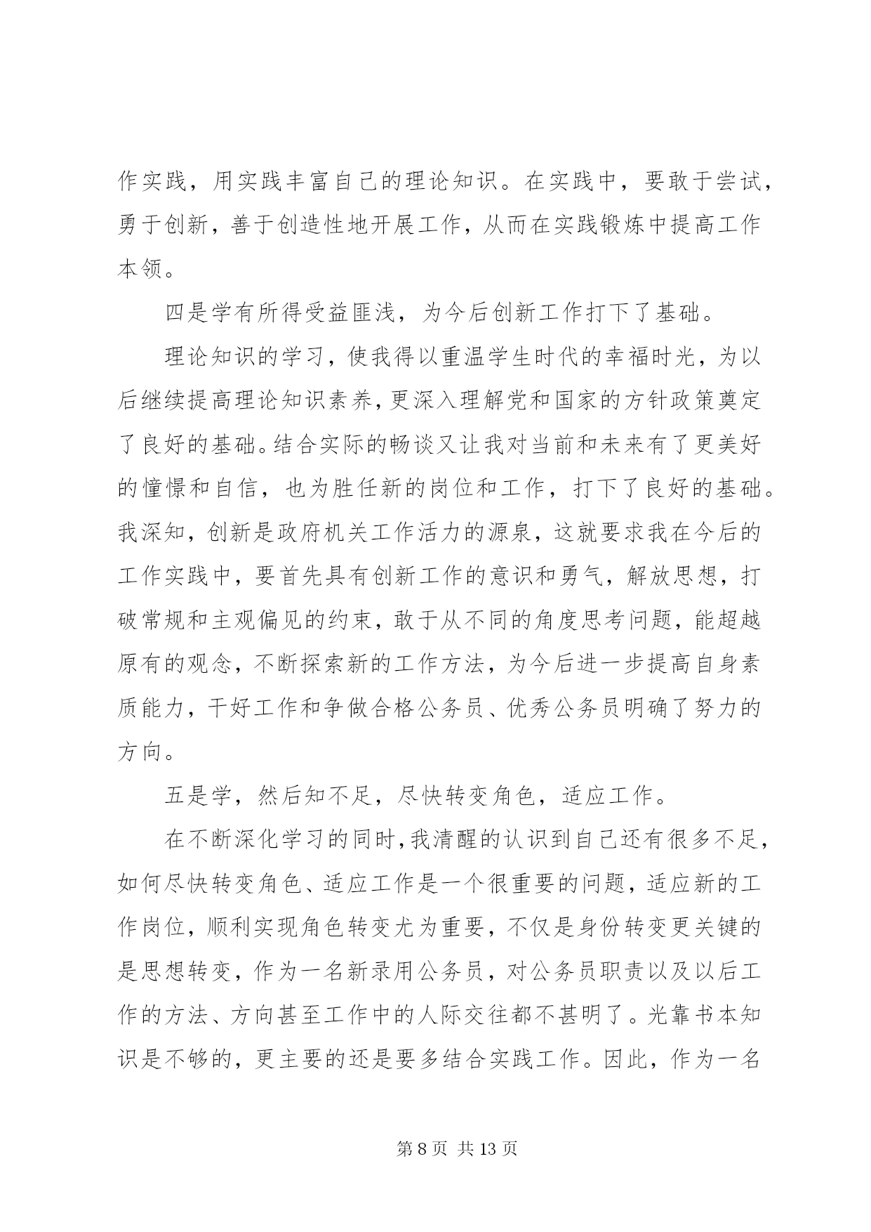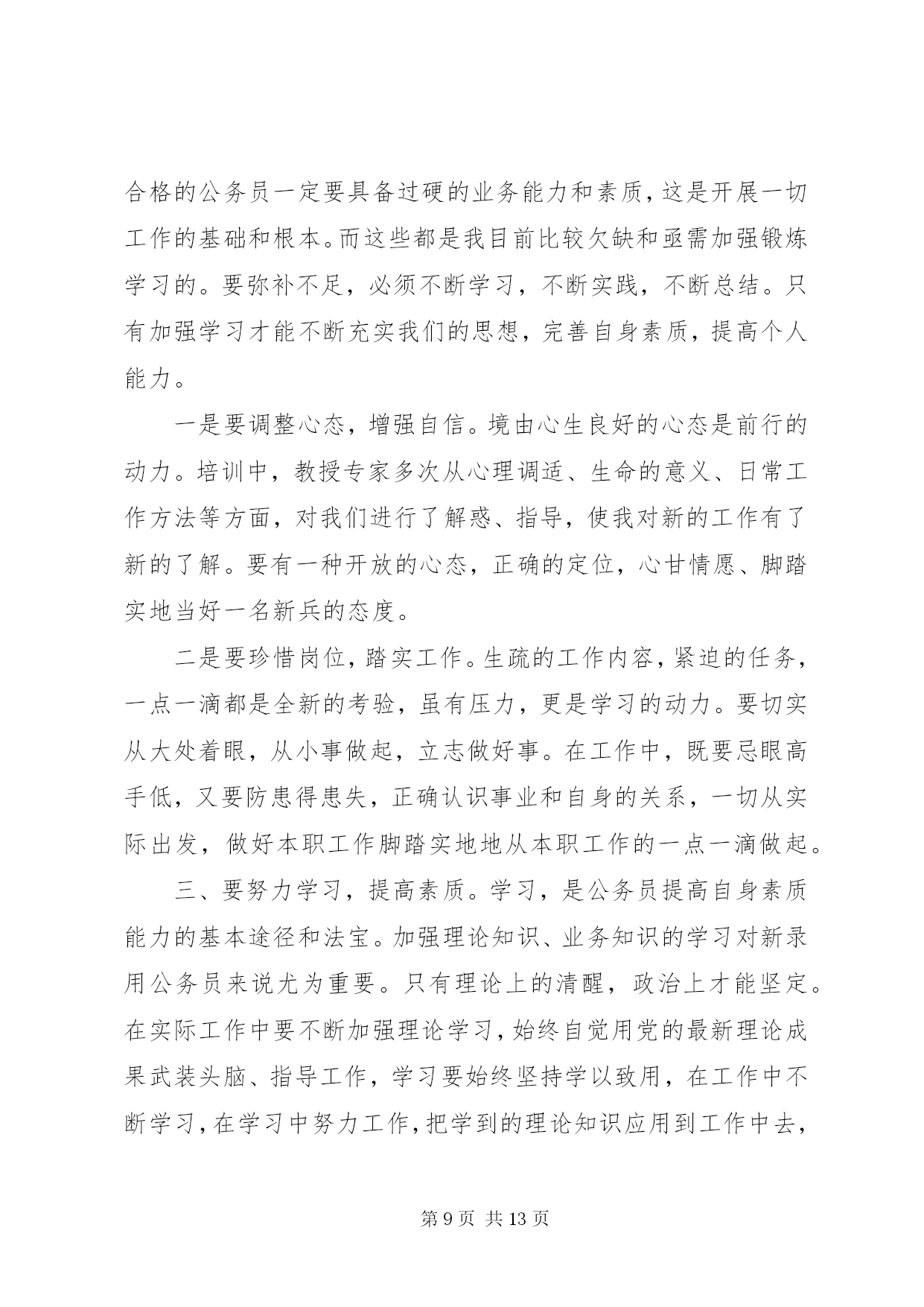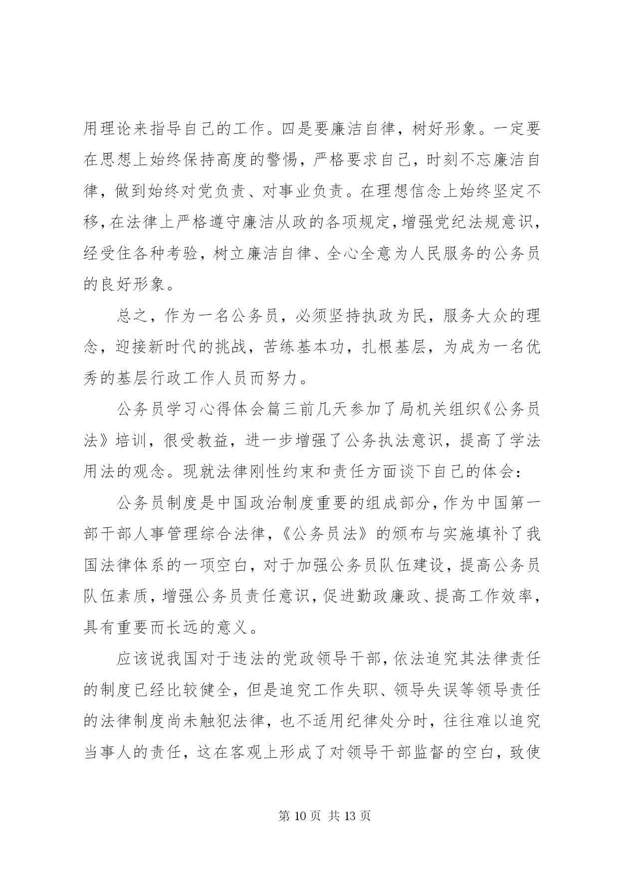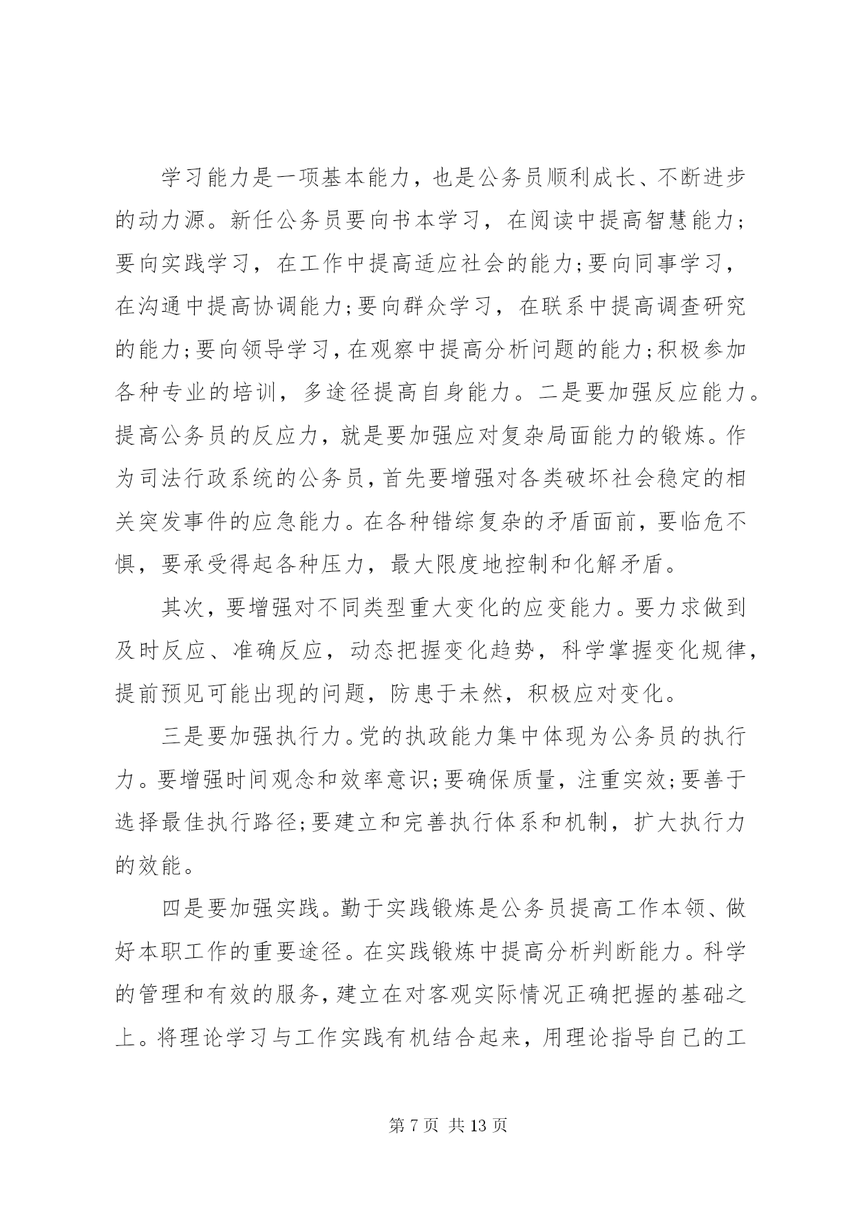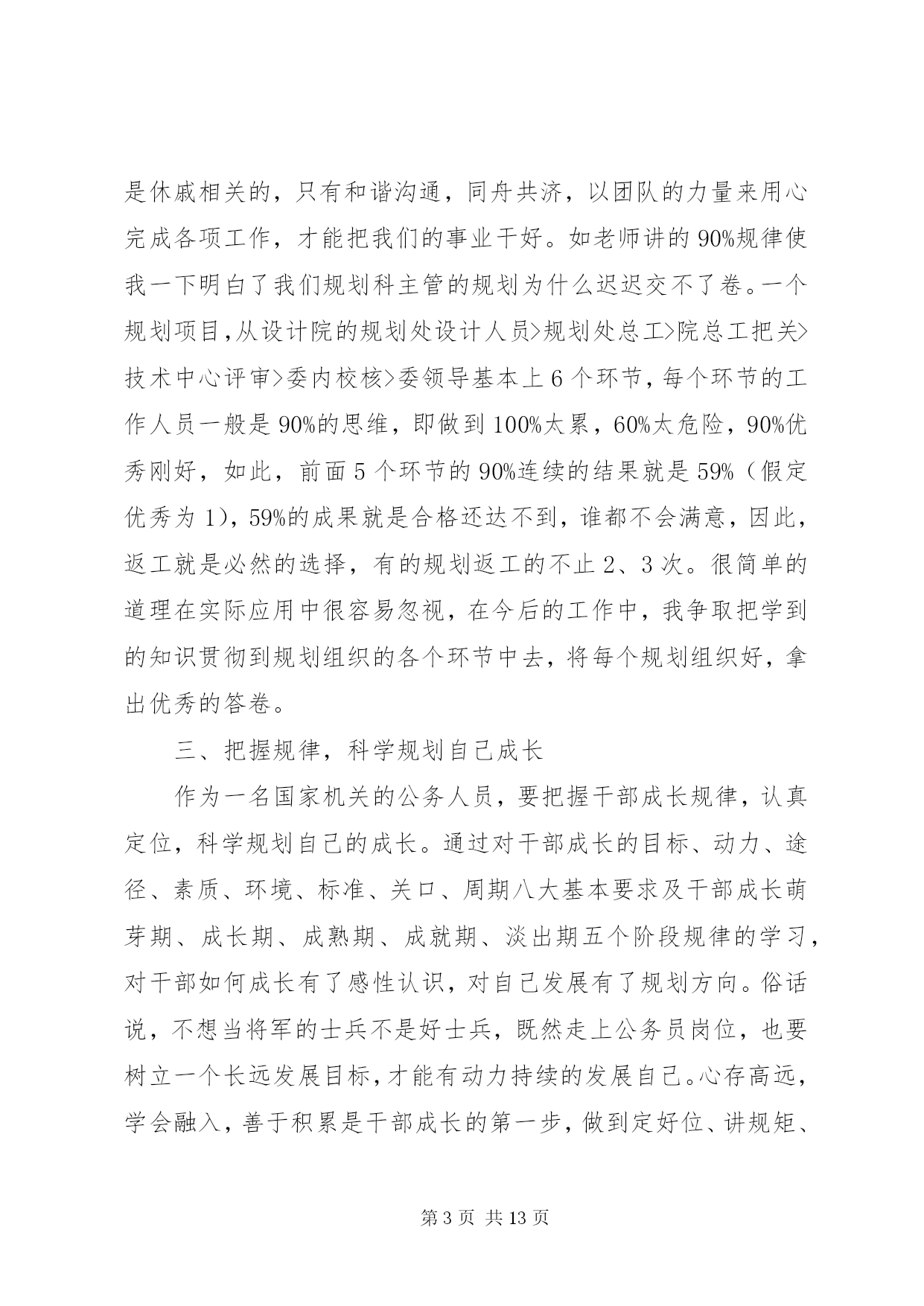 第PAGE\*Arabic\*MERGEFORMAT13页共NUMPAGES\*MERGEFORMAT13页最新公务员学习心得体会公务员学习心得体会篇一2015年7月15日,我参加了水利部青年公务员知识更新培训班。七天的时间,我们和来自水利部办公厅秘书处、水资源管理司、防办等各司局以及长江委、黄河委、淮委、海委、松辽委等各流域机构的学员一起系统的学习了《社会调查及调查研究报告撰写》、《中国水资源管理》、《保密工作基础知识》、《水利公文写作》、《水利法制建设》、《干部成长规律研究》、《对当前水利形势的认识》、《如何提高执行力》、《心理调试和沟通技巧》共9门课程。学习过程中,我认真听课,认真笔记,认真思考,圆满完成了各项学习任务。通过学习,系统的梳理了一名水利公务员必备的知识,进一步提高了政治修养,强化了理论素质,更重要的是发觉了自己的缺点和不足,对未来如何做一名合格的公务员,打下了坚实的基础。下面谈几点个人体会:一、把握当前水利脉搏,积极践行可持续发展治水思路作为一名水利系统公务员,最重要的是依法治水,依法管水,依法兴水,所以,对国家的治水政策及可持续发展治水思路的把握应该是很重要的一项基本要求。陈雷部长讲话指出水是基础性的自然资源和战略性的经济资源,是生态与环境的控制性要素。以水资源的可持续利用保障经济社会的可持续发展,是世界各国面临的共同挑战和紧迫任务。当前和今后一个时期,是中国全面建设小康社会、加快推进现代化进程的重要时期,也是传统水利向现代水利、可持续发展水利加快转变的关键阶段。人多水少,水资源时空分布不均、与生产力布局不相匹配,不仅是中国现阶段的突出水情,也是中国现代化建设进程中需要长期应对的基本国情。水利部发展研究中心*主任的给我们学院仔细的回顾了可持续发展治水思路出台的时代背景和战略意义,更使我们认识到肩头承担着践行可持续发展水利的责任,坚定不移的用可持续发展治水思路指导日常民生水利工作。工作中,只要坚持水资源可持续利用,坚持以人为本,坚持人与自然和谐,坚持统筹兼顾,坚持改革创新,坚持现代化方向就不会偏离民生水利可持续发展的轨道。只有真正理解可持续发展的治水思路,才能更好的把握当前水利脉搏,积极践行才能积极践行可持续发展治水思路。二、提升自我,学会沟通,利用团队精神把事业干好随着世界科学技术的突飞猛进,综合国力竞争的日趋激烈,社会对人才的需求越来越强烈,对人才素质的要求也越来越高。一个人要想在职业生涯中得到更好的发展,就必须具备更加优秀的素质。通过情商和心理沟通技巧的学习,使我更加清醒的认识到自己和优秀的差距。要努力提升自己的知识素质、能力素质、心理素质和身体素质,只有具备高素质才能成为一名优秀公务员。发展自己可以以划单人艇的心情去生活、发展自己、表现自己,但日常工作中更多时候我们是划的龙舟,每个人的成败得失是休戚相关的,只有和谐沟通,同舟共济,以团队的力量来用心完成各项工作,才能把我们的事业干好。如老师讲的90%规律使我一下明白了我们规划科主管的规划为什么迟迟交不了卷。一个规划项目,从设计院的规划处设计人员>规划处总工>院总工把关>技术中心评审>委内校核>委领导基本上6个环节,每个环节的工作人员一般是90%的思维,即做到100%太累,60%太危险,90%优秀刚好,如此,前面5个环节的90%连续的结果就是59%(假定优秀为1),59%的成果就是合格还达不到,谁都不会满意,因此,返工就是必然的选择,有的规划返工的不止2、3次。很简单的道理在实际应用中很容易忽视,在今后的工作中,我争取把学到的知识贯彻到规划组织的各个环节中去,将每个规划组织好,拿出优秀的答卷。三、把握规律,科学规划自己成长作为一名国家机关的公务人员,要把握干部成长规律,认真定位,科学规划自己的成长。通过对干部成长的目标、动力、途径、素质、环境、标准、关口、周期八大基本要求及干部成长萌芽期、成长期、成熟期、成就期、淡出期五个阶段规律的学习,对干部如何成长有了感性认识,对自己发展有了规划方向。俗话说,不想当将军的士兵不是好士兵,既然走上公务员岗位,也要树立一个长远发展目标,才能有动力持续的发展自己。心存高远,学会融入,善于积累是干部成长的第一步,做到定好位、讲规矩、明责任,干好工作,是塑造合格干部的基本要求,做到这些才能向更高的目标冲击。道理明白很简单,真正做到却很难。在未来的流域水利工作中逐步发现自己,提升自己,发展自己,是个人成长中的一个长期目标,对上对下负责,时刻关注民生,在实践中不断完善自己的修养。应该说这次培训对于我不仅及时而且实际,解答了我在前段工作中出现的一些迫切需要解答的问题,为我今后更好的开展工作打实了基础,创造了条件。更重要的是这次培训使我清楚的知道怎样才是一名合格的公务员,如何成为一名合格的公务员。在今后工作