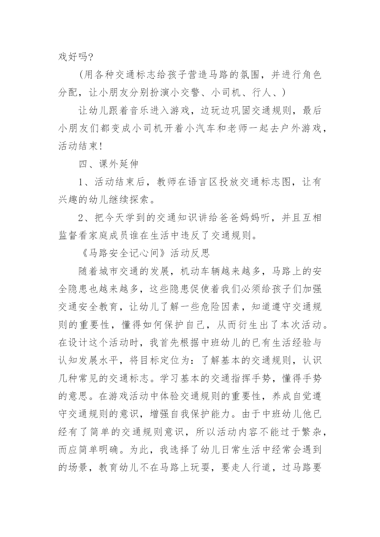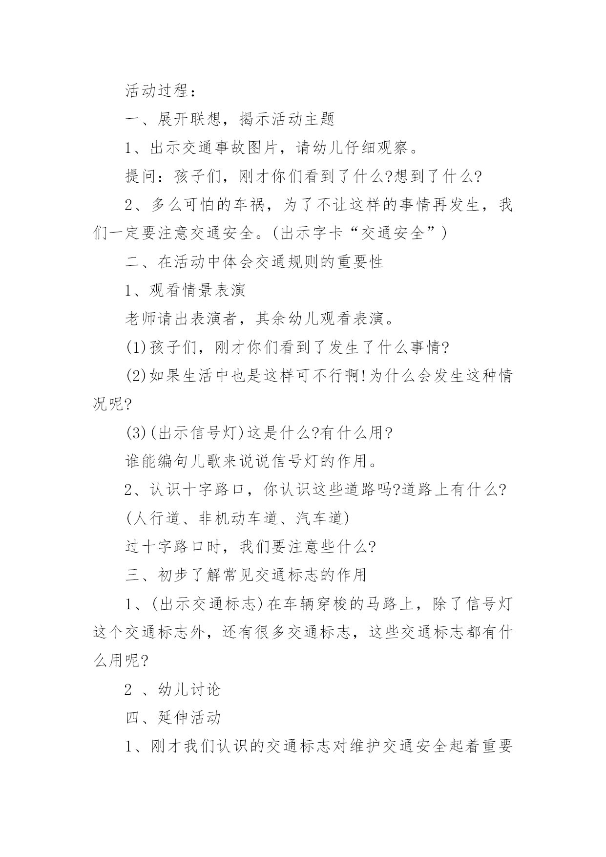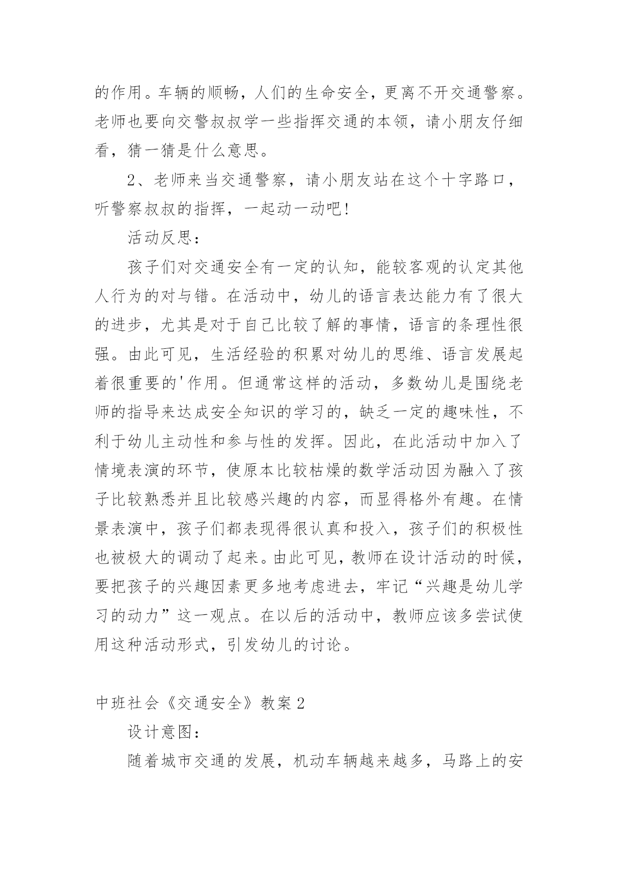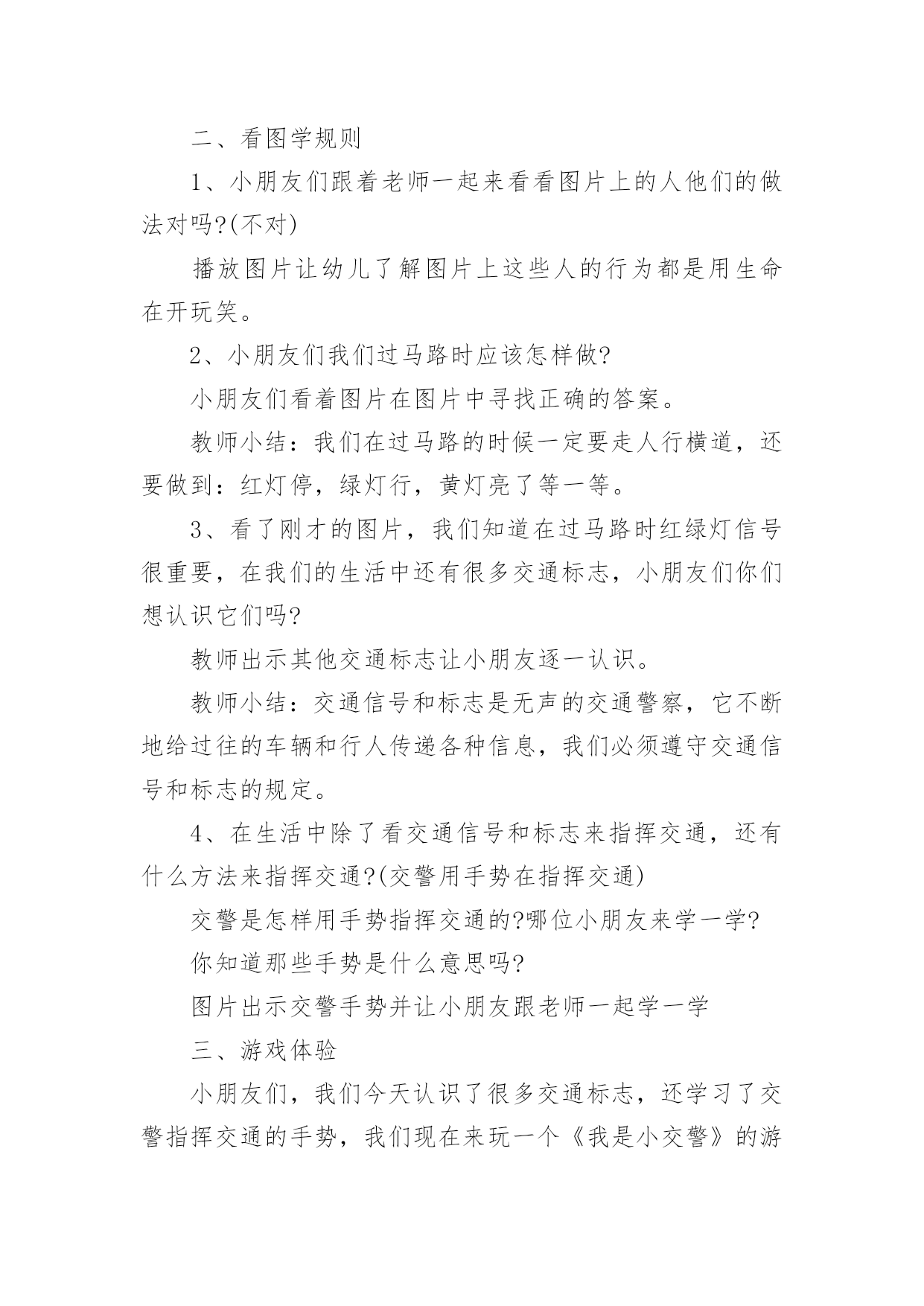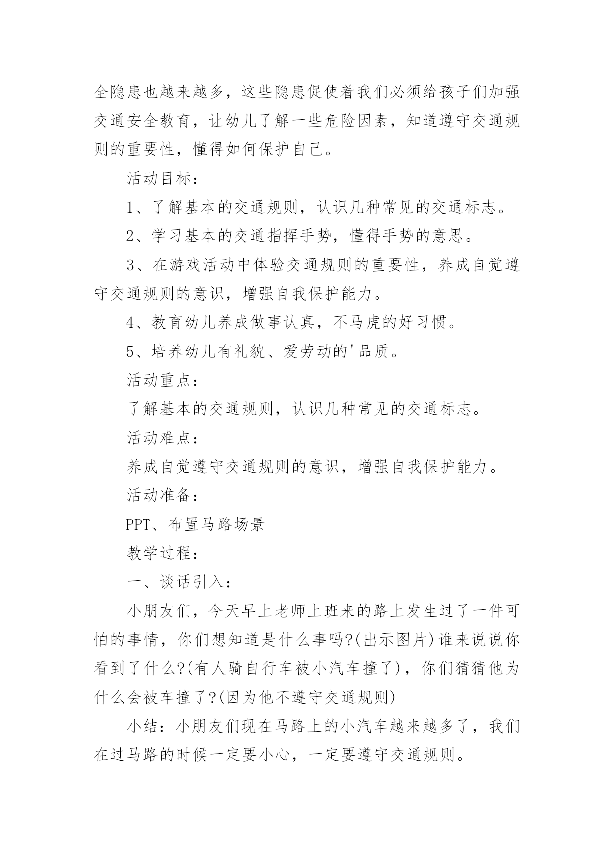 中班社会《交通安全》教案(精选)中班社会《交通安全》教案作为一名辛苦耕耘的教育工作者,总归要编写教案,教案有助于学生理解并掌握系统的知识。那么应当如何写教案呢?以下是小编整理的中班社会《交通安全》教案,希望对大家有所帮助。中班社会《交通安全》教案1活动意图:开学了,校园安全再次成为关注焦点。新的学期你怎么上学呢?是爸爸妈妈送你,还是自己去上学呢?无论何种方式都要注意安全。活动目标:1、在交流活动中认识常见的交通标志。2、体验交通规则的重要性,自觉遵守交通规则。3、遵守社会行为规则,不做“禁止”的事。4、培养幼儿动脑思考问题、解决问题的能力。5、能积极参加游戏活动,并学会自我保护。活动准备:1、布置活动场景。2、收集各种交通标志(照片或图片)。3、字卡:交通安全、红灯停,绿灯行、人行道、非机动车道、汽车道。活动过程:一、展开联想,揭示活动主题1、出示交通事故图片,请幼儿仔细观察。提问:孩子们,刚才你们看到了什么?想到了什么?2、多么可怕的车祸,为了不让这样的事情再发生,我们一定要注意交通安全。(出示字卡“交通安全”)二、在活动中体会交通规则的重要性1、观看情景表演老师请出表演者,其余幼儿观看表演。(1)孩子们,刚才你们看到了发生了什么事情?(2)如果生活中也是这样可不行啊!为什么会发生这种情况呢?(3)(出示信号灯)这是什么?有什么用?谁能编句儿歌来说说信号灯的作用。2、认识十字路口,你认识这些道路吗?道路上有什么?(人行道、非机动车道、汽车道)过十字路口时,我们要注意些什么?三、初步了解常见交通标志的作用1、(出示交通标志)在车辆穿梭的马路上,除了信号灯这个交通标志外,还有很多交通标志,这些交通标志都有什么用呢?2、幼儿讨论四、延伸活动1、刚才我们认识的交通标志对维护交通安全起着重要的作用。车辆的顺畅,人们的生命安全,更离不开交通警察。老师也要向交警叔叔学一些指挥交通的本领,请小朋友仔细看,猜一猜是什么意思。2、老师来当交通警察,请小朋友站在这个十字路口,听警察叔叔的指挥,一起动一动吧!活动反思:孩子们对交通安全有一定的认知,能较客观的认定其他人行为的对与错。在活动中,幼儿的语言表达能力有了很大的进步,尤其是对于自己比较了解的事情,语言的条理性很强。由此可见,生活经验的积累对幼儿的思维、语言发展起着很重要的'作用。但通常这样的活动,多数幼儿是围绕老师的指导来达成安全知识的学习的,缺乏一定的趣味性,不利于幼儿主动性和参与性的发挥。因此,在此活动中加入了情境表演的环节,使原本比较枯燥的数学活动因为融入了孩子比较熟悉并且比较感兴趣的内容,而显得格外有趣。在情景表演中,孩子们都表现得很认真和投入,孩子们的积极性也被极大的调动了起来。由此可见,教师在设计活动的时候,要把孩子的兴趣因素更多地考虑进去,牢记“兴趣是幼儿学习的动力”这一观点。在以后的活动中,教师应该多尝试使用这种活动形式,引发幼儿的讨论。中班社会《交通安全》教案2设计意图:随着城市交通的发展,机动车辆越来越多,马路上的安全隐患也越来越多,这些隐患促使着我们必须给孩子们加强交通安全教育,让幼儿了解一些危险因素,知道遵守交通规则的重要性,懂得如何保护自己。活动目标:1、了解基本的交通规则,认识几种常见的交通标志。2、学习基本的交通指挥手势,懂得手势的意思。3、在游戏活动中体验交通规则的重要性,养成自觉遵守交通规则的意识,增强自我保护能力。4、教育幼儿养成做事认真,不马虎的好习惯。5、培养幼儿有礼貌、爱劳动的'品质。活动重点:了解基本的交通规则,认识几种常见的交通标志。活动难点:养成自觉遵守交通规则的意识,增强自我保护能力。活动准备:PPT、布置马路场景教学过程:一、谈话引入:小朋友们,今天早上老师上班来的路上发生过了一件可怕的事情,你们想知道是什么事吗?(出示图片)谁来说说你看到了什么?(有人骑自行车被小汽车撞了),你们猜猜他为什么会被车撞了?(因为他不遵守交通规则)小结:小朋友们现在马路上的小汽车越来越多了,我们在过马路的时候一定要小心,一定要遵守交通规则。二、看图学规则1、小朋友们跟着老师一起来看看图片上的人他们的做法对吗?(不对)播放图片让幼儿了解图片上这些人的行为都是用生命在开玩笑。2、小朋友们我们过马路时应该怎样做?小朋友们看着图片在图片中寻找正确的答案。教师小结:我们在过马路的时候一定要走人行横道,还要做到:红灯停,绿灯行,黄灯亮了等一等。3、看了刚才的图片,我们知道在过马路时红绿灯信号很重要,在我们的生活中还有很多交通标志,小朋友们你们想认识它们吗?教师出示其他交通标志让小朋友逐一认识。教师小结:交通信号和标志是无声的交通警察,它不断地给过往的车辆和行人传递各种信息,我们必须遵守交通信号和标志的规定。4、在生活中除了看交通信号和标志来指挥交通,还有什么方法来指挥