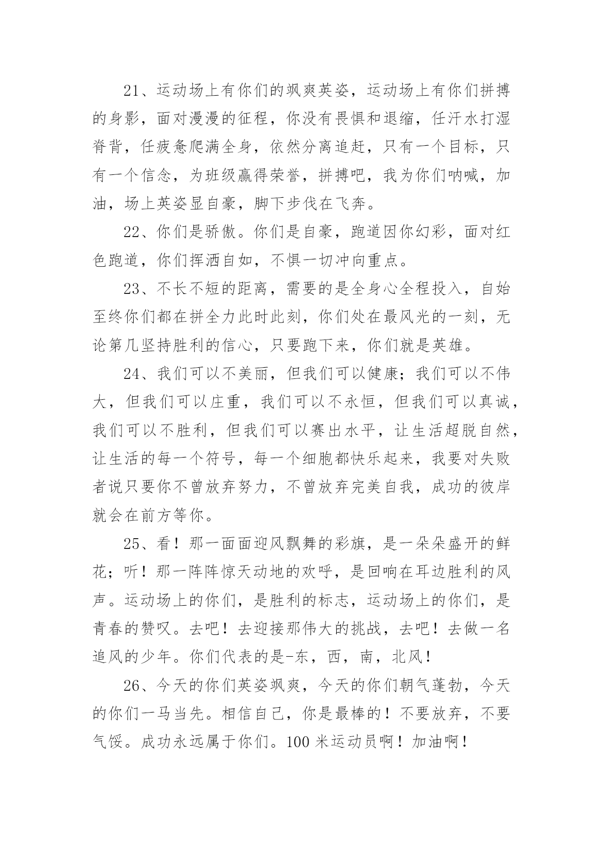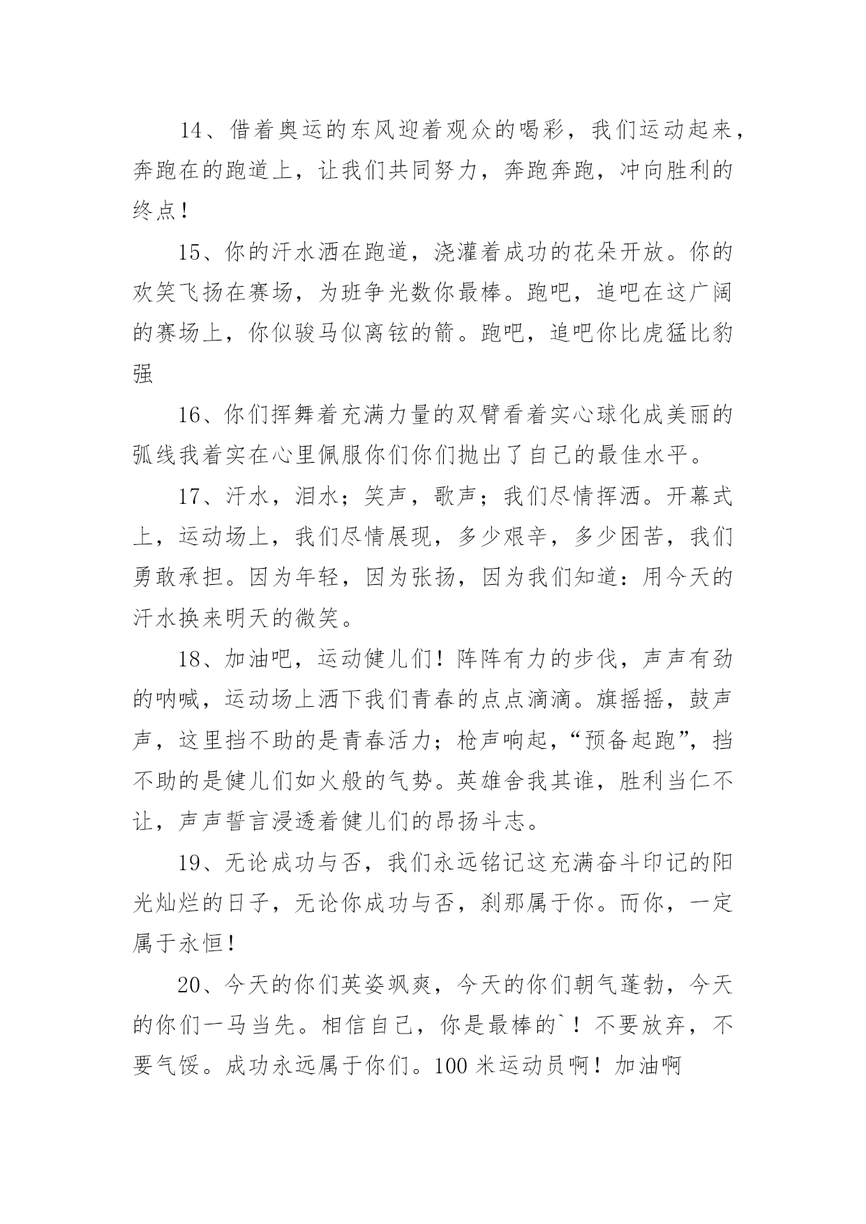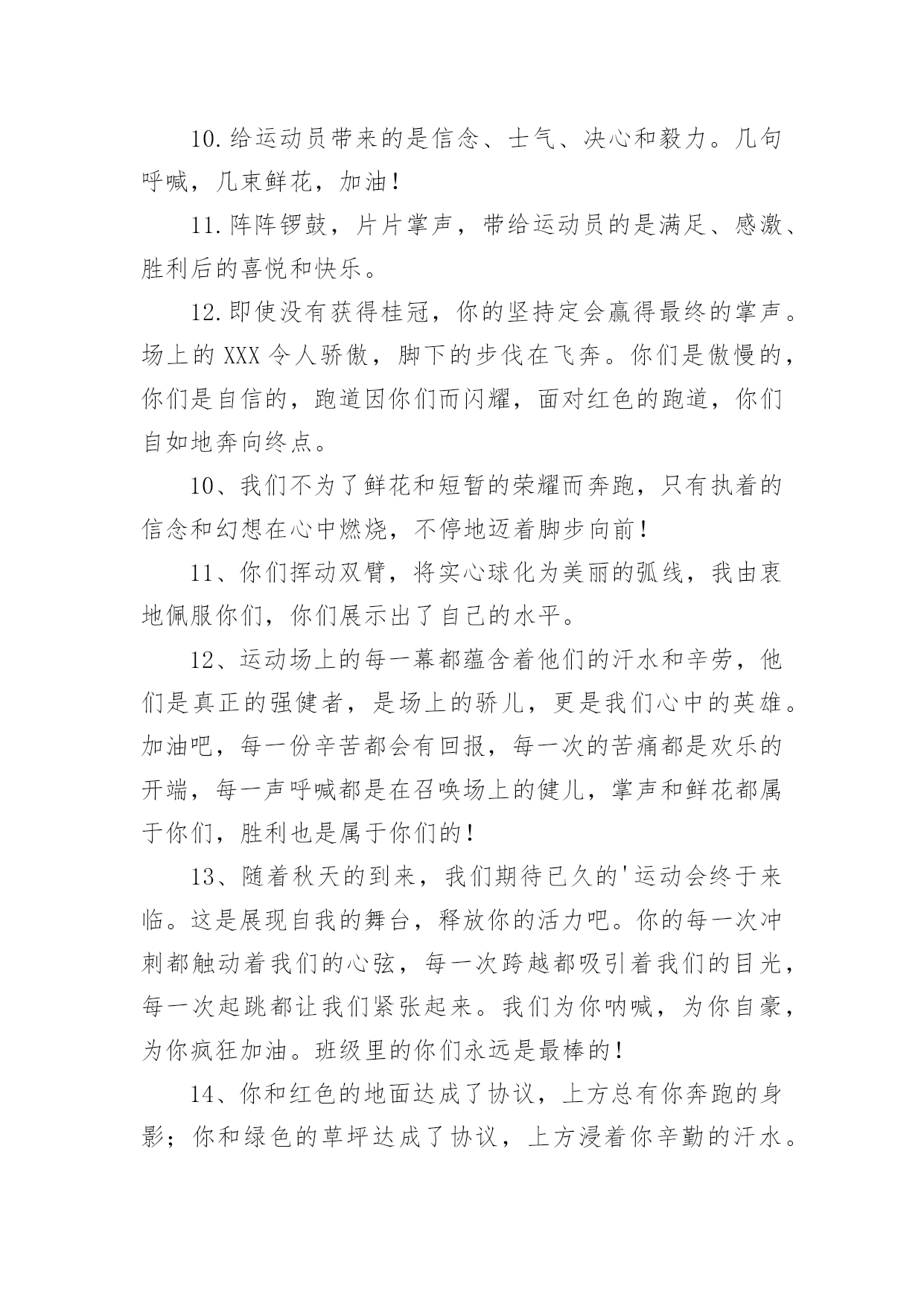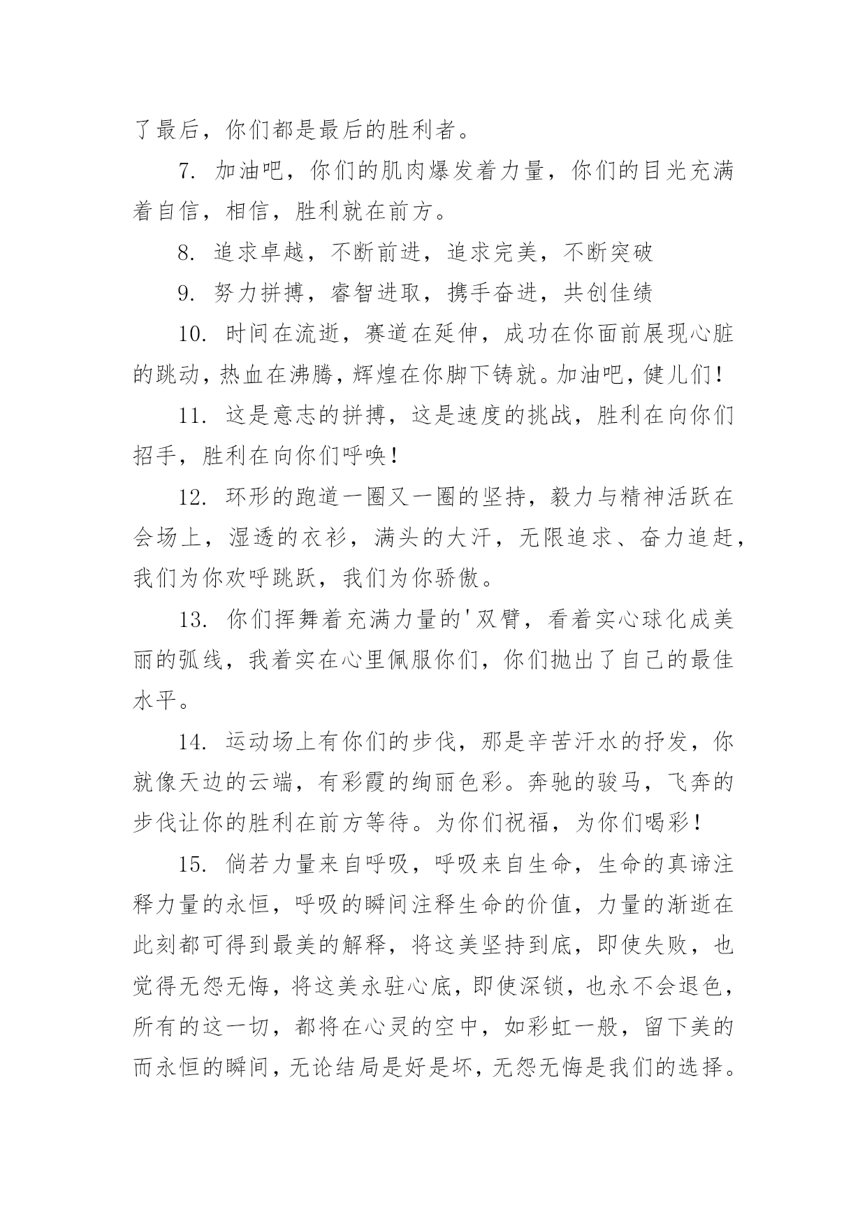 运动会加油稿运动会加油稿现如今,越来越多地方需要用到加油稿,借助加油稿可以激励他人的士气。相信许多人会觉得加油稿很难写吧,以下是小编为大家收集的运动会加油稿,欢迎阅读,希望大家能够喜欢。运动会加油稿篇1轻快如鸟雀般,是你们跃动的身影;灿烂如鲜花般,是你们微笑的脸庞;闪耀如星辰般,是你们拼搏的精神。迎着朝阳,披着晨光,你们在翻飞的.绳索间打造神话。看着你们朝气蓬勃的笑脸,谁不感到斗志昂扬?加油!可爱的跳绳运动员们!你们轻快跳跃的小小背影,为赛场增添了亮点,点燃了希望!我是运动员,在骄阳下展现自我,在奋斗中争取辉煌。我是运动员,不在乎成功与否,不怕汗水直流,因为,你看——有同学们为我加油!运动会加油稿篇21.一根竹竿,决定了你的命运。在一瞬间,你的命运会从喜转悲。你强健的身体像流星一样划过宁静的XXX。柔软的铺垫融入了你的所有欢乐。所有精彩的瞬间都在你跳起的那一刻,我会永远记在心里。2.百米赛场,枪声响起,你抬头时士气和自信,低头时肤浅和内敛。只需要几秒钟,这将是永恒的。3.枪声响起,你们的征程从脚下开始,你们在赛道上飞驰,迎接属于你们的掌声。4.如果人生有一个草稿本,能够再次抄写,那该多好啊!我们一定会仔细地叙述自己的人生,也许不需要比别人写得更好,但一定要比第一次写得更美丽。也许人生不可能像我们想象的那样完美,人生的道路也不可能都是平坦的,人的情绪也不会永静。5.时间在流逝,赛道在延长,胜利在你面前展现,心脏跳动,热血沸腾,辉煌在你脚下铸就,加油,健儿们!6.漫长的道路,你愿意独自承受孤独和压力,只让汗水溶入泪水,但脚步从未停止。即使没有获得桂冠,你的坚持定会赢得最终的掌声。7.年轻的我们充满自信,青春的气息像初升的朝阳,充满生机的力量像阳光一样挥洒。此时此刻,跑道就是我们精彩的舞台,呐喊声就是我们的奖项!不论胜利或失败,我们的信念只有一个:拼搏!秋风无法阻挡你们的锐气。8.踏上跑道是一种选择,离开起点是一种士气,驰骋赛场是一种成功。运动员们,用你们的实力和精神,开拓属于你们的长跑天地!百米是一个充满激情的世界!9.友爱的班级健儿们,你们要充满自信。比赛中没有挡风的墙,没有遮风的伞,也没有撑船的帆,更没有拉船的绳索。事在人为,人定胜天。让你们养精蓄锐,向充满爱的世界宣告:“我有信心,我拼搏,我会赢。”10.给运动员带来的是信念、士气、决心和毅力。几句呼喊,几束鲜花,加油!11.阵阵锣鼓,片片掌声,带给运动员的是满足、感激、胜利后的喜悦和快乐。12.即使没有获得桂冠,你的坚持定会赢得最终的掌声。场上的XXX令人骄傲,脚下的步伐在飞奔。你们是傲慢的,你们是自信的,跑道因你们而闪耀,面对红色的跑道,你们自如地奔向终点。10、我们不为了鲜花和短暂的荣耀而奔跑,只有执着的信念和幻想在心中燃烧,不停地迈着脚步向前!11、你们挥动双臂,将实心球化为美丽的弧线,我由衷地佩服你们,你们展示出了自己的水平。12、运动场上的每一幕都蕴含着他们的汗水和辛劳,他们是真正的强健者,是场上的骄儿,更是我们心中的英雄。加油吧,每一份辛苦都会有回报,每一次的苦痛都是欢乐的开端,每一声呼喊都是在召唤场上的健儿,掌声和鲜花都属于你们,胜利也是属于你们的!13、随着秋天的到来,我们期待已久的'运动会终于来临。这是展现自我的舞台,释放你的活力吧。你的每一次冲刺都触动着我们的心弦,每一次跨越都吸引着我们的目光,每一次起跳都让我们紧张起来。我们为你呐喊,为你自豪,为你疯狂加油。班级里的你们永远是最棒的!14、你和红色的地面达成了协议,上方总有你奔跑的身影;你和绿色的草坪达成了协议,上方浸着你辛勤的汗水。你和我们达成了协议,必须赢,也必须会赢。你喊着跑着,迈开大步,跨越世纪。我们相信你,xx。15、赛场上,健儿们用手中的标枪向着距离挑战自我,美丽的弧线轻快地划过天空,展现着他们强健的力量和娴熟的技巧。谁能在这场激烈的竞争中获胜?让我们拭目以待,为他们呐喊助威吧!运动会加油稿篇3自古巾帼不让须眉,而今武妆更胜红妆。此刻,你们不是温婉柔弱的水,即便没有刚强如铁的'臂膀,你们挺直了不会轻易屈服的脊梁;你们也不是娇羞欲滴的花,在挥汗如雨的赛场上,你们勇敢地站在最前线。加油,美丽自信的姑娘们。运动会加油稿篇41.百米战场,枪声炸响,你抬头是勇气是自信,低头是深沉是内敛,只需几秒,那就是永恒。2.活力飞扬,气宇轩昂,同心协力,共创辉煌3.坚定,执着,耐力与希望,在延伸的白色跑道中点点凝聚!力量,信念,拼搏与奋斗,在遥远的终点线上渐渐明亮!时代的强音正在你的脚下踏响。4.100只是一道过场,几秒钟转瞬即逝,但是这背后承载的是多少成败,加油吧,少年。5.你的风姿,你的呼吸还有你呼啸而过的飓风,今天注定是属于你的日子,今天你注定将要创造辉煌。6.胜负只在转瞬之间,不管结果怎么样,你们都走