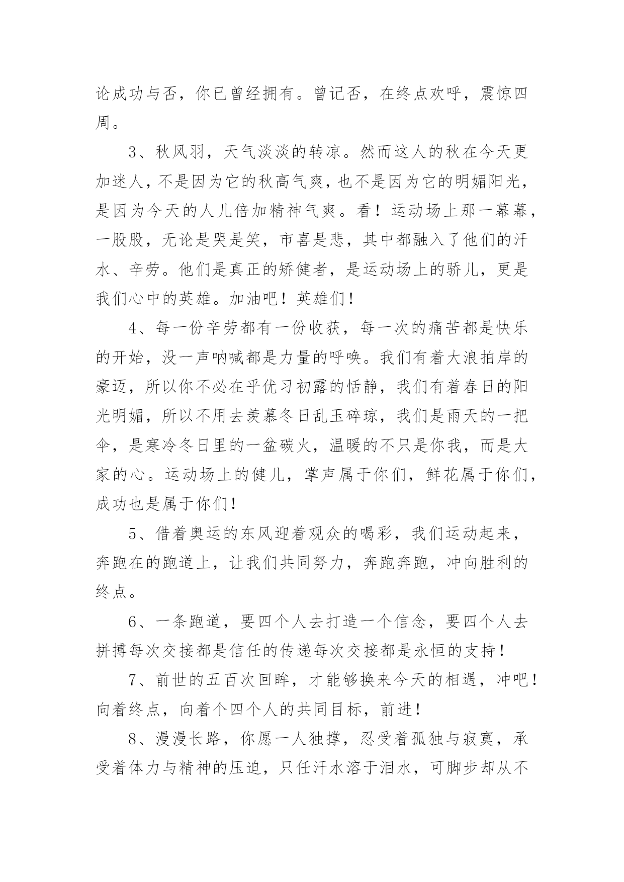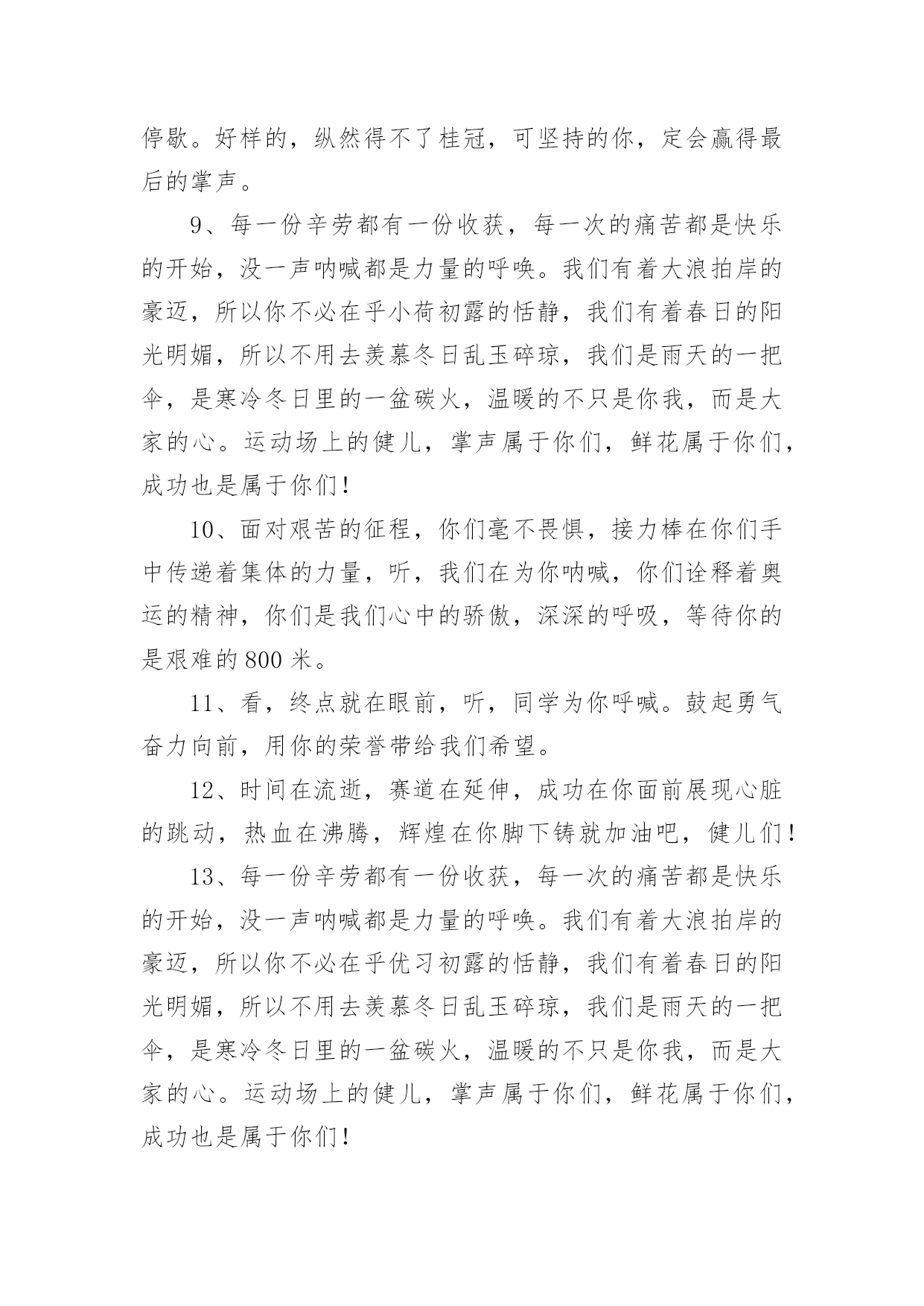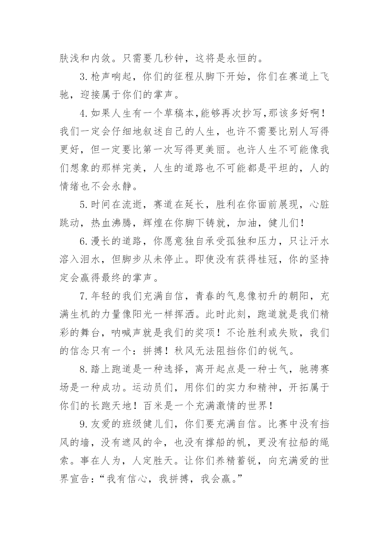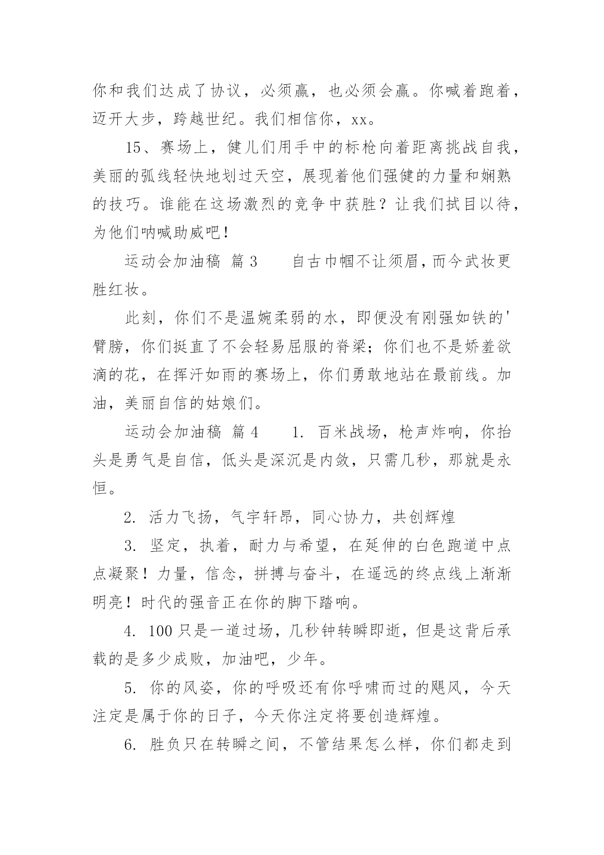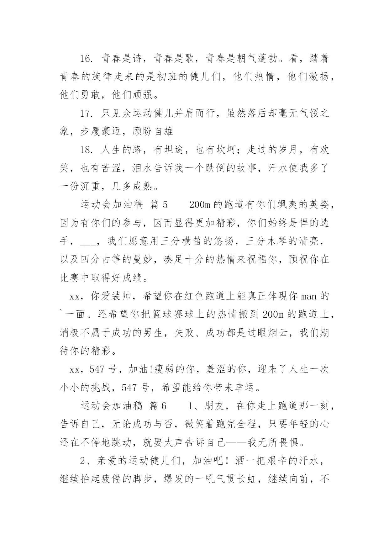 运动会加油稿运动会加油稿现如今,越来越多地方需要用到加油稿,借助加油稿可以激励他人的士气。相信许多人会觉得加油稿很难写吧,以下是小编为大家收集的运动会加油稿,欢迎阅读,希望大家能够喜欢。运动会加油稿篇1轻快如鸟雀般,是你们跃动的身影;灿烂如鲜花般,是你们微笑的脸庞;闪耀如星辰般,是你们拼搏的精神。迎着朝阳,披着晨光,你们在翻飞的.绳索间打造神话。看着你们朝气蓬勃的笑脸,谁不感到斗志昂扬?加油!可爱的跳绳运动员们!你们轻快跳跃的小小背影,为赛场增添了亮点,点燃了希望!我是运动员,在骄阳下展现自我,在奋斗中争取辉煌。我是运动员,不在乎成功与否,不怕汗水直流,因为,你看——有同学们为我加油!运动会加油稿篇21.一根竹竿,决定了你的命运。在一瞬间,你的命运会从喜转悲。你强健的身体像流星一样划过宁静的XXX。柔软的铺垫融入了你的所有欢乐。所有精彩的瞬间都在你跳起的那一刻,我会永远记在心里。2.百米赛场,枪声响起,你抬头时士气和自信,低头时肤浅和内敛。只需要几秒钟,这将是永恒的。3.枪声响起,你们的征程从脚下开始,你们在赛道上飞驰,迎接属于你们的掌声。4.如果人生有一个草稿本,能够再次抄写,那该多好啊!我们一定会仔细地叙述自己的人生,也许不需要比别人写得更好,但一定要比第一次写得更美丽。也许人生不可能像我们想象的那样完美,人生的道路也不可能都是平坦的,人的情绪也不会永静。5.时间在流逝,赛道在延长,胜利在你面前展现,心脏跳动,热血沸腾,辉煌在你脚下铸就,加油,健儿们!6.漫长的道路,你愿意独自承受孤独和压力,只让汗水溶入泪水,但脚步从未停止。即使没有获得桂冠,你的坚持定会赢得最终的掌声。7.年轻的我们充满自信,青春的气息像初升的朝阳,充满生机的力量像阳光一样挥洒。此时此刻,跑道就是我们精彩的舞台,呐喊声就是我们的奖项!不论胜利或失败,我们的信念只有一个:拼搏!秋风无法阻挡你们的锐气。8.踏上跑道是一种选择,离开起点是一种士气,驰骋赛场是一种成功。运动员们,用你们的实力和精神,开拓属于你们的长跑天地!百米是一个充满激情的世界!9.友爱的班级健儿们,你们要充满自信。比赛中没有挡风的墙,没有遮风的伞,也没有撑船的帆,更没有拉船的绳索。事在人为,人定胜天。让你们养精蓄锐,向充满爱的世界宣告:“我有信心,我拼搏,我会赢。”10.给运动员带来的是信念、士气、决心和毅力。几句呼喊,几束鲜花,加油!11.阵阵锣鼓,片片掌声,带给运动员的是满足、感激、胜利后的喜悦和快乐。12.即使没有获得桂冠,你的坚持定会赢得最终的掌声。场上的XXX令人骄傲,脚下的步伐在飞奔。你们是傲慢的,你们是自信的,跑道因你们而闪耀,面对红色的跑道,你们自如地奔向终点。10、我们不为了鲜花和短暂的荣耀而奔跑,只有执着的信念和幻想在心中燃烧,不停地迈着脚步向前!11、你们挥动双臂,将实心球化为美丽的弧线,我由衷地佩服你们,你们展示出了自己的水平。12、运动场上的每一幕都蕴含着他们的汗水和辛劳,他们是真正的强健者,是场上的骄儿,更是我们心中的英雄。加油吧,每一份辛苦都会有回报,每一次的苦痛都是欢乐的开端,每一声呼喊都是在召唤场上的健儿,掌声和鲜花都属于你们,胜利也是属于你们的!13、随着秋天的到来,我们期待已久的'运动会终于来临。这是展现自我的舞台,释放你的活力吧。你的每一次冲刺都触动着我们的心弦,每一次跨越都吸引着我们的目光,每一次起跳都让我们紧张起来。我们为你呐喊,为你自豪,为你疯狂加油。班级里的你们永远是最棒的!14、你和红色的地面达成了协议,上方总有你奔跑的身影;你和绿色的草坪达成了协议,上方浸着你辛勤的汗水。你和我们达成了协议,必须赢,也必须会赢。你喊着跑着,迈开大步,跨越世纪。我们相信你,xx。15、赛场上,健儿们用手中的标枪向着距离挑战自我,美丽的弧线轻快地划过天空,展现着他们强健的力量和娴熟的技巧。谁能在这场激烈的竞争中获胜?让我们拭目以待,为他们呐喊助威吧!运动会加油稿篇3自古巾帼不让须眉,而今武妆更胜红妆。此刻,你们不是温婉柔弱的水,即便没有刚强如铁的'臂膀,你们挺直了不会轻易屈服的脊梁;你们也不是娇羞欲滴的花,在挥汗如雨的赛场上,你们勇敢地站在最前线。加油,美丽自信的姑娘们。运动会加油稿篇41.百米战场,枪声炸响,你抬头是勇气是自信,低头是深沉是内敛,只需几秒,那就是永恒。2.活力飞扬,气宇轩昂,同心协力,共创辉煌3.坚定,执着,耐力与希望,在延伸的白色跑道中点点凝聚!力量,信念,拼搏与奋斗,在遥远的终点线上渐渐明亮!时代的强音正在你的脚下踏响。4.100只是一道过场,几秒钟转瞬即逝,但是这背后承载的是多少成败,加油吧,少年。5.你的风姿,你的呼吸还有你呼啸而过的飓风,今天注定是属于你的日子,今天你注定将要创造辉煌。6.胜负只在转瞬之间,不管结果怎么样,你们都走