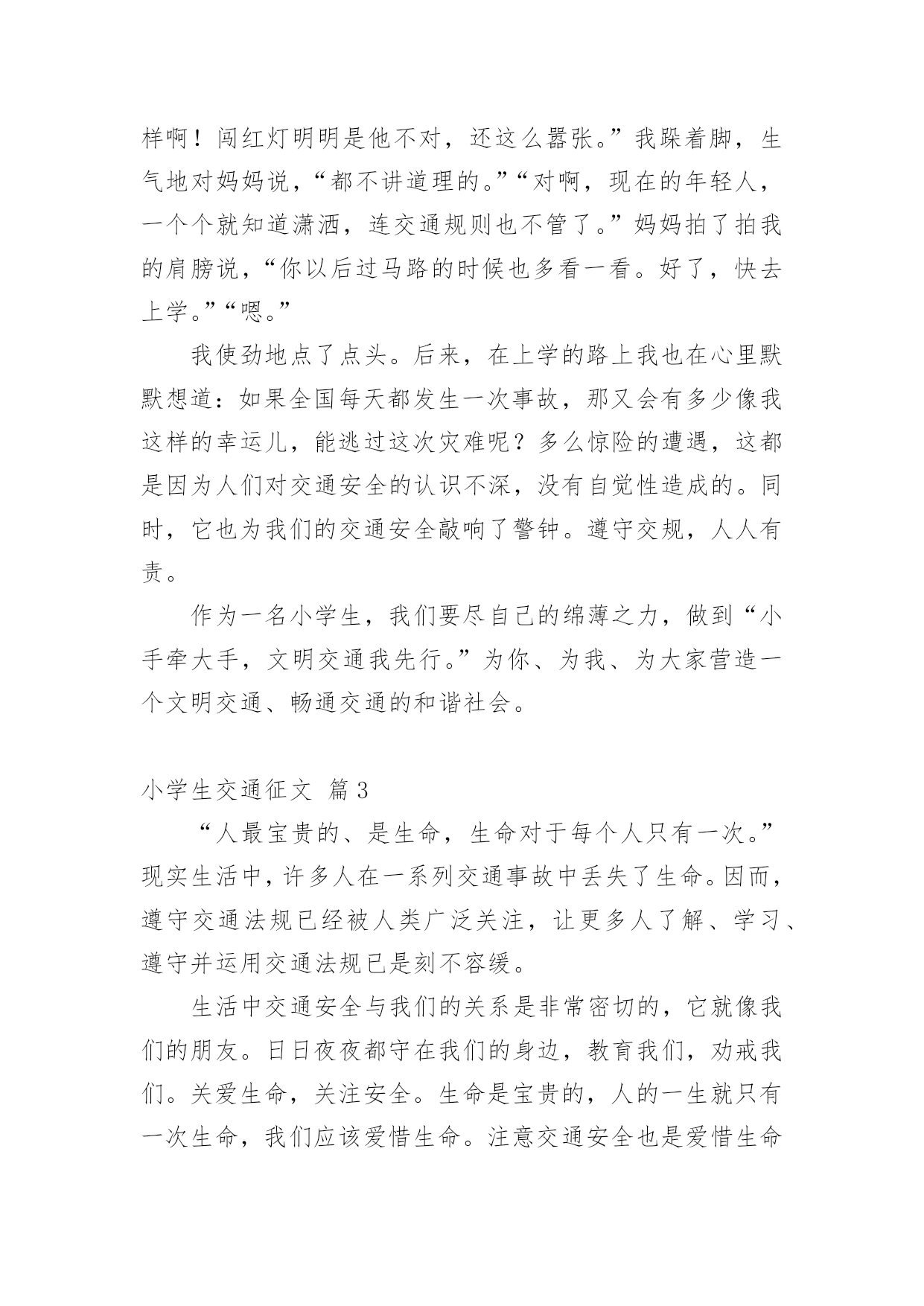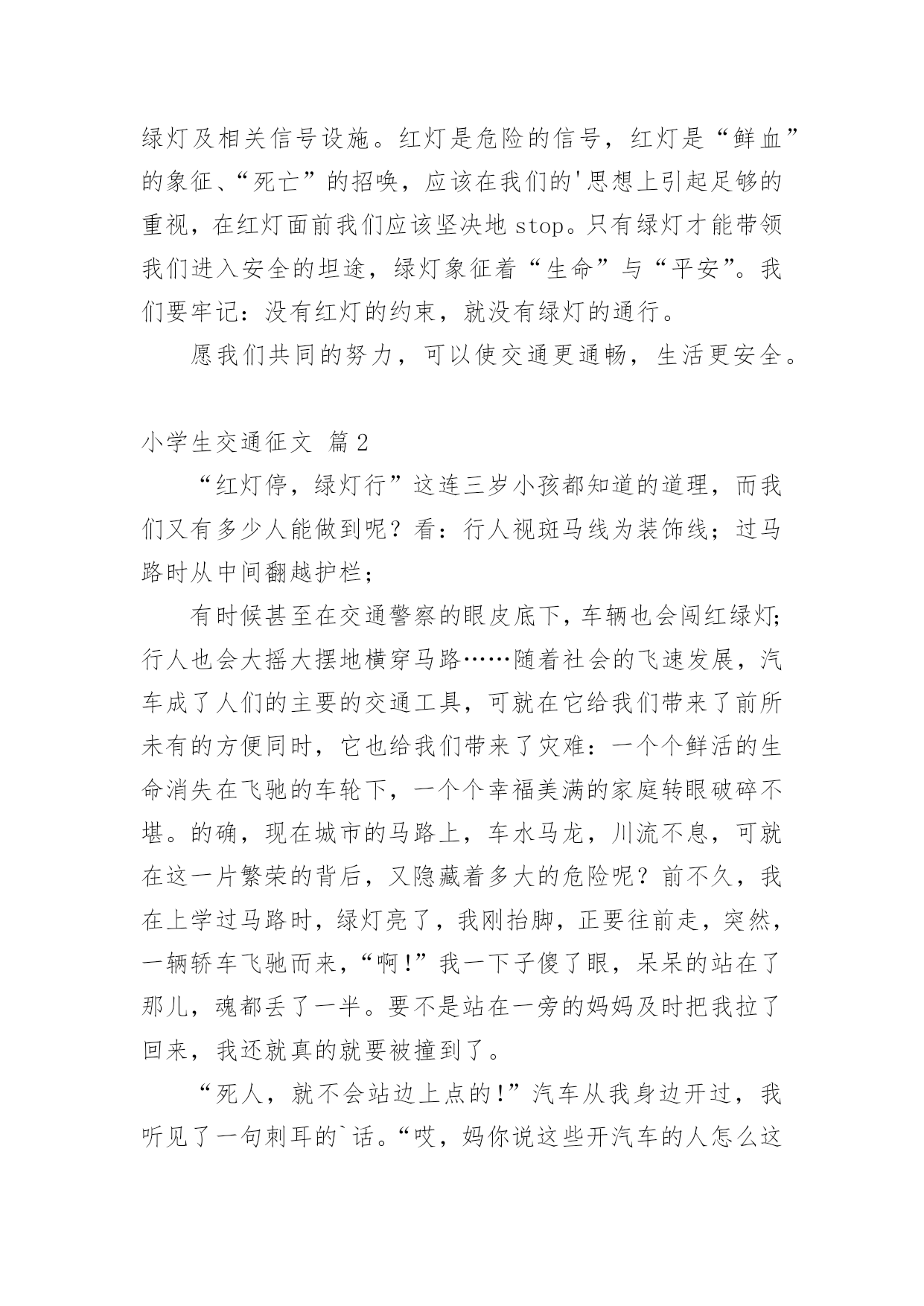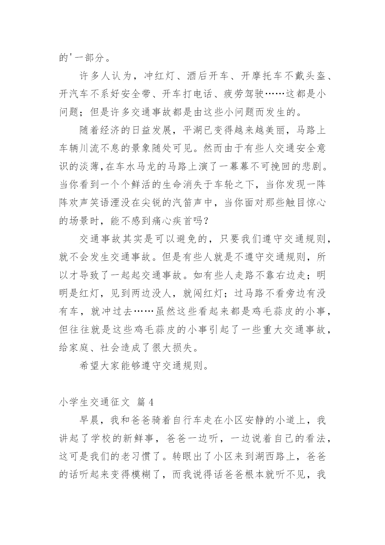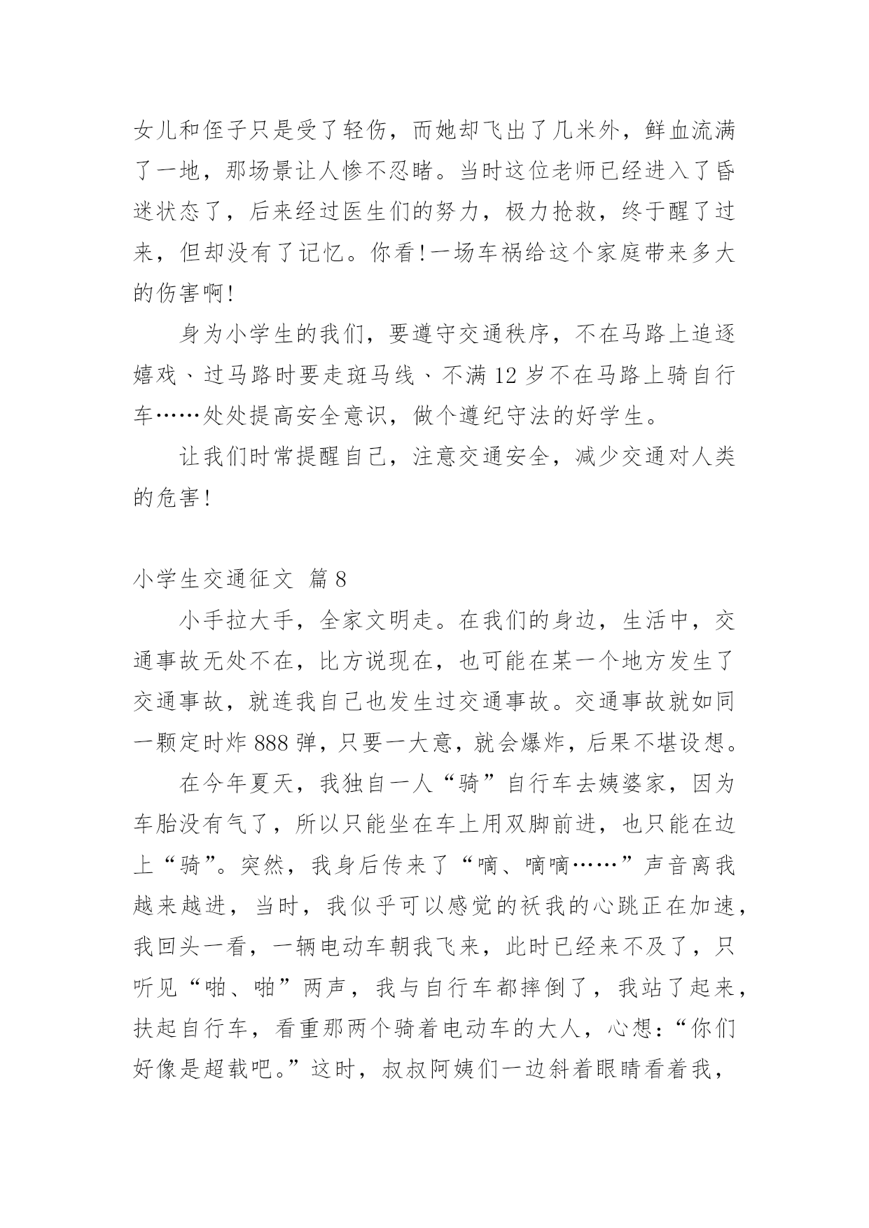 小学生交通征文小学生交通征文(通用69篇)在日复一日的学习、工作或生活中,大家总免不了要接触或使用征文吧,写征文是培养人们的观察力、联想力、想象力、思考力和记忆力的重要手段。如何写一篇有思想、有文采的征文呢?以下是小编为大家收集的小学生交通征文,仅供参考,大家一起来看看吧。小学生交通征文篇1随着科技的发展,社会的进步,人类的运输方式也越来越多元化。这样一个庞大的运输体系必定需要一部合理的法规来调控,才能正常运作。这便是《交通法规》,一部需要我们每个人用实际行动维护的法规。除了我们自己要注意“过马路走斑马线”,“不骑车带人”等基本的交通法规外,还应提醒自己的父母安全驾车。一部指导安全行车的《交通法规》并不是一纸简单的文字规定,它是人们从长期的交通实践中由几代人乃至数十代人的经验与血的教训中孕育而成,是指导每个驾驶员安全行车的宝贵财富,从广义上说,《交通法规》是每个交通参与者的宝贵财富。有一句交通安全宣传语说得好:“交通法规生命之友”。《交通法规》的作用是体现在方方面面的。比如:在交叉路口,为了保证各方行经路口的车辆都能有序地安全通过,防止拥挤、堵塞、交通事故的发生,就在路口设置红绿灯及相关信号设施。红灯是危险的信号,红灯是“鲜血”的象征、“死亡”的招唤,应该在我们的'思想上引起足够的重视,在红灯面前我们应该坚决地stop。只有绿灯才能带领我们进入安全的坦途,绿灯象征着“生命”与“平安”。我们要牢记:没有红灯的约束,就没有绿灯的通行。愿我们共同的努力,可以使交通更通畅,生活更安全。小学生交通征文篇2“红灯停,绿灯行”这连三岁小孩都知道的道理,而我们又有多少人能做到呢?看:行人视斑马线为装饰线;过马路时从中间翻越护栏;有时候甚至在交通警察的眼皮底下,车辆也会闯红绿灯;行人也会大摇大摆地横穿马路……随着社会的飞速发展,汽车成了人们的主要的交通工具,可就在它给我们带来了前所未有的方便同时,它也给我们带来了灾难:一个个鲜活的生命消失在飞驰的车轮下,一个个幸福美满的家庭转眼破碎不堪。的确,现在城市的马路上,车水马龙,川流不息,可就在这一片繁荣的背后,又隐藏着多大的危险呢?前不久,我在上学过马路时,绿灯亮了,我刚抬脚,正要往前走,突然,一辆轿车飞驰而来,“啊!”我一下子傻了眼,呆呆的站在了那儿,魂都丢了一半。要不是站在一旁的妈妈及时把我拉了回来,我还就真的就要被撞到了。“死人,就不会站边上点的!”汽车从我身边开过,我听见了一句刺耳的`话。“哎,妈你说这些开汽车的人怎么这样啊!闯红灯明明是他不对,还这么嚣张。”我跺着脚,生气地对妈妈说,“都不讲道理的。”“对啊,现在的年轻人,一个个就知道潇洒,连交通规则也不管了。”妈妈拍了拍我的肩膀说,“你以后过马路的时候也多看一看。好了,快去上学。”“嗯。”我使劲地点了点头。后来,在上学的路上我也在心里默默想道:如果全国每天都发生一次事故,那又会有多少像我这样的幸运儿,能逃过这次灾难呢?多么惊险的遭遇,这都是因为人们对交通安全的认识不深,没有自觉性造成的。同时,它也为我们的交通安全敲响了警钟。遵守交规,人人有责。作为一名小学生,我们要尽自己的绵薄之力,做到“小手牵大手,文明交通我先行。”为你、为我、为大家营造一个文明交通、畅通交通的和谐社会。小学生交通征文篇3“人最宝贵的、是生命,生命对于每个人只有一次。”现实生活中,许多人在一系列交通事故中丢失了生命。因而,遵守交通法规已经被人类广泛关注,让更多人了解、学习、遵守并运用交通法规已是刻不容缓。生活中交通安全与我们的关系是非常密切的,它就像我们的朋友。日日夜夜都守在我们的身边,教育我们,劝戒我们。关爱生命,关注安全。生命是宝贵的,人的一生就只有一次生命,我们应该爱惜生命。注意交通安全也是爱惜生命的'一部分。许多人认为,冲红灯、酒后开车、开摩托车不戴头盔、开汽车不系好安全带、开车打电话、疲劳驾驶……这都是小问题;但是许多交通事故都是由这些小问题而发生的。随着经济的日益发展,平湖已变得越来越美丽,马路上车辆川流不息的景象随处可见。然而由于有些人交通安全意识的淡薄,在车水马龙的马路上演了一幕幕不可挽回的悲剧。当你看到一个个鲜活的生命消失于车轮之下,当你发现一阵阵欢声笑语湮没在尖锐的汽笛声中,当你面对那些触目惊心的场景时,能不感到痛心疾首吗?交通事故其实是可以避免的,只要我们遵守交通规则,就不会发生交通事故。但是有些人就是不遵守交通规则,所以才导致了一起起交通事故。如有些人走路不靠右边走;明明是红灯,见到两边没人,就闯红灯;过马路不看旁边有没有车,就冲过去……虽然这些看起来都是鸡毛蒜皮的小事,但往往就是这些鸡毛蒜皮的小事引起了一些重大交通事故,给家庭、社会造成了很大损失。希望大家能够遵守交通规则。小学生交通征文篇4早晨,我和爸爸骑着自行车走在小区安静的小道上,我讲起
