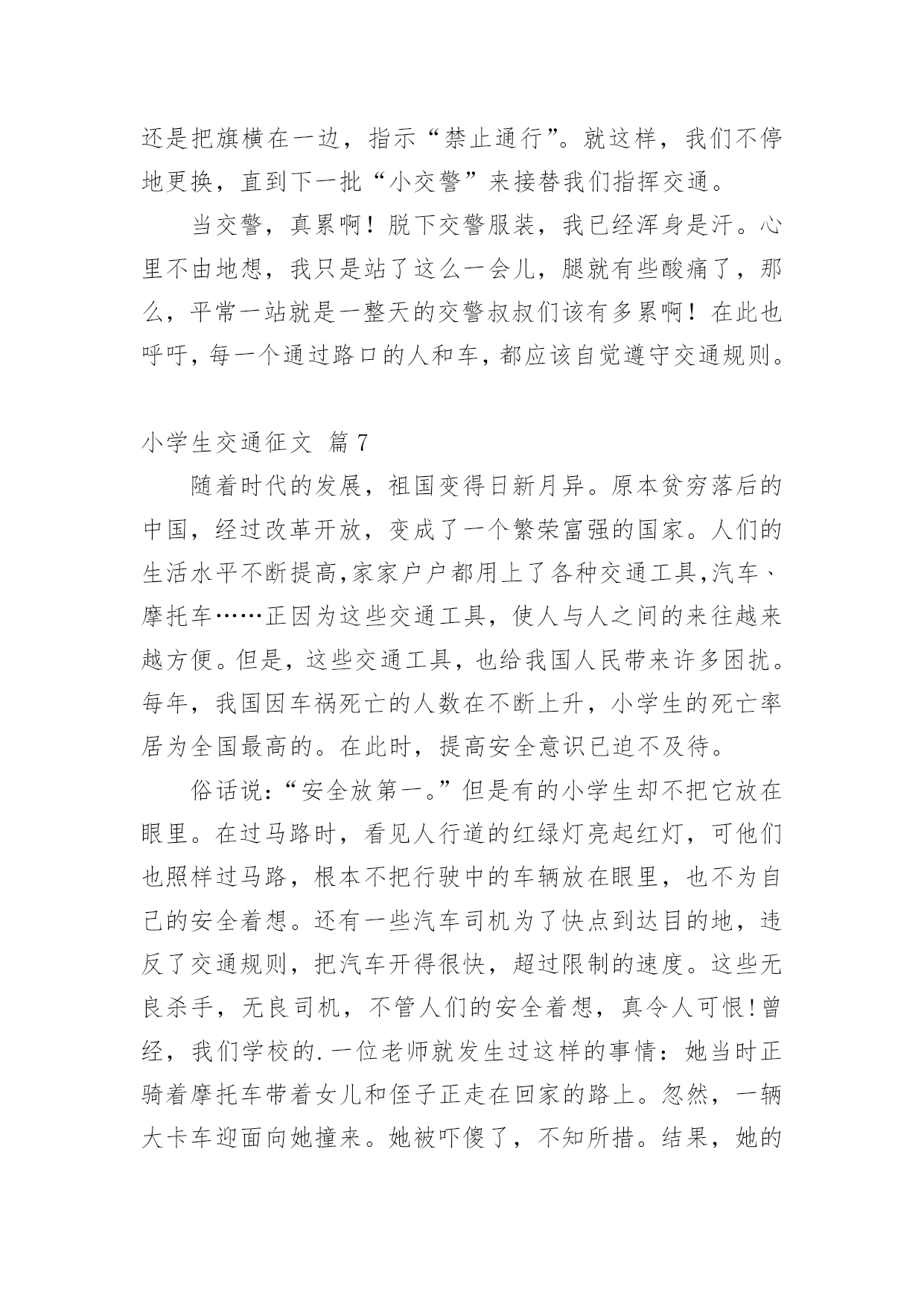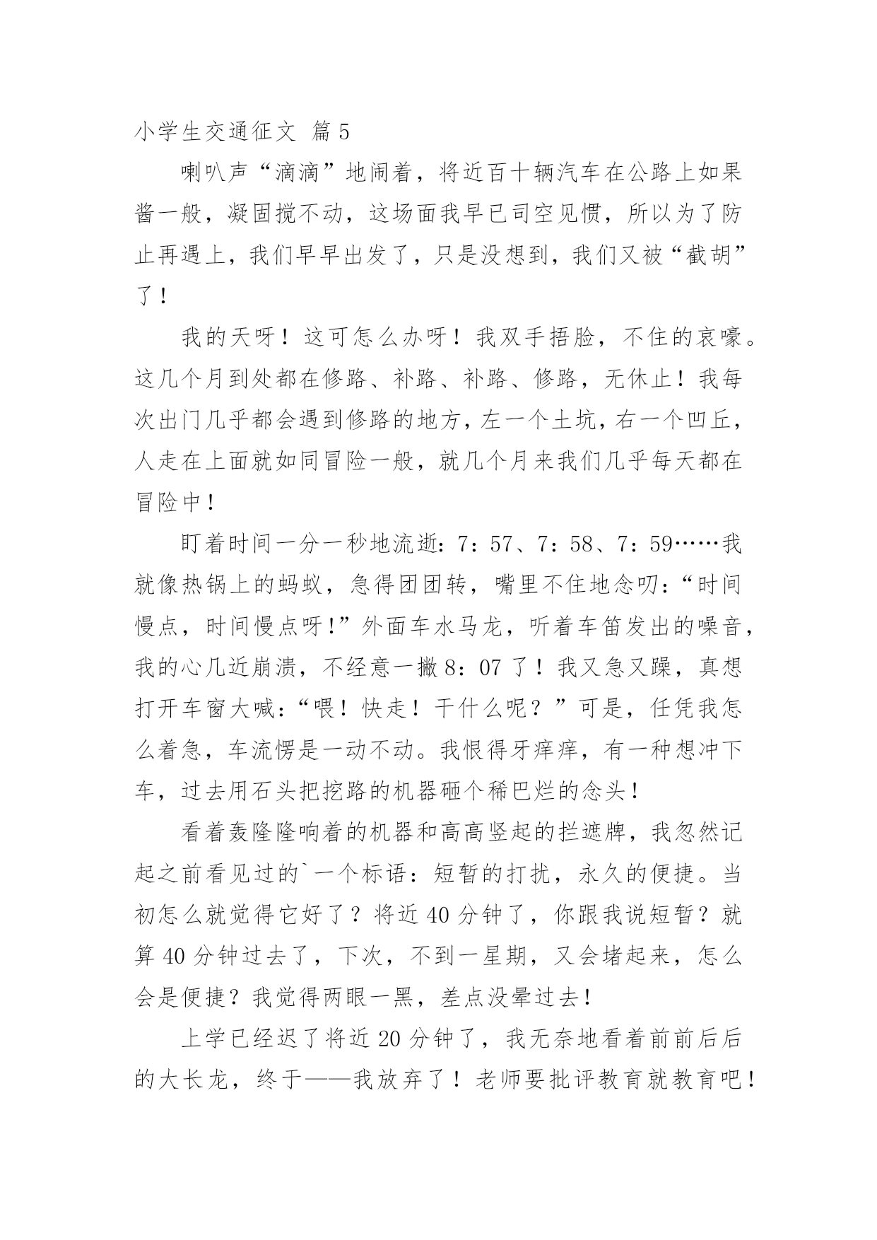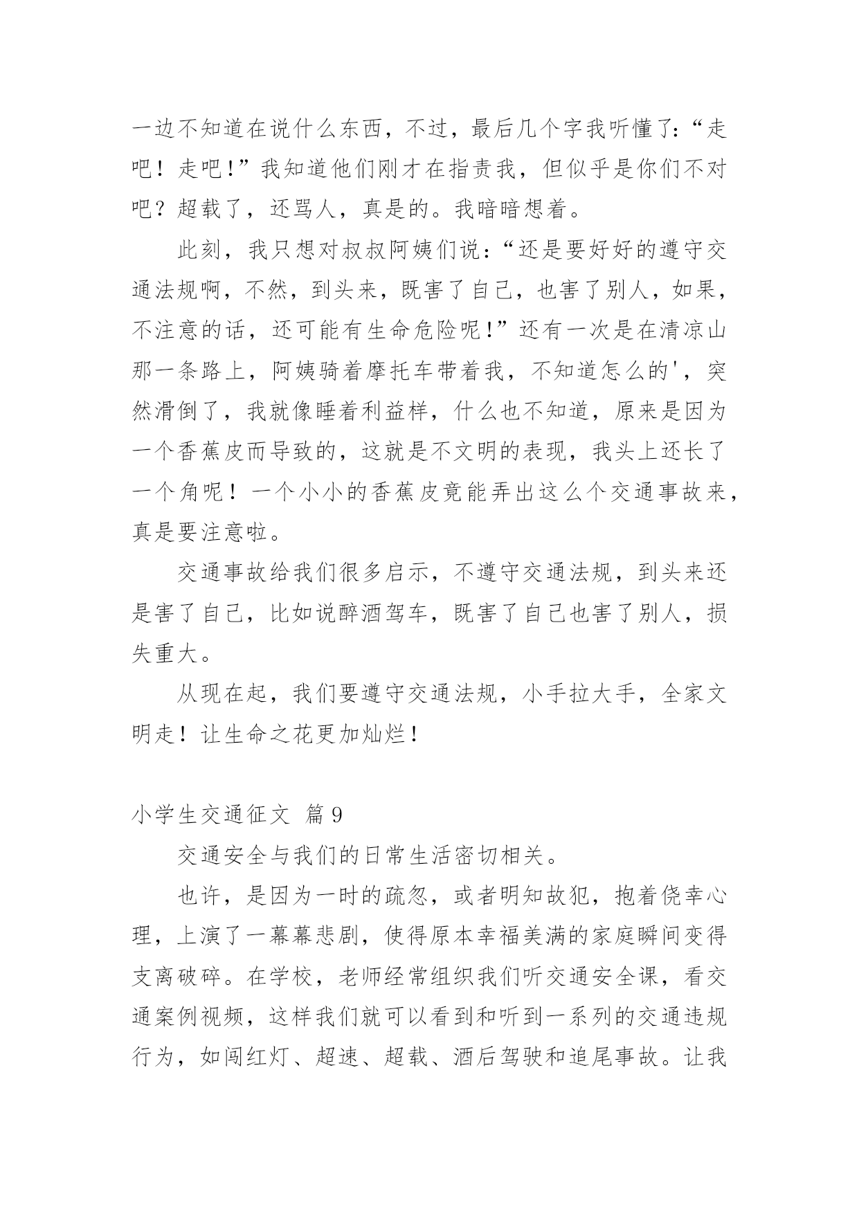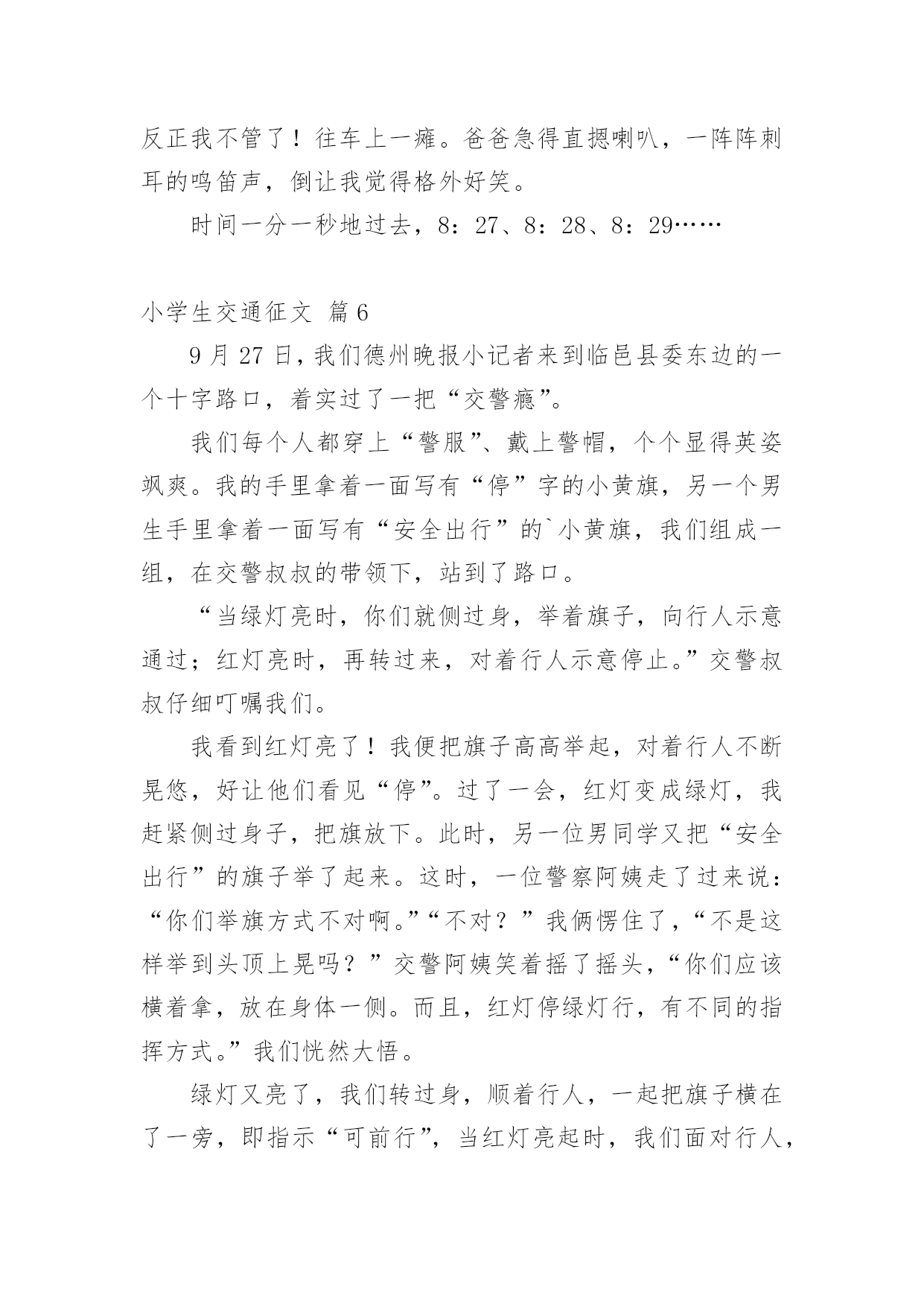 小学生交通征文小学生交通征文(通用69篇)在日复一日的学习、工作或生活中,大家总免不了要接触或使用征文吧,写征文是培养人们的观察力、联想力、想象力、思考力和记忆力的重要手段。如何写一篇有思想、有文采的征文呢?以下是小编为大家收集的小学生交通征文,仅供参考,大家一起来看看吧。小学生交通征文篇1随着科技的发展,社会的进步,人类的运输方式也越来越多元化。这样一个庞大的运输体系必定需要一部合理的法规来调控,才能正常运作。这便是《交通法规》,一部需要我们每个人用实际行动维护的法规。除了我们自己要注意“过马路走斑马线”,“不骑车带人”等基本的交通法规外,还应提醒自己的父母安全驾车。一部指导安全行车的《交通法规》并不是一纸简单的文字规定,它是人们从长期的交通实践中由几代人乃至数十代人的经验与血的教训中孕育而成,是指导每个驾驶员安全行车的宝贵财富,从广义上说,《交通法规》是每个交通参与者的宝贵财富。有一句交通安全宣传语说得好:“交通法规生命之友”。《交通法规》的作用是体现在方方面面的。比如:在交叉路口,为了保证各方行经路口的车辆都能有序地安全通过,防止拥挤、堵塞、交通事故的发生,就在路口设置红绿灯及相关信号设施。红灯是危险的信号,红灯是“鲜血”的象征、“死亡”的招唤,应该在我们的'思想上引起足够的重视,在红灯面前我们应该坚决地stop。只有绿灯才能带领我们进入安全的坦途,绿灯象征着“生命”与“平安”。我们要牢记:没有红灯的约束,就没有绿灯的通行。愿我们共同的努力,可以使交通更通畅,生活更安全。小学生交通征文篇2“红灯停,绿灯行”这连三岁小孩都知道的道理,而我们又有多少人能做到呢?看:行人视斑马线为装饰线;过马路时从中间翻越护栏;有时候甚至在交通警察的眼皮底下,车辆也会闯红绿灯;行人也会大摇大摆地横穿马路……随着社会的飞速发展,汽车成了人们的主要的交通工具,可就在它给我们带来了前所未有的方便同时,它也给我们带来了灾难:一个个鲜活的生命消失在飞驰的车轮下,一个个幸福美满的家庭转眼破碎不堪。的确,现在城市的马路上,车水马龙,川流不息,可就在这一片繁荣的背后,又隐藏着多大的危险呢?前不久,我在上学过马路时,绿灯亮了,我刚抬脚,正要往前走,突然,一辆轿车飞驰而来,“啊!”我一下子傻了眼,呆呆的站在了那儿,魂都丢了一半。要不是站在一旁的妈妈及时把我拉了回来,我还就真的就要被撞到了。“死人,就不会站边上点的!”汽车从我身边开过,我听见了一句刺耳的`话。“哎,妈你说这些开汽车的人怎么这样啊!闯红灯明明是他不对,还这么嚣张。”我跺着脚,生气地对妈妈说,“都不讲道理的。”“对啊,现在的年轻人,一个个就知道潇洒,连交通规则也不管了。”妈妈拍了拍我的肩膀说,“你以后过马路的时候也多看一看。好了,快去上学。”“嗯。”我使劲地点了点头。后来,在上学的路上我也在心里默默想道:如果全国每天都发生一次事故,那又会有多少像我这样的幸运儿,能逃过这次灾难呢?多么惊险的遭遇,这都是因为人们对交通安全的认识不深,没有自觉性造成的。同时,它也为我们的交通安全敲响了警钟。遵守交规,人人有责。作为一名小学生,我们要尽自己的绵薄之力,做到“小手牵大手,文明交通我先行。”为你、为我、为大家营造一个文明交通、畅通交通的和谐社会。小学生交通征文篇3“人最宝贵的、是生命,生命对于每个人只有一次。”现实生活中,许多人在一系列交通事故中丢失了生命。因而,遵守交通法规已经被人类广泛关注,让更多人了解、学习、遵守并运用交通法规已是刻不容缓。生活中交通安全与我们的关系是非常密切的,它就像我们的朋友。日日夜夜都守在我们的身边,教育我们,劝戒我们。关爱生命,关注安全。生命是宝贵的,人的一生就只有一次生命,我们应该爱惜生命。注意交通安全也是爱惜生命的'一部分。许多人认为,冲红灯、酒后开车、开摩托车不戴头盔、开汽车不系好安全带、开车打电话、疲劳驾驶……这都是小问题;但是许多交通事故都是由这些小问题而发生的。随着经济的日益发展,平湖已变得越来越美丽,马路上车辆川流不息的景象随处可见。然而由于有些人交通安全意识的淡薄,在车水马龙的马路上演了一幕幕不可挽回的悲剧。当你看到一个个鲜活的生命消失于车轮之下,当你发现一阵阵欢声笑语湮没在尖锐的汽笛声中,当你面对那些触目惊心的场景时,能不感到痛心疾首吗?交通事故其实是可以避免的,只要我们遵守交通规则,就不会发生交通事故。但是有些人就是不遵守交通规则,所以才导致了一起起交通事故。如有些人走路不靠右边走;明明是红灯,见到两边没人,就闯红灯;过马路不看旁边有没有车,就冲过去……虽然这些看起来都是鸡毛蒜皮的小事,但往往就是这些鸡毛蒜皮的小事引起了一些重大交通事故,给家庭、社会造成了很大损失。希望大家能够遵守交通规则。小学生交通征文篇4早晨,我和爸爸骑着自行车走在小区安静的小道上,我讲起