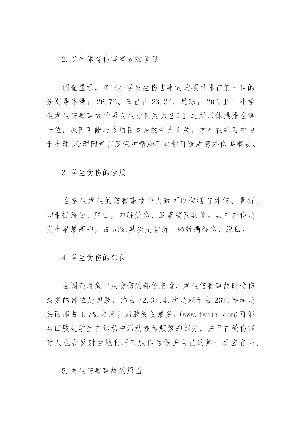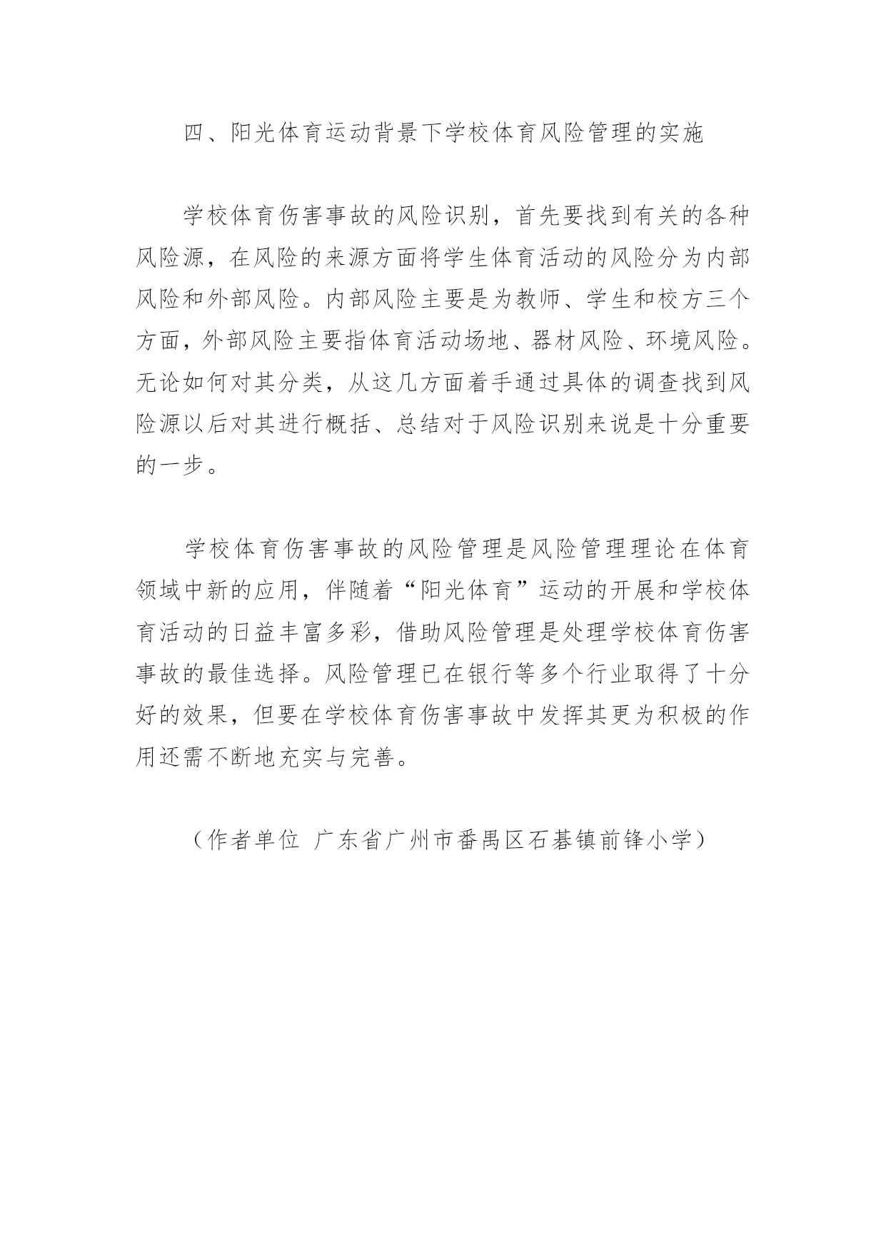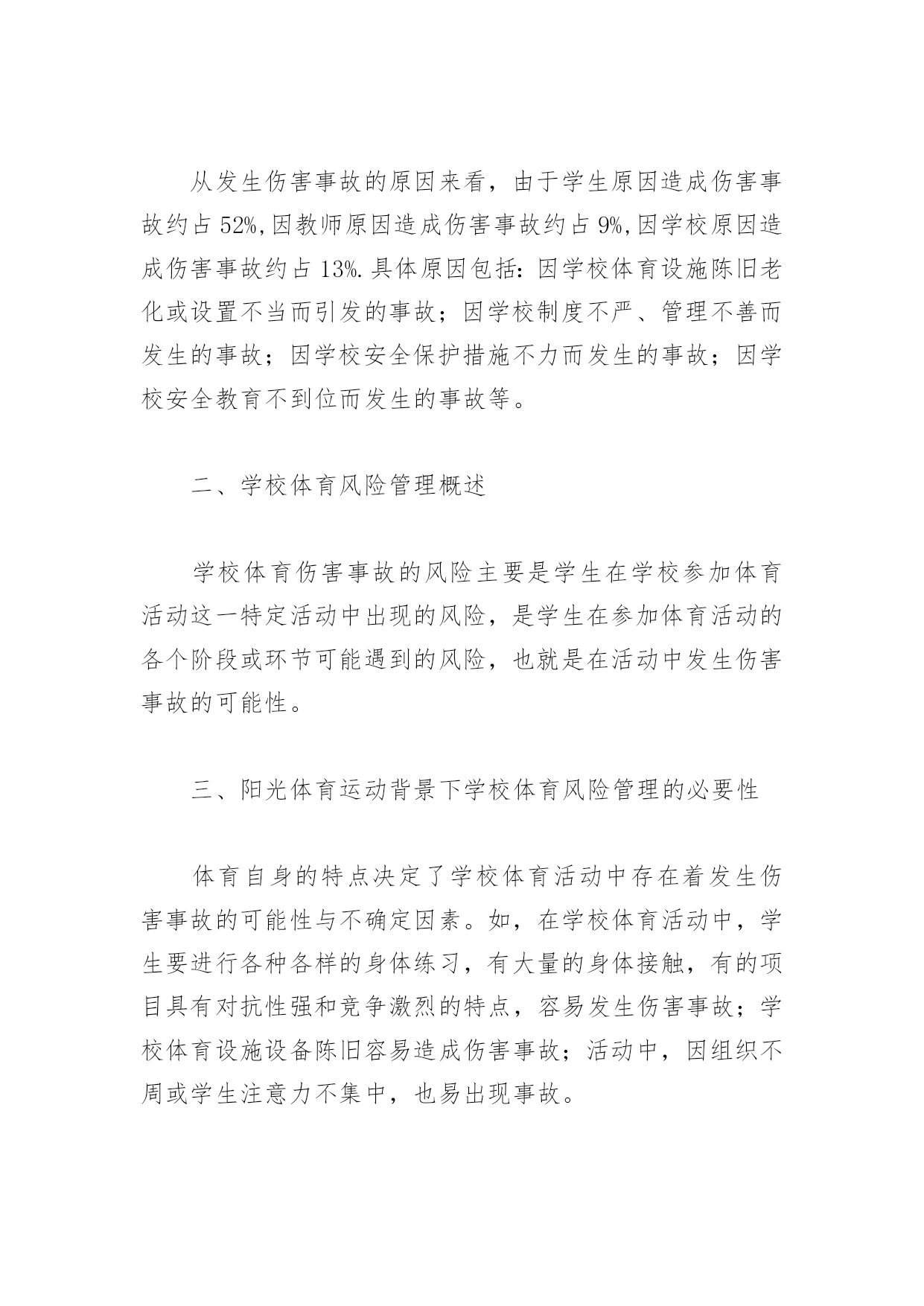 阳光体育运动论文实施“阳光体育运动”过程中学校体育风险管理的研究文/罗桂珍一、阳光体育运动背景下学校体育伤害事故的现状开展全国亿万青少年学生阳光体育运动,是新时期加强青少年体育、增强青少年体质的战略举措,将有利于形成人人参与、个个争先、生气勃勃的校园体育锻炼氛围和全员参与的群众性体育锻炼风气,吸引广大青少年学生走向操场,走进大自然,走到阳光下,积极主动参与体育锻炼。学生要进行各种各样的身体练习,有大量的身体接触,难免会发生伤害事故。为此,国家体育总局对《关于开展全国亿万学生阳光体育运动的通知》下发以来近两年学校体育伤害事故的现状进行了调查。1.发生体育伤害事故的频数在所有被调查的学生中,共有30%的学生在学校的体育活动中发生过伤害事故,其中发生一次伤害事故的占受伤学生的53%,发生两次伤害事故的占受伤学生的40%,还有7%的学生发生三次以上的伤害事故。2.发生体育伤害事故的项目调查显示,在中小学发生伤害事故的项目排在前三位的分别是体操占26.7%、田径占23.3%、足球占20%.且中小学生发生伤害事故的男女生比例约为2∶1.之所以体操排在第一位,原因可能与该项目本身的特点有关,学生在练习中由于生理、心理因素以及保护帮助不当都可造成意外伤害事故。3.学生受伤的性质在学生发生的伤害事故中大致可以包括有外伤、骨折、韧带撕裂伤、脱臼,内脏受伤、脑震荡及其他。其中外伤是发生率最高的,占51%,其次是骨折、韧带撕裂伤、脱臼。4.学生受伤的部位在调查对象中从受伤的部位来看,发生伤害事故时受伤最多的部位是四肢,约占72.3%,其次是躯干占23%,再者是头面部占4.7%.之所以四肢受伤最多,(www.fwsir.com)可能与四肢是学生在运动中活动最为频繁的部分,并且在受伤害时人也会反射性地利用四肢作为保护自己的第一反应有关。5.发生伤害事故的原因从发生伤害事故的原因来看,由于学生原因造成伤害事故约占52%,因教师原因造成伤害事故约占9%,因学校原因造成伤害事故约占13%.具体原因包括:因学校体育设施陈旧老化或设置不当而引发的事故;因学校制度不严、管理不善而发生的事故;因学校安全保护措施不力而发生的事故;因学校安全教育不到位而发生的事故等。二、学校体育风险管理概述学校体育伤害事故的风险主要是学生在学校参加体育活动这一特定活动中出现的风险,是学生在参加体育活动的各个阶段或环节可能遇到的风险,也就是在活动中发生伤害事故的可能性。三、阳光体育运动背景下学校体育风险管理的必要性体育自身的特点决定了学校体育活动中存在着发生伤害事故的可能性与不确定因素。如,在学校体育活动中,学生要进行各种各样的身体练习,有大量的身体接触,有的项目具有对抗性强和竞争激烈的特点,容易发生伤害事故;学校体育设施设备陈旧容易造成伤害事故;活动中,因组织不周或学生注意力不集中,也易出现事故。四、阳光体育运动背景下学校体育风险管理的实施学校体育伤害事故的风险识别,首先要找到有关的各种风险源,在风险的来源方面将学生体育活动的风险分为内部风险和外部风险。内部风险主要是为教师、学生和校方三个方面,外部风险主要指体育活动场地、器材风险、环境风险。无论如何对其分类,从这几方面着手通过具体的调查找到风险源以后对其进行概括、总结对于风险识别来说是十分重要的一步。学校体育伤害事故的风险管理是风险管理理论在体育领域中新的应用,伴随着“阳光体育”运动的开展和学校体育活动的日益丰富多彩,借助风险管理是处理学校体育伤害事故的最佳选择。风险管理已在银行等多个行业取得了十分好的效果,但要在学校体育伤害事故中发挥其更为积极的作用还需不断地充实与完善。(作者单位广东省广州市番禺区石碁镇前锋小学)