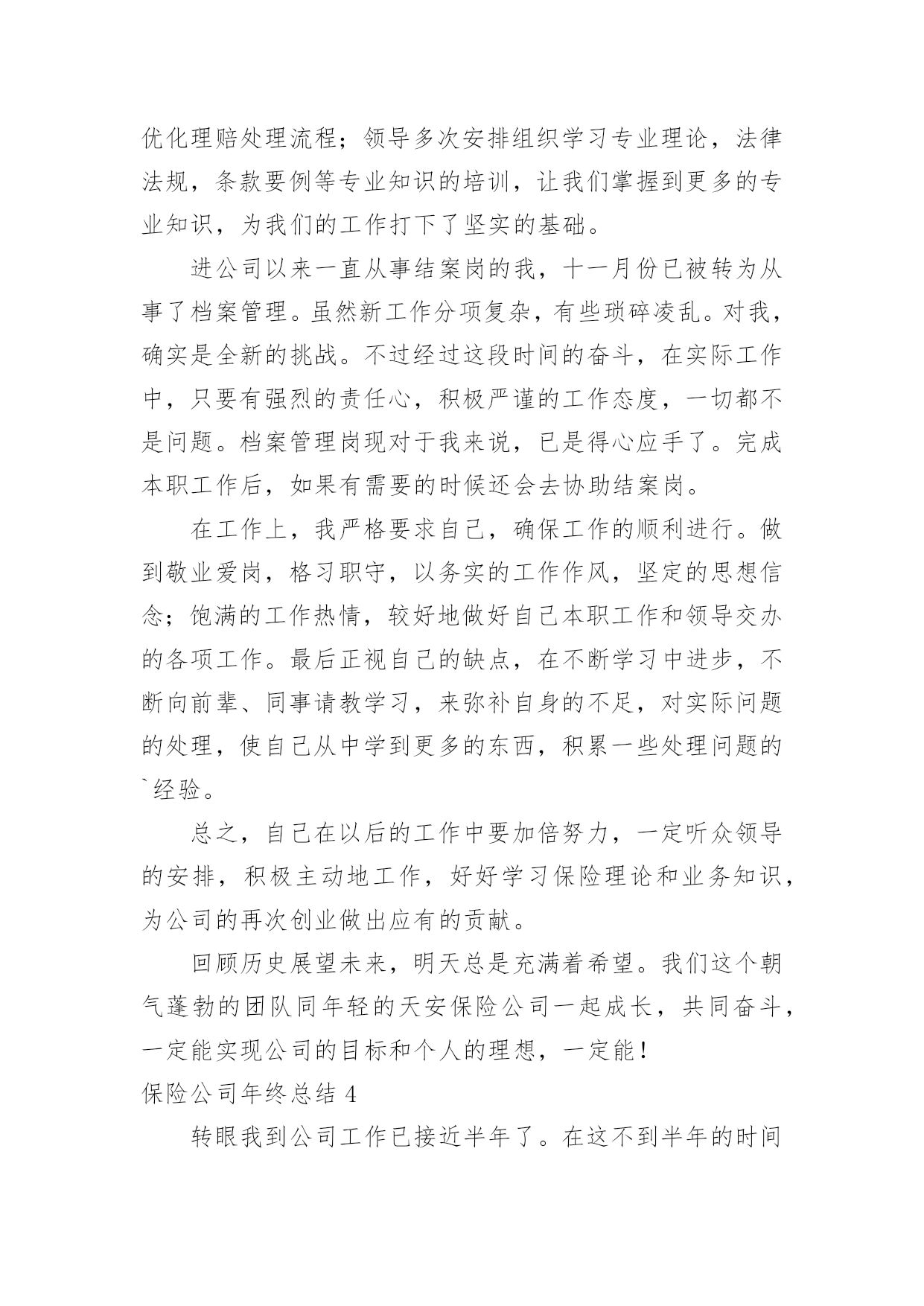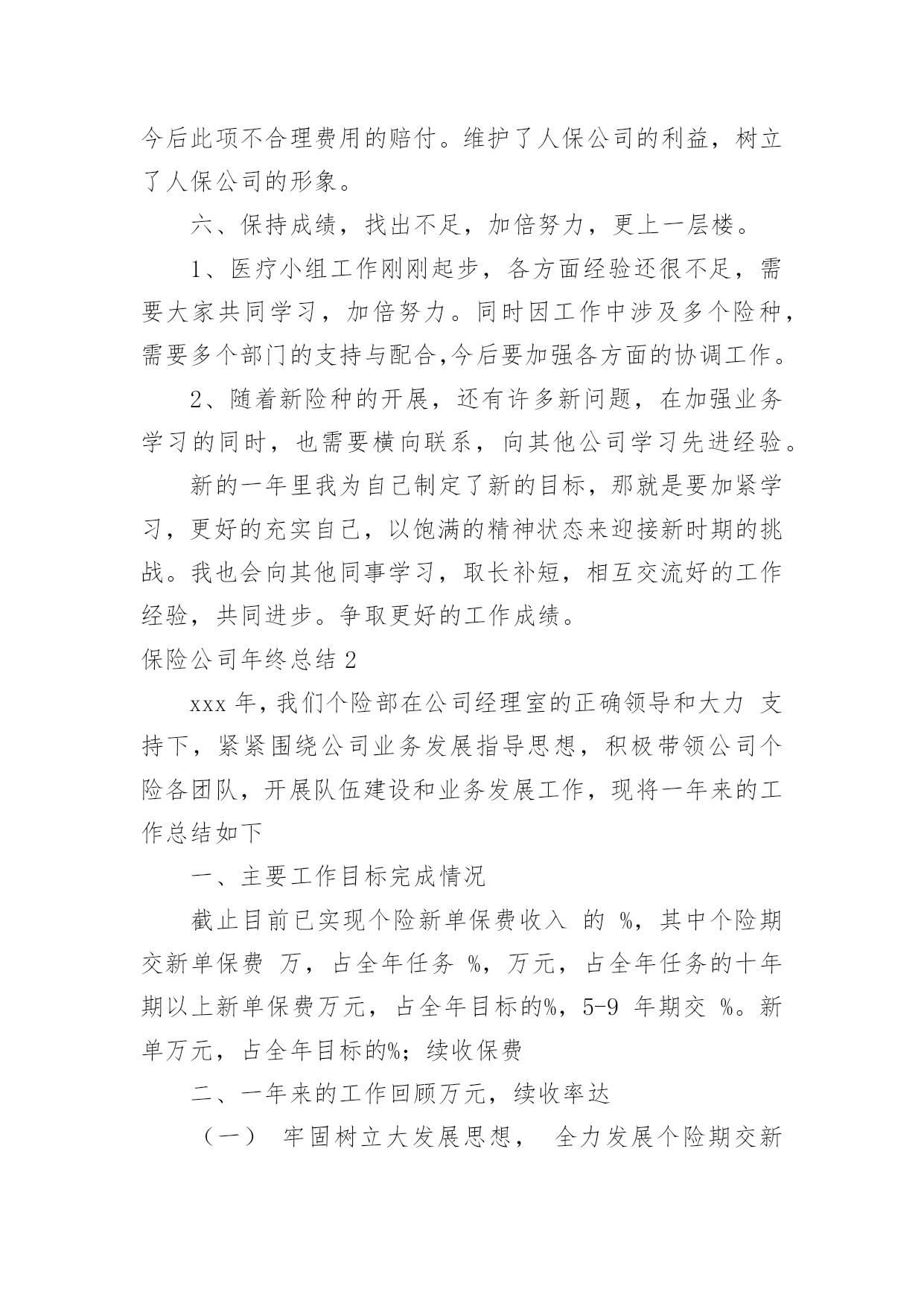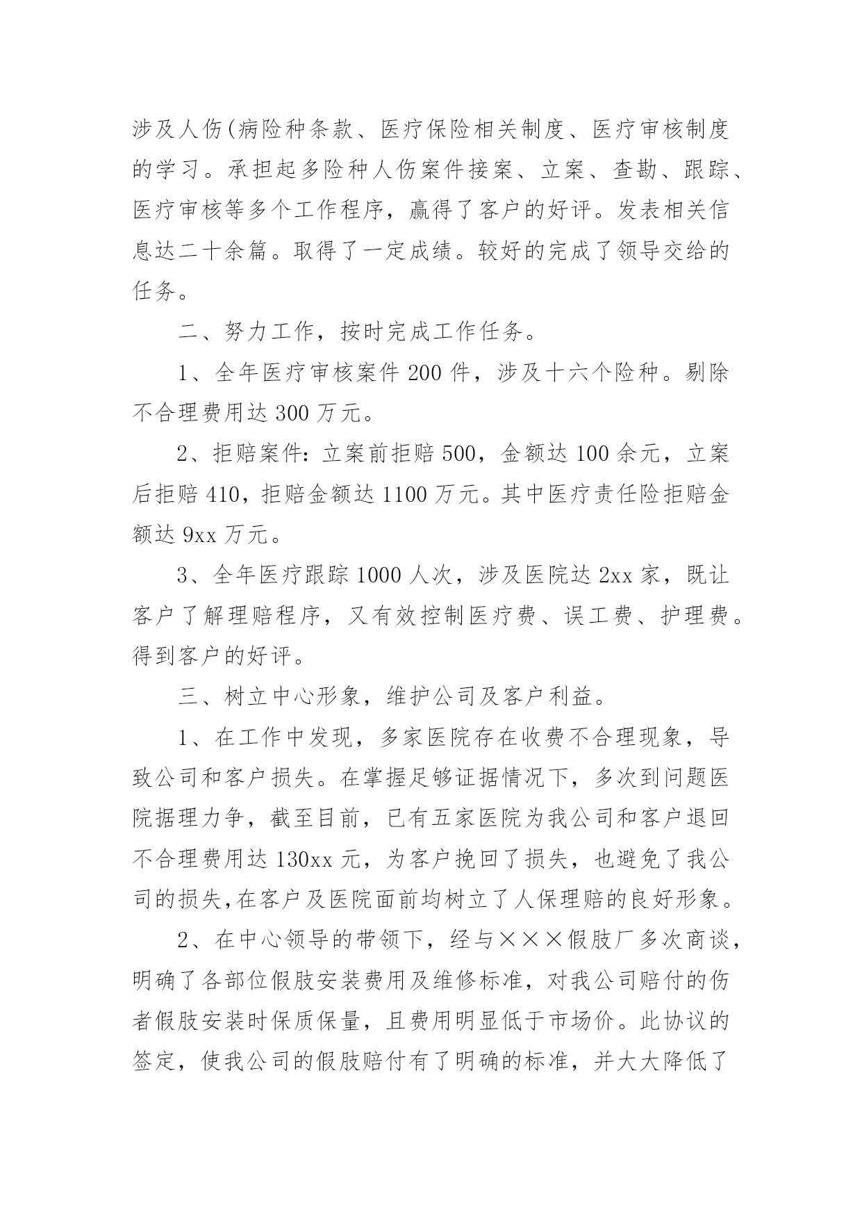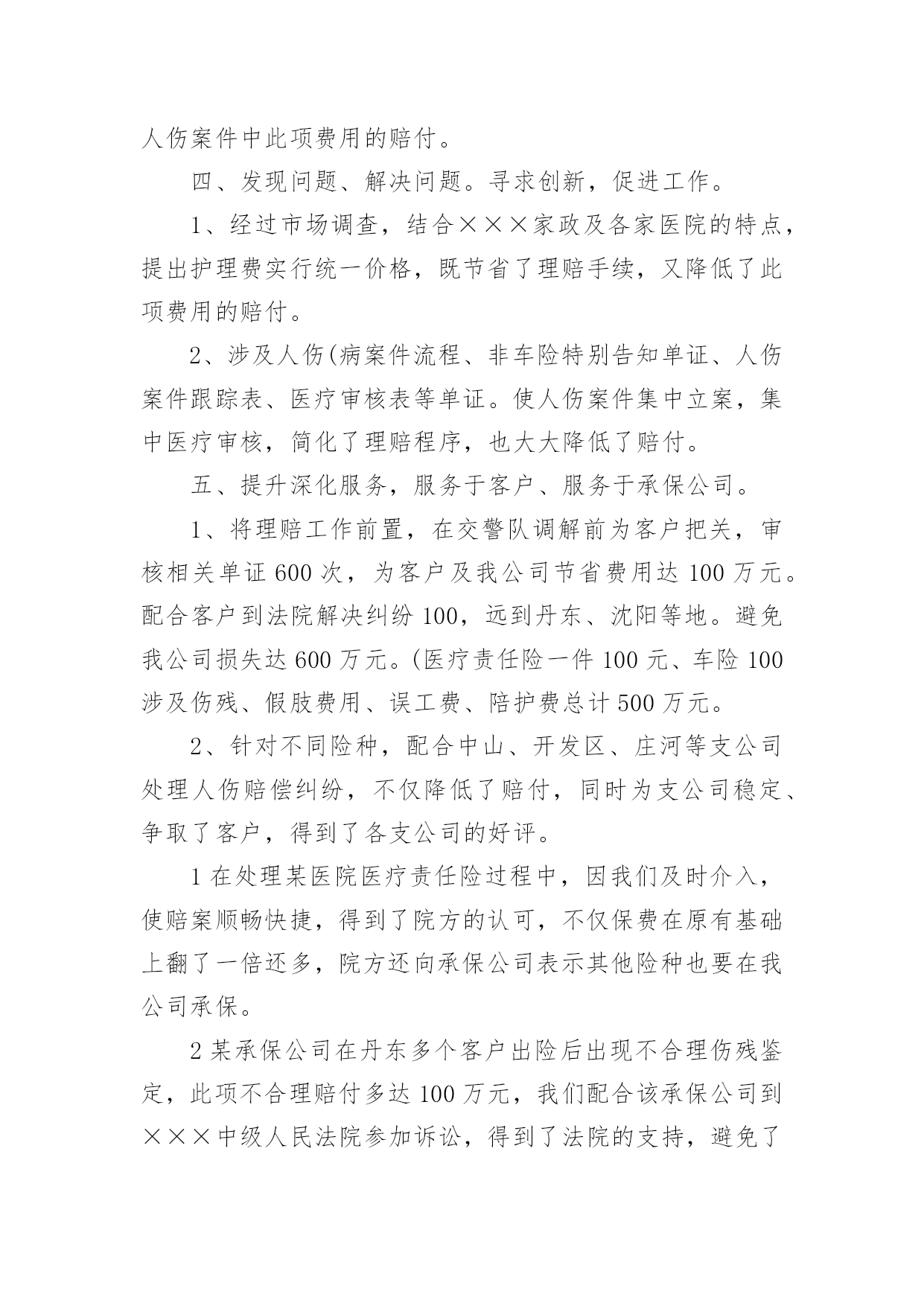 保险公司年终总结保险公司年终总结总结就是把一个时段的学习、工作或其完成情况进行一次全面系统的总结,它能够使头脑更加清醒,目标更加明确,快快来写一份总结吧。总结怎么写才能发挥它的作用呢?以下是小编整理的保险公司年终总结,欢迎大家分享。保险公司年终总结1又到年终岁尾,回首过去的一年,內心不禁感慨万千……时间如梭,转眼间又将跨过一个年度之坎,回首望,虽沒有轰轰烈烈的战果,但也算经历了一段不平凡的考验和磨砺。非常感谢公司给我这个成长的平台,令我在工作中不断的学习,不断的进步,慢慢的提升自身的素质与才能。回首过往,中心陪伴我走过人生很重要的一个阶段,使我懂得了很多,领导对我的支持与关爱,同事们的鼎力协助,使我在工作中更加的'得心应手,在此我向中心的领导以及全体同事表示最衷心的感谢。同时也将近一年的工作向大家做以汇报。一、严于律已,团结同志。以身作则,任劳任怨。在工作中严格要求自己,响应中心各项号召,积极参加公司的各项活动。克服种种困难,不计个人得失,在工作设施不齐全、人员业务不熟练的情况下,带领医疗小组人员从头做起,加班加点学习业务知识,在短时间内完成了十五个涉及人伤(病险种条款、医疗保险相关制度、医疗审核制度的学习。承担起多险种人伤案件接案、立案、查勘、跟踪、医疗审核等多个工作程序,赢得了客户的好评。发表相关信息达二十余篇。取得了一定成绩。较好的完成了领导交给的任务。二、努力工作,按时完成工作任务。1、全年医疗审核案件200件,涉及十六个险种。剔除不合理费用达300万元。2、拒赔案件:立案前拒赔500,金额达100余元,立案后拒赔410,拒赔金额达1100万元。其中医疗责任险拒赔金额达9xx万元。3、全年医疗跟踪1000人次,涉及医院达2xx家,既让客户了解理赔程序,又有效控制医疗费、误工费、护理费。得到客户的好评。三、树立中心形象,维护公司及客户利益。1、在工作中发现,多家医院存在收费不合理现象,导致公司和客户损失。在掌握足够证据情况下,多次到问题医院据理力争,截至目前,已有五家医院为我公司和客户退回不合理费用达130xx元,为客户挽回了损失,也避免了我公司的损失,在客户及医院面前均树立了人保理赔的良好形象。2、在中心领导的带领下,经与×××假肢厂多次商谈,明确了各部位假肢安装费用及维修标准,对我公司赔付的伤者假肢安装时保质保量,且费用明显低于市场价。此协议的签定,使我公司的假肢赔付有了明确的标准,并大大降低了人伤案件中此项费用的赔付。四、发现问题、解决问题。寻求创新,促进工作。1、经过市场调查,结合×××家政及各家医院的特点,提出护理费实行统一价格,既节省了理赔手续,又降低了此项费用的赔付。2、涉及人伤(病案件流程、非车险特别告知单证、人伤案件跟踪表、医疗审核表等单证。使人伤案件集中立案,集中医疗审核,简化了理赔程序,也大大降低了赔付。五、提升深化服务,服务于客户、服务于承保公司。1、将理赔工作前置,在交警队调解前为客户把关,审核相关单证600次,为客户及我公司节省费用达100万元。配合客户到法院解决纠纷100,远到丹东、沈阳等地。避免我公司损失达600万元。(医疗责任险一件100元、车险100涉及伤残、假肢费用、误工费、陪护费总计500万元。2、针对不同险种,配合中山、开发区、庄河等支公司处理人伤赔偿纠纷,不仅降低了赔付,同时为支公司稳定、争取了客户,得到了各支公司的好评。1在处理某医院医疗责任险过程中,因我们及时介入,使赔案顺畅快捷,得到了院方的认可,不仅保费在原有基础上翻了一倍还多,院方还向承保公司表示其他险种也要在我公司承保。2某承保公司在丹东多个客户出险后出现不合理伤残鉴定,此项不合理赔付多达100万元,我们配合该承保公司到×××中级人民法院参加诉讼,得到了法院的支持,避免了今后此项不合理费用的赔付。维护了人保公司的利益,树立了人保公司的形象。六、保持成绩,找出不足,加倍努力,更上一层楼。1、医疗小组工作刚刚起步,各方面经验还很不足,需要大家共同学习,加倍努力。同时因工作中涉及多个险种,需要多个部门的支持与配合,今后要加强各方面的协调工作。2、随着新险种的开展,还有许多新问题,在加强业务学习的同时,也需要横向联系,向其他公司学习先进经验。新的一年里我为自己制定了新的目标,那就是要加紧学习,更好的充实自己,以饱满的精神状态来迎接新时期的挑战。我也会向其他同事学习,取长补短,相互交流好的工作经验,共同进步。争取更好的工作成绩。保险公司年终总结2xxx年,我们个险部在公司经理室的正确领导和大力支持下,紧紧围绕公司业务发展指导思想,积极带领公司个险各团队,开展队伍建设和业务发展工作,现将一年来的工作总结如下一、主要工作目标完成情况截止目前已实现个险新单保费收入的%,其中个险期交新单保费万,占全年任务%,万元,占全年任务的十年