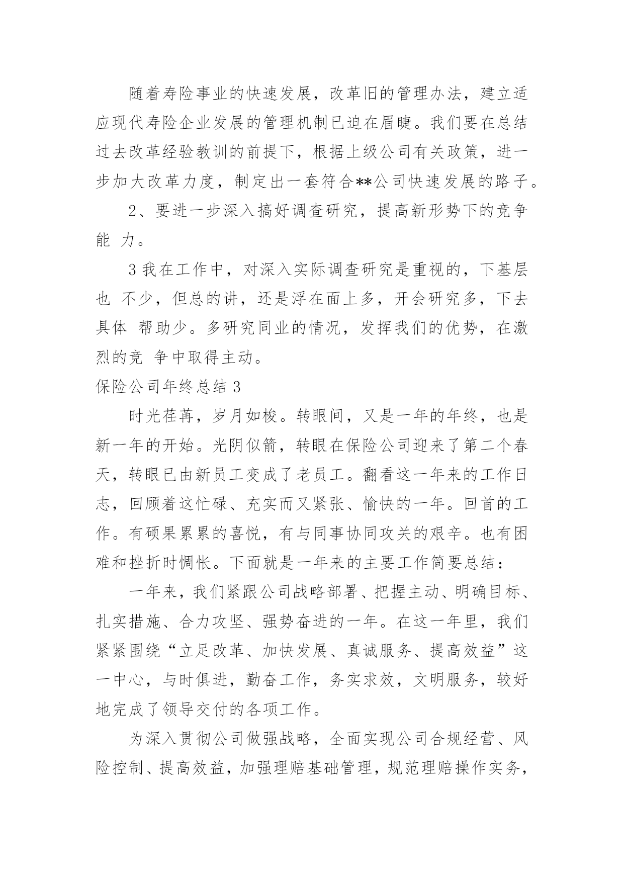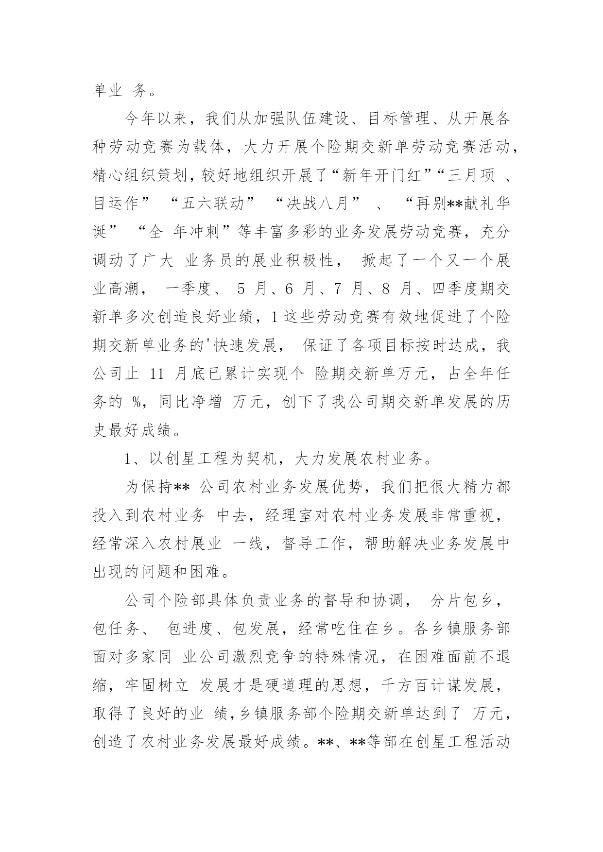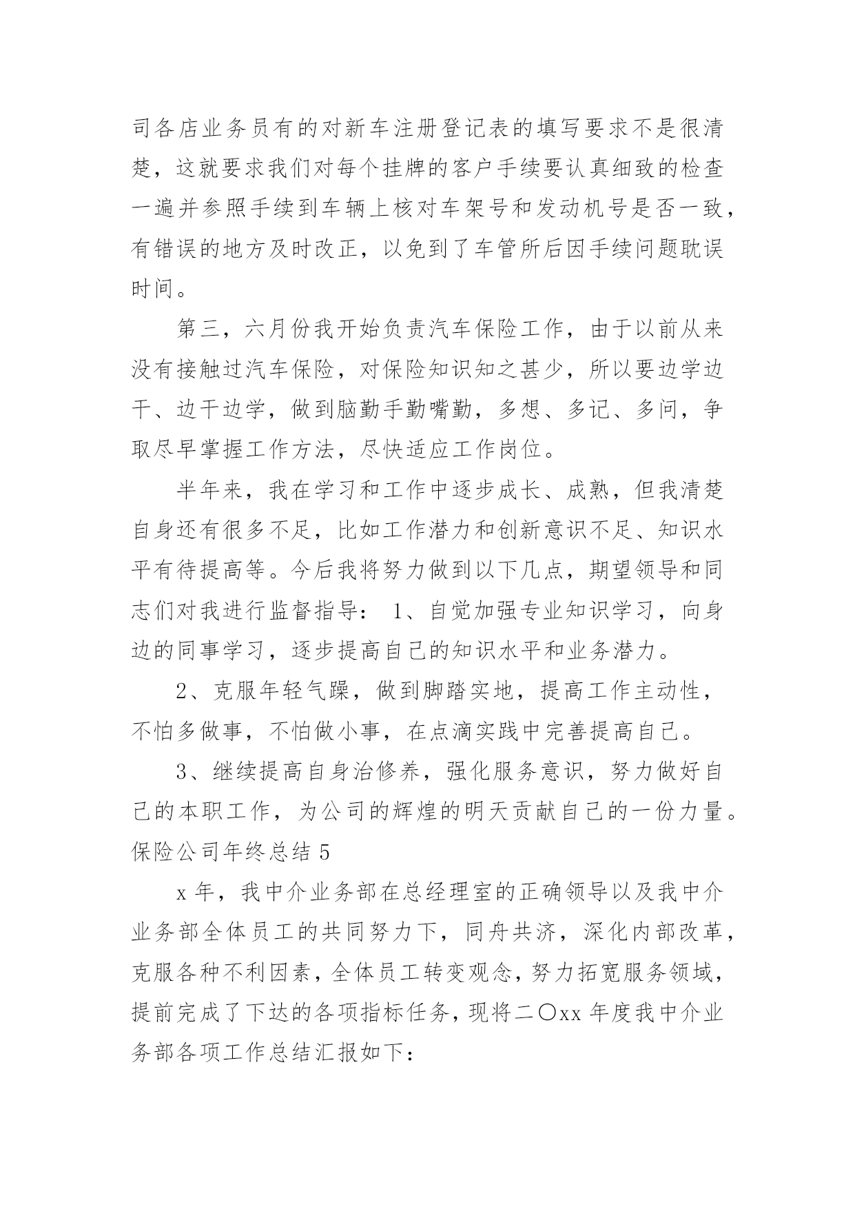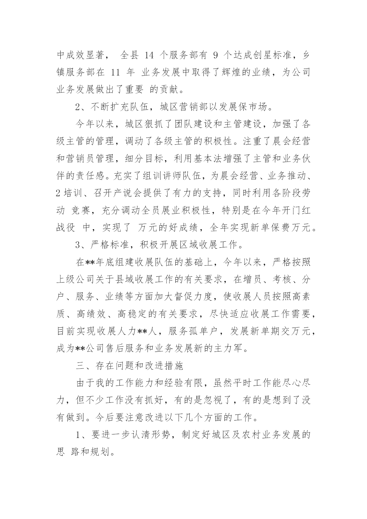 保险公司年终总结保险公司年终总结总结就是把一个时段的学习、工作或其完成情况进行一次全面系统的总结,它能够使头脑更加清醒,目标更加明确,快快来写一份总结吧。总结怎么写才能发挥它的作用呢?以下是小编整理的保险公司年终总结,欢迎大家分享。保险公司年终总结1又到年终岁尾,回首过去的一年,內心不禁感慨万千……时间如梭,转眼间又将跨过一个年度之坎,回首望,虽沒有轰轰烈烈的战果,但也算经历了一段不平凡的考验和磨砺。非常感谢公司给我这个成长的平台,令我在工作中不断的学习,不断的进步,慢慢的提升自身的素质与才能。回首过往,中心陪伴我走过人生很重要的一个阶段,使我懂得了很多,领导对我的支持与关爱,同事们的鼎力协助,使我在工作中更加的'得心应手,在此我向中心的领导以及全体同事表示最衷心的感谢。同时也将近一年的工作向大家做以汇报。一、严于律已,团结同志。以身作则,任劳任怨。在工作中严格要求自己,响应中心各项号召,积极参加公司的各项活动。克服种种困难,不计个人得失,在工作设施不齐全、人员业务不熟练的情况下,带领医疗小组人员从头做起,加班加点学习业务知识,在短时间内完成了十五个涉及人伤(病险种条款、医疗保险相关制度、医疗审核制度的学习。承担起多险种人伤案件接案、立案、查勘、跟踪、医疗审核等多个工作程序,赢得了客户的好评。发表相关信息达二十余篇。取得了一定成绩。较好的完成了领导交给的任务。二、努力工作,按时完成工作任务。1、全年医疗审核案件200件,涉及十六个险种。剔除不合理费用达300万元。2、拒赔案件:立案前拒赔500,金额达100余元,立案后拒赔410,拒赔金额达1100万元。其中医疗责任险拒赔金额达9xx万元。3、全年医疗跟踪1000人次,涉及医院达2xx家,既让客户了解理赔程序,又有效控制医疗费、误工费、护理费。得到客户的好评。三、树立中心形象,维护公司及客户利益。1、在工作中发现,多家医院存在收费不合理现象,导致公司和客户损失。在掌握足够证据情况下,多次到问题医院据理力争,截至目前,已有五家医院为我公司和客户退回不合理费用达130xx元,为客户挽回了损失,也避免了我公司的损失,在客户及医院面前均树立了人保理赔的良好形象。2、在中心领导的带领下,经与×××假肢厂多次商谈,明确了各部位假肢安装费用及维修标准,对我公司赔付的伤者假肢安装时保质保量,且费用明显低于市场价。此协议的签定,使我公司的假肢赔付有了明确的标准,并大大降低了人伤案件中此项费用的赔付。四、发现问题、解决问题。寻求创新,促进工作。1、经过市场调查,结合×××家政及各家医院的特点,提出护理费实行统一价格,既节省了理赔手续,又降低了此项费用的赔付。2、涉及人伤(病案件流程、非车险特别告知单证、人伤案件跟踪表、医疗审核表等单证。使人伤案件集中立案,集中医疗审核,简化了理赔程序,也大大降低了赔付。五、提升深化服务,服务于客户、服务于承保公司。1、将理赔工作前置,在交警队调解前为客户把关,审核相关单证600次,为客户及我公司节省费用达100万元。配合客户到法院解决纠纷100,远到丹东、沈阳等地。避免我公司损失达600万元。(医疗责任险一件100元、车险100涉及伤残、假肢费用、误工费、陪护费总计500万元。2、针对不同险种,配合中山、开发区、庄河等支公司处理人伤赔偿纠纷,不仅降低了赔付,同时为支公司稳定、争取了客户,得到了各支公司的好评。1在处理某医院医疗责任险过程中,因我们及时介入,使赔案顺畅快捷,得到了院方的认可,不仅保费在原有基础上翻了一倍还多,院方还向承保公司表示其他险种也要在我公司承保。2某承保公司在丹东多个客户出险后出现不合理伤残鉴定,此项不合理赔付多达100万元,我们配合该承保公司到×××中级人民法院参加诉讼,得到了法院的支持,避免了今后此项不合理费用的赔付。维护了人保公司的利益,树立了人保公司的形象。六、保持成绩,找出不足,加倍努力,更上一层楼。1、医疗小组工作刚刚起步,各方面经验还很不足,需要大家共同学习,加倍努力。同时因工作中涉及多个险种,需要多个部门的支持与配合,今后要加强各方面的协调工作。2、随着新险种的开展,还有许多新问题,在加强业务学习的同时,也需要横向联系,向其他公司学习先进经验。新的一年里我为自己制定了新的目标,那就是要加紧学习,更好的充实自己,以饱满的精神状态来迎接新时期的挑战。我也会向其他同事学习,取长补短,相互交流好的工作经验,共同进步。争取更好的工作成绩。保险公司年终总结2xxx年,我们个险部在公司经理室的正确领导和大力支持下,紧紧围绕公司业务发展指导思想,积极带领公司个险各团队,开展队伍建设和业务发展工作,现将一年来的工作总结如下一、主要工作目标完成情况截止目前已实现个险新单保费收入的%,其中个险期交新单保费万,占全年任务%,万元,占全年任务的十年
