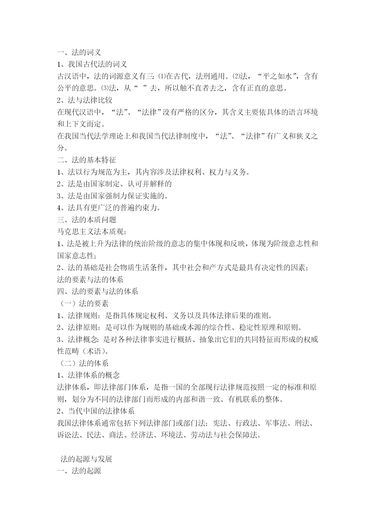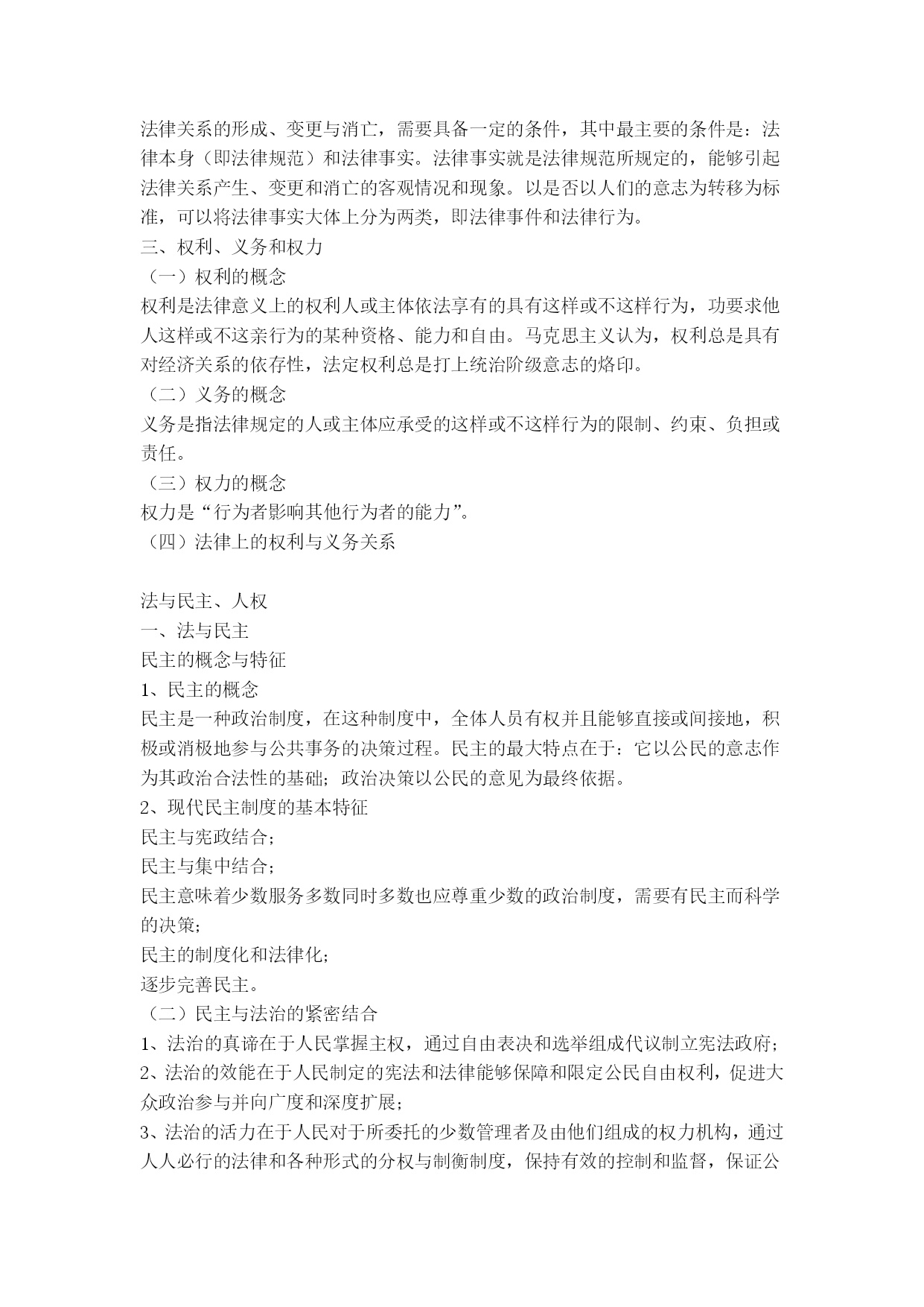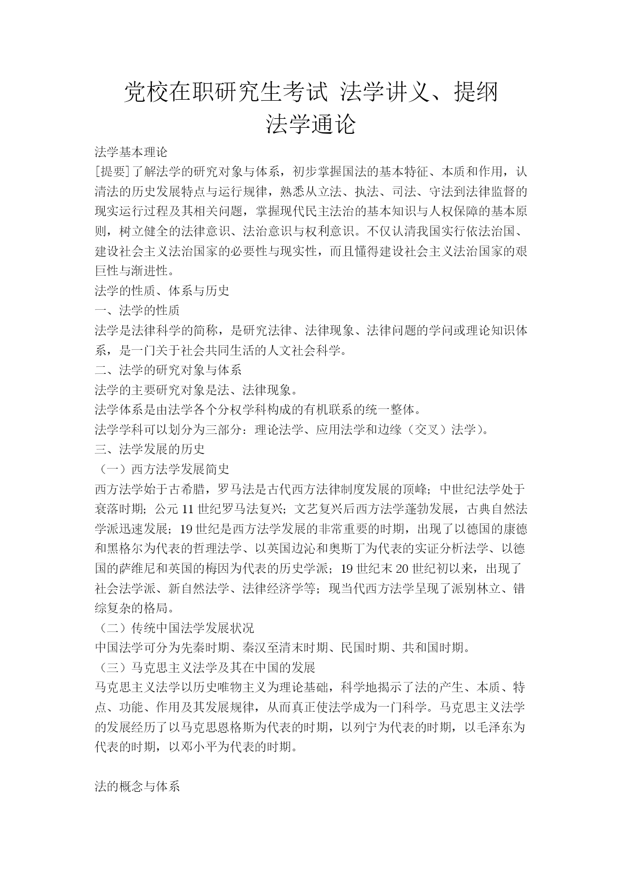 党校在职研究生考试法学讲义、提纲法学通论法学基本理论[提要]了解法学的研究对象与体系,初步掌握国法的基本特征、本质和作用,认清法的历史发展特点与运行规律,熟悉从立法、执法、司法、守法到法律监督的现实运行过程及其相关问题,掌握现代民主法治的基本知识与人权保障的基本原则,树立健全的法律意识、法治意识与权利意识。不仅认清我国实行依法治国、建设社会主义法治国家的必要性与现实性,而且懂得建设社会主义法治国家的艰巨性与渐进性。法学的性质、体系与历史一、法学的性质法学是法律科学的简称,是研究法律、法律现象、法律问题的学问或理论知识体系,是一门关于社会共同生活的人文社会科学。二、法学的研究对象与体系法学的主要研究对象是法、法律现象。法学体系是由法学各个分权学科构成的有机联系的统一整体。法学学科可以划分为三部分:理论法学、应用法学和边缘(交叉)法学)。三、法学发展的历史(一)西方法学发展简史西方法学始于古希腊,罗马法是古代西方法律制度发展的顶峰;中世纪法学处于衰落时期;公元11世纪罗马法复兴;文艺复兴后西方法学蓬勃发展,古典自然法学派迅速发展;19世纪是西方法学发展的非常重要的时期,出现了以德国的康德和黑格尔为代表的哲理法学、以英国边沁和奥斯丁为代表的实证分析法学、以德国的萨维尼和英国的梅因为代表的历史学派;19世纪末20世纪初以来,出现了社会法学派、新自然法学、法律经济学等;现当代西方法学呈现了派别林立、错综复杂的格局。(二)传统中国法学发展状况中国法学可分为先秦时期、秦汉至清末时期、民国时期、共和国时期。(三)马克思主义法学及其在中国的发展马克思主义法学以历史唯物主义为理论基础,科学地揭示了法的产生、本质、特点、功能、作用及其发展规律,从而真正使法学成为一门科学。马克思主义法学的发展经历了以马克思恩格斯为代表的时期,以列宁为代表的时期,以毛泽东为代表的时期,以邓小平为代表的时期。法的概念与体系一、法的词义1、我国古代法的词义古汉语中,法的词源意义有三:⑴在古代,法刑通用。⑵法,“平之如水”,含有公平的意思。⑶法,从“”去,所以触不直者去之,含有正直的意思。2、法与法律比较在现代汉语中,“法”、“法律”没有严格的区分,其含义主要依具体的语言环境和上下文而定。在我国当代法学理论上和我国当代法律制度中,“法”、“法律”有广义和狭义之分。二、法的基本特征1、法以行为规范为主,其内容涉及法律权利、权力与义务。2、法是由国家制定、认可并解释的3、法是由国家强制力保证实施的。4、法具有更广泛的普遍约束力。三、法的本质问题马克思主义法本质观:1、法是被上升为法律的统治阶级的意志的集中体现和反映,体现为阶级意志性和国家意志性;2、法的基础是社会物质生活条件,其中社会和产方式是最具有决定性的因素;法的要素与法的体系四、法的要素与法的体系(一)法的要素1、法律规则:是指具体规定权利、义务以及具体法律后果的准则。2、法律原则:是可以作为规则的基础或本源的综合性、稳定性原理和原则。3、法律概念:是对各种法律事实进行概括、抽象出它们的共同特征而形成的权威性范畴(术语)。(二)法的体系1、法律体系的概念法律体系,即法律部门体系,是指一国的全部现行法律规范按照一定的标准和原则,划分为不同的法律部门而形成的内部和谐一致、有机联系的整体。2、当代中国的法律体系我国法律体系通常包括下列法律部门或部门法:宪法、行政法、军事法、刑法、诉讼法、民法、商法、经济法、环境法、劳动法与社会保障法。法的起源与发展一、法的起源法是人类社会发展到一定历史时期的产物。法产生的一般规律:对人们的行为的调整方式逐渐从个别调整到规范性调整,从规范性调整再到法律调整;法律的形式经历了由习惯到习惯法、又从习惯法到成文法的漫长发展过程;由自发调整到自觉调整;从法与宗教、道德不分,到法与宗教、道德分开的过程。二、法发展的历史类型(一)法的历史类型的概念与种类法的历史类型是指依法所赖以建立的经济基础和法所体现的阶级意志的不同所作的分类。人类历史上,有四种不同历史类型的法,即奴隶制法、封建制法、资本主义法和社会主义法。前三种统称为私有制社会的法。(二)法的历史类型的更替三、两大法系法系是按照世界上各个国家和地区法律的源流关系、历史传统及形式上某些特点对法律所作的分类。(一)大陆法系:1、概念:又称民法法系,罗马法系,罗马德意志法系,日尔曼法系,法典法系,成文法法系等。指法国、德国等欧洲大陆国家在罗马法基础上,以1804年法国民法典(拿破仑称帝期间制定)和1896年德国民法典为代表的法律,以及在其法律传统影响下依照它们而形成、发展起来的西方各国法律体系的总称。2、特点:法律成文化和法典化;不承认法官