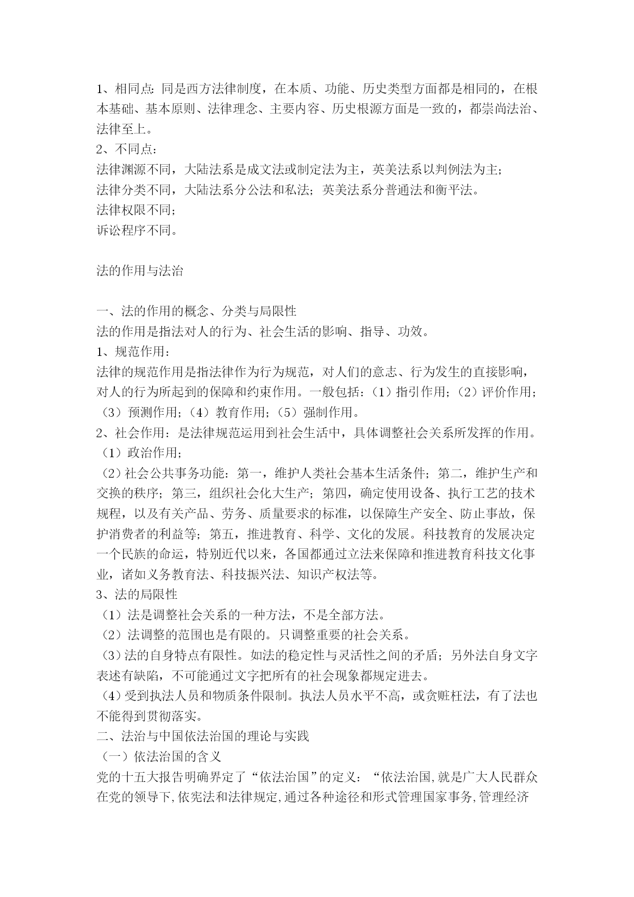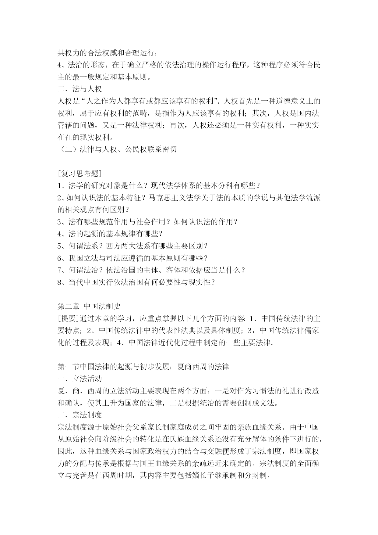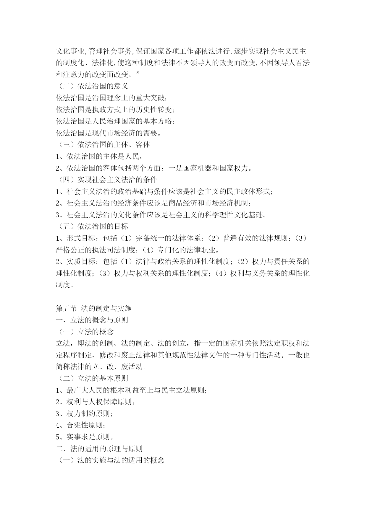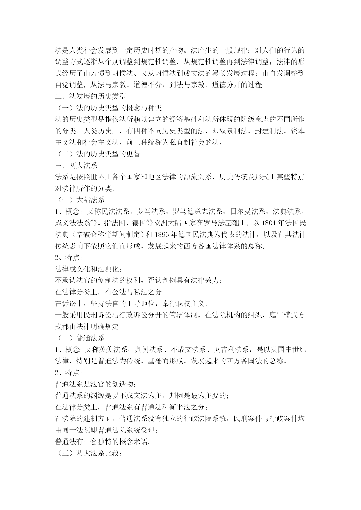 党校在职研究生考试法学讲义、提纲法学通论法学基本理论[提要]了解法学的研究对象与体系,初步掌握国法的基本特征、本质和作用,认清法的历史发展特点与运行规律,熟悉从立法、执法、司法、守法到法律监督的现实运行过程及其相关问题,掌握现代民主法治的基本知识与人权保障的基本原则,树立健全的法律意识、法治意识与权利意识。不仅认清我国实行依法治国、建设社会主义法治国家的必要性与现实性,而且懂得建设社会主义法治国家的艰巨性与渐进性。法学的性质、体系与历史一、法学的性质法学是法律科学的简称,是研究法律、法律现象、法律问题的学问或理论知识体系,是一门关于社会共同生活的人文社会科学。二、法学的研究对象与体系法学的主要研究对象是法、法律现象。法学体系是由法学各个分权学科构成的有机联系的统一整体。法学学科可以划分为三部分:理论法学、应用法学和边缘(交叉)法学)。三、法学发展的历史(一)西方法学发展简史西方法学始于古希腊,罗马法是古代西方法律制度发展的顶峰;中世纪法学处于衰落时期;公元11世纪罗马法复兴;文艺复兴后西方法学蓬勃发展,古典自然法学派迅速发展;19世纪是西方法学发展的非常重要的时期,出现了以德国的康德和黑格尔为代表的哲理法学、以英国边沁和奥斯丁为代表的实证分析法学、以德国的萨维尼和英国的梅因为代表的历史学派;19世纪末20世纪初以来,出现了社会法学派、新自然法学、法律经济学等;现当代西方法学呈现了派别林立、错综复杂的格局。(二)传统中国法学发展状况中国法学可分为先秦时期、秦汉至清末时期、民国时期、共和国时期。(三)马克思主义法学及其在中国的发展马克思主义法学以历史唯物主义为理论基础,科学地揭示了法的产生、本质、特点、功能、作用及其发展规律,从而真正使法学成为一门科学。马克思主义法学的发展经历了以马克思恩格斯为代表的时期,以列宁为代表的时期,以毛泽东为代表的时期,以邓小平为代表的时期。法的概念与体系一、法的词义1、我国古代法的词义古汉语中,法的词源意义有三:⑴在古代,法刑通用。⑵法,“平之如水”,含有公平的意思。⑶法,从“”去,所以触不直者去之,含有正直的意思。2、法与法律比较在现代汉语中,“法”、“法律”没有严格的区分,其含义主要依具体的语言环境和上下文而定。在我国当代法学理论上和我国当代法律制度中,“法”、“法律”有广义和狭义之分。二、法的基本特征1、法以行为规范为主,其内容涉及法律权利、权力与义务。2、法是由国家制定、认可并解释的3、法是由国家强制力保证实施的。4、法具有更广泛的普遍约束力。三、法的本质问题马克思主义法本质观:1、法是被上升为法律的统治阶级的意志的集中体现和反映,体现为阶级意志性和国家意志性;2、法的基础是社会物质生活条件,其中社会和产方式是最具有决定性的因素;法的要素与法的体系四、法的要素与法的体系(一)法的要素1、法律规则:是指具体规定权利、义务以及具体法律后果的准则。2、法律原则:是可以作为规则的基础或本源的综合性、稳定性原理和原则。3、法律概念:是对各种法律事实进行概括、抽象出它们的共同特征而形成的权威性范畴(术语)。(二)法的体系1、法律体系的概念法律体系,即法律部门体系,是指一国的全部现行法律规范按照一定的标准和原则,划分为不同的法律部门而形成的内部和谐一致、有机联系的整体。2、当代中国的法律体系我国法律体系通常包括下列法律部门或部门法:宪法、行政法、军事法、刑法、诉讼法、民法、商法、经济法、环境法、劳动法与社会保障法。法的起源与发展一、法的起源法是人类社会发展到一定历史时期的产物。法产生的一般规律:对人们的行为的调整方式逐渐从个别调整到规范性调整,从规范性调整再到法律调整;法律的形式经历了由习惯到习惯法、又从习惯法到成文法的漫长发展过程;由自发调整到自觉调整;从法与宗教、道德不分,到法与宗教、道德分开的过程。二、法发展的历史类型(一)法的历史类型的概念与种类法的历史类型是指依法所赖以建立的经济基础和法所体现的阶级意志的不同所作的分类。人类历史上,有四种不同历史类型的法,即奴隶制法、封建制法、资本主义法和社会主义法。前三种统称为私有制社会的法。(二)法的历史类型的更替三、两大法系法系是按照世界上各个国家和地区法律的源流关系、历史传统及形式上某些特点对法律所作的分类。(一)大陆法系:1、概念:又称民法法系,罗马法系,罗马德意志法系,日尔曼法系,法典法系,成文法法系等。指法国、德国等欧洲大陆国家在罗马法基础上,以1804年法国民法典(拿破仑称帝期间制定)和1896年德国民法典为代表的法律,以及在其法律传统影响下依照它们而形成、发展起来的西方各国法律体系的总称。2、特点:法律成文化和法典化;不承认法官