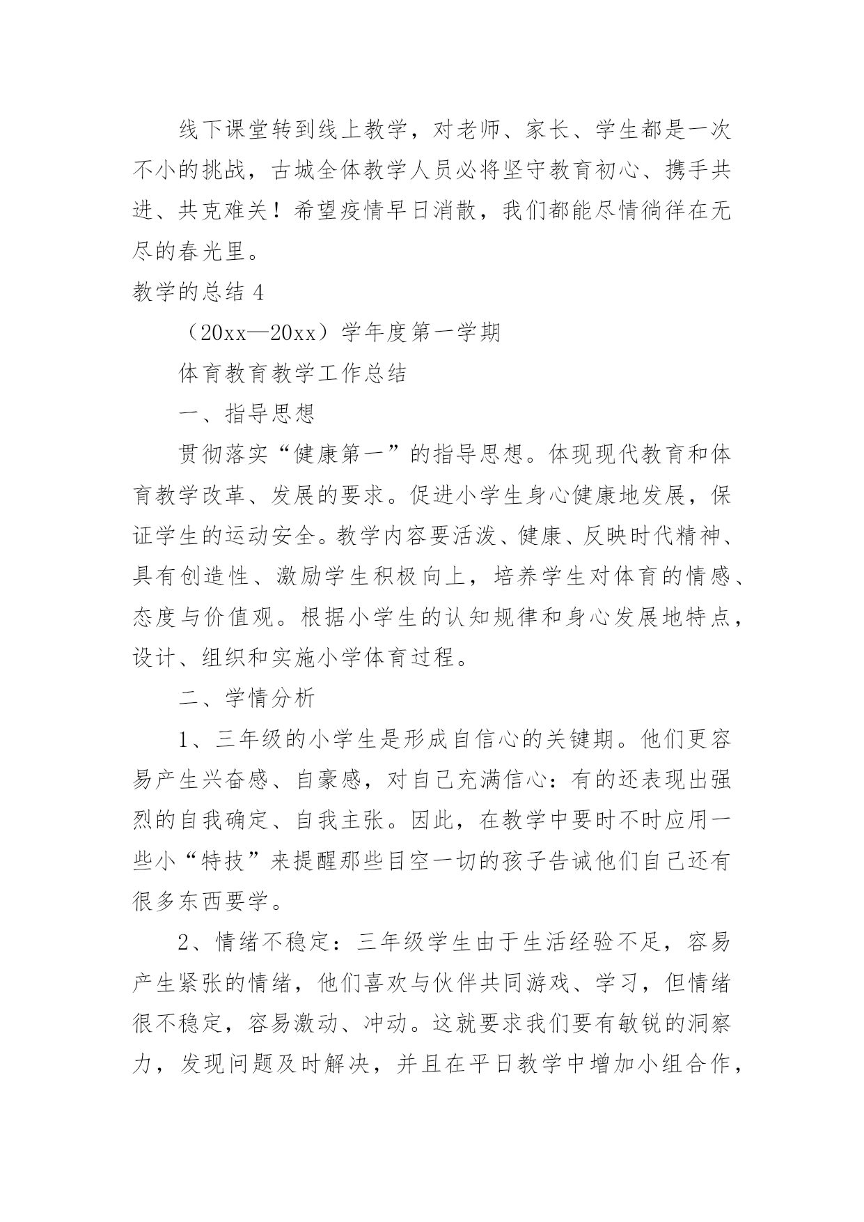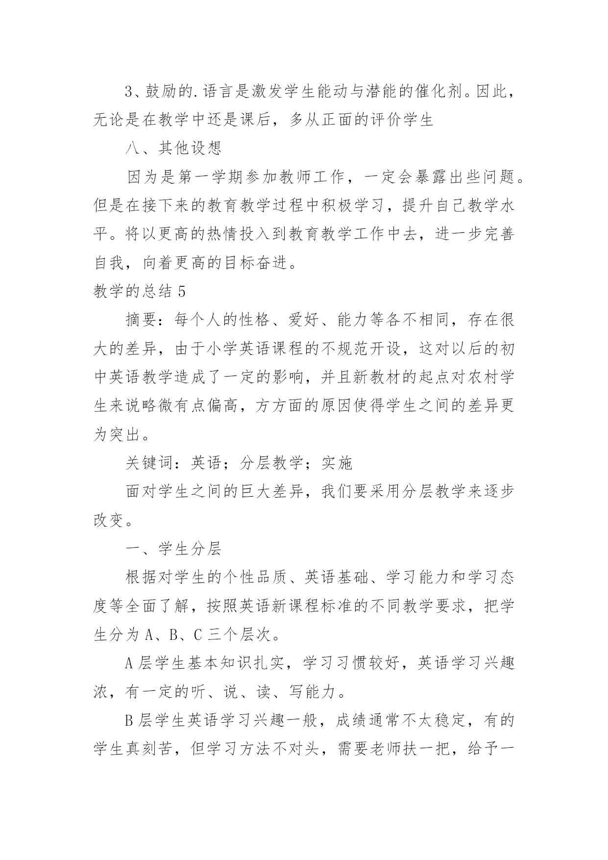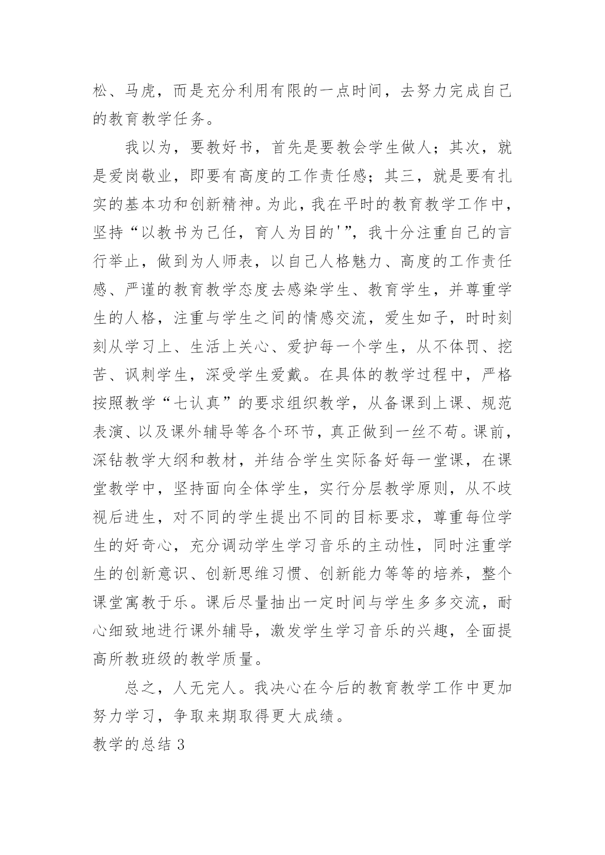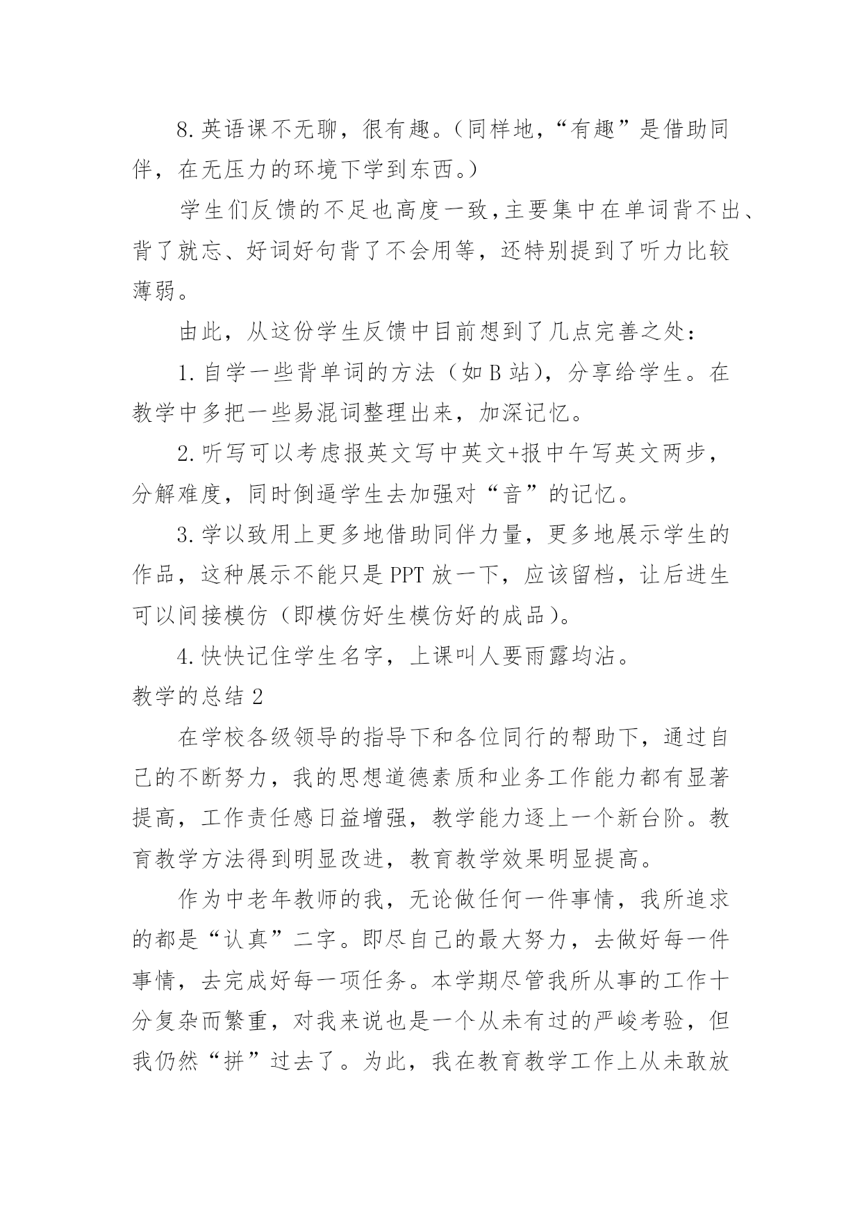 教学的总结教学的总结总结是事后对某一阶段的学习、工作或其完成情况加以回顾和分析的一种书面材料,它可以帮助我们总结以往思想,发扬成绩,不如我们来制定一份总结吧。我们该怎么去写总结呢?下面是小编帮大家整理的教学的总结,仅供参考,大家一起来看看吧。教学的总结1期末考完,本应是美美的寒假,不知从何时起,大家开始内卷,到现在名正言顺地“补课一周”,所谓考完的试卷要及时讲评。且不说学生,老师们的心思都很难集中了。教学也很难安排,试卷讲评用不了一周,开始新单元时长又不够。可能我还需要思考思考这个时间节点安排什么教学内容最为合适。新高考的一个弊端也在此,两次高考机会,实在不知道怎么来安排教学。为了首考,要赶教材的进度不说,考试技巧等也肯定要在首考前铺开涉及。那考完以后如何进阶呢?总不能为了教学,把私货先藏一部分留给第二次高考吧?反正我是觉得挺难的。言归正传。这个学期虽说大致延续了自己的.教学风格,也有一些新的面貌。延续上,比如仍然实行分组,课堂以小组讨论、自主发言为主,后期的阅读课开始采用自主提问形式。新的方面,比如说,为了避免上一届一班的“长期叛逆”,在开学给他们加深了分组很好的印象;这学期中间穿插了近两个月的实习生上课等。从我自身的角度,我觉得自己比之前更更从容和自信了,对于作业尤其是听写、作文的批改也勤快了一些,对于学生也更宽容了,平和了许多。从学生的反思和评价中也可以看出这一点。对于英语教学,基本上没有负面评价,极个别学生提到听写频率有些高、听写报的太快了、换座位太麻烦、上课总叫几个熟面孔、上课偶尔浪费时间批评个别开小差的学生。整体上对我的教学印象还是比较统一的。1.阅读、写作技巧讲的很实用,收获很大。2.作业尤其是试卷讲评后帮忙整理词汇,很nice。3.作文讲评、批改、素材整理特别有用。4.小组讨论发言,不仅组内可以自主解决问题,还能提高语言表达能力。5.本学期整理了超厚的英语笔记,很有成就感。6.大局观这个词的渗透很到位。(我想不仅是对他们的英语答题,对人生也是很有启发)7.对英语不排斥了,感兴趣了。(这点让我非常非常感动和有成就感,对于高中生来讲,这份“兴趣”绝不是因为上英语课好玩,而是真的让他们学有所成,让他们有了这份“意识到只要肯努力,就可以把英语学好的”自信心)8.英语课不无聊,很有趣。(同样地,“有趣”是借助同伴,在无压力的环境下学到东西。)学生们反馈的不足也高度一致,主要集中在单词背不出、背了就忘、好词好句背了不会用等,还特别提到了听力比较薄弱。由此,从这份学生反馈中目前想到了几点完善之处:1.自学一些背单词的方法(如B站),分享给学生。在教学中多把一些易混词整理出来,加深记忆。2.听写可以考虑报英文写中英文+报中午写英文两步,分解难度,同时倒逼学生去加强对“音”的记忆。3.学以致用上更多地借助同伴力量,更多地展示学生的作品,这种展示不能只是PPT放一下,应该留档,让后进生可以间接模仿(即模仿好生模仿好的成品)。4.快快记住学生名字,上课叫人要雨露均沾。教学的总结2在学校各级领导的指导下和各位同行的帮助下,通过自己的不断努力,我的思想道德素质和业务工作能力都有显著提高,工作责任感日益增强,教学能力逐上一个新台阶。教育教学方法得到明显改进,教育教学效果明显提高。作为中老年教师的我,无论做任何一件事情,我所追求的都是“认真”二字。即尽自己的最大努力,去做好每一件事情,去完成好每一项任务。本学期尽管我所从事的工作十分复杂而繁重,对我来说也是一个从未有过的严峻考验,但我仍然“拼”过去了。为此,我在教育教学工作上从未敢放松、马虎,而是充分利用有限的一点时间,去努力完成自己的教育教学任务。我以为,要教好书,首先是要教会学生做人;其次,就是爱岗敬业,即要有高度的工作责任感;其三,就是要有扎实的基本功和创新精神。为此,我在平时的教育教学工作中,坚持“以教书为己任,育人为目的'”,我十分注重自己的言行举止,做到为人师表,以自己人格魅力、高度的工作责任感、严谨的教育教学态度去感染学生、教育学生,并尊重学生的人格,注重与学生之间的情感交流,爱生如子,时时刻刻从学习上、生活上关心、爱护每一个学生,从不体罚、挖苦、讽刺学生,深受学生爱戴。在具体的教学过程中,严格按照教学“七认真”的要求组织教学,从备课到上课、规范表演、以及课外辅导等各个环节,真正做到一丝不苟。课前,深钻教学大纲和教材,并结合学生实际备好每一堂课,在课堂教学中,坚持面向全体学生,实行分层教学原则,从不歧视后进生,对不同的学生提出不同的目标要求,尊重每位学生的好奇心,充分调动学生学习音乐的主动性,同时注重学生的创新意识、创新思维习惯、创新能力等等的培养,整个课堂寓教于乐。课后尽量抽出一定时间与学生多多交流,耐心细致地进行课外辅导,激发学生学习音乐的兴趣,全面提高所教班级的教学质