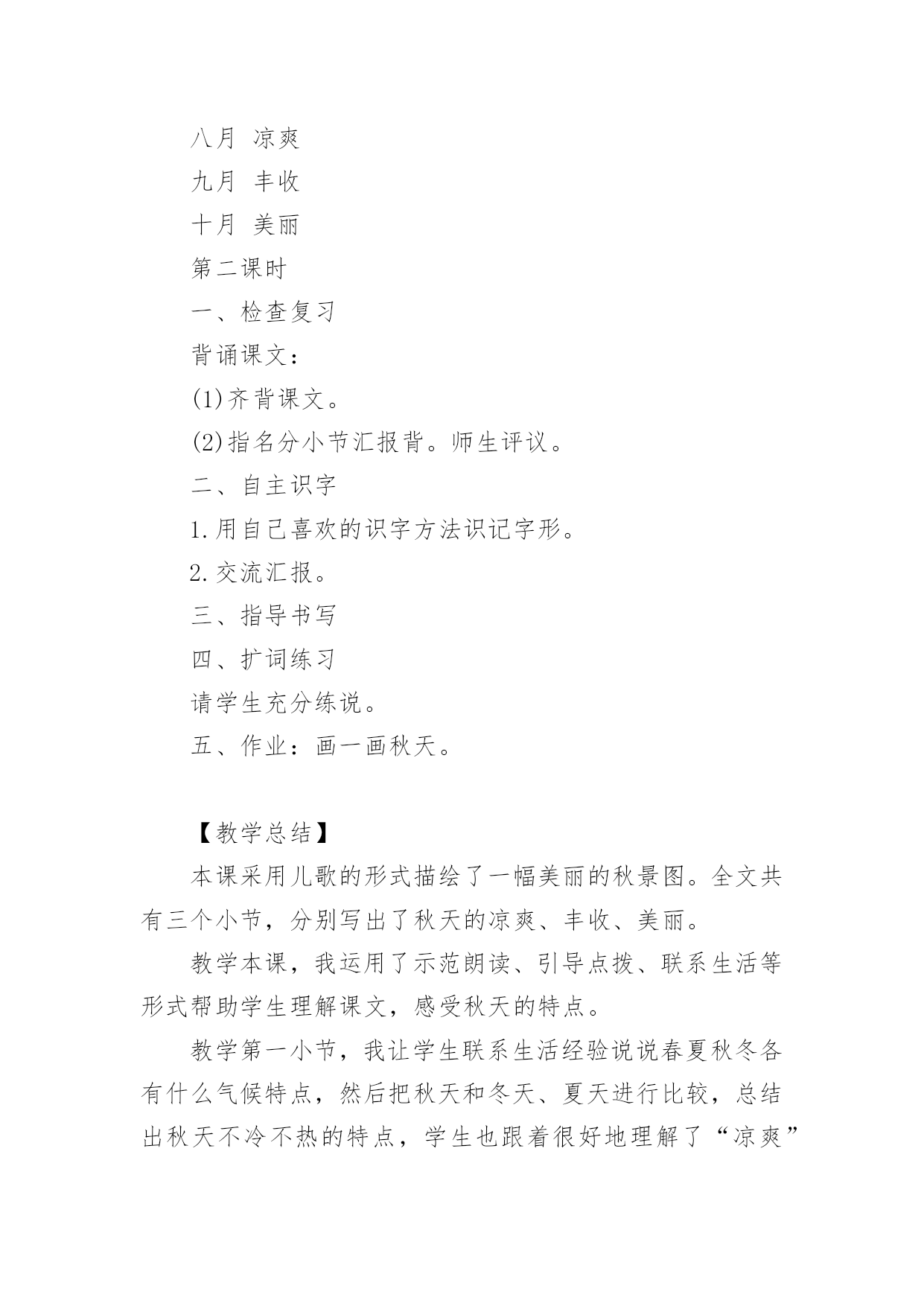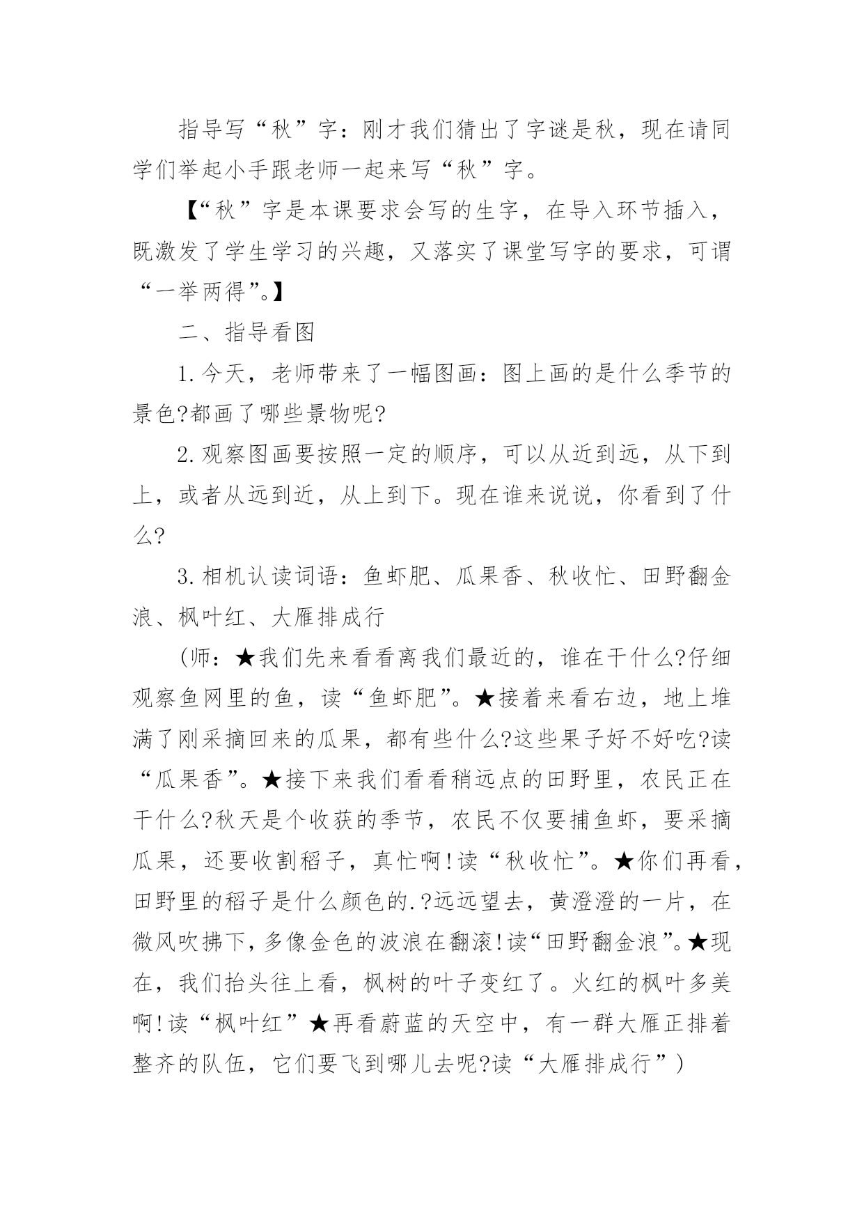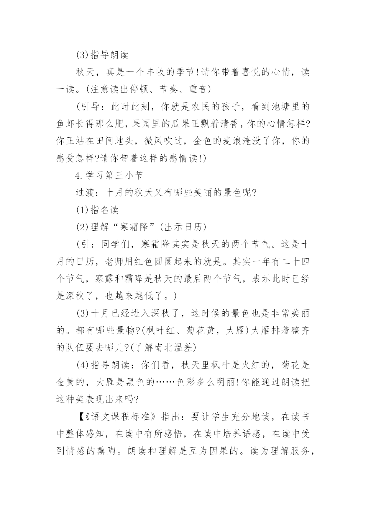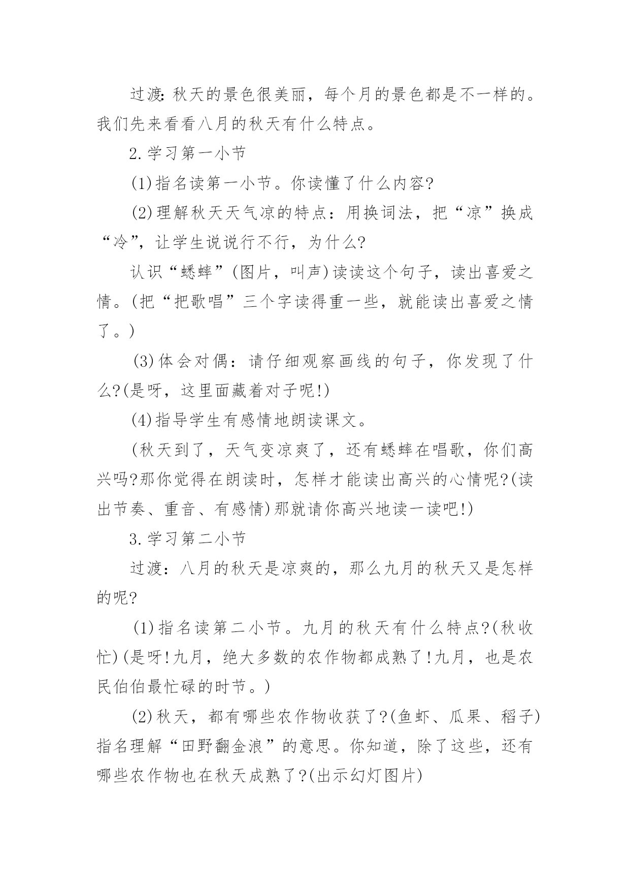 《秋天》教案设计作为一无名无私奉献的教育工作者,通常会被要求编写教案,通过教案准备可以更好地根据具体情况对教学进程做适当的必要的调整。教案应该怎么写呢?以下是小编为大家收集的《秋天》教案设计,欢迎阅读与收藏。《秋天》教案设计1教学目标:1.学习本课生字,指导学习用学过的方法识字。2.指导学生有感情地朗读课文、背诵课文,感受秋天的美丽,培养热爱大自然的感情。3.体会诗歌的音韵美,练习对对子。教学重点:1.学会本课生字和生字组成的新词。2.理解课文内容,正确、流利、有感情地朗读课文。教学课时:1.5课时教学过程:第一课时课前热身:同学们,你们喜欢猜谜语吗?老师这里有一则谜语,请仔细听:一边绿,一边红。红的怕水,绿的怕虫。(打一字)真厉害!一下子就猜出来啦!一、导入新课指导写“秋”字:刚才我们猜出了字谜是秋,现在请同学们举起小手跟老师一起来写“秋”字。【“秋”字是本课要求会写的生字,在导入环节插入,既激发了学生学习的兴趣,又落实了课堂写字的要求,可谓“一举两得”。】二、指导看图1.今天,老师带来了一幅图画:图上画的是什么季节的景色?都画了哪些景物呢?2.观察图画要按照一定的顺序,可以从近到远,从下到上,或者从远到近,从上到下。现在谁来说说,你看到了什么?3.相机认读词语:鱼虾肥、瓜果香、秋收忙、田野翻金浪、枫叶红、大雁排成行(师:★我们先来看看离我们最近的,谁在干什么?仔细观察鱼网里的鱼,读“鱼虾肥”。★接着来看右边,地上堆满了刚采摘回来的瓜果,都有些什么?这些果子好不好吃?读“瓜果香”。★接下来我们看看稍远点的田野里,农民正在干什么?秋天是个收获的季节,农民不仅要捕鱼虾,要采摘瓜果,还要收割稻子,真忙啊!读“秋收忙”。★你们再看,田野里的稻子是什么颜色的.?远远望去,黄澄澄的一片,在微风吹拂下,多像金色的波浪在翻滚!读“田野翻金浪”。★现在,我们抬头往上看,枫树的叶子变红了。火红的枫叶多美啊!读“枫叶红”★再看蔚蓝的天空中,有一群大雁正排着整齐的队伍,它们要飞到哪儿去呢?读“大雁排成行”)我们再来美美地读一读这些词语吧!【《语文新课程标准》指出:阅读教学是学生、教师、文本之间对话的过程。插图资源是语文教材的重要组成部分,在小语教材中插图有着画龙点睛、辅助衬托等重要作用,具有极大的“潜质”。充分利用这一资源的直观性、形象性,帮助学生理解课文,培养其观察能力,陶冶美的情操。在此环节,让学生充分观察插图,既落实了识字、读词的任务,又能提前化解教学难点,还渗透了看图写话的技巧训练,可谓一举多得。】三、初读课文过渡:今天我们要学习的课文就和这幅图画有关。这是一首优美的小诗,诗的题目就叫《秋天到》(板书课题)1.请打天课文,听老师范读课文。再自由轻声地读课文,要读准字音,读通句子。2.出示生字词,认读我们先来读读本课要学的生字,你发现了什么?(前鼻音,后鼻音)请你们再读一读,注意读准前鼻音和后鼻音。强调多音字“转”。3.齐读课文【本课生字绝大多数是前鼻韵母和后鼻韵母的,让学生认识到这一点,也是有意在渗透韵脚的押韵知识。而生字的识记过程较简单,意在反复朗读课文过程中学习生字。】四、学习课文1.读完课文,你知道哪几个月是秋天吗?过渡:秋天的景色很美丽,每个月的景色都是不一样的。我们先来看看八月的秋天有什么特点。2.学习第一小节(1)指名读第一小节。你读懂了什么内容?(2)理解秋天天气凉的特点:用换词法,把“凉”换成“冷”,让学生说说行不行,为什么?认识“蟋蟀”(图片,叫声)读读这个句子,读出喜爱之情。(把“把歌唱”三个字读得重一些,就能读出喜爱之情了。)(3)体会对偶:请仔细观察画线的句子,你发现了什么?(是呀,这里面藏着对子呢!)(4)指导学生有感情地朗读课文。(秋天到了,天气变凉爽了,还有蟋蟀在唱歌,你们高兴吗?那你觉得在朗读时,怎样才能读出高兴的心情呢?(读出节奏、重音、有感情)那就请你高兴地读一读吧!)3.学习第二小节过渡:八月的秋天是凉爽的,那么九月的秋天又是怎样的呢?(1)指名读第二小节。九月的秋天有什么特点?(秋收忙)(是呀!九月,绝大多数的农作物都成熟了!九月,也是农民伯伯最忙碌的时节。)(2)秋天,都有哪些农作物收获了?(鱼虾、瓜果、稻子)指名理解“田野翻金浪”的意思。你知道,除了这些,还有哪些农作物也在秋天成熟了?(出示幻灯图片)(3)指导朗读秋天,真是一个丰收的季节!请你带着喜悦的心情,读一读。(注意读出停顿、节奏、重音)(引导:此时此刻,你就是农民的孩子,看到池塘里的鱼虾长得那么肥,果园里的瓜果正飘着清香,你的心情怎样?你正站在田间地头,微风吹过,金色的麦浪淹没了你,你的感受怎样?请你带着这样的感情读!)4.学习第三小节过渡:十月的秋天又有哪些美丽的景色呢?(1)指名读(2)理解“寒霜降”(出示日历)(引:同学们,寒霜