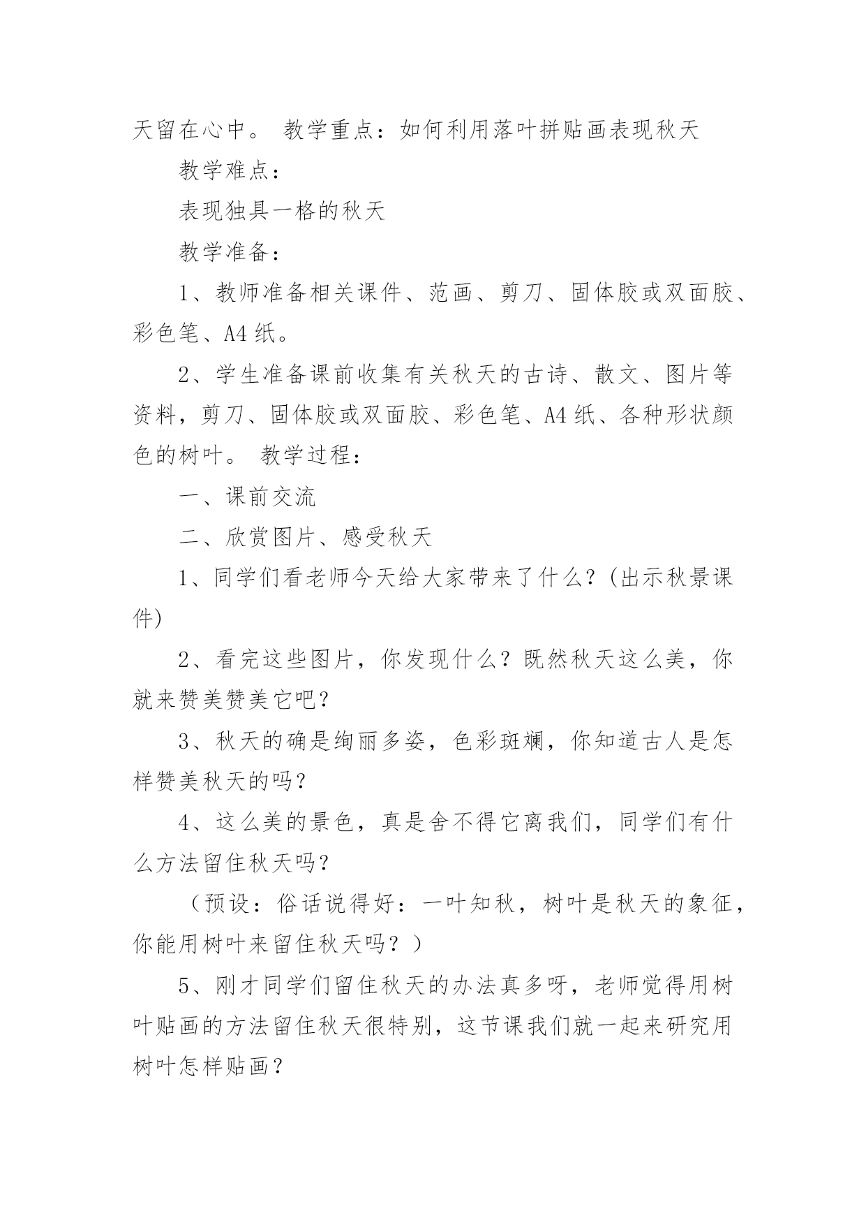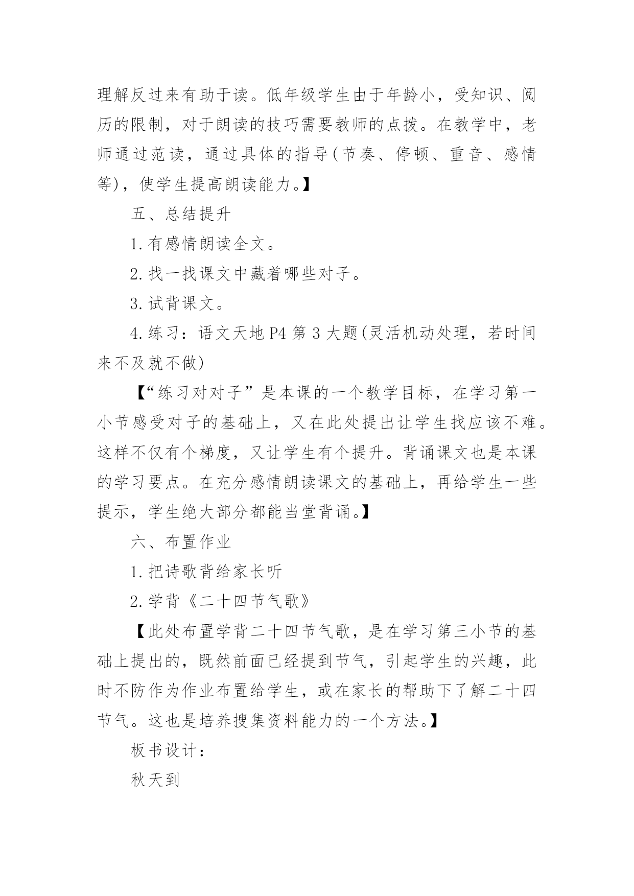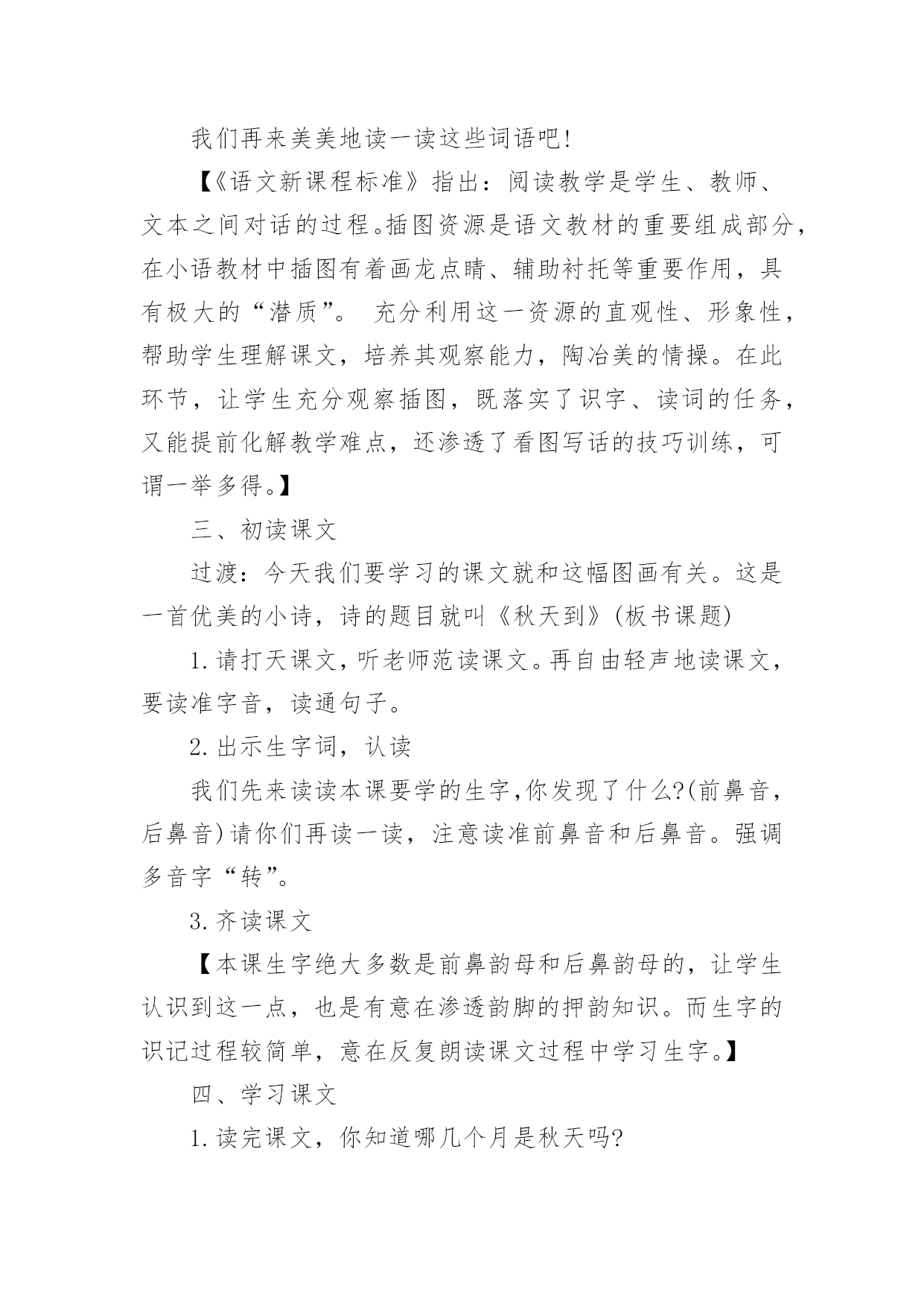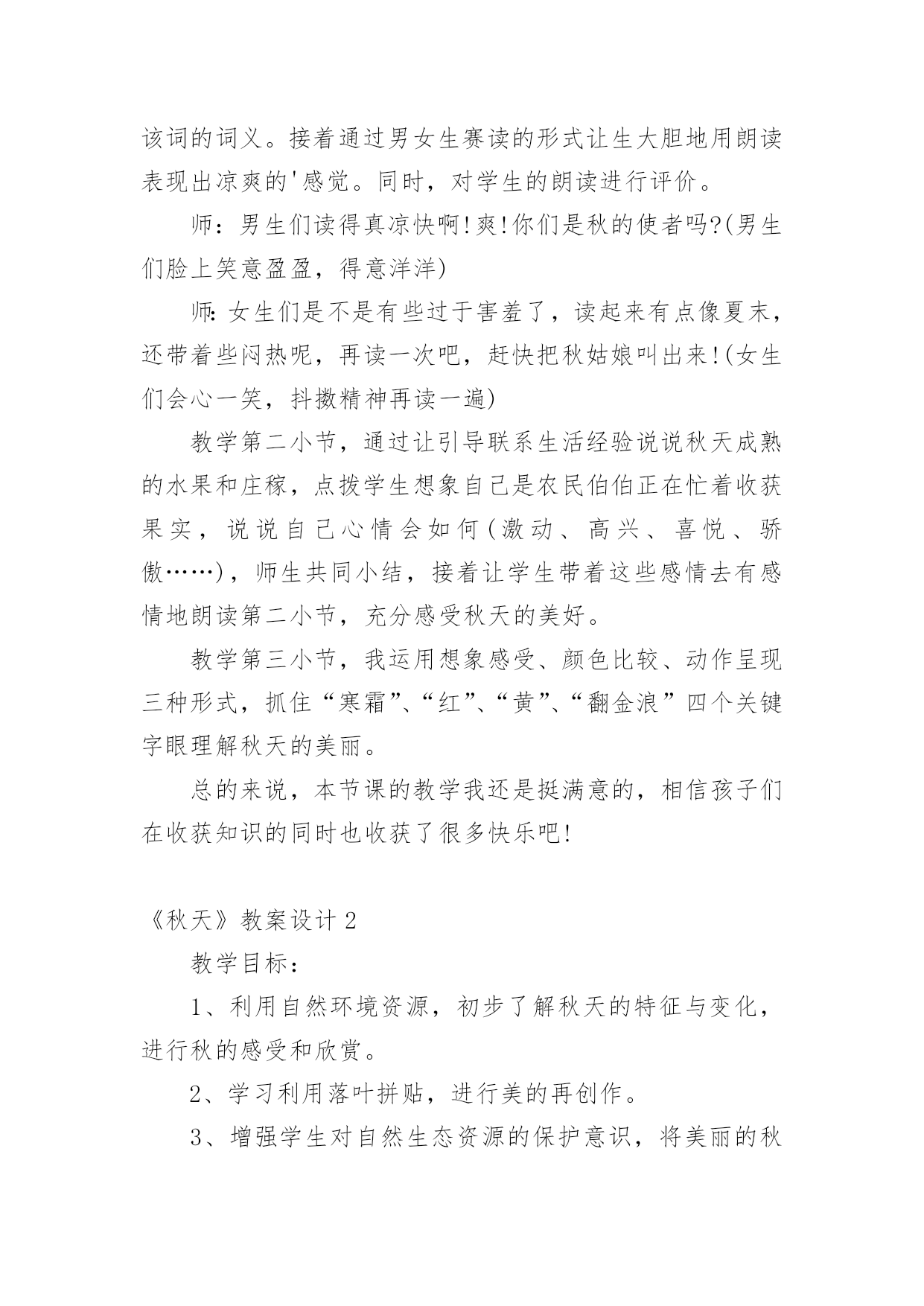 《秋天》教案设计作为一无名无私奉献的教育工作者,通常会被要求编写教案,通过教案准备可以更好地根据具体情况对教学进程做适当的必要的调整。教案应该怎么写呢?以下是小编为大家收集的《秋天》教案设计,欢迎阅读与收藏。《秋天》教案设计1教学目标:1.学习本课生字,指导学习用学过的方法识字。2.指导学生有感情地朗读课文、背诵课文,感受秋天的美丽,培养热爱大自然的感情。3.体会诗歌的音韵美,练习对对子。教学重点:1.学会本课生字和生字组成的新词。2.理解课文内容,正确、流利、有感情地朗读课文。教学课时:1.5课时教学过程:第一课时课前热身:同学们,你们喜欢猜谜语吗?老师这里有一则谜语,请仔细听:一边绿,一边红。红的怕水,绿的怕虫。(打一字)真厉害!一下子就猜出来啦!一、导入新课指导写“秋”字:刚才我们猜出了字谜是秋,现在请同学们举起小手跟老师一起来写“秋”字。【“秋”字是本课要求会写的生字,在导入环节插入,既激发了学生学习的兴趣,又落实了课堂写字的要求,可谓“一举两得”。】二、指导看图1.今天,老师带来了一幅图画:图上画的是什么季节的景色?都画了哪些景物呢?2.观察图画要按照一定的顺序,可以从近到远,从下到上,或者从远到近,从上到下。现在谁来说说,你看到了什么?3.相机认读词语:鱼虾肥、瓜果香、秋收忙、田野翻金浪、枫叶红、大雁排成行(师:★我们先来看看离我们最近的,谁在干什么?仔细观察鱼网里的鱼,读“鱼虾肥”。★接着来看右边,地上堆满了刚采摘回来的瓜果,都有些什么?这些果子好不好吃?读“瓜果香”。★接下来我们看看稍远点的田野里,农民正在干什么?秋天是个收获的季节,农民不仅要捕鱼虾,要采摘瓜果,还要收割稻子,真忙啊!读“秋收忙”。★你们再看,田野里的稻子是什么颜色的.?远远望去,黄澄澄的一片,在微风吹拂下,多像金色的波浪在翻滚!读“田野翻金浪”。★现在,我们抬头往上看,枫树的叶子变红了。火红的枫叶多美啊!读“枫叶红”★再看蔚蓝的天空中,有一群大雁正排着整齐的队伍,它们要飞到哪儿去呢?读“大雁排成行”)我们再来美美地读一读这些词语吧!【《语文新课程标准》指出:阅读教学是学生、教师、文本之间对话的过程。插图资源是语文教材的重要组成部分,在小语教材中插图有着画龙点睛、辅助衬托等重要作用,具有极大的“潜质”。充分利用这一资源的直观性、形象性,帮助学生理解课文,培养其观察能力,陶冶美的情操。在此环节,让学生充分观察插图,既落实了识字、读词的任务,又能提前化解教学难点,还渗透了看图写话的技巧训练,可谓一举多得。】三、初读课文过渡:今天我们要学习的课文就和这幅图画有关。这是一首优美的小诗,诗的题目就叫《秋天到》(板书课题)1.请打天课文,听老师范读课文。再自由轻声地读课文,要读准字音,读通句子。2.出示生字词,认读我们先来读读本课要学的生字,你发现了什么?(前鼻音,后鼻音)请你们再读一读,注意读准前鼻音和后鼻音。强调多音字“转”。3.齐读课文【本课生字绝大多数是前鼻韵母和后鼻韵母的,让学生认识到这一点,也是有意在渗透韵脚的押韵知识。而生字的识记过程较简单,意在反复朗读课文过程中学习生字。】四、学习课文1.读完课文,你知道哪几个月是秋天吗?过渡:秋天的景色很美丽,每个月的景色都是不一样的。我们先来看看八月的秋天有什么特点。2.学习第一小节(1)指名读第一小节。你读懂了什么内容?(2)理解秋天天气凉的特点:用换词法,把“凉”换成“冷”,让学生说说行不行,为什么?认识“蟋蟀”(图片,叫声)读读这个句子,读出喜爱之情。(把“把歌唱”三个字读得重一些,就能读出喜爱之情了。)(3)体会对偶:请仔细观察画线的句子,你发现了什么?(是呀,这里面藏着对子呢!)(4)指导学生有感情地朗读课文。(秋天到了,天气变凉爽了,还有蟋蟀在唱歌,你们高兴吗?那你觉得在朗读时,怎样才能读出高兴的心情呢?(读出节奏、重音、有感情)那就请你高兴地读一读吧!)3.学习第二小节过渡:八月的秋天是凉爽的,那么九月的秋天又是怎样的呢?(1)指名读第二小节。九月的秋天有什么特点?(秋收忙)(是呀!九月,绝大多数的农作物都成熟了!九月,也是农民伯伯最忙碌的时节。)(2)秋天,都有哪些农作物收获了?(鱼虾、瓜果、稻子)指名理解“田野翻金浪”的意思。你知道,除了这些,还有哪些农作物也在秋天成熟了?(出示幻灯图片)(3)指导朗读秋天,真是一个丰收的季节!请你带着喜悦的心情,读一读。(注意读出停顿、节奏、重音)(引导:此时此刻,你就是农民的孩子,看到池塘里的鱼虾长得那么肥,果园里的瓜果正飘着清香,你的心情怎样?你正站在田间地头,微风吹过,金色的麦浪淹没了你,你的感受怎样?请你带着这样的感情读!)4.学习第三小节过渡:十月的秋天又有哪些美丽的景色呢?(1)指名读(2)理解“寒霜降”(出示日历)(引:同学们,寒霜