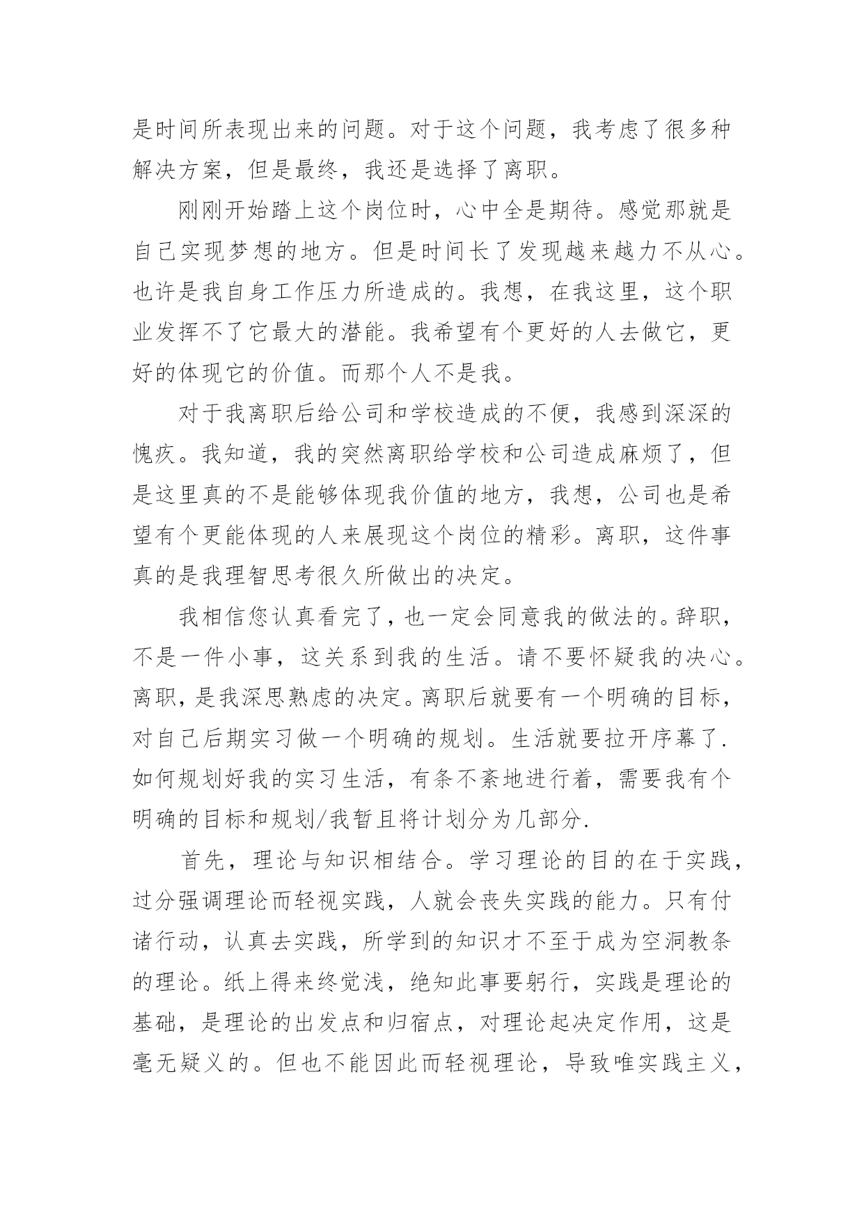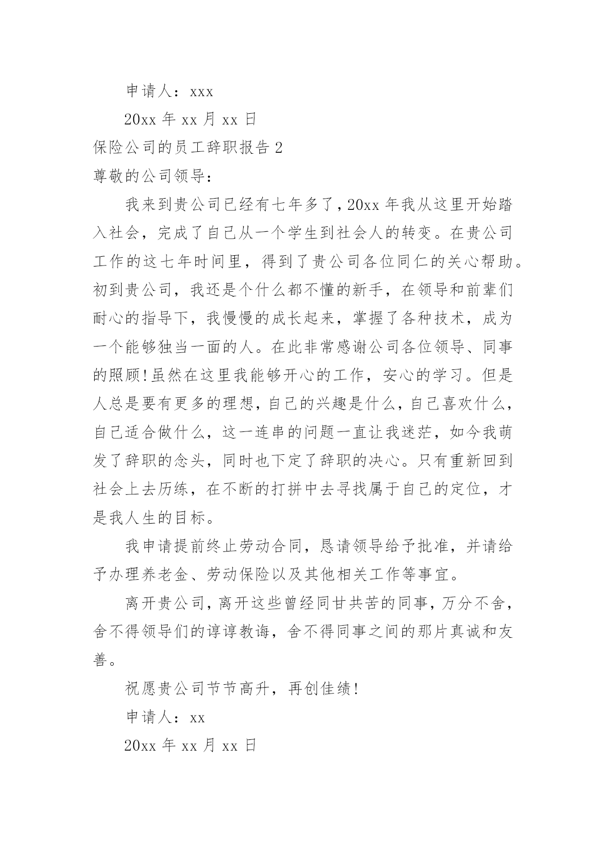 保险公司的员工辞职报告保险公司的员工辞职报告在现实生活中,报告使用的频率越来越高,报告中涉及到专业性术语要解释清楚。那么,报告到底怎么写才合适呢?下面是小编整理的保险公司的员工辞职报告,欢迎阅读,希望大家能够喜欢。保险公司的员工辞职报告1首先向您说声对不起,我辜负了您对我的期望,我是怀着十分复杂的心情写这份申请书的,今天我要向您报告一件事情,那就是我的离职。工作这件事,不是能随随便便拿来开玩笑的。我也是经过深思才决定离职的我希望您能够认真的读完,也希望您能感受到我辞职的理由,以及我的诚意。在泰康人寿工作的这段时间里,我有幸得到了公司领导及同事们的倾心指导及热情帮助。工作上,我学到了许多宝贵的工作经验和实践技能;思想上,得到领导与同事们的指导与帮助,有了更成熟与深刻的人生观。在这里的每一位员工,对待我就像对待自己的家人和好朋友一样。我感到非常温馨。这是一个和谐的公司,也是一个积极向上的公司。在这里我在这个积极的集体中学习到了什么是坚持,什么是顽强。这都要感谢这个大家庭。在公司学到了不少东西,但是我却感觉到现在自己越来越难适应这个工作。也许是我自身的能力问题。我想,这就是时间所表现出来的问题。对于这个问题,我考虑了很多种解决方案,但是最终,我还是选择了离职。刚刚开始踏上这个岗位时,心中全是期待。感觉那就是自己实现梦想的地方。但是时间长了发现越来越力不从心。也许是我自身工作压力所造成的。我想,在我这里,这个职业发挥不了它最大的潜能。我希望有个更好的人去做它,更好的体现它的价值。而那个人不是我。对于我离职后给公司和学校造成的不便,我感到深深的愧疚。我知道,我的突然离职给学校和公司造成麻烦了,但是这里真的不是能够体现我价值的地方,我想,公司也是希望有个更能体现的人来展现这个岗位的精彩。离职,这件事真的是我理智思考很久所做出的决定。我相信您认真看完了,也一定会同意我的做法的。辞职,不是一件小事,这关系到我的生活。请不要怀疑我的决心。离职,是我深思熟虑的决定。离职后就要有一个明确的目标,对自己后期实习做一个明确的规划。生活就要拉开序幕了.如何规划好我的实习生活,有条不紊地进行着,需要我有个明确的目标和规划/我暂且将计划分为几部分.首先,理论与知识相结合。学习理论的目的在于实践,过分强调理论而轻视实践,人就会丧失实践的能力。只有付诸行动,认真去实践,所学到的知识才不至于成为空洞教条的理论。纸上得来终觉浅,绝知此事要躬行,实践是理论的基础,是理论的出发点和归宿点,对理论起决定作用,这是毫无疑义的。但也不能因此而轻视理论,导致唯实践主义,我可以趁实习的机会将在学校所学的知识通过实践转化为自己的经验,从而避免走弯路。其次,要培养良好心态和习惯即使作为实习生的我们,不要以为接电话、发传真、复印文件之类的“杂货”完全没有技术含量,会从小事中积累重要经验。例如复印文件就可以熟悉公文的写作,打电话可以锻炼和陌生客户沟通的能力,发传真也可以帮助熟悉公司的客户。在所有的工作中,沟通和协调能力都是一项最基本的素质,在实习中应注意培养这种能力。这种能力也可以称为处理关系的技巧,有助于工作中和谐气氛的形成,与人们头脑中“逢迎上司”、“阿谀逢迎”的概念是两码事。沟通和协调能力也是自我表现的一个方面,能让上司更全面地了解自己,看到实习中为工作所做出的努力。最后,将实习纳入职业规划中。作为即将毕业的大学生,大家都知道实习经历对于求职的重要性。企业在招聘应届毕业生时,筛选简历最看重的因素之一便是学生是否参加过专业实习,企业和公司偏爱有社会实习和实践经验的学生,这是公开的秘密。招聘企业认为,有工作经验的学生在工作中能马上上手,这也是为公司节省成本,丰富的社会实践经验也展示了应聘者积极进取的心态,公司青睐他们是鉴于他们在实习中综合素质会得到提升,免去了初入职场时“愣头愣脑的`”青涩。此致敬礼申请人:xxx20xx年xx月xx日保险公司的员工辞职报告2尊敬的公司领导:我来到贵公司已经有七年多了,20xx年我从这里开始踏入社会,完成了自己从一个学生到社会人的转变。在贵公司工作的这七年时间里,得到了贵公司各位同仁的关心帮助。初到贵公司,我还是个什么都不懂的新手,在领导和前辈们耐心的指导下,我慢慢的成长起来,掌握了各种技术,成为一个能够独当一面的人。在此非常感谢公司各位领导、同事的照顾!虽然在这里我能够开心的工作,安心的学习。但是人总是要有更多的理想,自己的兴趣是什么,自己喜欢什么,自己适合做什么,这一连串的问题一直让我迷茫,如今我萌发了辞职的念头,同时也下定了辞职的决心。只有重新回到社会上去历练,在不断的打拼中去寻找属于自己的定位,才是我人生的目标。我申请提前终止劳动合同,恳请领导给予批准,并请给予办理养老金、劳动保险以及其他相关工作等事宜。离开贵公司,离开这些曾经同甘共苦的同事