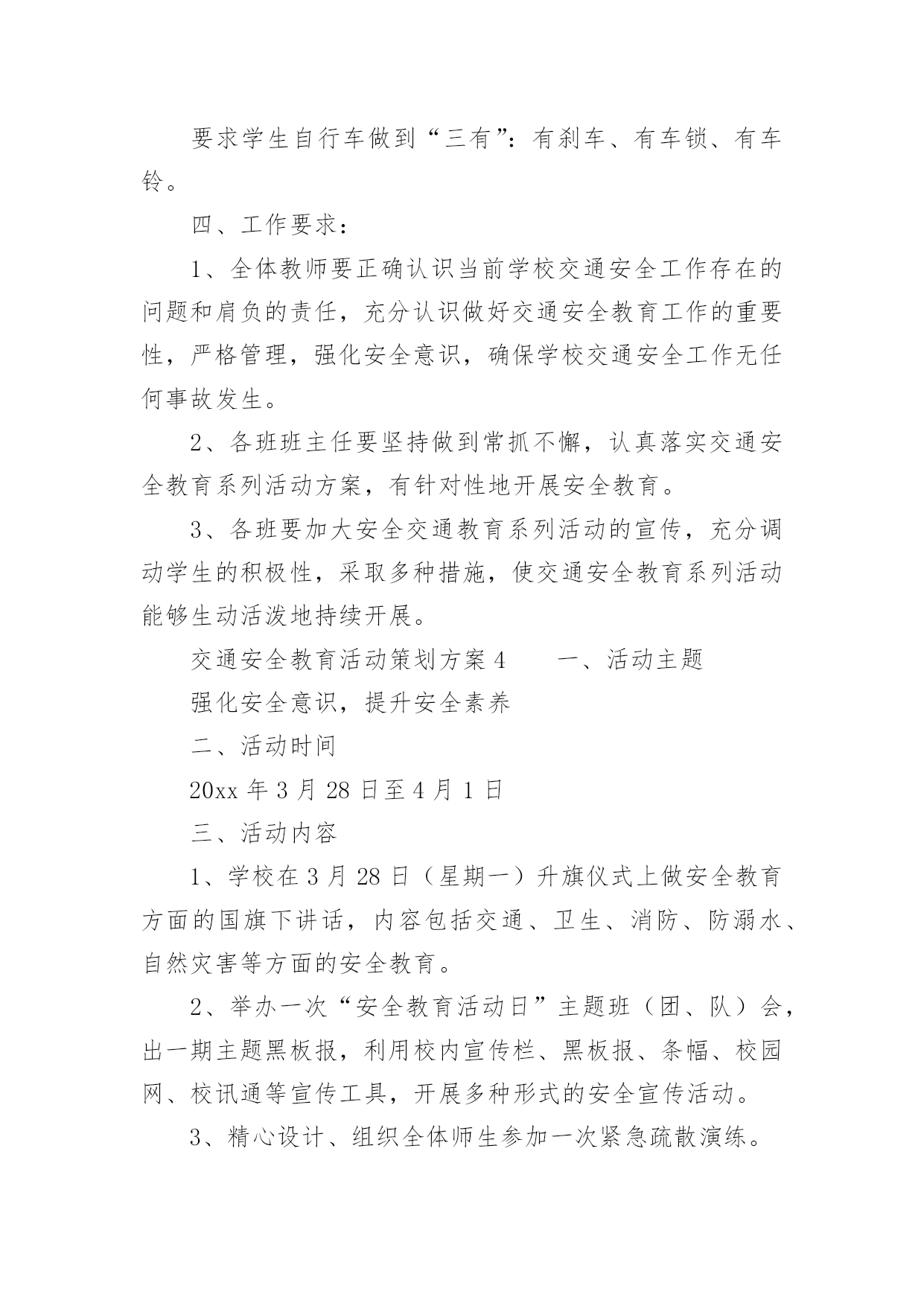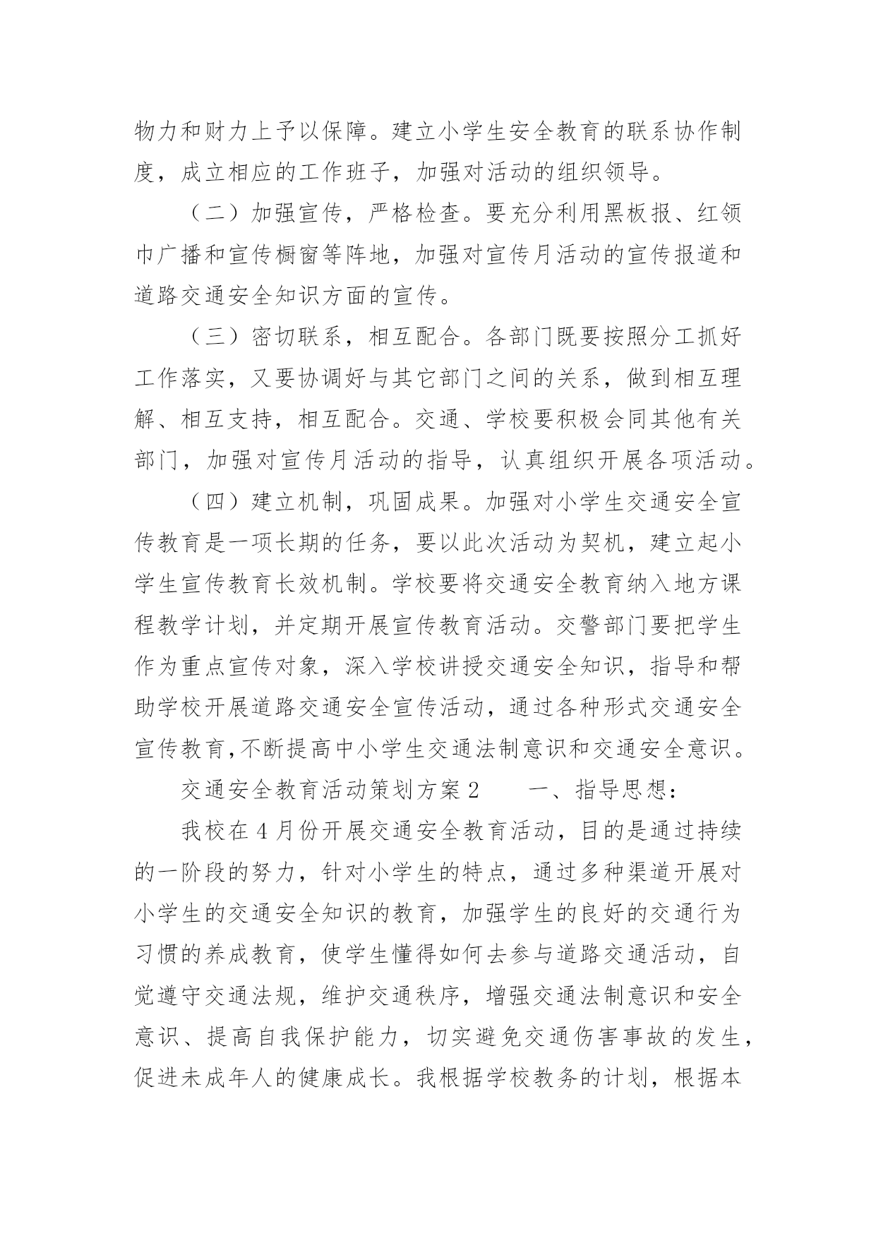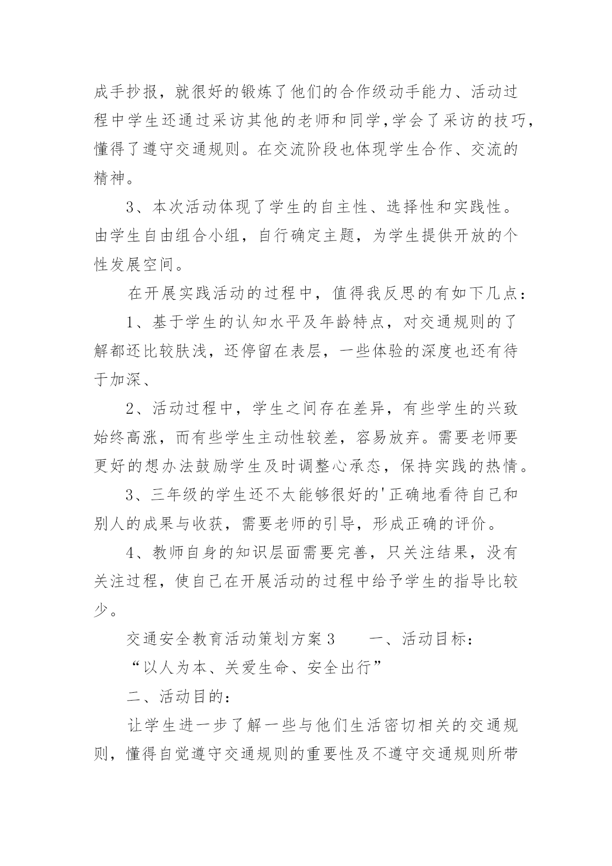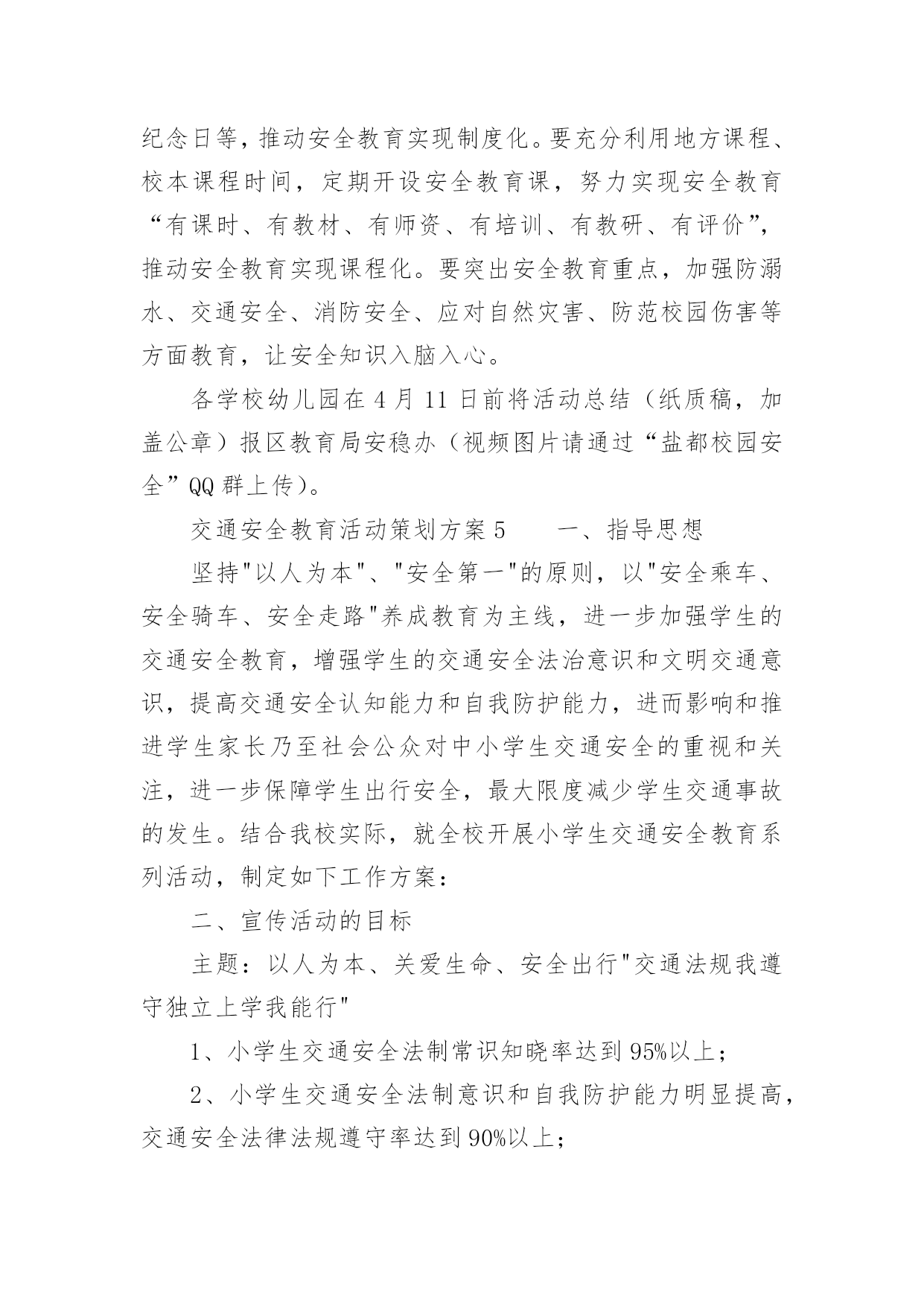 交通安全教育活动策划方案交通安全教育活动策划方案(精选8篇)为了确保活动能成功举办,通常需要提前准备好一份活动方案,活动方案其实就是针对活动相关的因素所制定计划类文书。那么活动方案应该怎么制定才合适呢?以下是小编为大家收集的交通安全教育活动策划方案(精选8篇),希望对大家有所帮助。交通安全教育活动策划方案1一、指导思想为进一步提高小学生交通安全法制意识,杜绝各类交通安全事故的发生,保障全校师生的人身安全,结合我校实际,决定在校园内开展交通安全教育宣传活动,特制定如下工作方案:二、活动主题以人为本、关爱生命、安全出行。三、宣传活动的内容1、召开一次交通安全教育宣传动员会。利用早晨国旗下讲话时间,对全校师生进行交通安全教育宣传动员,要求全体教师和学生必须高度重视交通安全,认真学习有关交通安全知识与法规,严格遵守交通法规,努力避免交通安全事故的发生。时刻注意交通安全。2、开展2次交通安全教育知识讲座。请派出所的`民警同志来校对学生进行2次交通安全知识讲座,使学生进一步懂得更多的交通安全知识,在思想上观念上引起高度重视,晓之以理,付之实践。3、开展一次安全教育图片宣传展览活动。学校会同交通部门在校园内设立交通安全栏,定期刊出交通安全法制常识及相关信息,交通部门负责提供交通安全法制宣传资料。4、认真上好交通安全知识教育课。各班结合《小学生交通安全常识》宣传卡片,充分利用晨间活动课、班队活动等时间对学生认真进行宣传教育,有些知识要背熟,学以致用。5、出好一期交通安全知识黑板报和进行1——2次红领巾广播宣传教育。6、组织全校学生观看安全教育宣传片。7、落实交通安全教育,加强对接送学生车辆的管理,并加强非法接送学生车辆排查和通报。四、组织领导(一)成立校宣传活动领导小组,负责组织实施全校宣传活动工作。(二)领导小组下设办公室,办公地点设在少先队辅导员室,负责宣传活动具体工作。联络员:xx五、工作要求(一)加强领导,精心组织。加强小学生交通安全教育工作,事关下一代的健康成长和千家万户的幸福安宁,要高度重视,把开展宣传活动作为当前一项重要工作来抓。结合本校实际,认真研究制定和落实具体的工作措施,在人力、物力和财力上予以保障。建立小学生安全教育的联系协作制度,成立相应的工作班子,加强对活动的组织领导。(二)加强宣传,严格检查。要充分利用黑板报、红领巾广播和宣传橱窗等阵地,加强对宣传月活动的宣传报道和道路交通安全知识方面的宣传。(三)密切联系,相互配合。各部门既要按照分工抓好工作落实,又要协调好与其它部门之间的关系,做到相互理解、相互支持,相互配合。交通、学校要积极会同其他有关部门,加强对宣传月活动的指导,认真组织开展各项活动。(四)建立机制,巩固成果。加强对小学生交通安全宣传教育是一项长期的任务,要以此次活动为契机,建立起小学生宣传教育长效机制。学校要将交通安全教育纳入地方课程教学计划,并定期开展宣传教育活动。交警部门要把学生作为重点宣传对象,深入学校讲授交通安全知识,指导和帮助学校开展道路交通安全宣传活动,通过各种形式交通安全宣传教育,不断提高中小学生交通法制意识和交通安全意识。交通安全教育活动策划方案2一、指导思想:我校在4月份开展交通安全教育活动,目的是通过持续的一阶段的努力,针对小学生的特点,通过多种渠道开展对小学生的交通安全知识的教育,加强学生的良好的交通行为习惯的养成教育,使学生懂得如何去参与道路交通活动,自觉遵守交通法规,维护交通秩序,增强交通法制意识和安全意识、提高自我保护能力,切实避免交通伤害事故的发生,促进未成年人的健康成长。我根据学校教务的计划,根据本校学生的特点制订本活动方案。二、活动主题:“增强交通安全意识,提高自我保护能力”。三、活动时间:20xx年4月1日至20xx年4月30日四、活动内容:在安全教育活动中,我将采取多种形式进行广泛宣传,大力营造“增强小学生交通安全”活动舆论,并认真开展以下活动,即举行一次以安全教育为内容的国旗下的讲话;进行一次以“安全教育”为主题的主题班会;出一期安全教育黑板报;听一次交通知识的广播;举办一次安全教育讲座等。通过这些有针对性的教育活动,使学生的交通法制意识、安全防范意识、自我保护能力有较大的提高,减少交通伤害事故的发生。五、具体安排:第一周:学习交通常识第二周:认识交通标志并开展主题班会等第三周:做交通安全教育第四周:成果展示通过本次综合实践活动,我认为做得较好的地方主要有以下几点:1、激发了同学们的学习兴趣、在活动中,同学们兴致勃勃的收集交通标志、2、培养了学生与人合作,交流的能力。如小组合作完成手抄报,就很好的锻炼了他们的合作级动手能力、活动过程中学生还通过采访其他的老师和同学,学会了采访的技巧,懂得了遵守交通规则。在交流阶段也体现学生合作、交流的精神。3、本次活动体现了学生