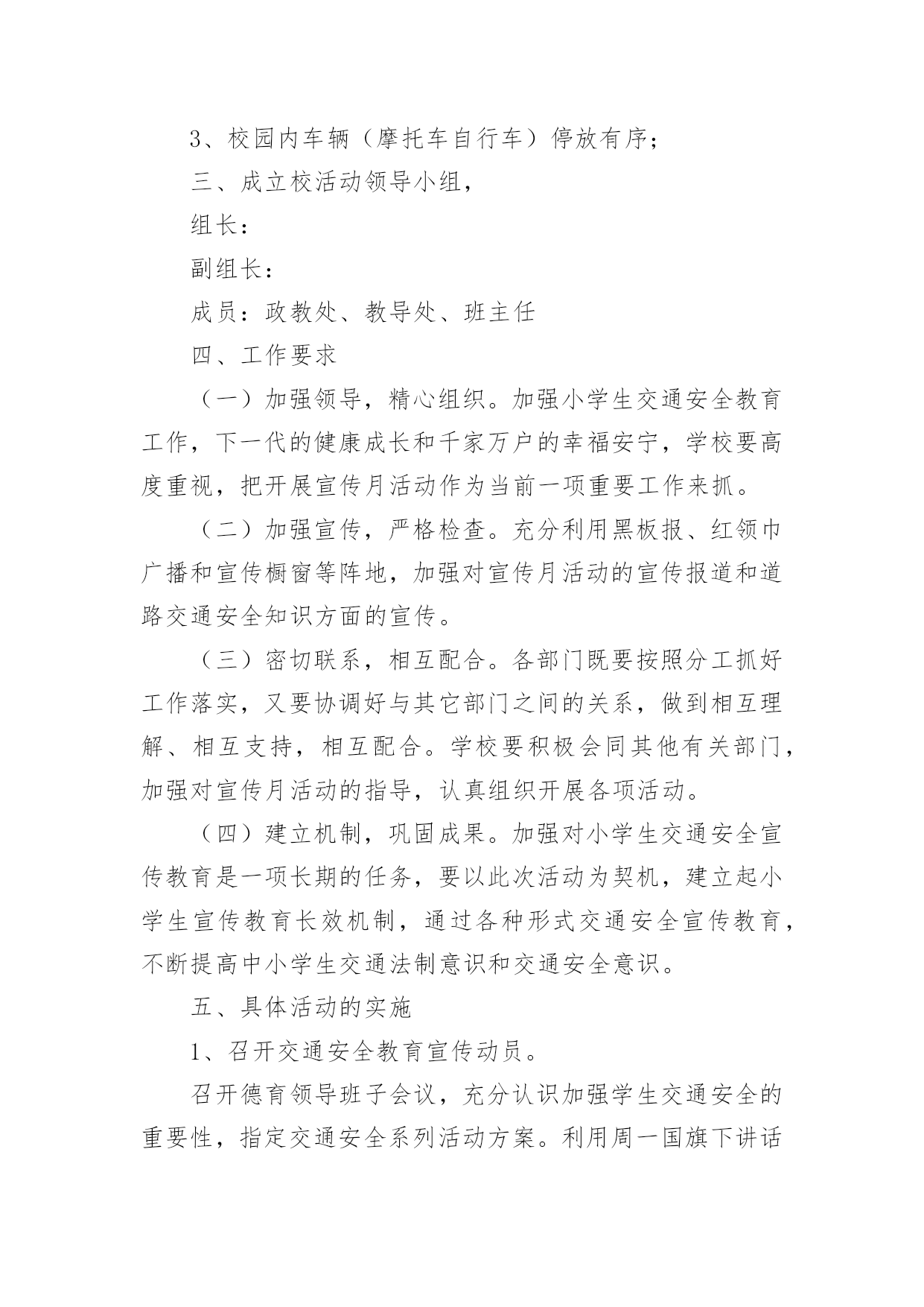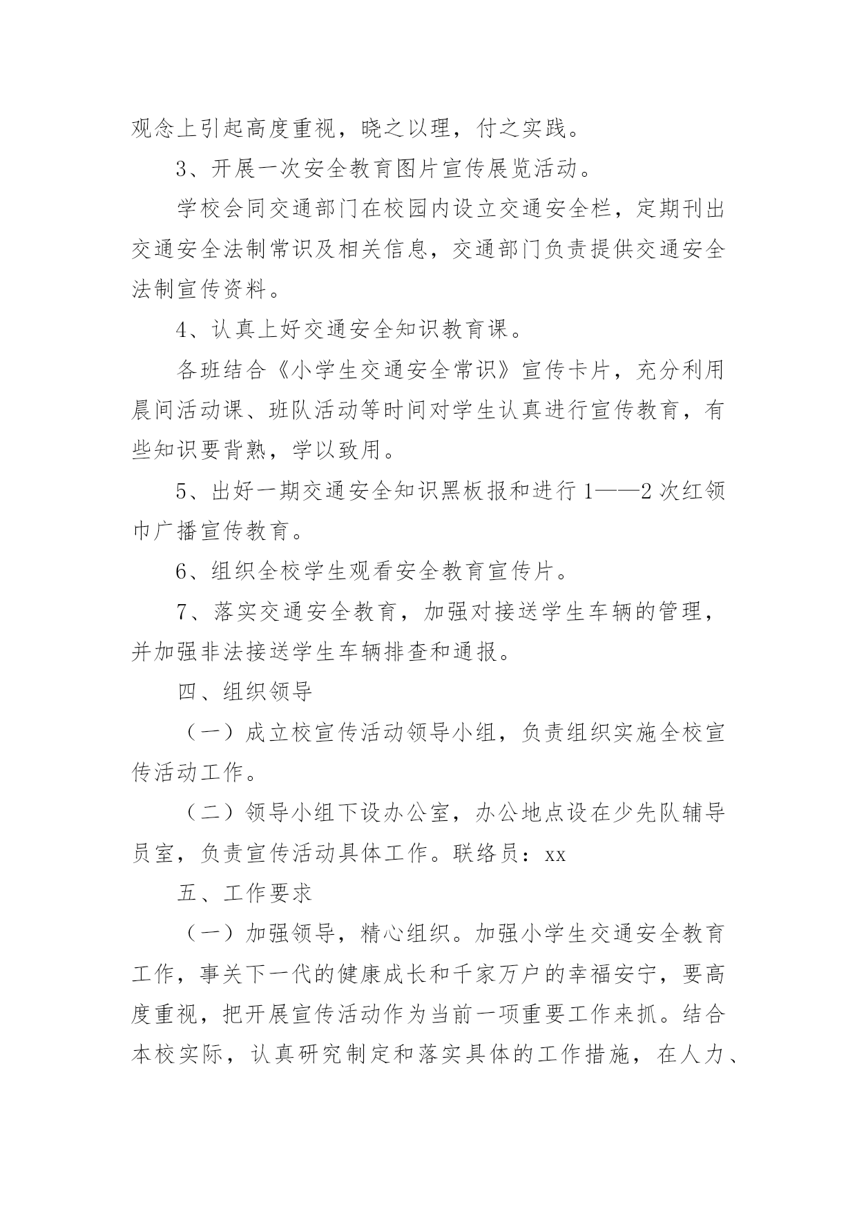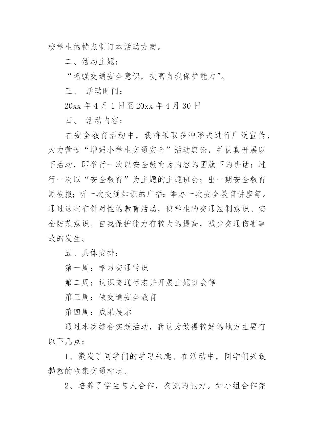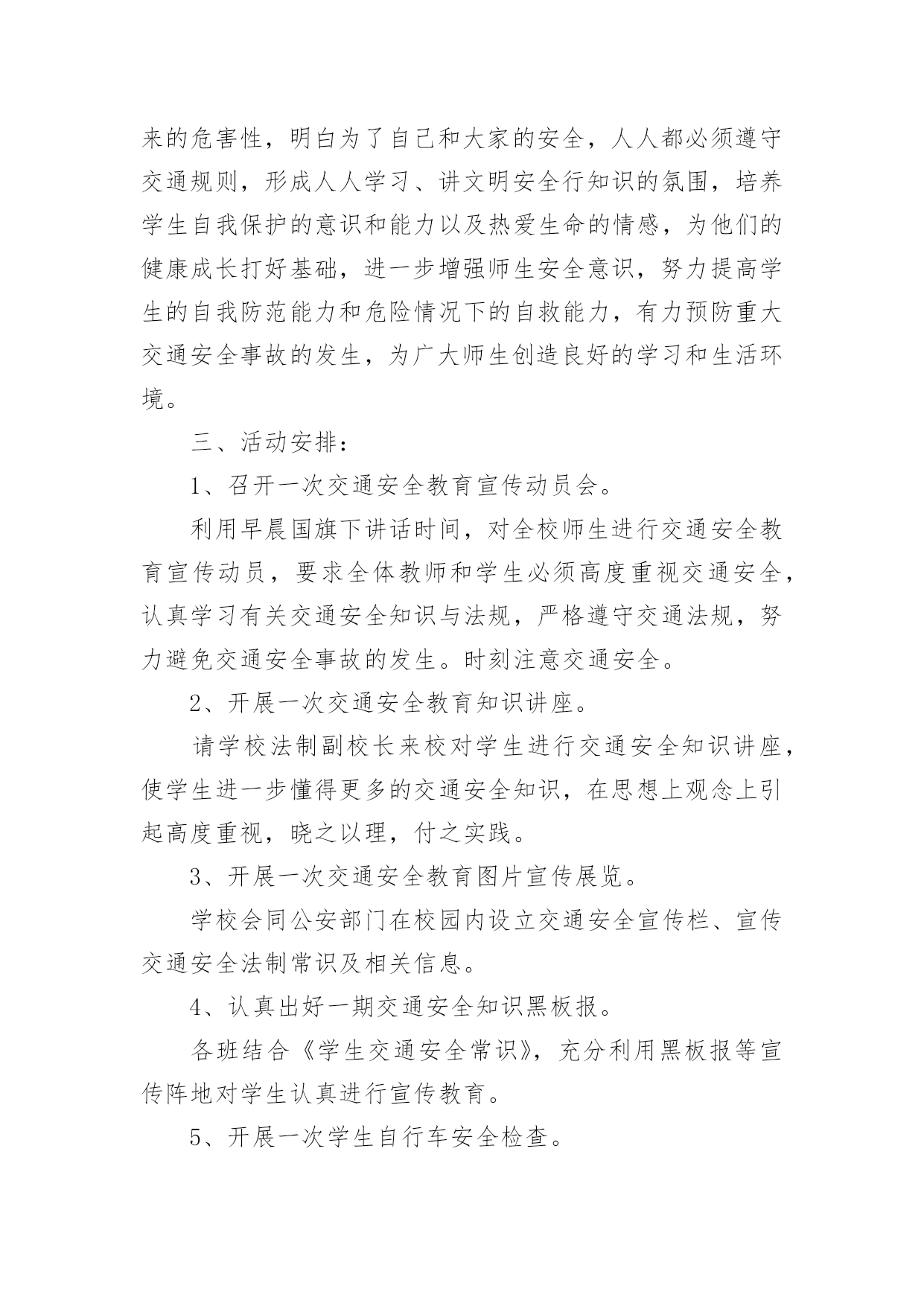 交通安全教育活动策划方案交通安全教育活动策划方案(精选8篇)为了确保活动能成功举办,通常需要提前准备好一份活动方案,活动方案其实就是针对活动相关的因素所制定计划类文书。那么活动方案应该怎么制定才合适呢?以下是小编为大家收集的交通安全教育活动策划方案(精选8篇),希望对大家有所帮助。交通安全教育活动策划方案1一、指导思想为进一步提高小学生交通安全法制意识,杜绝各类交通安全事故的发生,保障全校师生的人身安全,结合我校实际,决定在校园内开展交通安全教育宣传活动,特制定如下工作方案:二、活动主题以人为本、关爱生命、安全出行。三、宣传活动的内容1、召开一次交通安全教育宣传动员会。利用早晨国旗下讲话时间,对全校师生进行交通安全教育宣传动员,要求全体教师和学生必须高度重视交通安全,认真学习有关交通安全知识与法规,严格遵守交通法规,努力避免交通安全事故的发生。时刻注意交通安全。2、开展2次交通安全教育知识讲座。请派出所的`民警同志来校对学生进行2次交通安全知识讲座,使学生进一步懂得更多的交通安全知识,在思想上观念上引起高度重视,晓之以理,付之实践。3、开展一次安全教育图片宣传展览活动。学校会同交通部门在校园内设立交通安全栏,定期刊出交通安全法制常识及相关信息,交通部门负责提供交通安全法制宣传资料。4、认真上好交通安全知识教育课。各班结合《小学生交通安全常识》宣传卡片,充分利用晨间活动课、班队活动等时间对学生认真进行宣传教育,有些知识要背熟,学以致用。5、出好一期交通安全知识黑板报和进行1——2次红领巾广播宣传教育。6、组织全校学生观看安全教育宣传片。7、落实交通安全教育,加强对接送学生车辆的管理,并加强非法接送学生车辆排查和通报。四、组织领导(一)成立校宣传活动领导小组,负责组织实施全校宣传活动工作。(二)领导小组下设办公室,办公地点设在少先队辅导员室,负责宣传活动具体工作。联络员:xx五、工作要求(一)加强领导,精心组织。加强小学生交通安全教育工作,事关下一代的健康成长和千家万户的幸福安宁,要高度重视,把开展宣传活动作为当前一项重要工作来抓。结合本校实际,认真研究制定和落实具体的工作措施,在人力、物力和财力上予以保障。建立小学生安全教育的联系协作制度,成立相应的工作班子,加强对活动的组织领导。(二)加强宣传,严格检查。要充分利用黑板报、红领巾广播和宣传橱窗等阵地,加强对宣传月活动的宣传报道和道路交通安全知识方面的宣传。(三)密切联系,相互配合。各部门既要按照分工抓好工作落实,又要协调好与其它部门之间的关系,做到相互理解、相互支持,相互配合。交通、学校要积极会同其他有关部门,加强对宣传月活动的指导,认真组织开展各项活动。(四)建立机制,巩固成果。加强对小学生交通安全宣传教育是一项长期的任务,要以此次活动为契机,建立起小学生宣传教育长效机制。学校要将交通安全教育纳入地方课程教学计划,并定期开展宣传教育活动。交警部门要把学生作为重点宣传对象,深入学校讲授交通安全知识,指导和帮助学校开展道路交通安全宣传活动,通过各种形式交通安全宣传教育,不断提高中小学生交通法制意识和交通安全意识。交通安全教育活动策划方案2一、指导思想:我校在4月份开展交通安全教育活动,目的是通过持续的一阶段的努力,针对小学生的特点,通过多种渠道开展对小学生的交通安全知识的教育,加强学生的良好的交通行为习惯的养成教育,使学生懂得如何去参与道路交通活动,自觉遵守交通法规,维护交通秩序,增强交通法制意识和安全意识、提高自我保护能力,切实避免交通伤害事故的发生,促进未成年人的健康成长。我根据学校教务的计划,根据本校学生的特点制订本活动方案。二、活动主题:“增强交通安全意识,提高自我保护能力”。三、活动时间:20xx年4月1日至20xx年4月30日四、活动内容:在安全教育活动中,我将采取多种形式进行广泛宣传,大力营造“增强小学生交通安全”活动舆论,并认真开展以下活动,即举行一次以安全教育为内容的国旗下的讲话;进行一次以“安全教育”为主题的主题班会;出一期安全教育黑板报;听一次交通知识的广播;举办一次安全教育讲座等。通过这些有针对性的教育活动,使学生的交通法制意识、安全防范意识、自我保护能力有较大的提高,减少交通伤害事故的发生。五、具体安排:第一周:学习交通常识第二周:认识交通标志并开展主题班会等第三周:做交通安全教育第四周:成果展示通过本次综合实践活动,我认为做得较好的地方主要有以下几点:1、激发了同学们的学习兴趣、在活动中,同学们兴致勃勃的收集交通标志、2、培养了学生与人合作,交流的能力。如小组合作完成手抄报,就很好的锻炼了他们的合作级动手能力、活动过程中学生还通过采访其他的老师和同学,学会了采访的技巧,懂得了遵守交通规则。在交流阶段也体现学生合作、交流的精神。3、本次活动体现了学生