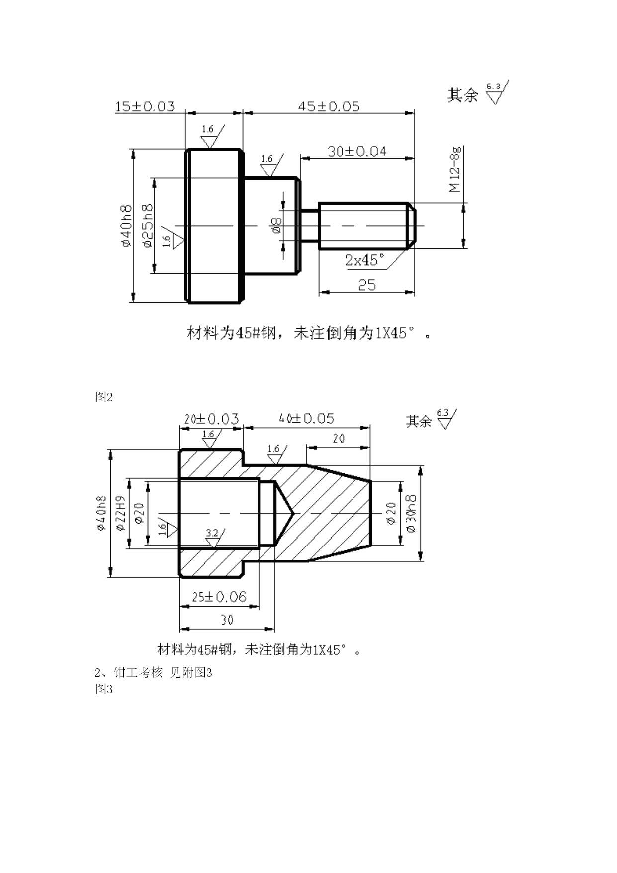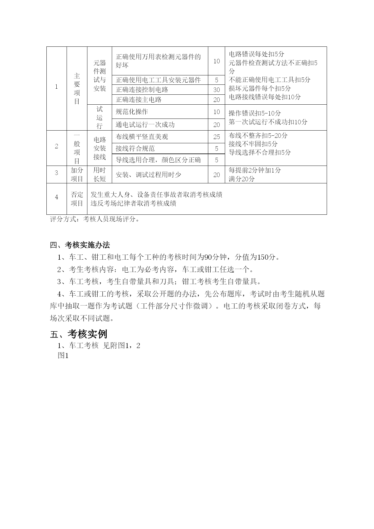 附件三:2008年江苏省普通高校对口单独招生机电类专业技能考试标准=1\*CHINESENUM3一、制定依据教育部中等职业学校机电类专业教学指导方案中华人民共和国职业技能鉴定规范=2\*CHINESENUM3二、考核内容第一部分《车工技能》1、车制简单的台阶轴零件普通类型的台阶轴。直径尺寸公差IT8。台阶长度公差等级IT10-IT12。表面粗糙度达到Ra1.6μm。2、切断和车沟槽直进法切断,切入深度20mm。直形内外沟槽,符合图样要求。3、车孔类零件车孔孔径公差等级IT9。表面粗糙度达到Ra3.2μm。4、车制圆锥面用转动小拖板法车制常用外圆锥面。圆锥直径公差等级IT9。表面粗糙度达到Ra1.6μm。6、车制外螺纹(单线)普通三角形螺纹(螺距不大于2.0mm)普通螺纹精度8级(GB197-81),用螺纹量规检查合格。表面粗糙度达到Ra3.2μm。7、能正确编制简单零件加工工艺路线,并按工艺路线正确加工。8、工量具的使用与维护常用工量具的合理使用与保养。正确使用夹具,做好保养和维护工作。9、设备的使用与维护操作和调整车床,并及时发现一般故障。自用车床的润滑。车床的保养工作。10、安全文明生产正确执行安全技术规范。做到工作场地整洁,工件、工量具摆放整齐。第二部分《钳工技能》1、简单工件的划线。2、根据工件材料的不同,能正确选用锯条,对各种型材、板材锯割,尺寸公差0.5mm,平面度0.3mm。3、在50×50mm范围内锉削加工平面,尺寸公差0.1mm,平面度0.1mm,表面粗糙度达到Ra6.3μm。4、正确刃磨标准麻花钻,根据材料的不同选择切削用量和切削液,加工各种通孔、盲孔、台阶孔、螺纹孔,达到图纸要求,尤其是孔中心距的尺寸精度能控制在±0.2mm之内。5、同一平面钻铰3-5个孔,公差等级IT8,位置度公差φ0.3mm,表面粗糙度Ra1.6μm6、能安全、正确地操作和调整钻床,正确装夹钻头和工件。7、选用各种工具、量具、夹具。8、正确执行安全技术操作规程及文明生产要求。第三部分《电工技能》1.电工基本操作技能(1)电工安全操作规程及电气设备的安全检查。(2)常用电工工具的正确使用和现场规范。(3)常用电工材料种类、规格、性能的正确选择、使用。(4)单股导线、多股导线的连接方法。(5)理解电工电气图的技术要求。(6)安全用电的常识。2.常用电工仪器仪表(1)了解电工仪表的分类、精度和面板符号,正确选择电工仪器与仪表。(2)熟练掌握万用表、兆欧表、钳形电流表的使用方法。3.照明与室内线路设计、安装及维修(1)了解电光源以及照明器具的布置和安装原则。(2)掌握正确选择导线和熔断器的方法。(3)掌握白炽灯、日光灯、插座和开关(含双联开关)的安装与维修方法以及标准。(4)掌握配电电源箱的安装、内线的安装方法。(5)掌握线路安装质量检查与维修。4.电力拖动线路设计、安装、维修(1)了解常用低压电器的分类及用途。(2)掌握常用低压电器的检测与正确使用的方法。(3)掌握常用电力拖动控制电路的安装与维修方法。(4)熟悉常用三相电动机的控制电路的方法与原理,正反转,制动方法。三、考核评分标准1、车工考核评分标准序号项目考核内容及要求评分方式分值1加工现场1、安全文明操作;2、正确使用与维护工具和量具;3、正确使用与维护机床设备;4、正确制定工艺路线和正确选用工艺参数;5、正确按照操作规范操作。考核人员现场评分50分2加工工件加工的工件尺寸精度等符合图纸要求(根据具体工件细分)加工后的工件密封编号,统一组织考核人员按图纸检验后评分100分注:详细考核评分标准随题库下发。2、钳工考核评分标准序号项目考核内容及要求评分方式分值8加工现场1、正确规范使用工、量具,合理保养及维护设备2、操作姿势动作正确规范3、操作正确安全考核人员现场评分50分9加工工件加工的工件尺寸精度等符合图纸要求(根据具体工件细分)加工后的工件密封编号,统一组织考核人员按图纸检验后评分100分注:详细考核评分标准随题库下发。3、电工考核评分标准序号考核项目考核内容考核要求分值评分标准1主要项目元器件测试与安装正确使用万用表检测元器件的好坏10电路错误每处扣5分元器件检查测试方法不正确扣5分不能正确使用电工工具扣5分损坏元器件每个扣5分电路接线错误每处扣10分正确使用电工工具安装元器件5正确连接控制电路30正确连接主电路20试运行规范化操作10操作错误扣5-10分第一次试运行不成功扣10分通电试运行一次成功202一般项目电路安装接线布线横平竖直美观25布线不整齐扣5-20分