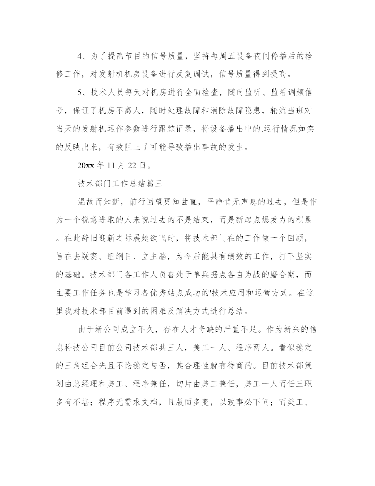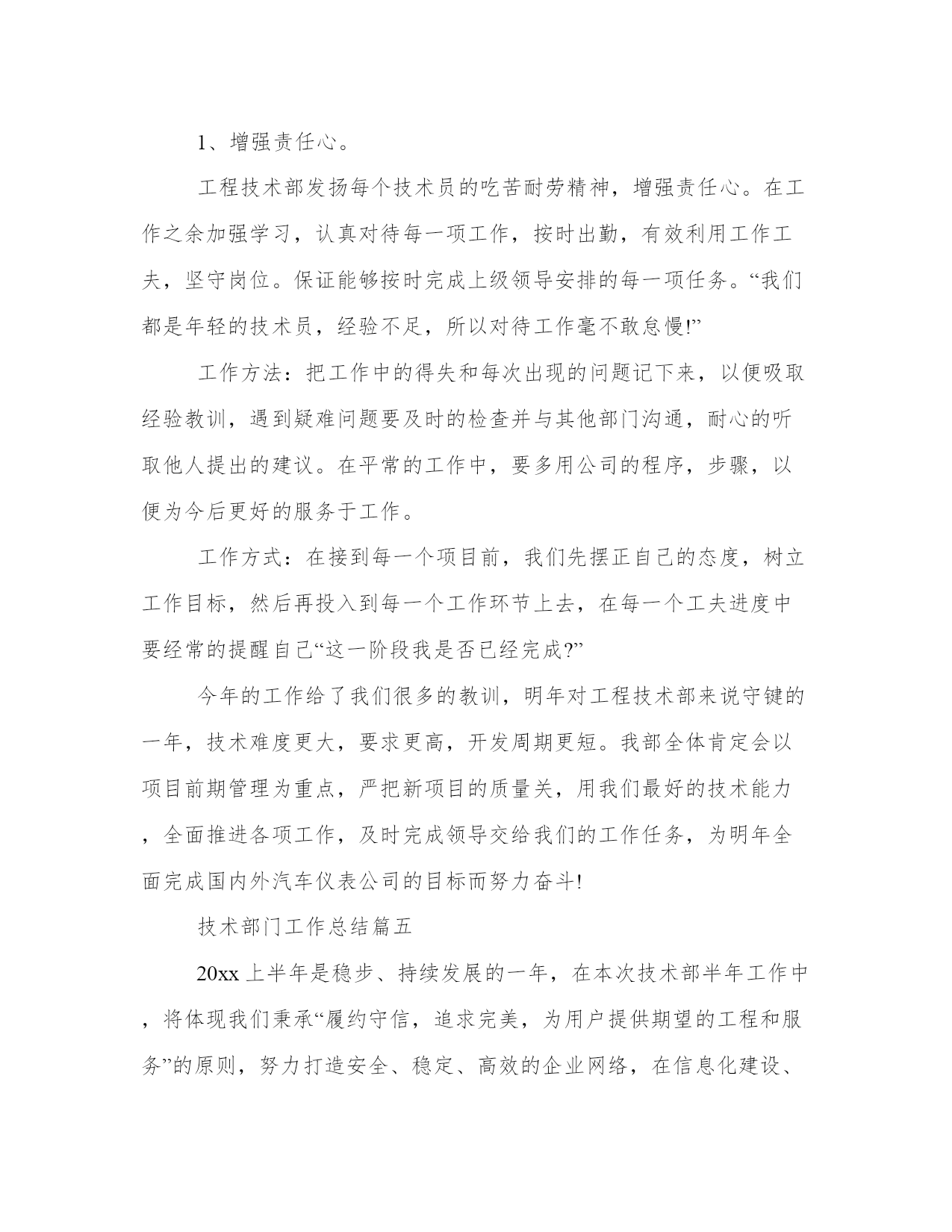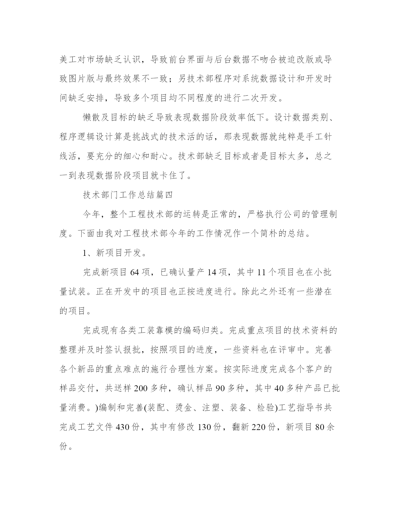 最新技术部门工作总结(通用19篇)总结是对我们所经历和所学习的内容进行概括和归纳,具有重要的学习和提升作用。写一篇完美的总结需要注意清晰的结构和条理,让读者能够理解和接受你的观点。小编为大家准备了一些优秀的总结范文,希望能够给大家提供一些启示和思路。技术部门工作总结篇一时间过得很快,xx—xx年已接近尾声,回顾从今年8月加入xx公司这个大家庭以来,在3个多月的时间里,慢慢地熟悉了本职的工作以及陌生环境的磨合,努力提高理论知识,踏实工作认真完成领导交办的各项工作任务,使自己渐渐的融入和适应到新的工作环境中。过去的几个月里在领导和同事们的悉心关怀和支持帮助下,通过自身的不懈努力,在思想、学习和工作等方面取得了新的进步。总结如下:刚进入公司的时候,对公司的服务器、监控系统以及局域网不是很熟悉,给工作带来了很多不便,渐渐在发现自己大脑对相关理论知识储量不够,通过到xx图书管查阅相关的书籍、网上查阅相关的资料以及向同事虚心请教,对服务器、监控系统以及局域网慢慢熟悉起来了,同时也发现了在it方面存在诸多问题。由于前任同事的原因,公司里多数电脑好久没有维护了,都出现电脑系统反应慢、接收不了邮件、k3系统无法连接服务器、访问不了公共盘、网络连接不等问题。在这三个多月里给13台电脑重装了系统、其他电脑对其杀毒软件进行更新杀毒,清理文件垃圾。公司里的电脑运行速度明显地加快了。以上问题一般都是电脑使用不当引起的,主要是感染病毒,导致系统文件损坏。处理方法是:查杀病毒,如果还不行的话,只能重装系统了。所以在此建议要规范电脑的使用,不要浏览不洁净的网页。使用邮箱、聊天软件时,不要随便接收来源不明的文件。要提高电脑防范病毒的意识,以保证公司的网络安全。(1)监控系统每隔二、三天就会自动关闭。(2)有些监控摄像头由于没有红外线功能,到了晚上就看不清了。对于第一个问题,我觉得是监控主机的采集卡不太兼容,因为监控主机采用了两张不同型号的采集卡。我建议:更换彩集卡,把彩集卡更换成同一个型号的。对于第二个问题,我建议更换高清的监控摄像,使其在晚上能清晰地分辨事物。良好的监控系统对公司的财物安全至关重要,对公司的财物安全问题防范。在人事管理方面,基本上熟悉了人员的招聘、新员工入职手续的办理、档案的录入,通个对个人办公物品和部门固定资产进行了登记,为此特地制作了统计表。使得个人办公物品和部门固定资得到有效的管理和控制,杜绝管理上的失控和资产流失。在8、9月份,出现生产用工紧张,在10月份,对员工进行了加薪,基本上解决了用工紧张的局面,在一定程度上缓解了生产上的压力。宿舍管理、办公用品采购,在许主管的帮助下,也有序进行。在宿舍方面,部份员工的卫生意识不强,室内卫生脏、乱、差。走廊过道处垃圾随处可见。可见,员工的卫生意识有待加强。刚接手办公用品采购,对控制办公物品的质量、数量不是太理想,今后在这个问题上会稍加注意。在3个多月中,也深深地认识到自己的不足:(1)理论知识准备不够。在工作中,现学现用,忙于查资料,浪费大量的工作时间。(2)工作思路不清晰,系统性不强。在工作任务繁忙的时候,工作容易出现混乱,有时候不知所措。(3)还需建立自我,追求小我,达到忘我。树立自己的目标,用公司的发展来实现个人的理想,使个人的利益与公司的利益紧密结合。对公司今后发展的几点建议:(1)用公司的管理制度来对公司管理。要使公司的管理理念深入人心,使员工自觉尊守公司的管理制度。而不是实行“家长式”管理:紧紧依靠管理者的个人威信和道德来对员工的管理。(2)建设企业核心文化。多开展活动,让员工了解对企业发展史的,组织向老员工、优秀员工学习,激励员工奋发向上。(3)完善生活措施。现在90后的员工占主体,新一代的员工更多的是追求生活、精神上的娱乐。建立一个舒适的生活环境,使员工有着充沛的精力投入到生产中去。总之,自己在以后的工作中要加倍努力,一定听从领导的安排,积极主动地工作,好好学习理论知识和提高管理水平,为公司做出应有的贡献。技术部门工作总结篇二20xx年技术部在台领导的正确领导下,确保了我台广播全年的安全、优质播出,实现了各项技术指标均达到上级规定的要求,圆满地完成了各种设备安装调试、网络系统升级改造、以及设备维护和值机等各项工作任务。现将一年技术工作总结如下:1、完成了传媒大楼广播电视发射铁塔安装对外招、投标工作。2、坚持每周发射机房卫生清理制度,定时对机房内进行打扫清理,对主要设备进行擦拭除尘,确保发射机房内干净整洁,根据设备维护维修制度,每周五对直、录播间电脑设备进行维护保养、病毒库升级。3、熟悉掌握广播节目信号源及设备线路,做到“常抓不懈,有备无患”,确保了广播的安全优质播出,圆满完成了今年的“十一国庆”、“七城会”等重要保证期及敏感日期间的安